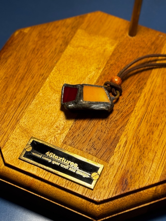 これはステンドグラスのペンダントです。 小さく加工したガラスを5枚とハンダを使って、インスピレーションで立体化させてあります。 この作品のコンセプトはシンプルにお守りです。 お外で遊ぶ方が安全・安心に楽しい時間を過ごせるようにと願いを込めてあります。 ただ、作っている最中に願いを込めるだけでは弱いので、近所の土地の氏神様の所まで作品を持っていき、私なりに願をかけてあります。あくまでも作者のユーモアを込めた御守りなので、宗教的なことが気になる方はごめんなさい。 そして、効力とかご利益とかその辺りに関しても、あくまでもステンドグラス作家osotoの勝手な願いを込めた作品であることをご理解いただけたらありがたいです。「安全に過ごせるといいな」「怪我とか事故が無いといいな」「楽しい外時間になるといいな」という感じのペンダントです。 ※革紐の先端はすぐ解けるように軽めに結んでいるだけです。ご使用の際には、お客様ご自身でお好みの結び方・長さに調整してください。 【制作日】 2025年10月22日 【サイズ】 皮紐部分・・・ ブラウン/50cm (長めに設定してありますのでお好きな長さに調整してご使用ください) ステンドグラス部分・・・横2cm×高さ3cm×奥行2cm 【ハンダの加工色】 アンティーク ※当ショップの商品は一つ一つ手作業で仕上げておりますので、多少のずれなどはご了承ください。 【使用素材】 ガラス、ハンダ(すず・鉛)、水牛皮紐(太さ2mm)、 紐どめ用ウッドビーズ(0.6cm)、リング部分(真鍮丸棒2mm) 【その他】 ハンダ部分は時間の経過と共に色が褪せてきます。艶出し・錆止めも含め、専用のポリワックス(jujo ステンドグラス仕上げ用ポリワックス)で定期的にメンテナンスをお願いいたします。 Amazonで1000円くらいです。 【注意事項】 ステンドグラスは、ステンドグラス専用のハンダを使って制作しております。 柔らかい金属の為、優しく扱ってください。特に真鍮のリング部分に無理な力を加えたりすると曲がってしまったり、ガラスから剥がれたりする事があります。 また、最終仕上げの際には入念に確認をしておりますが、ハンダ部分にはごく稀に、角(こてを離す際にできる尖り)ができる場合がございます。その様な箇所があった場合は、金ヤスリなどで尖った箇所を削っていただけたらと思います。予めご理解・ご了承の程宜しくお願い致します。