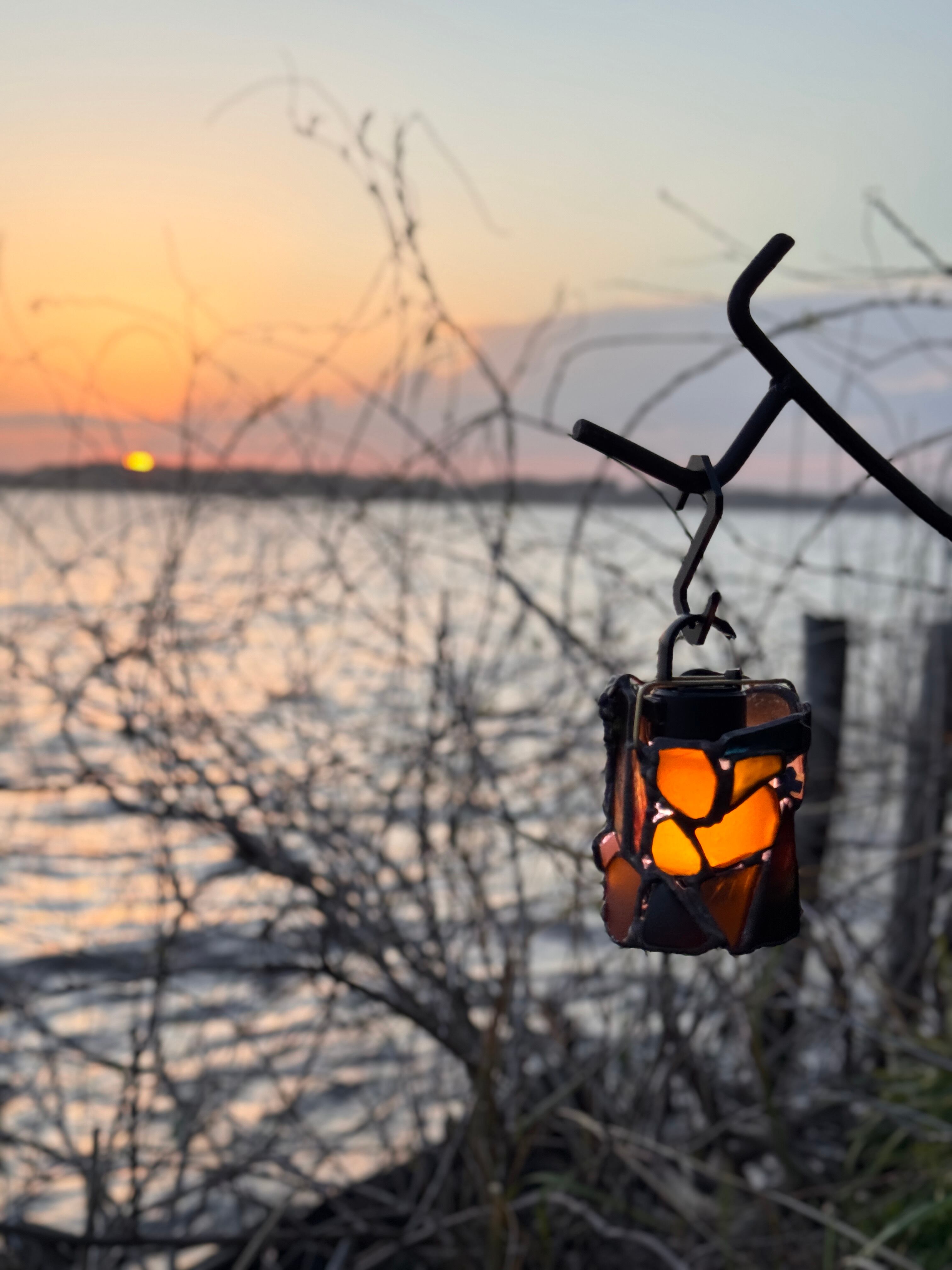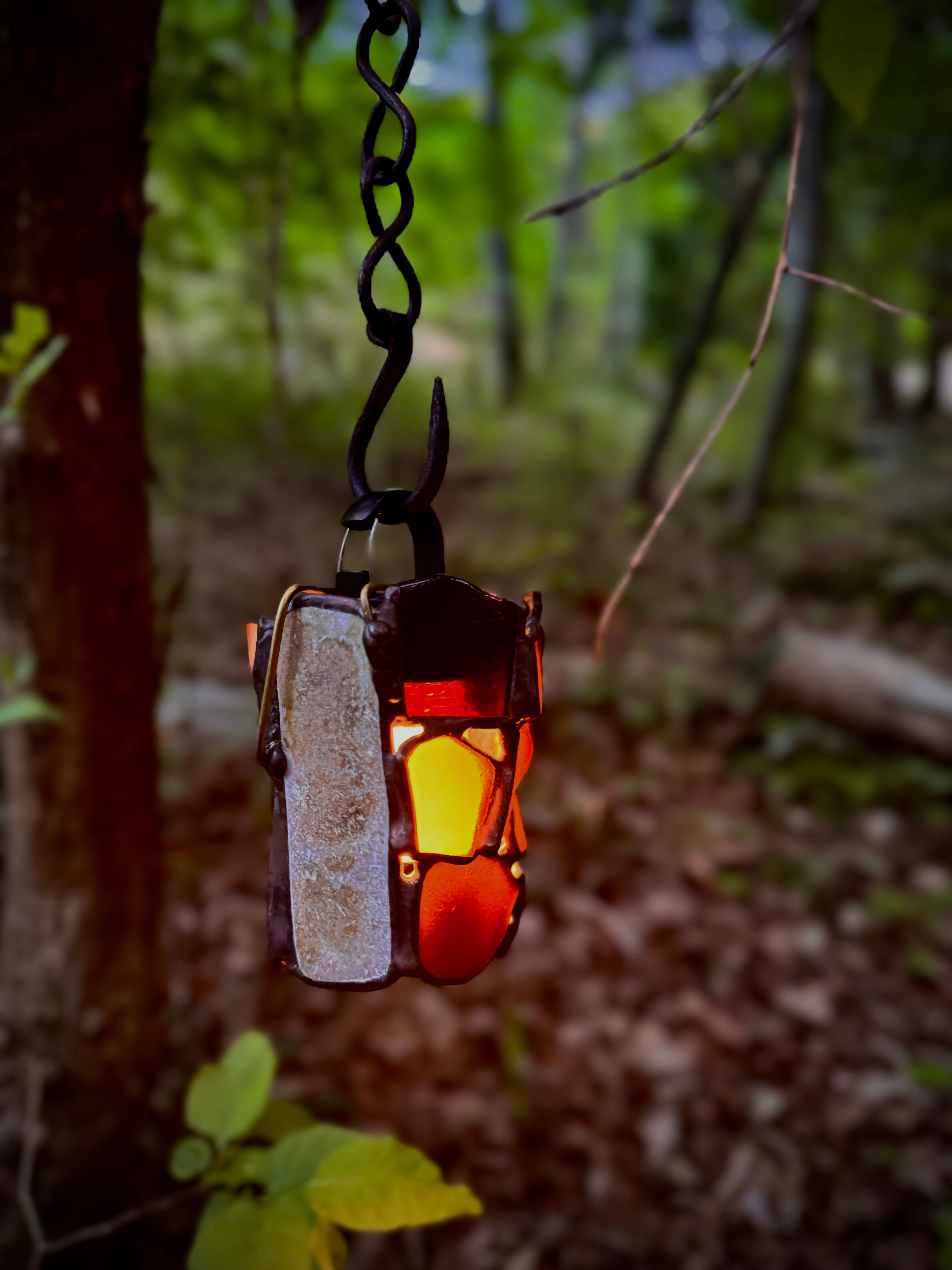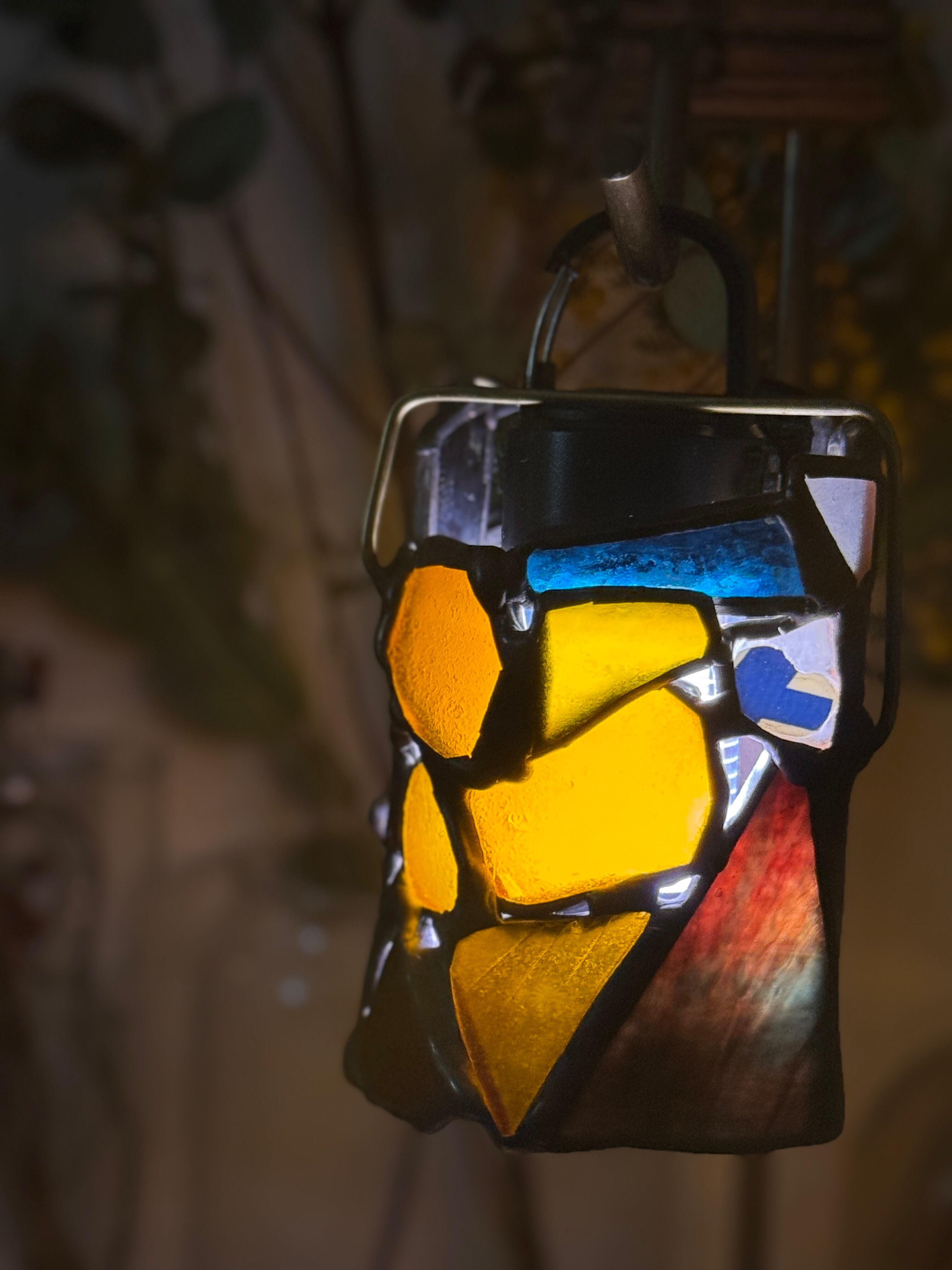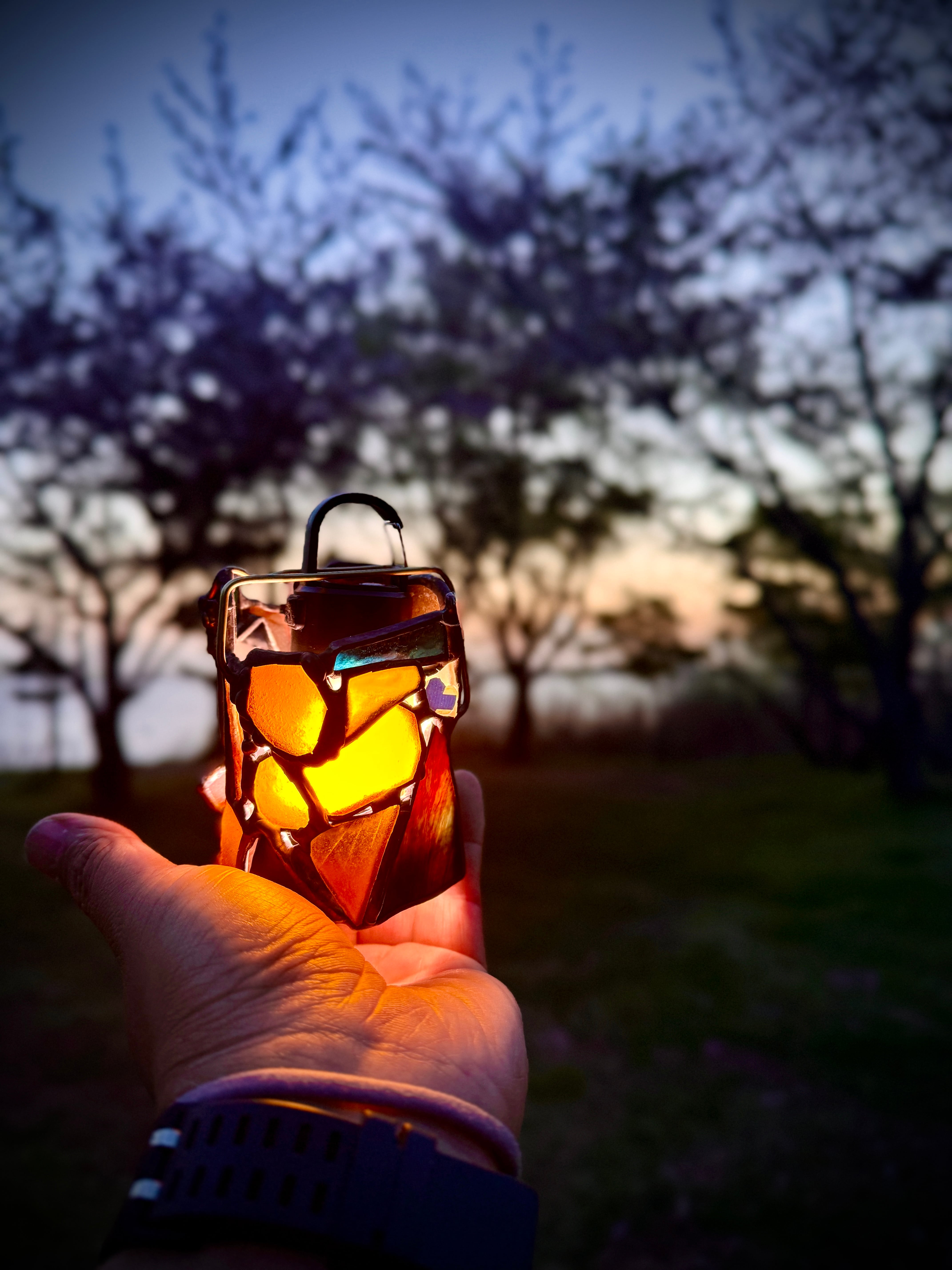 タイトルの”壁”は作品の中で1番目立つ1枚の白い陶片が由来。千葉の海岸で実際に私が拾ってきたものです。そしてこの陶片は光を通さない壁となって立ち塞がっています。ランタンを見る人にしたら、その"壁"がある角度からはあまり灯りを楽しめません。ただ、それ以外のところからはいつも通りステンドグラスの灯りが漏れています。文字通り、この暗と明が同居する小さなランタンシェードがこの作品の特徴です。壁はこちら側からも壁ですが、あちら側(光源)からも壁です。