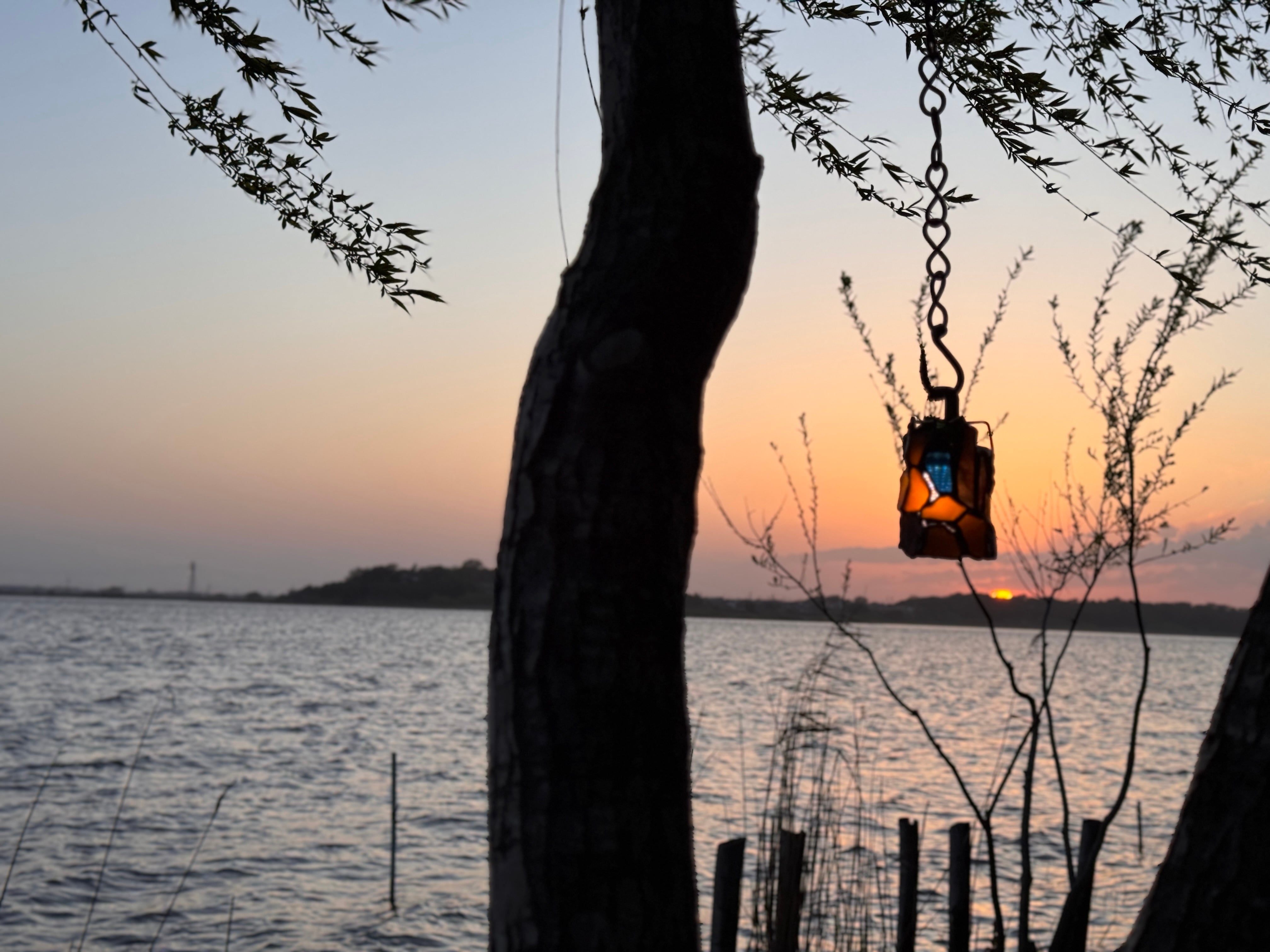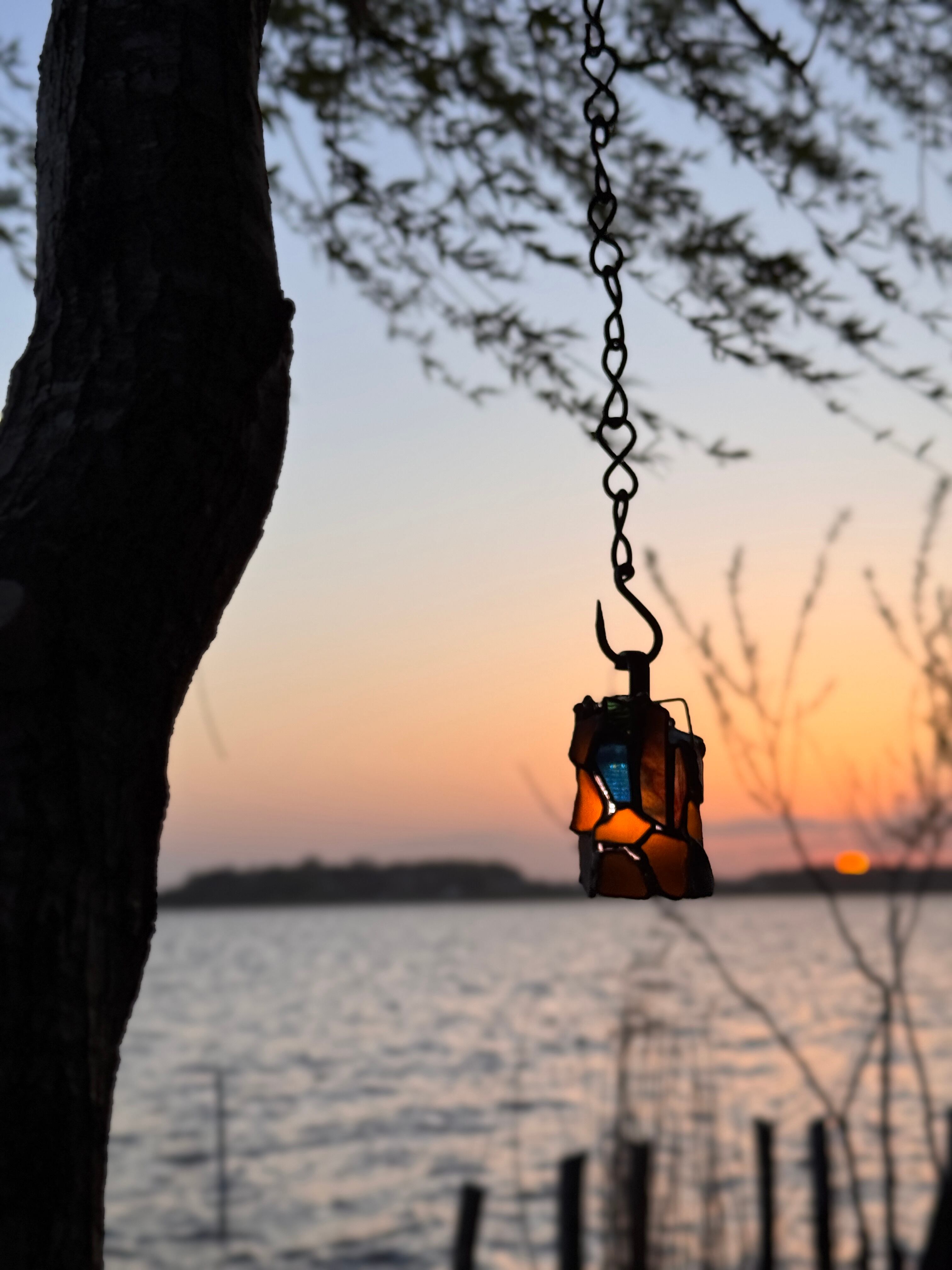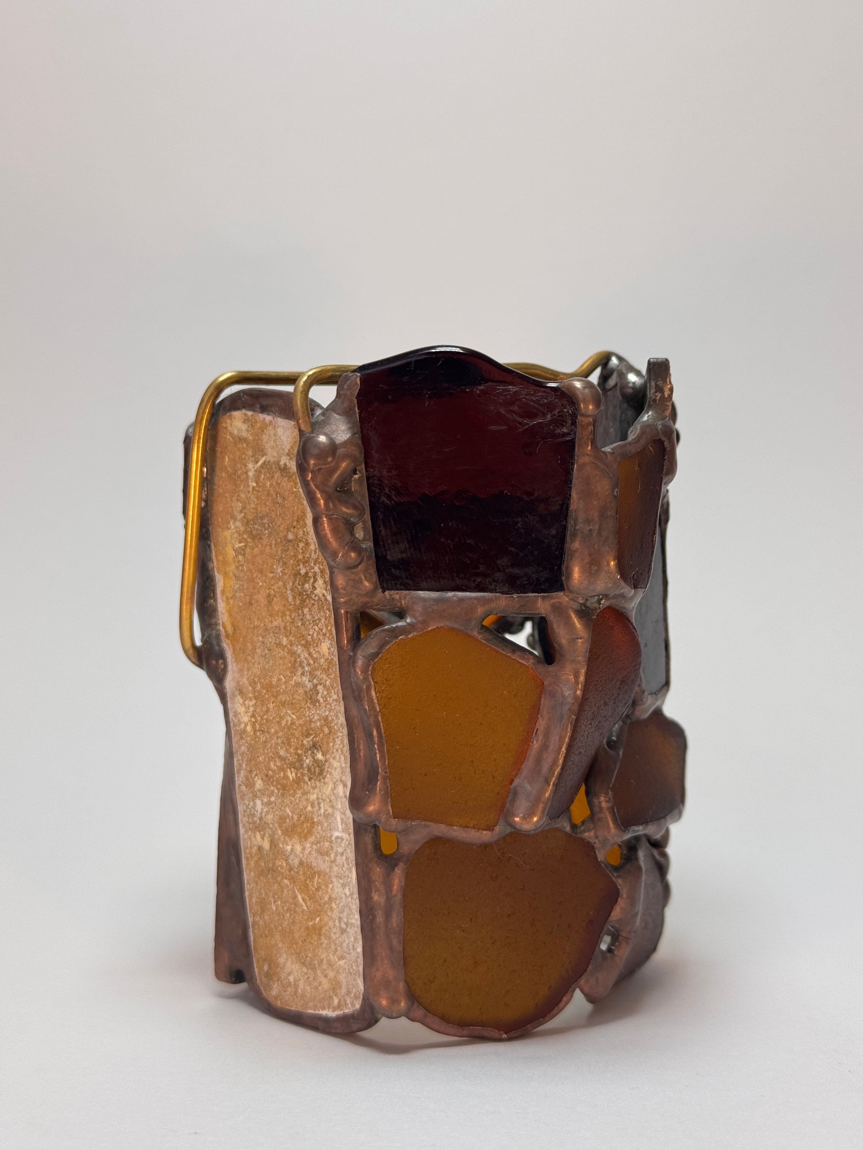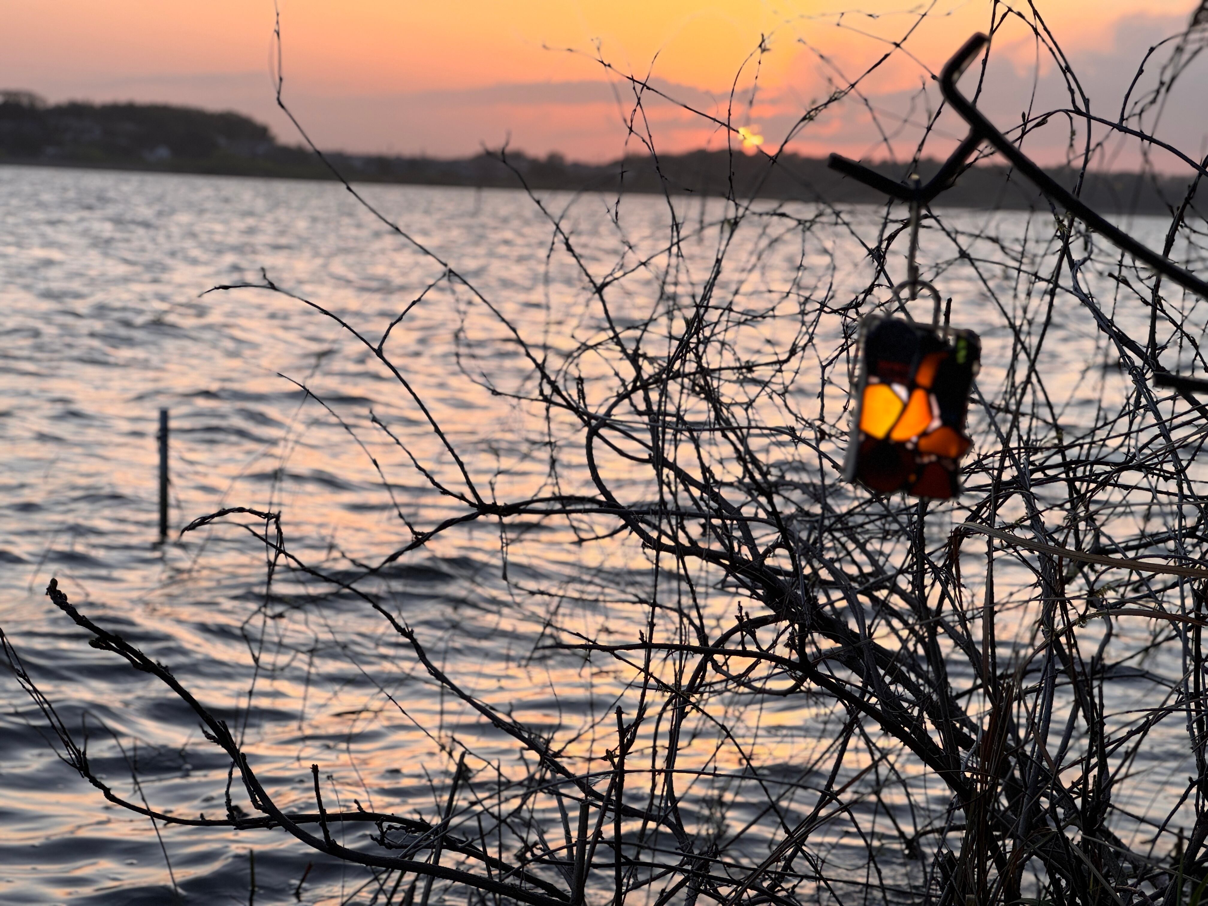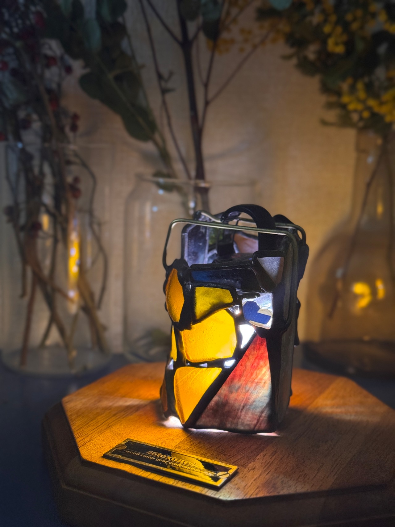 タイトルの”壁”は作品の中で1番目立つ1枚の白い陶片が由来。千葉の海岸で実際に私が拾ってきたものです。そしてこの陶片は光を通さない壁となって立ち塞がっています。ランタンを見る人にしたら、その"壁"がある角度からはあまり灯りを楽しめません。ただ、それ以外のところからはいつも通りステンドグラスの灯りが漏れています。文字通り、この暗と明が同居する小さなランタンシェードがこの作品の特徴です。壁はこちら側からも壁ですが、あちら側(光源)からも壁です。