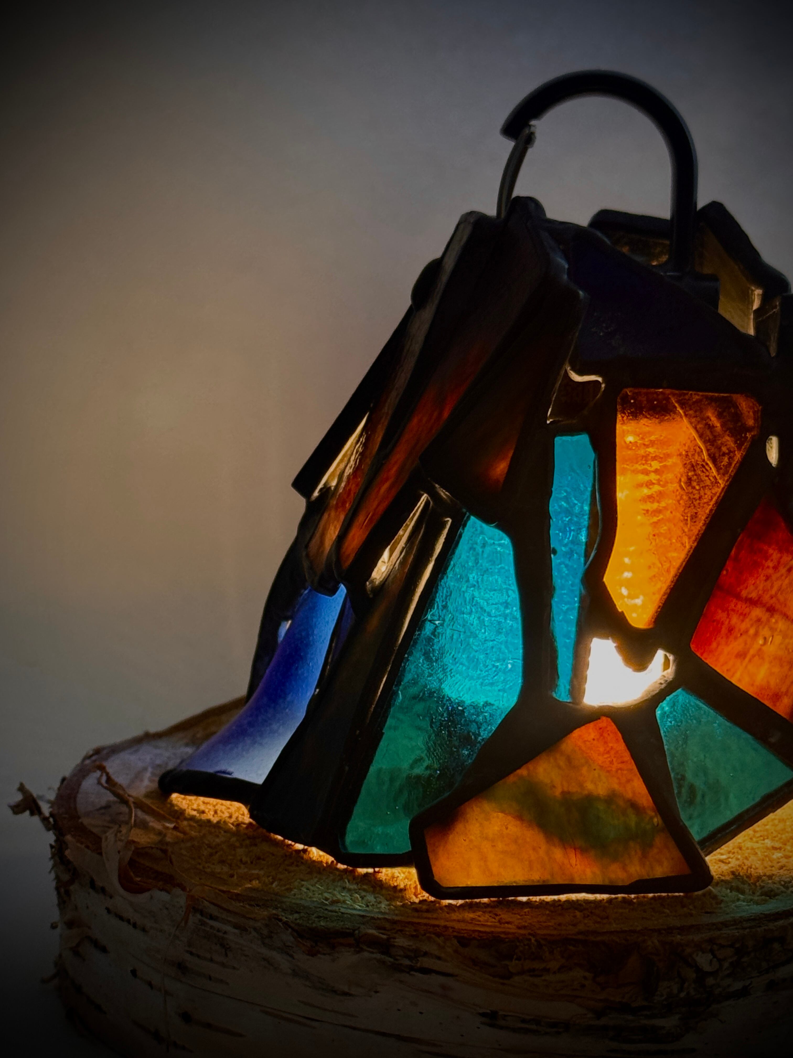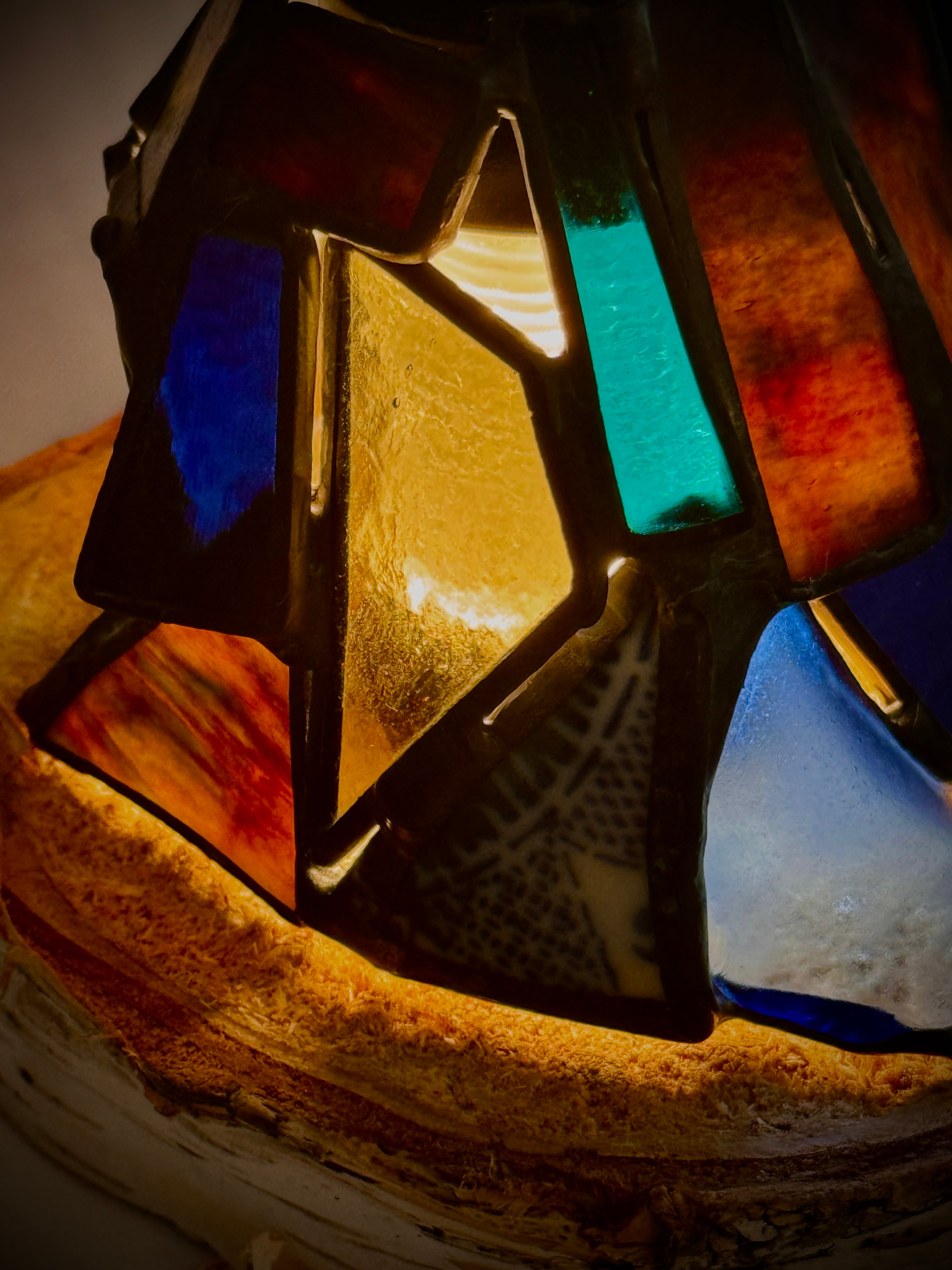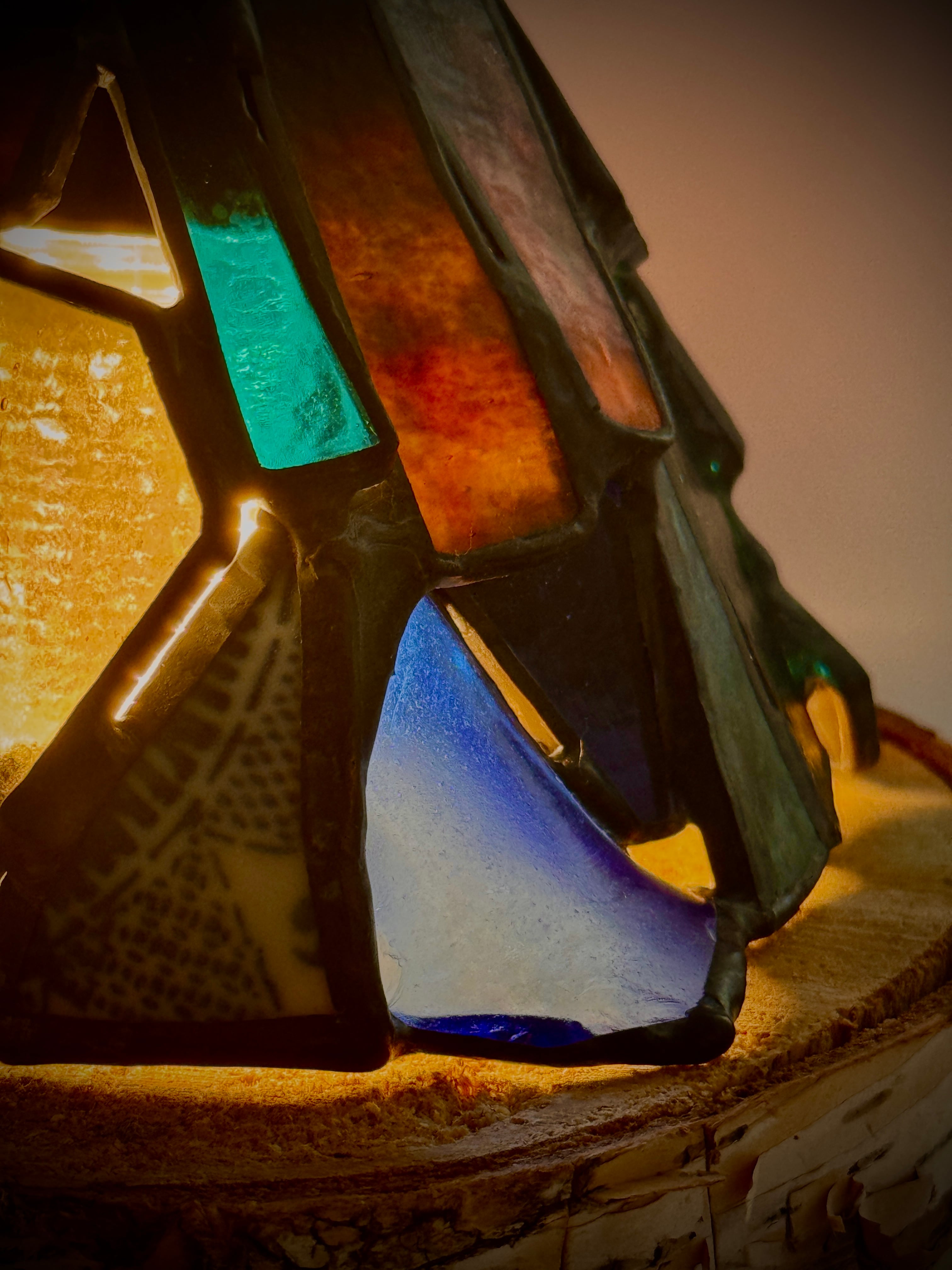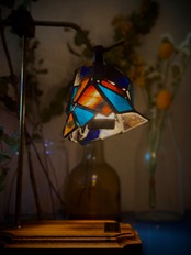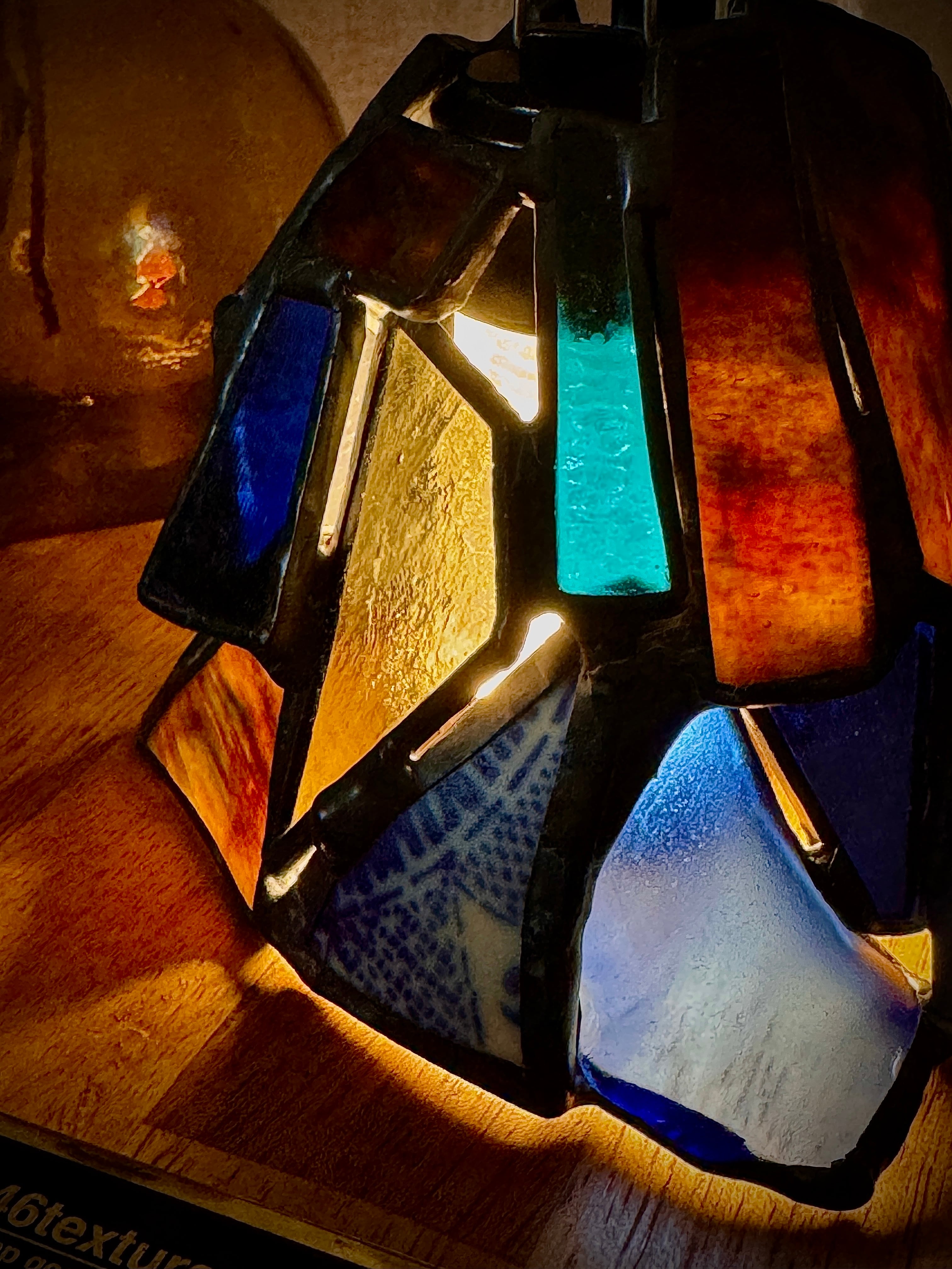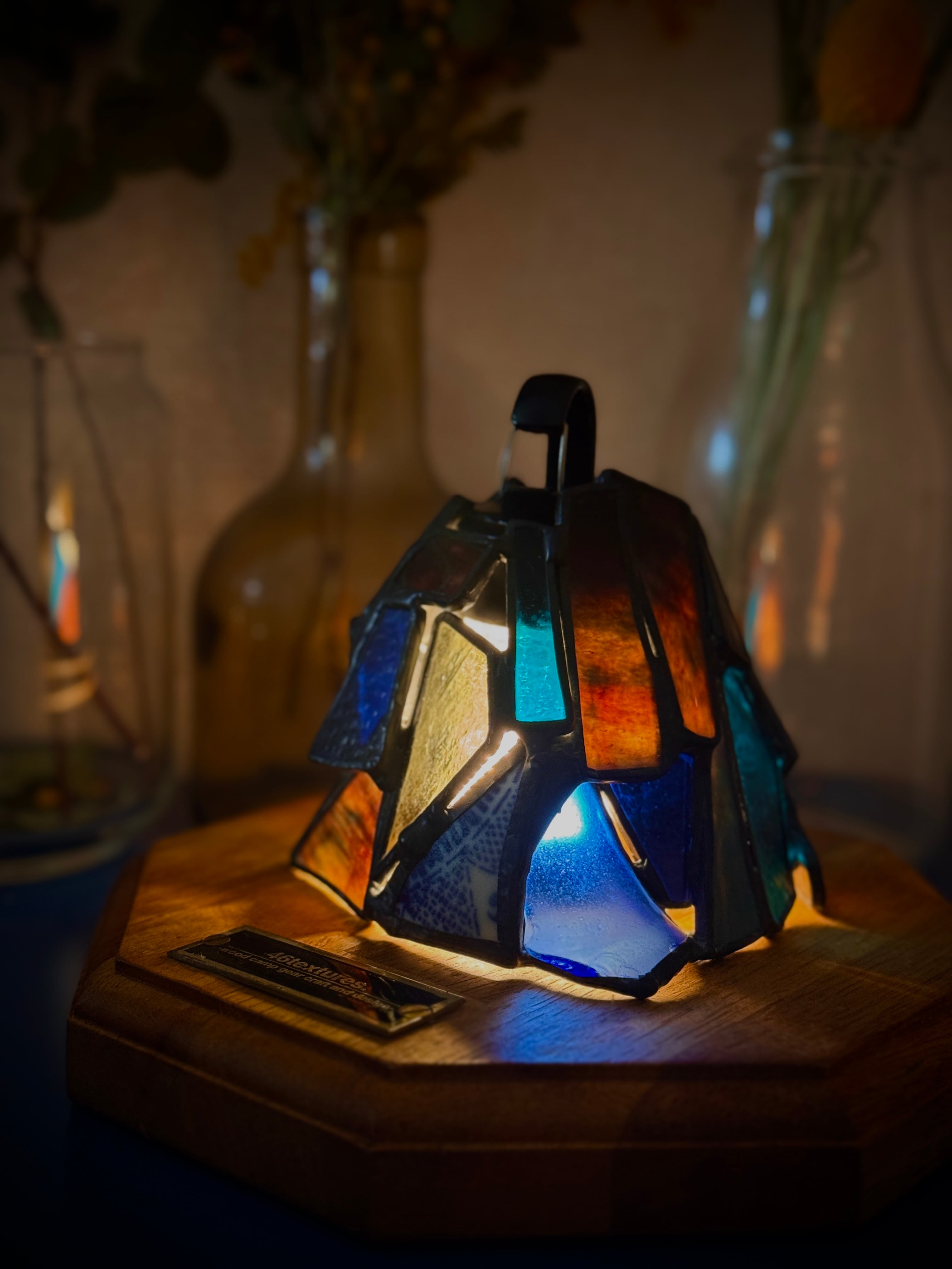 とても小さくフォルムもシンプルな為、持ち運びやすい作品です。ハンダの加工はブラックに変色させています。一番特筆すべきは、このシェードはライトを支える真鍮のブリッジがありません。ライト自体が引っかかって止まる様に、ガラスを調整して仕上げました。その為、LEDLENSERさんのML4というLEDライトもしくは、それと規格が完全に同じライトしか入りません。ご注意ください。