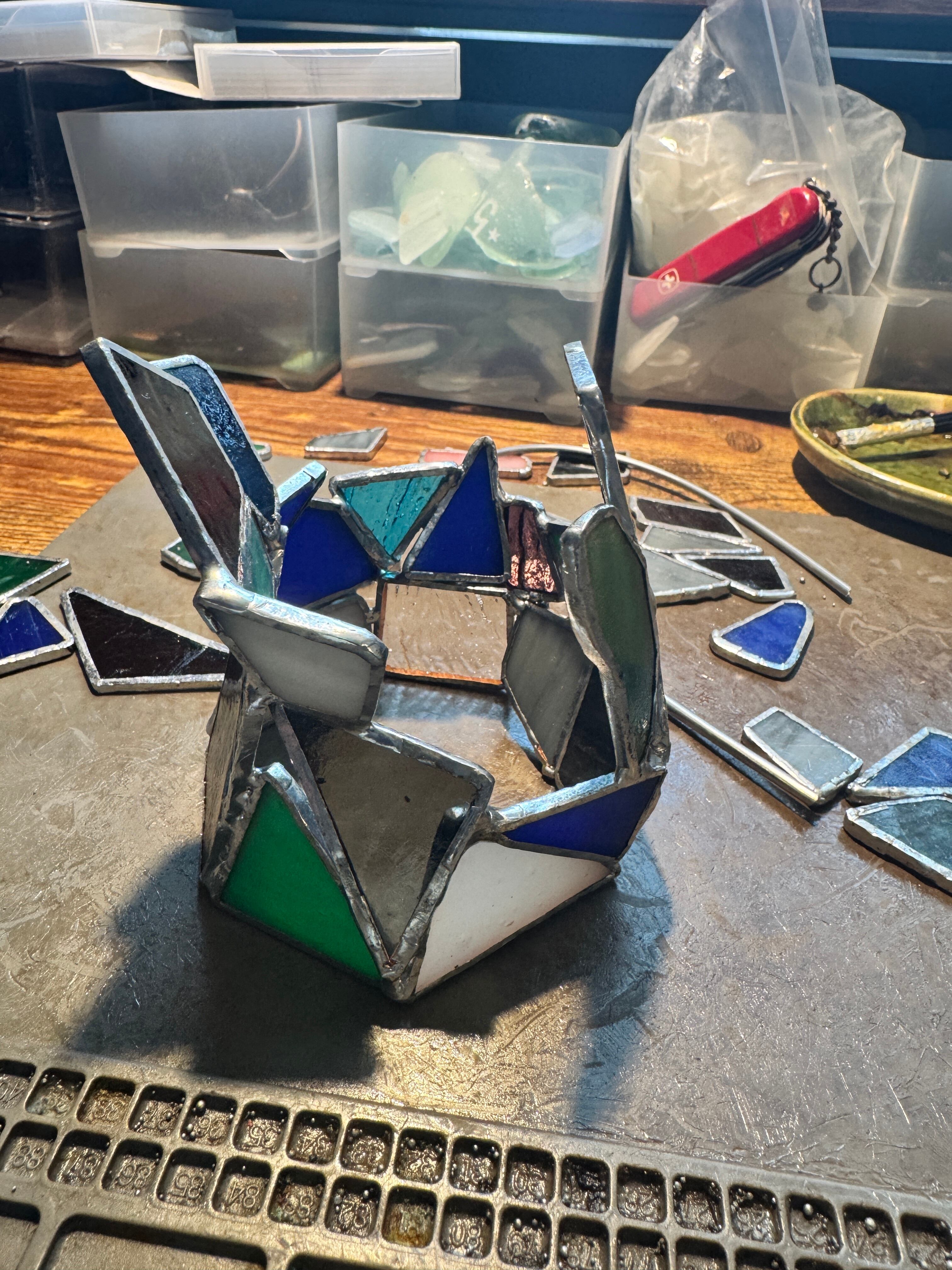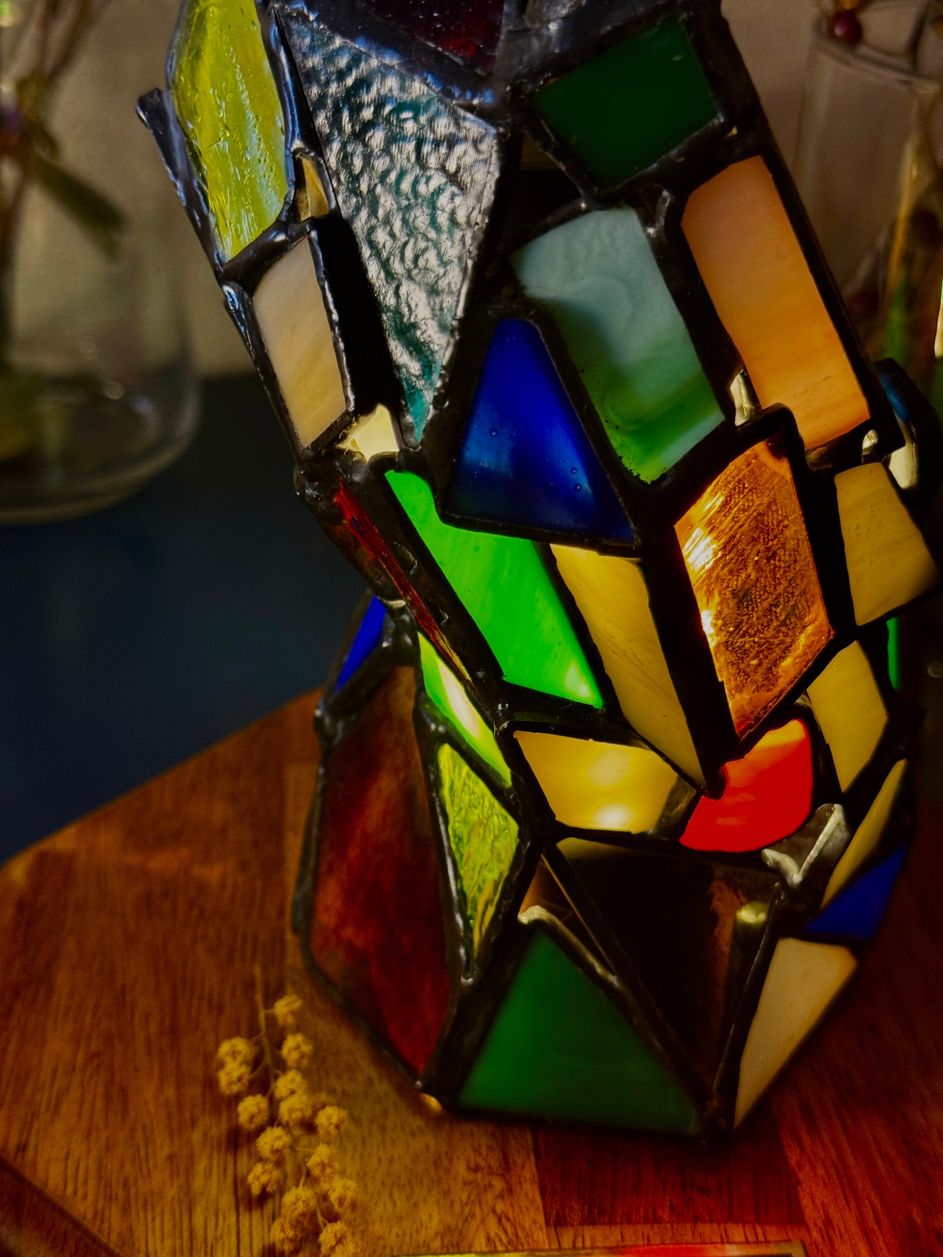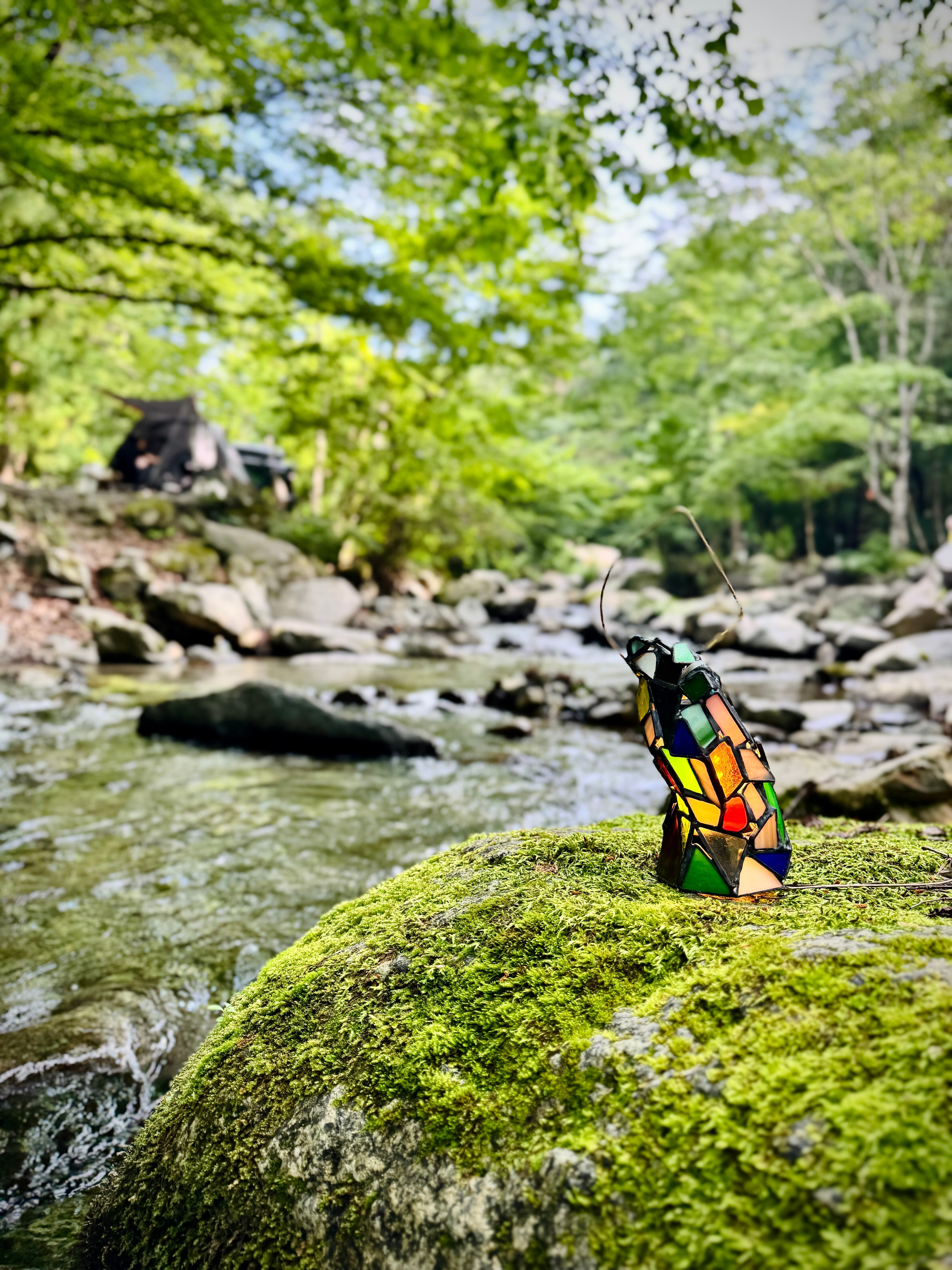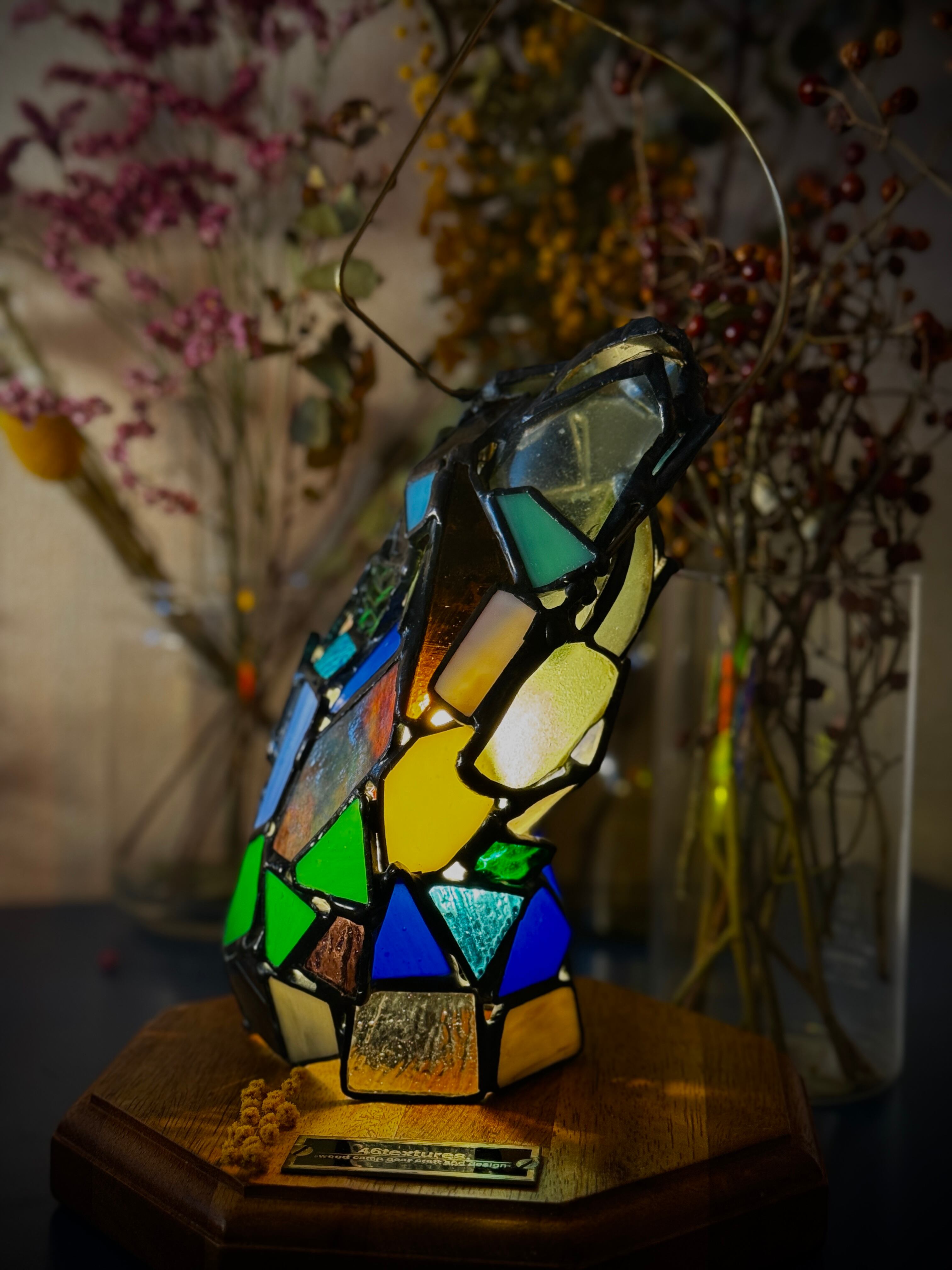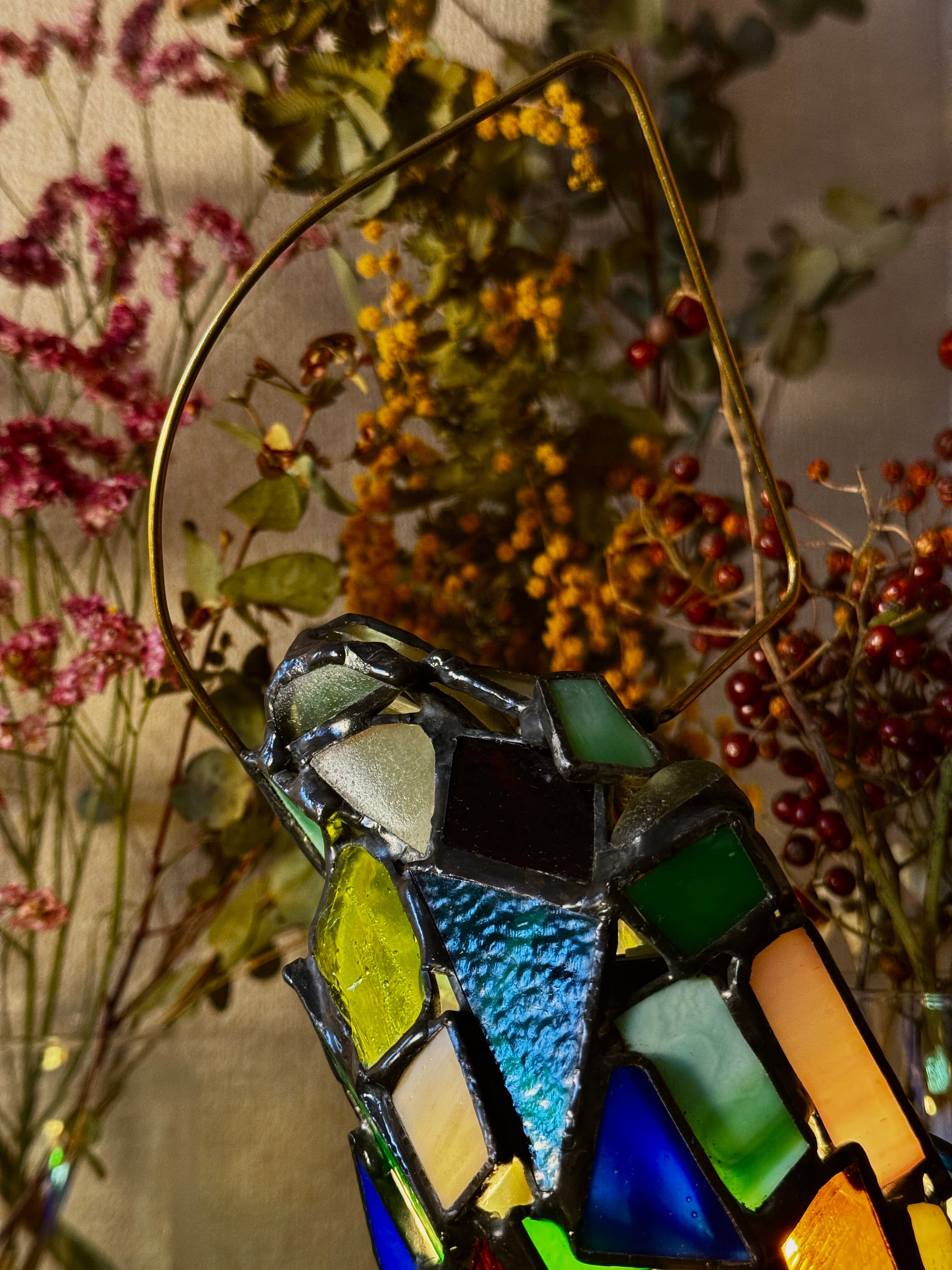 ガラスの色はポップでキッチュですが、ハンダのパティーナを黒くすることでわたしのキャンプテーマである、"ブポッチュスタイル"(無骨な感じも好きだけど結局ポップでキッチュに惹かれるね)を実現できたと思います。