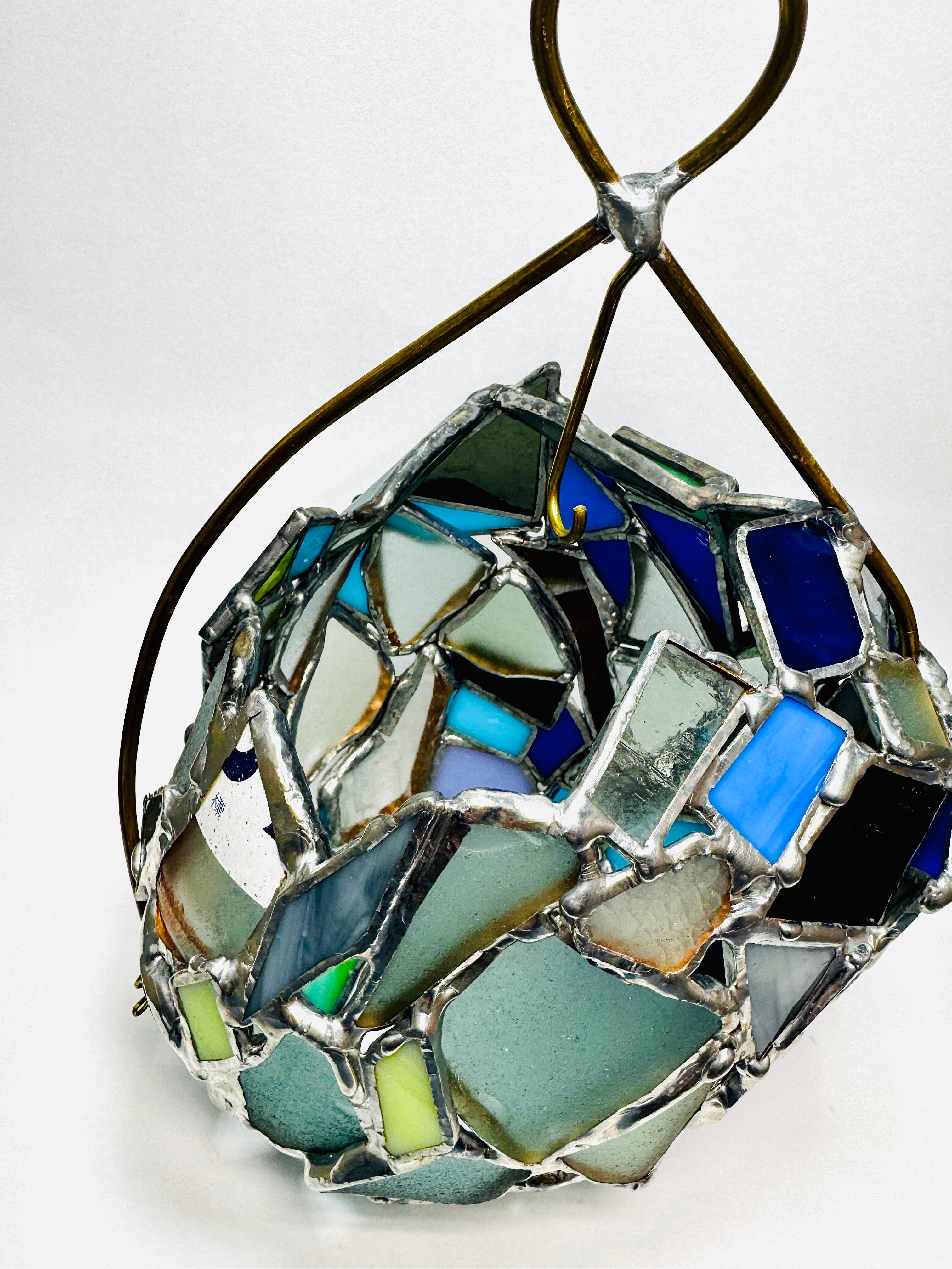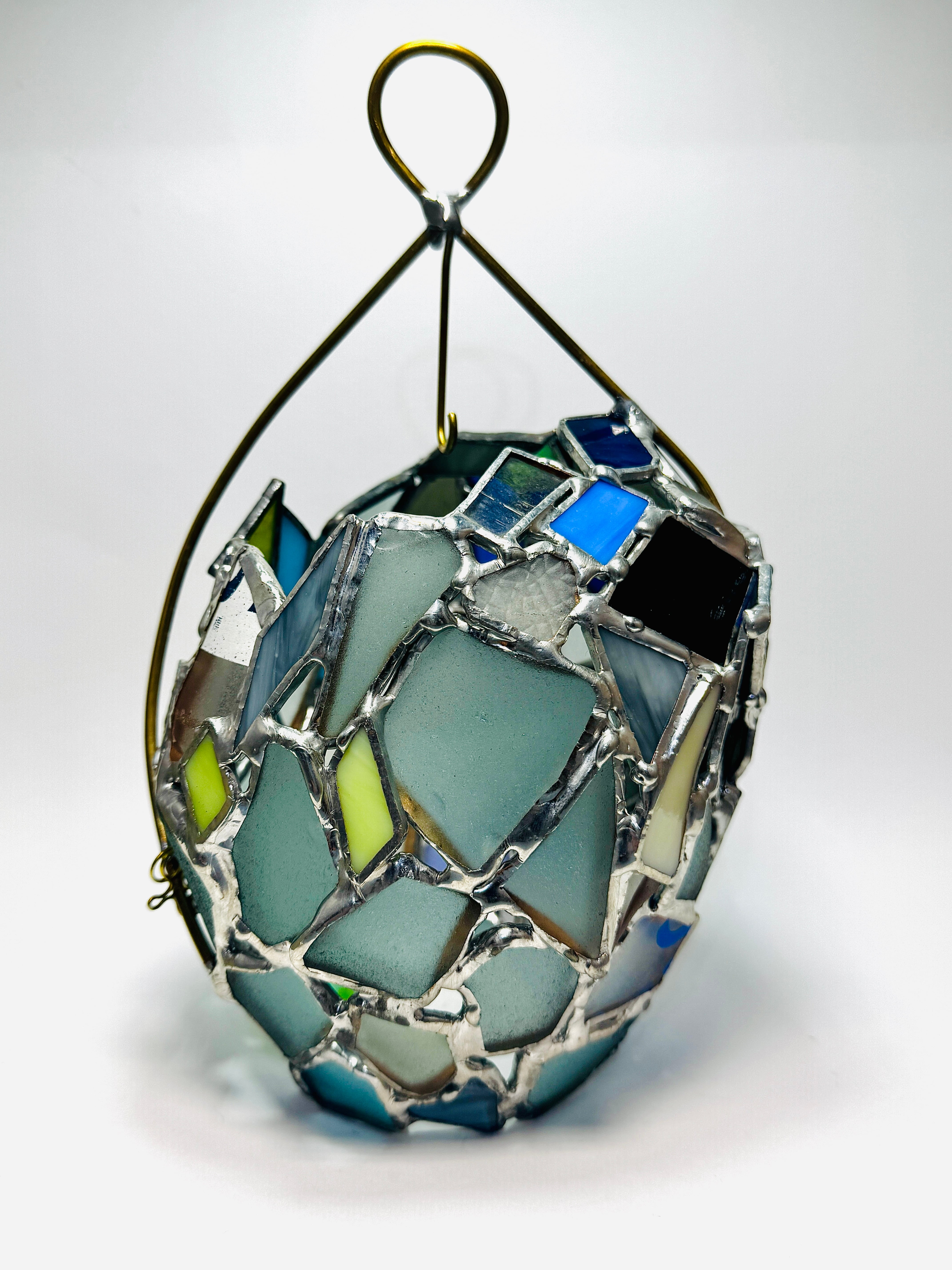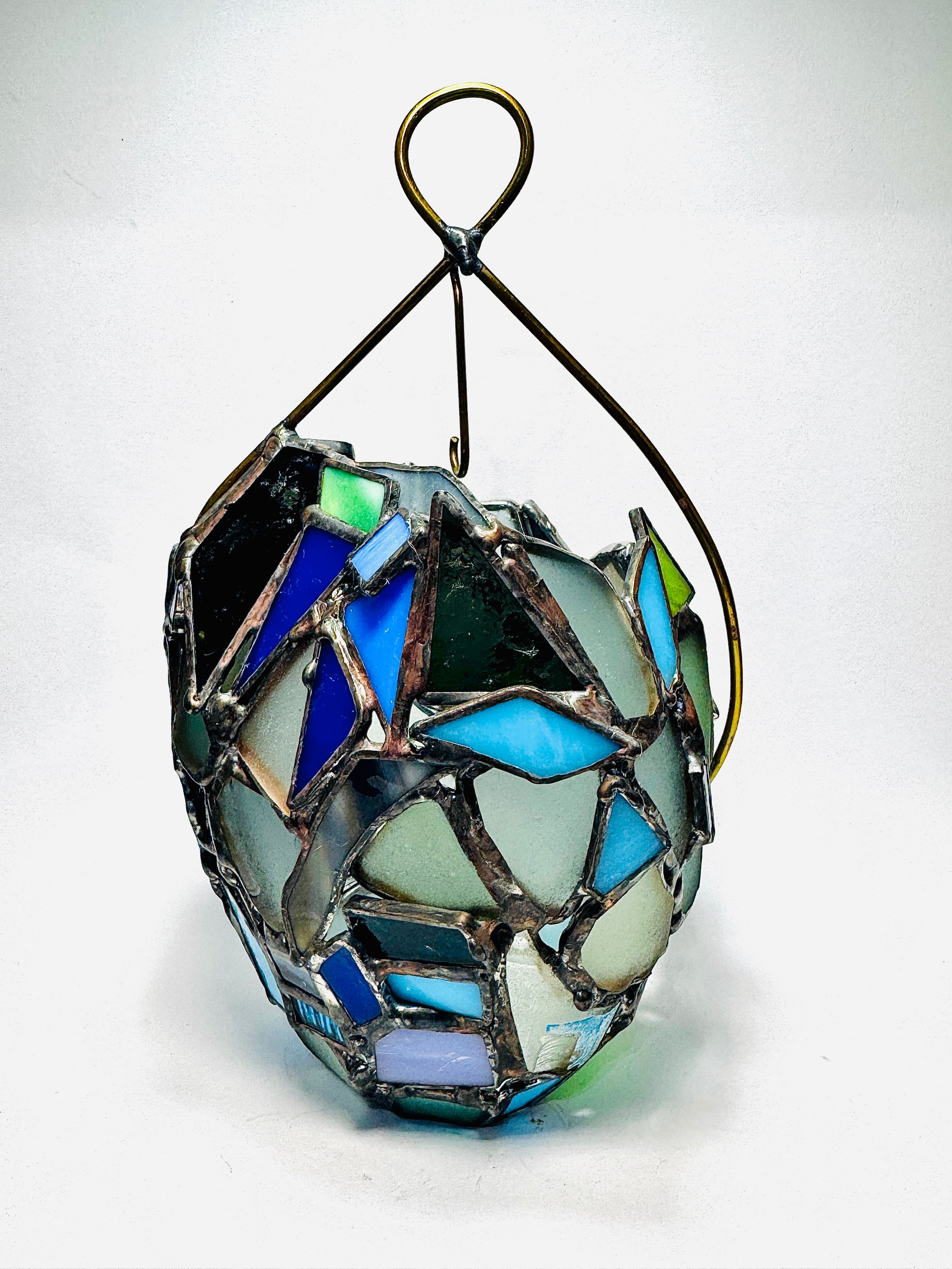 この作品の特筆すべきチャームポイントは、表面と裏面でまるで人格が違う果物ということです。片方のハンダはそのままの色かつシーグラス多め。片方は青いガラス多めでハンダはアンティークという、180度まるで違う雰囲気を楽しめるランタンに仕立てました。気分で向きを変えて楽しんでみてくださいね。