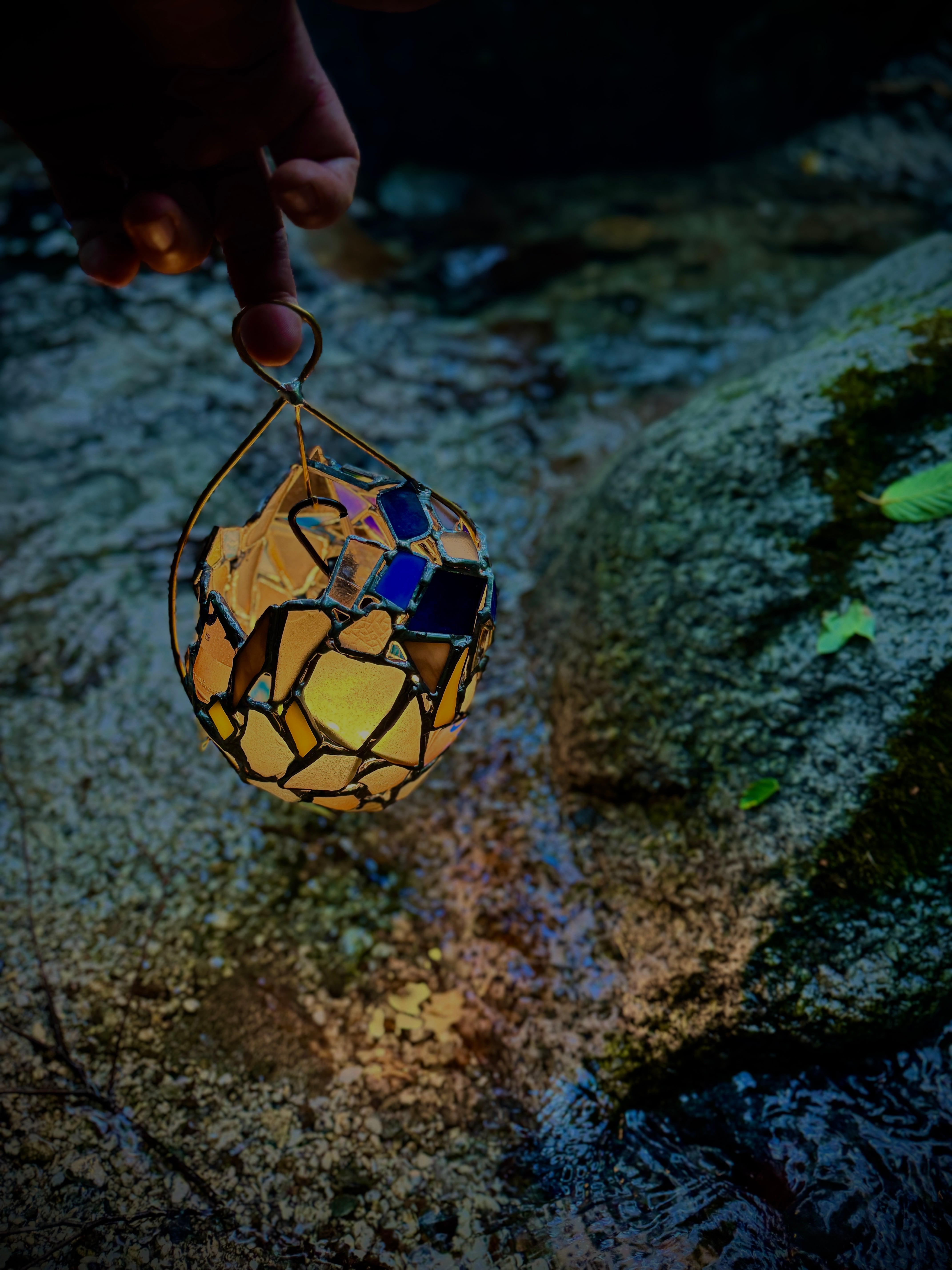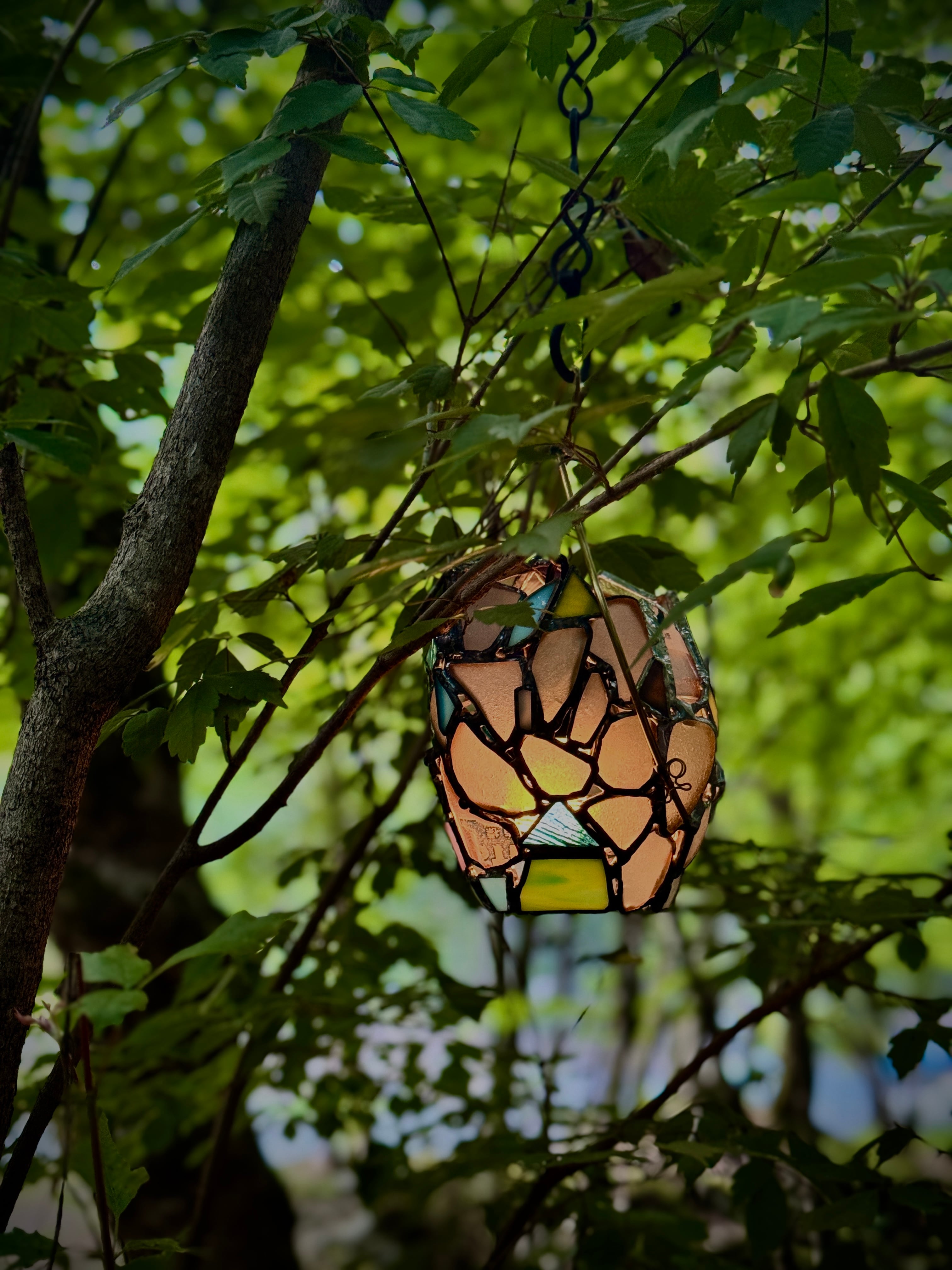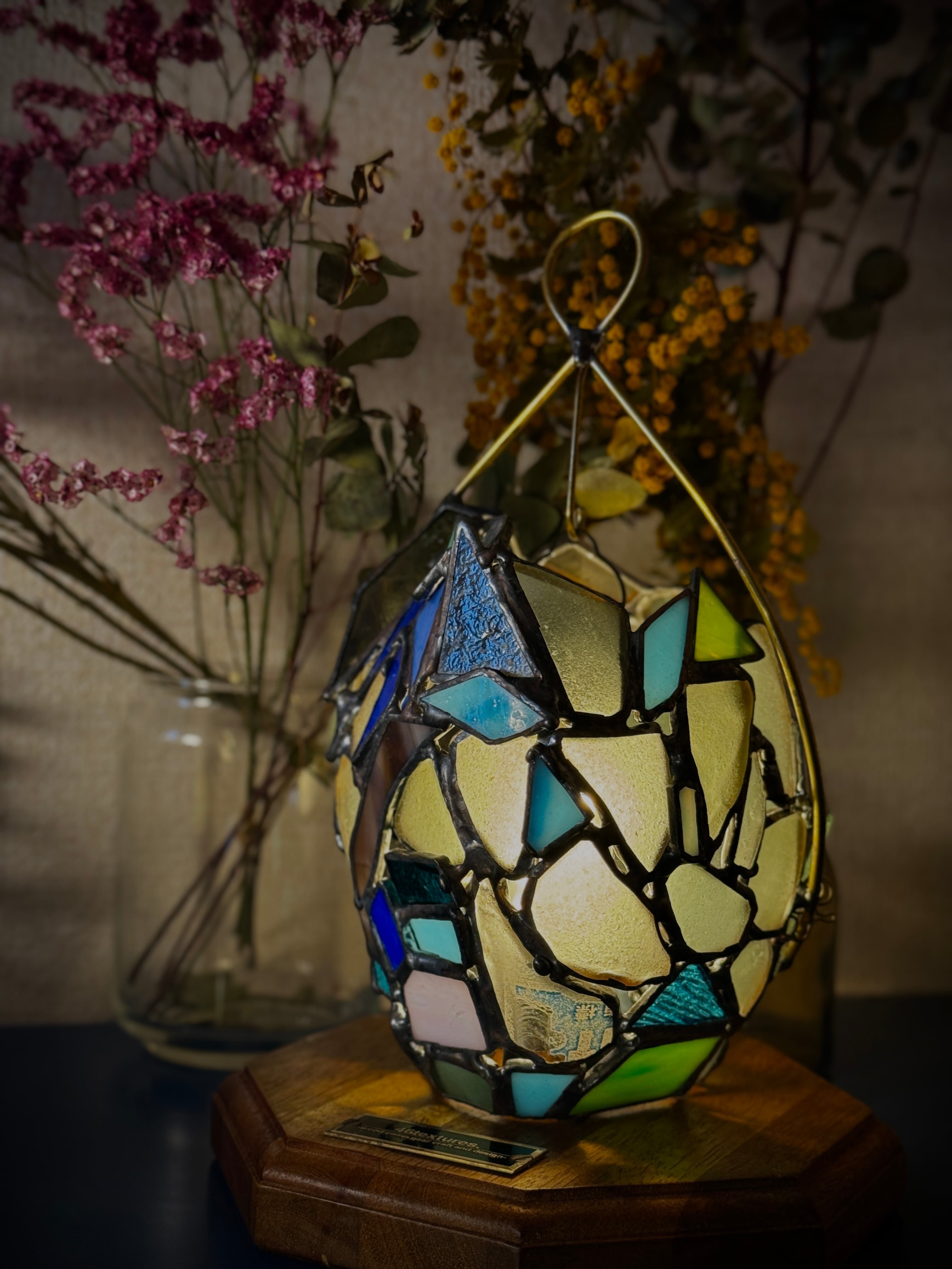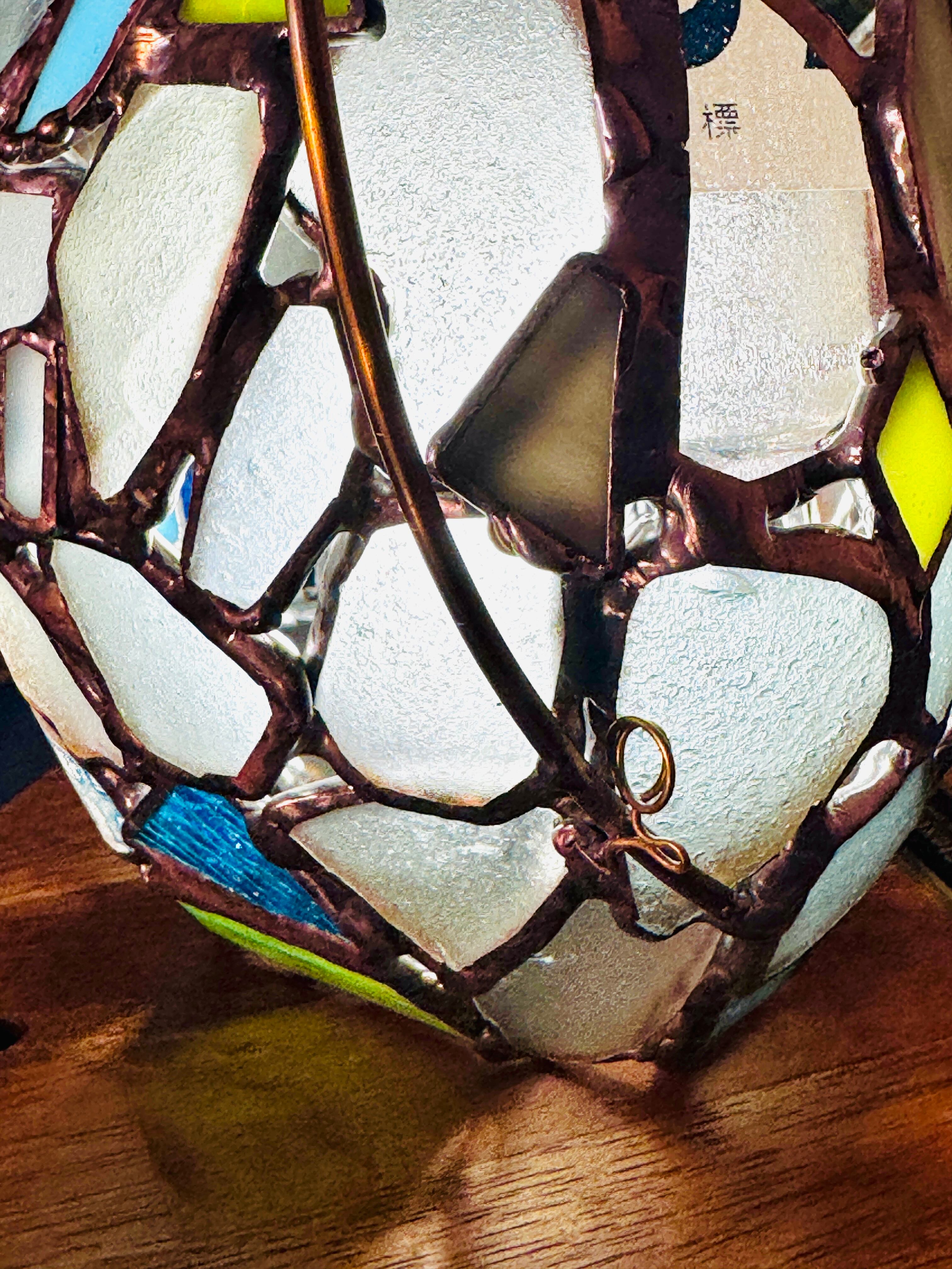 この作品の特筆すべきチャームポイントは、表面と裏面でまるで人格が違う果物ということです。片方のハンダはそのままの色かつシーグラス多め。片方は青いガラス多めでハンダはアンティークという、180度まるで違う雰囲気を楽しめるランタンに仕立てました。気分で向きを変えて楽しんでみてくださいね。