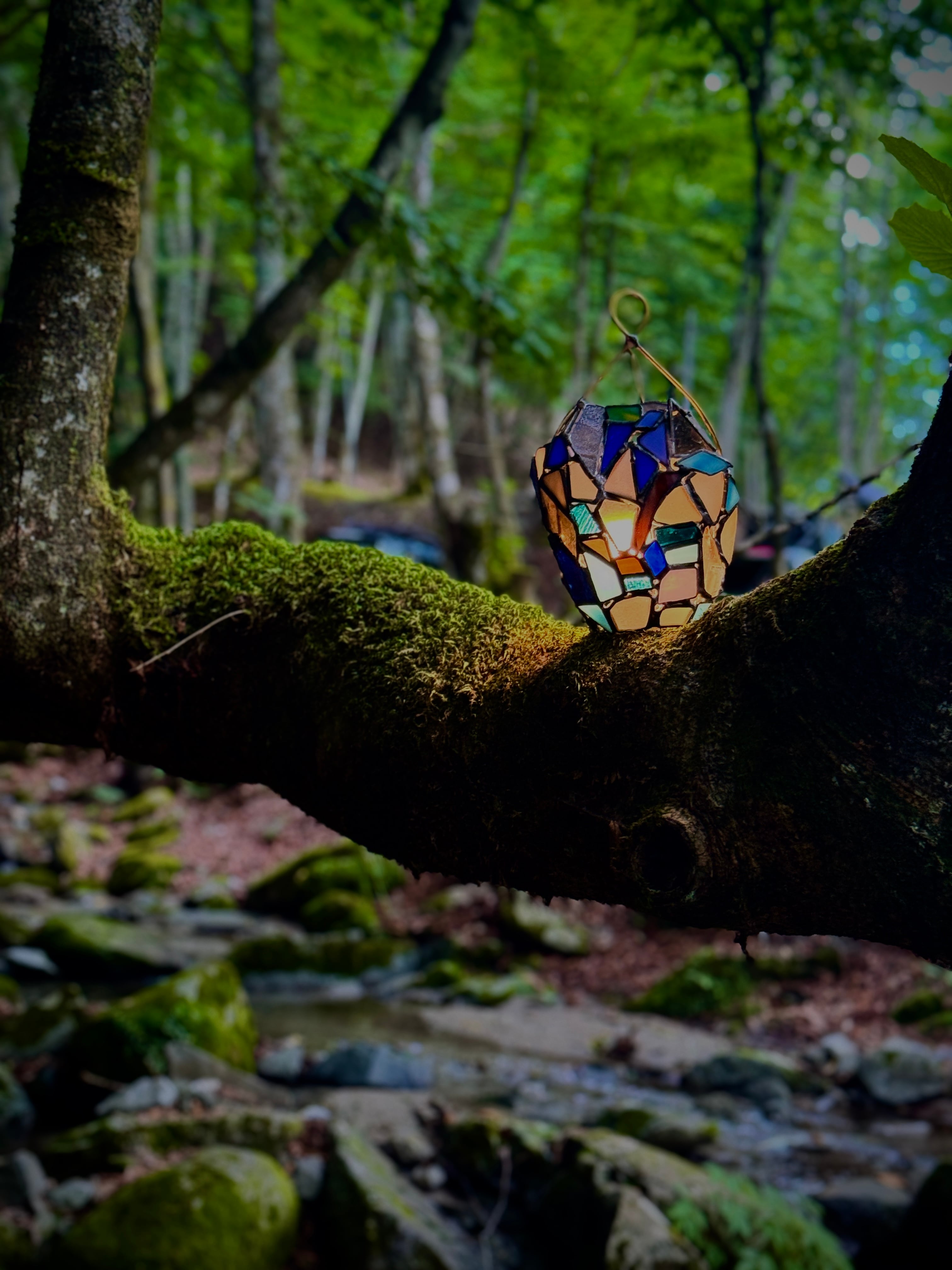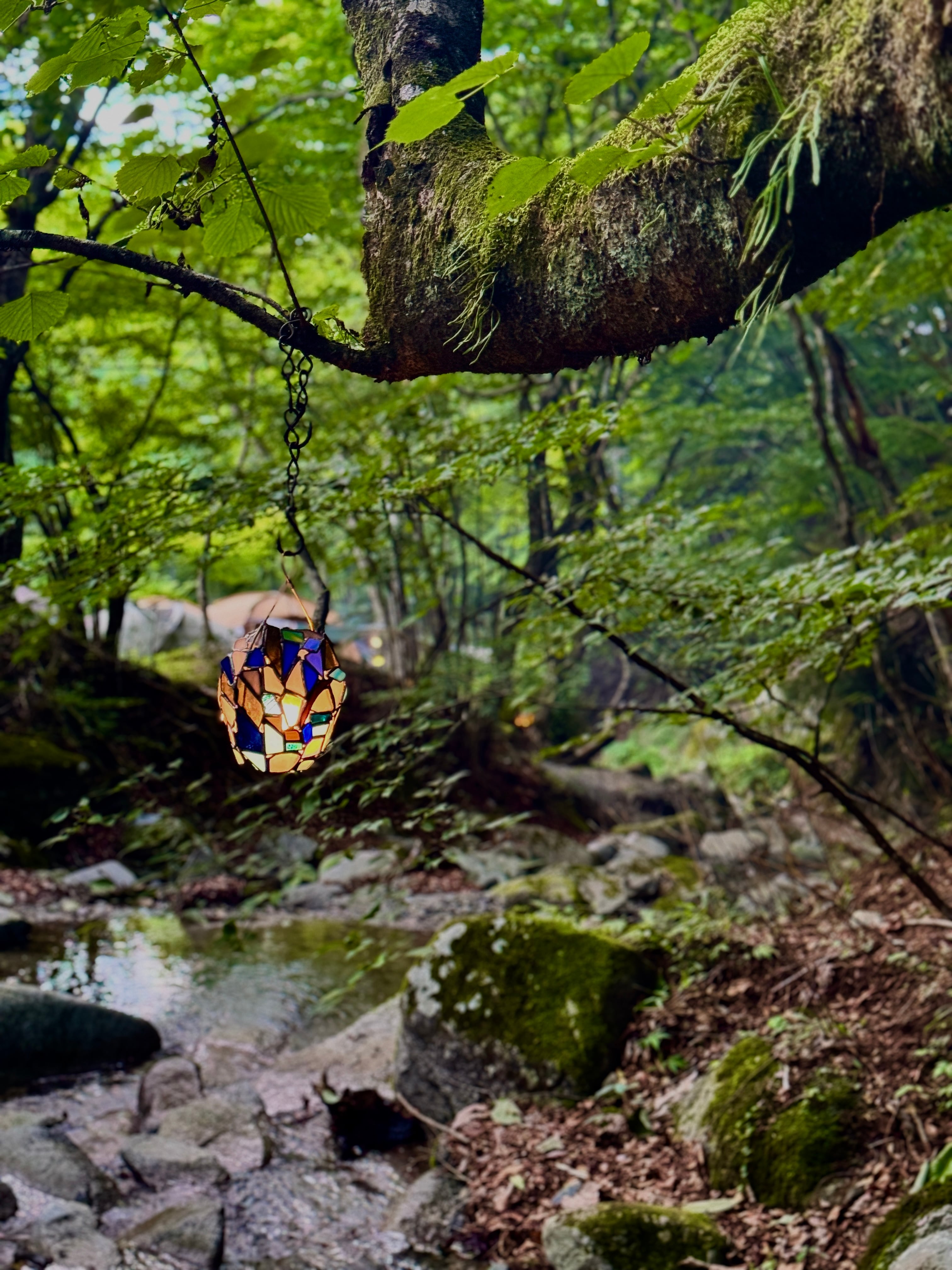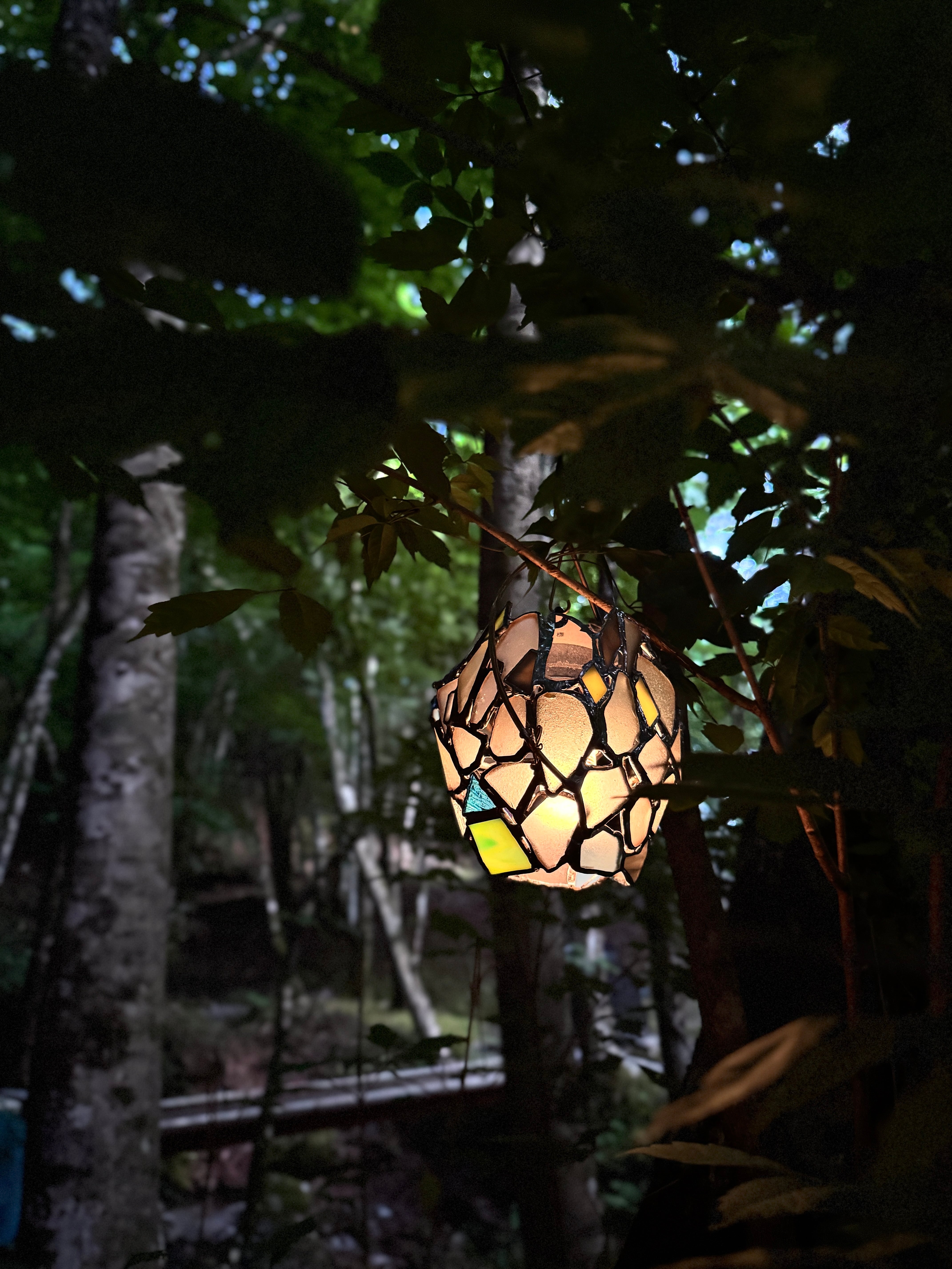この作品のタイトルは、最初、"涼し気マンバン卵(大)でした。ただ、涼しい気持ちになってもらいたいということで、改めたタイトルに"涼"の文字は残しました。マンバンはハンドルの形がマンバンヘアのようなのでそこから来てます。マンバンよりもムーミンに出てくるリトルミィに近いですね。ただ、思いの外、お団子頭じゃ無いんじゃない?と妻の冷静な指摘で即ボツ。卵の形ではあるけどなんかなぁ・・となり、あいまいなタイトルのまま渓流キャンプに持って行くことになりました。木の枝に引っかけて涼んでいると、妻がふと「あのランタン果物にしか見えない。なんて事でしょ!あれは光るフルーツよ、こんちくしょーめ」と、薪バサミで熾火をガチャガチャしながら訴えてきたので、その場でこのタイトルが生まれました。