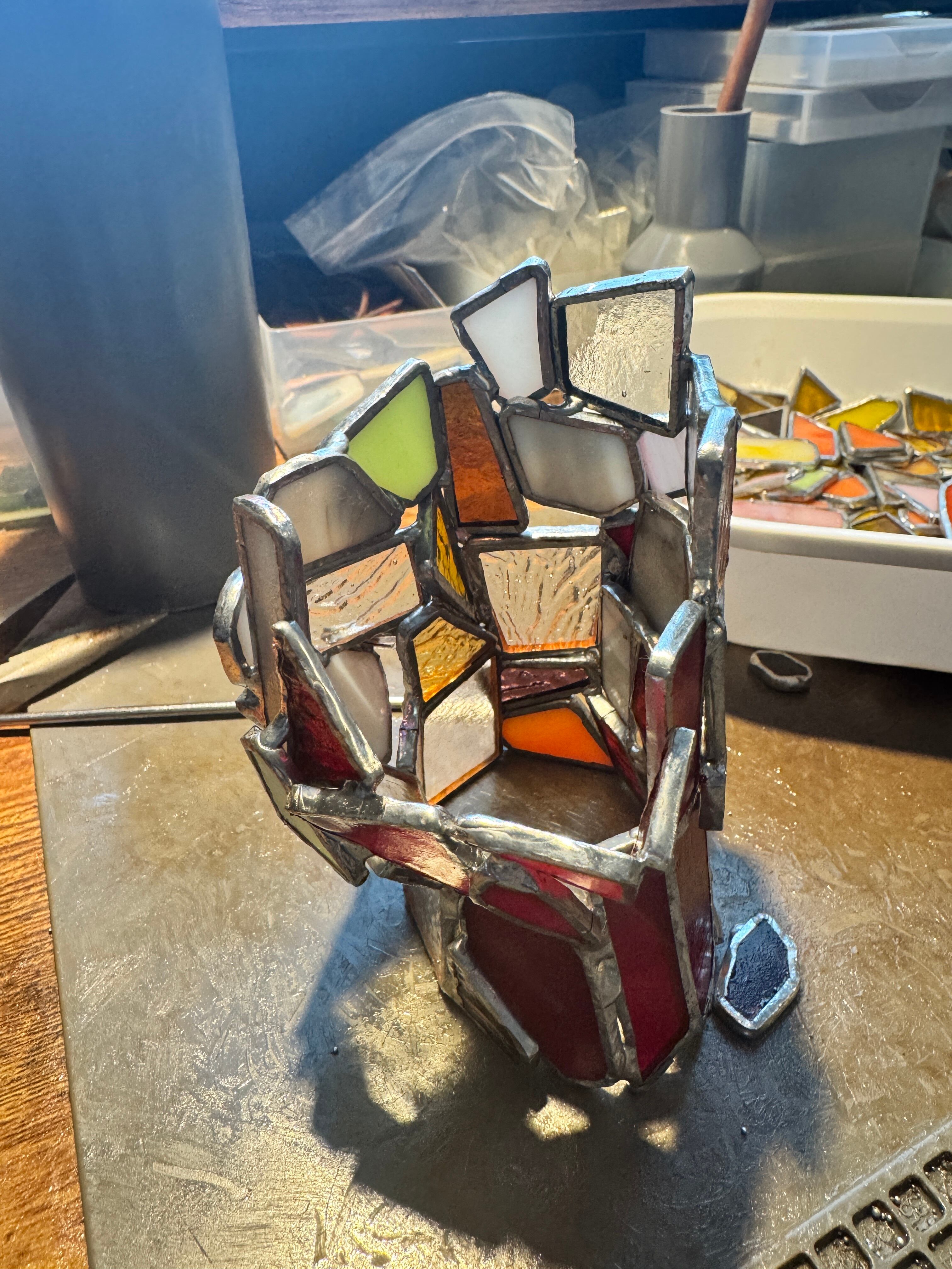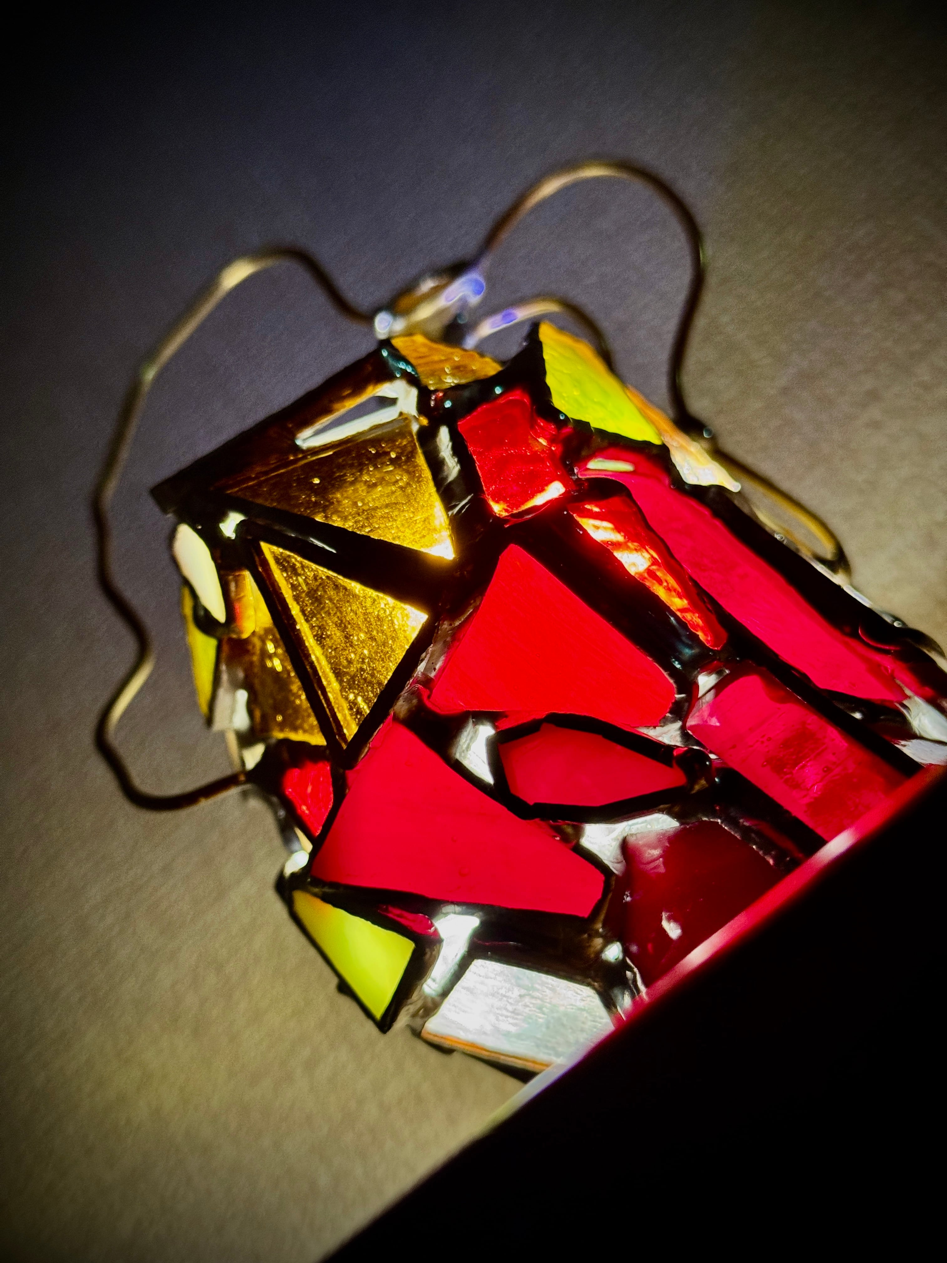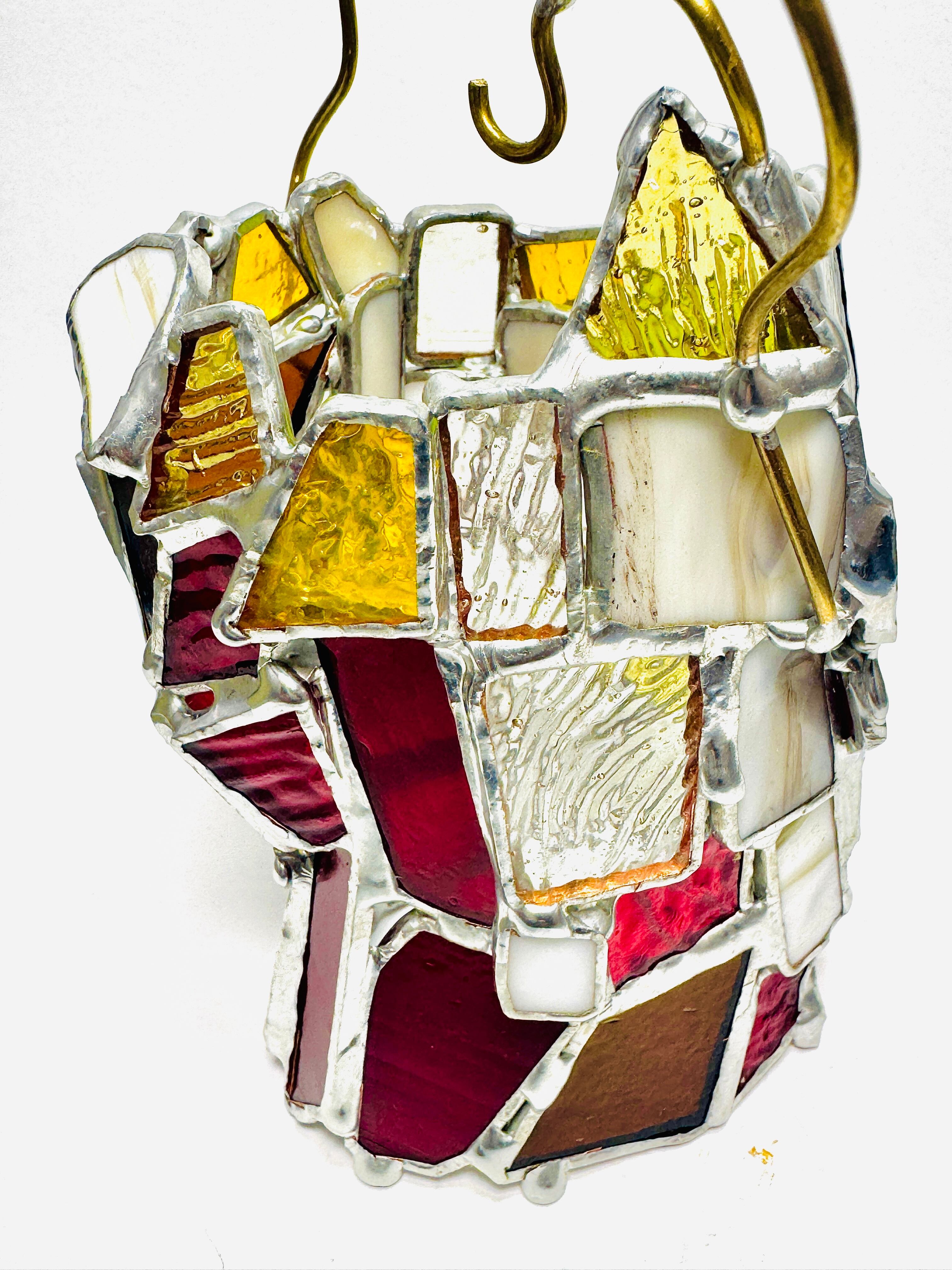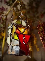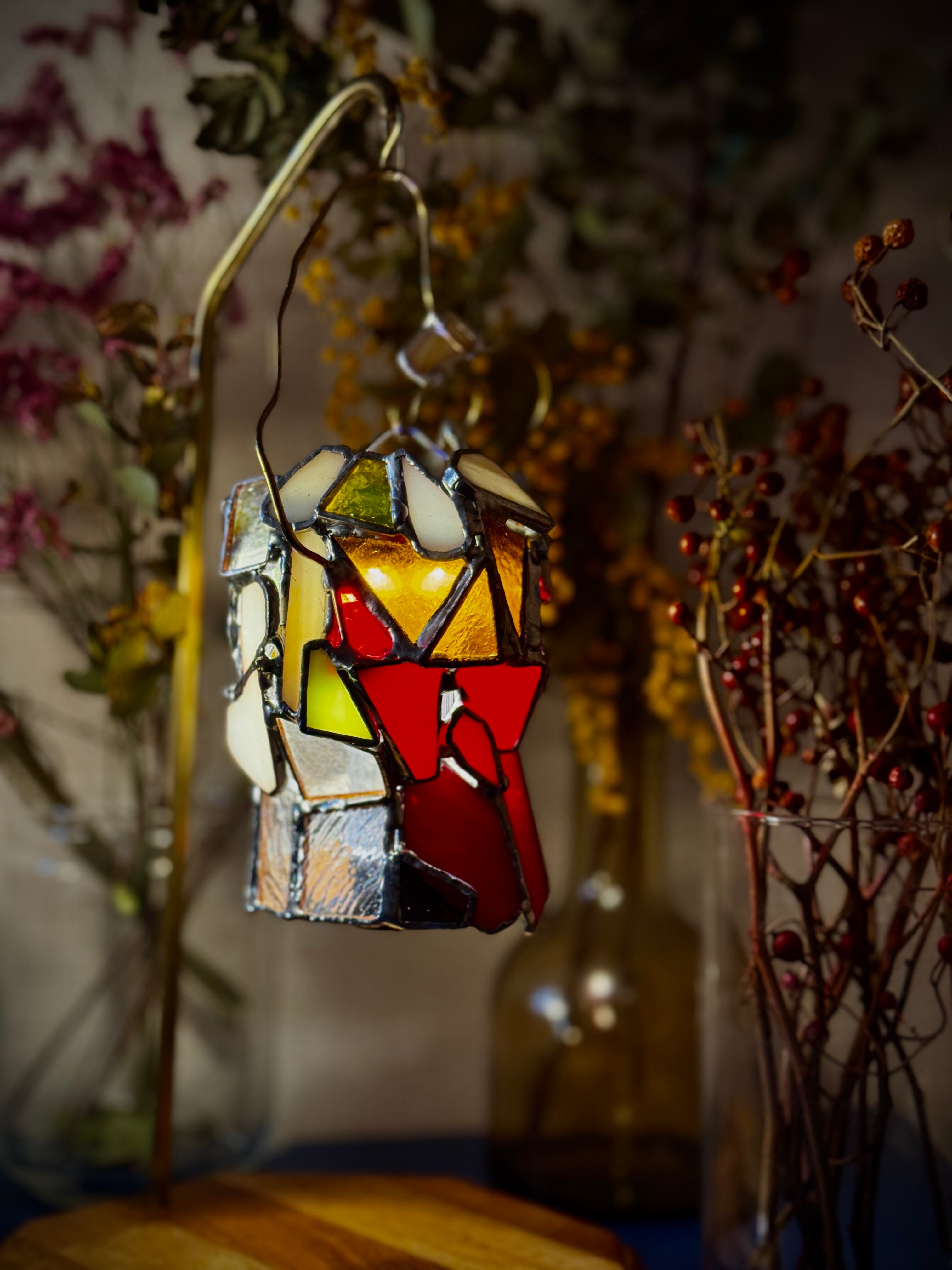 この作品は比較的小さいガラスで構成した、手乗りサイズのランタンシェードです。