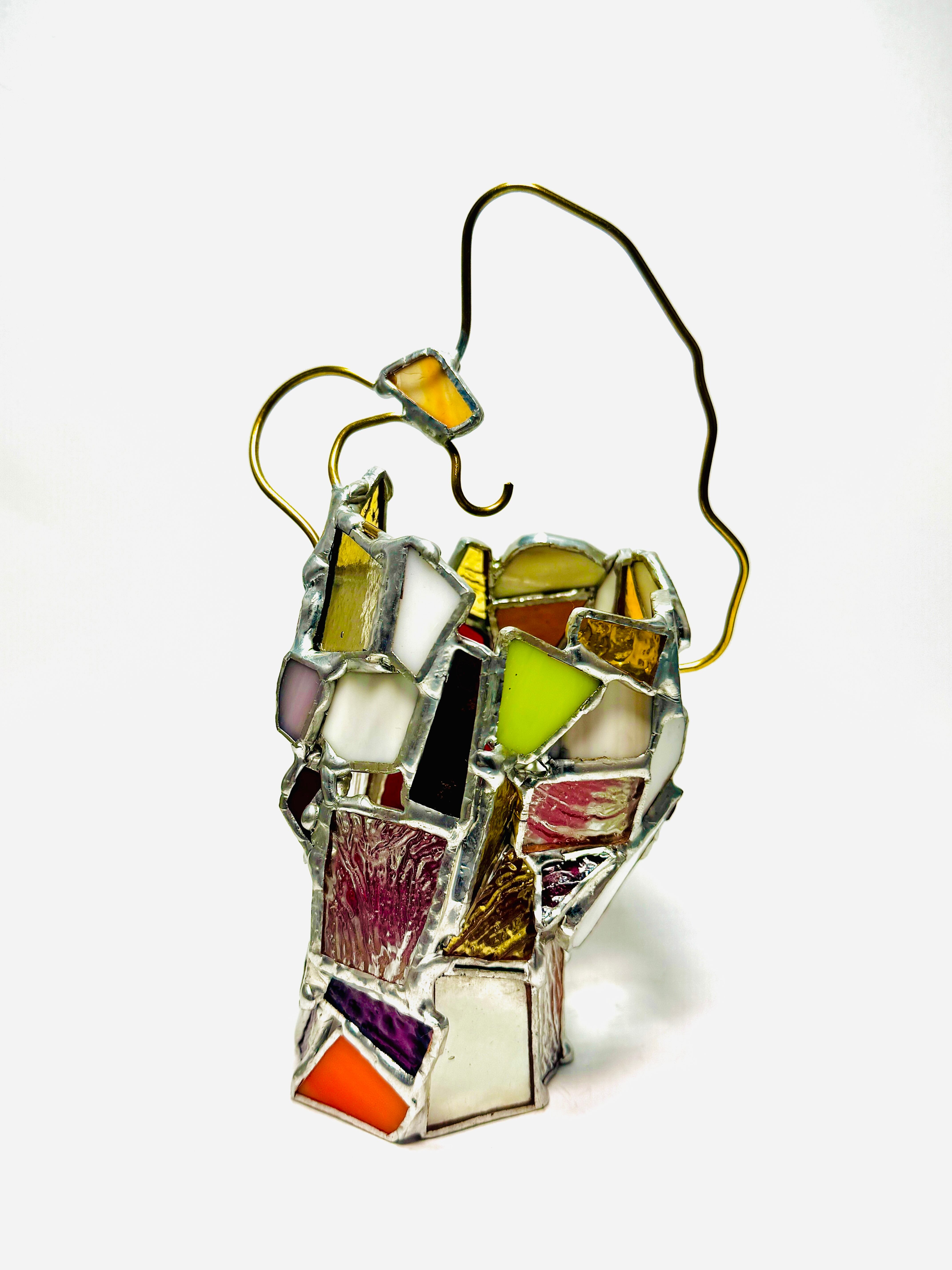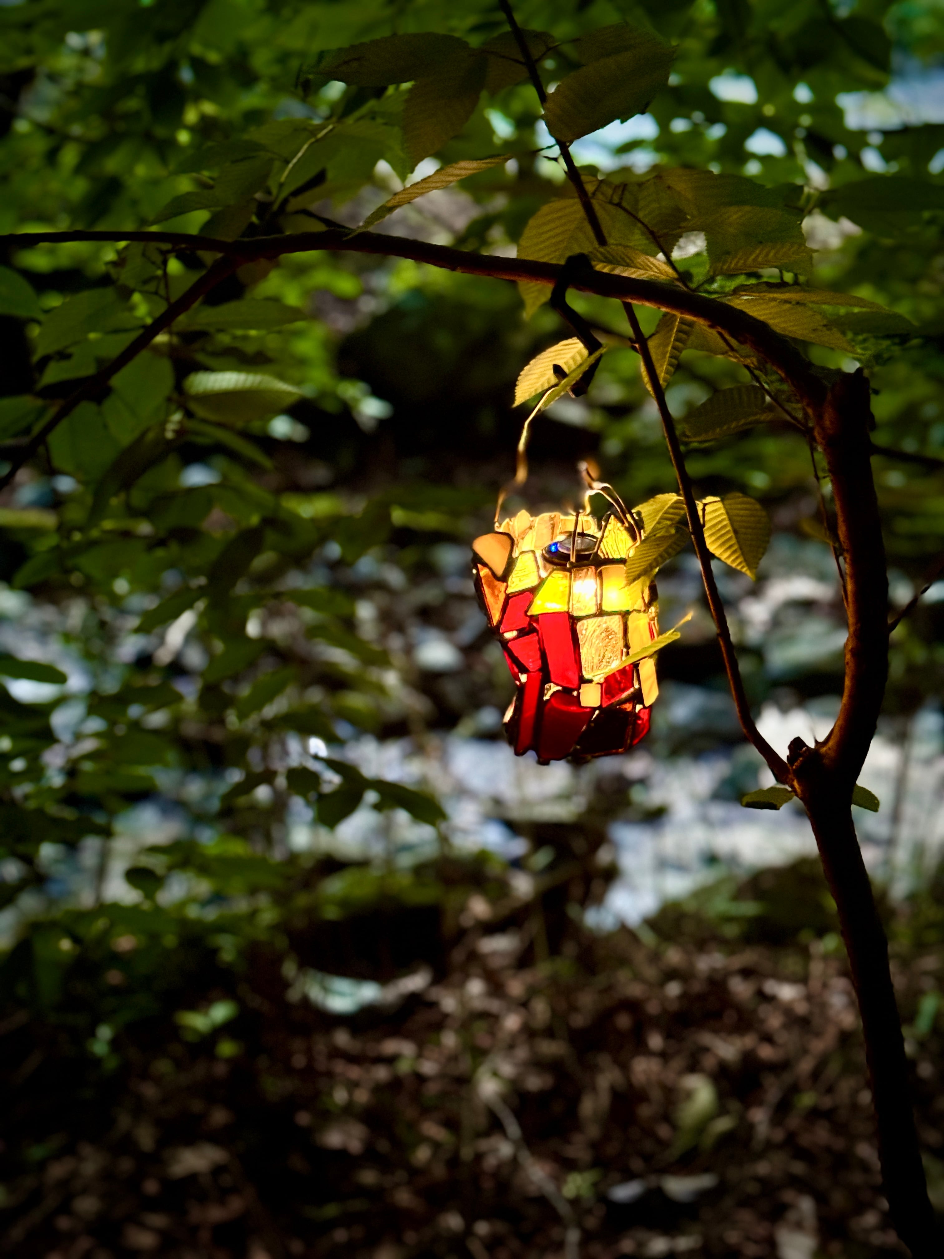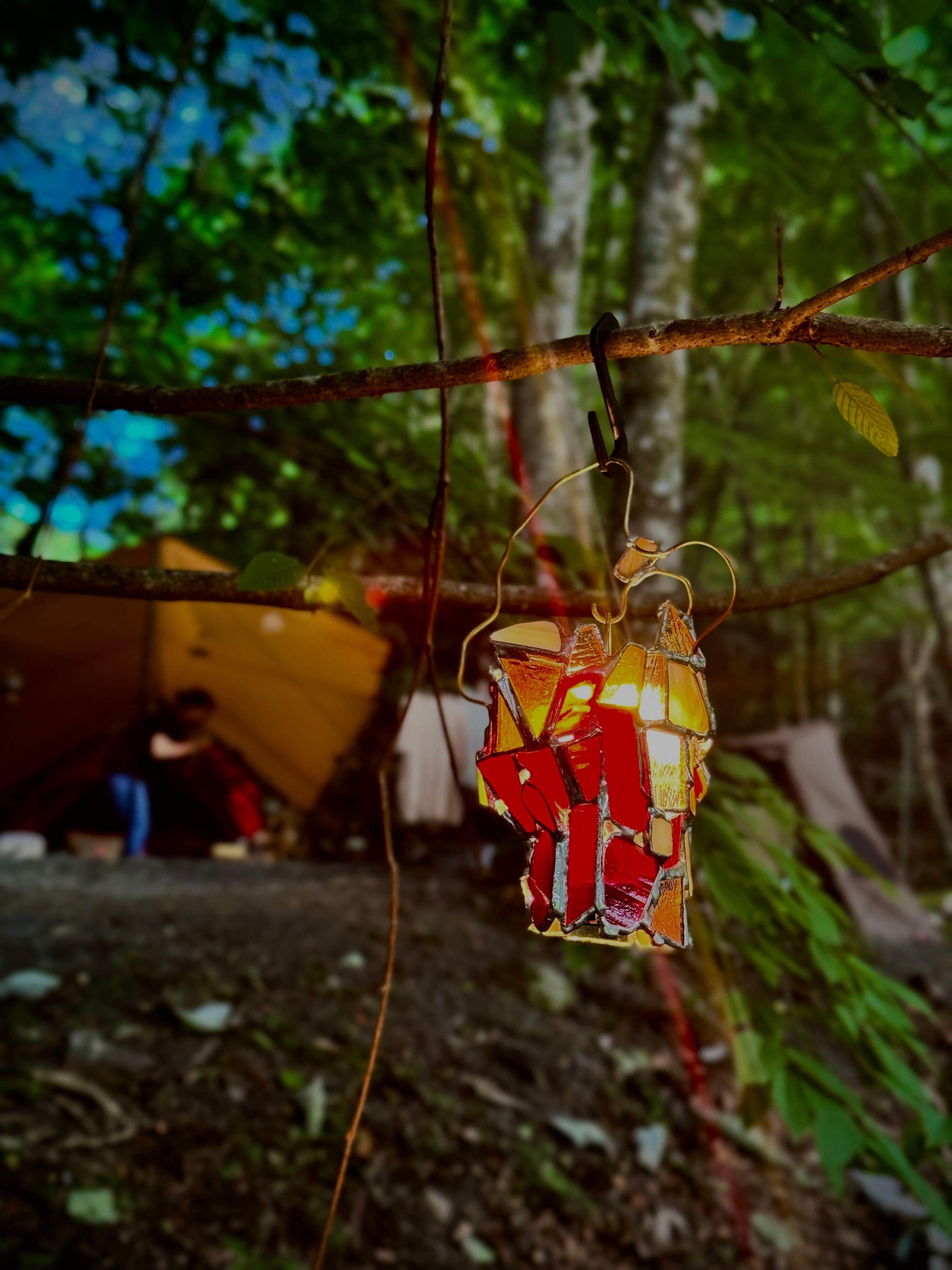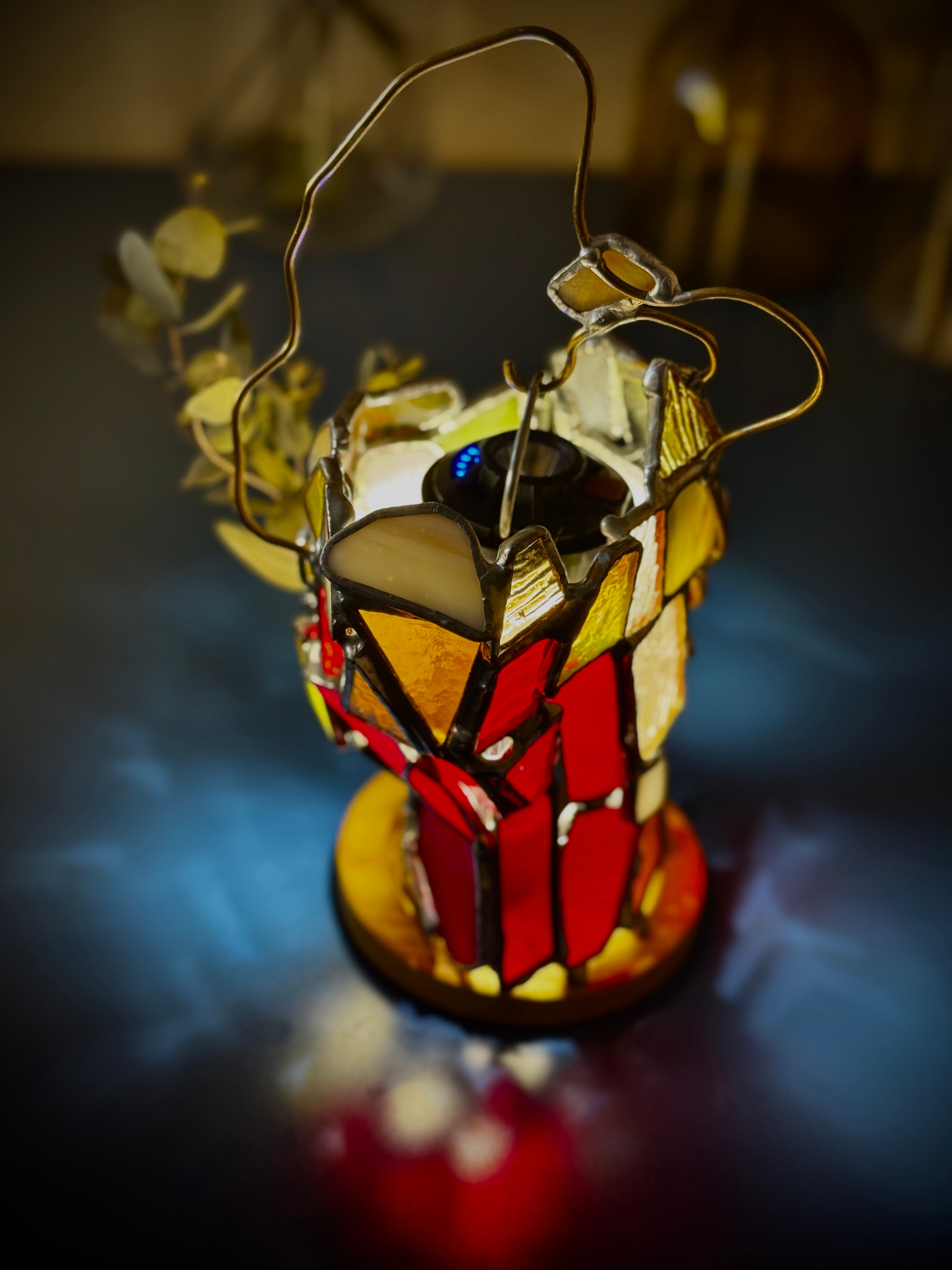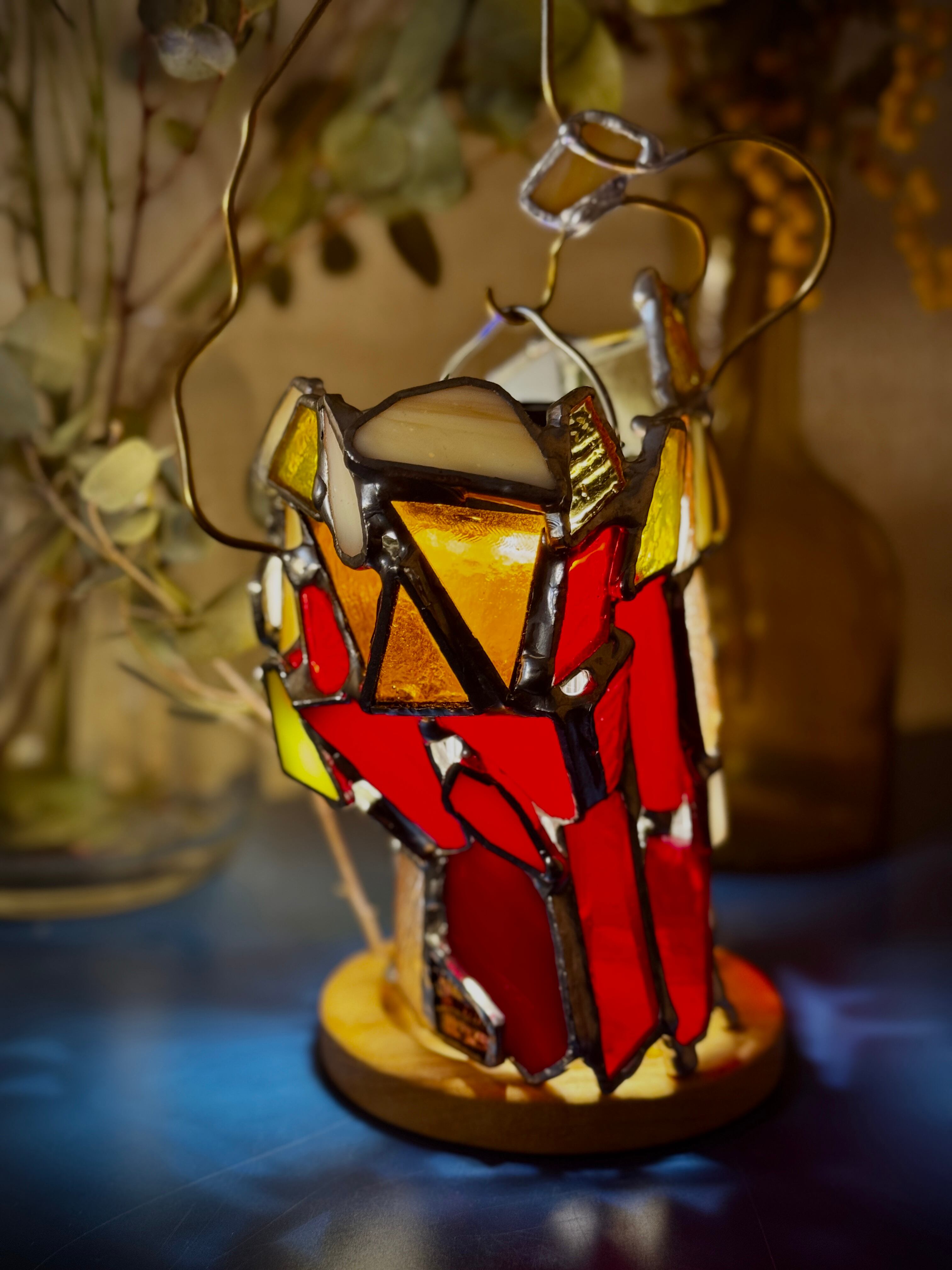 この作品は比較的小さいガラスで構成した、手乗りサイズのランタンシェードです。