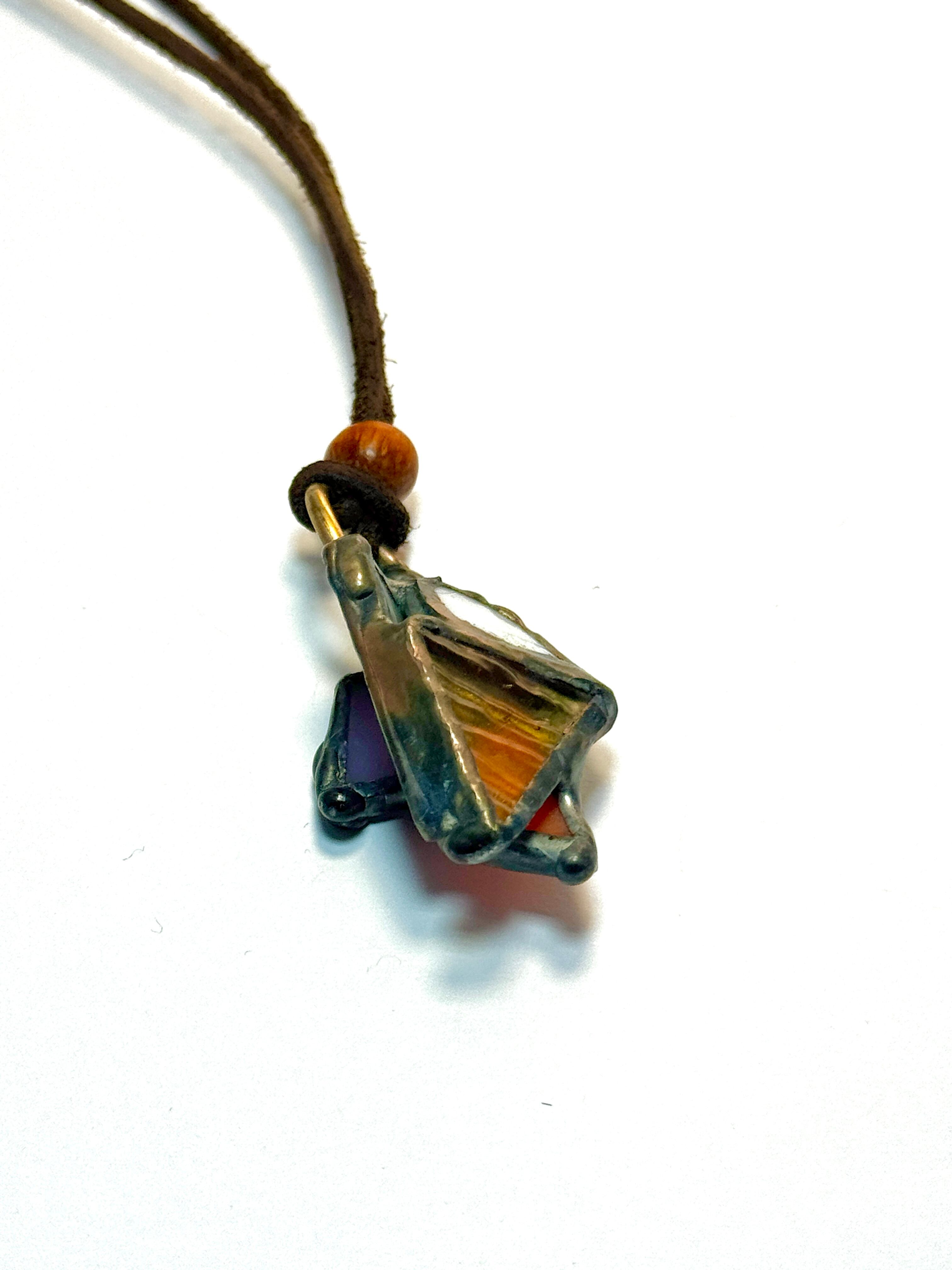 小さく加工したガラスを5枚とハンダを使って、インスピレーションで立体化させてあります。