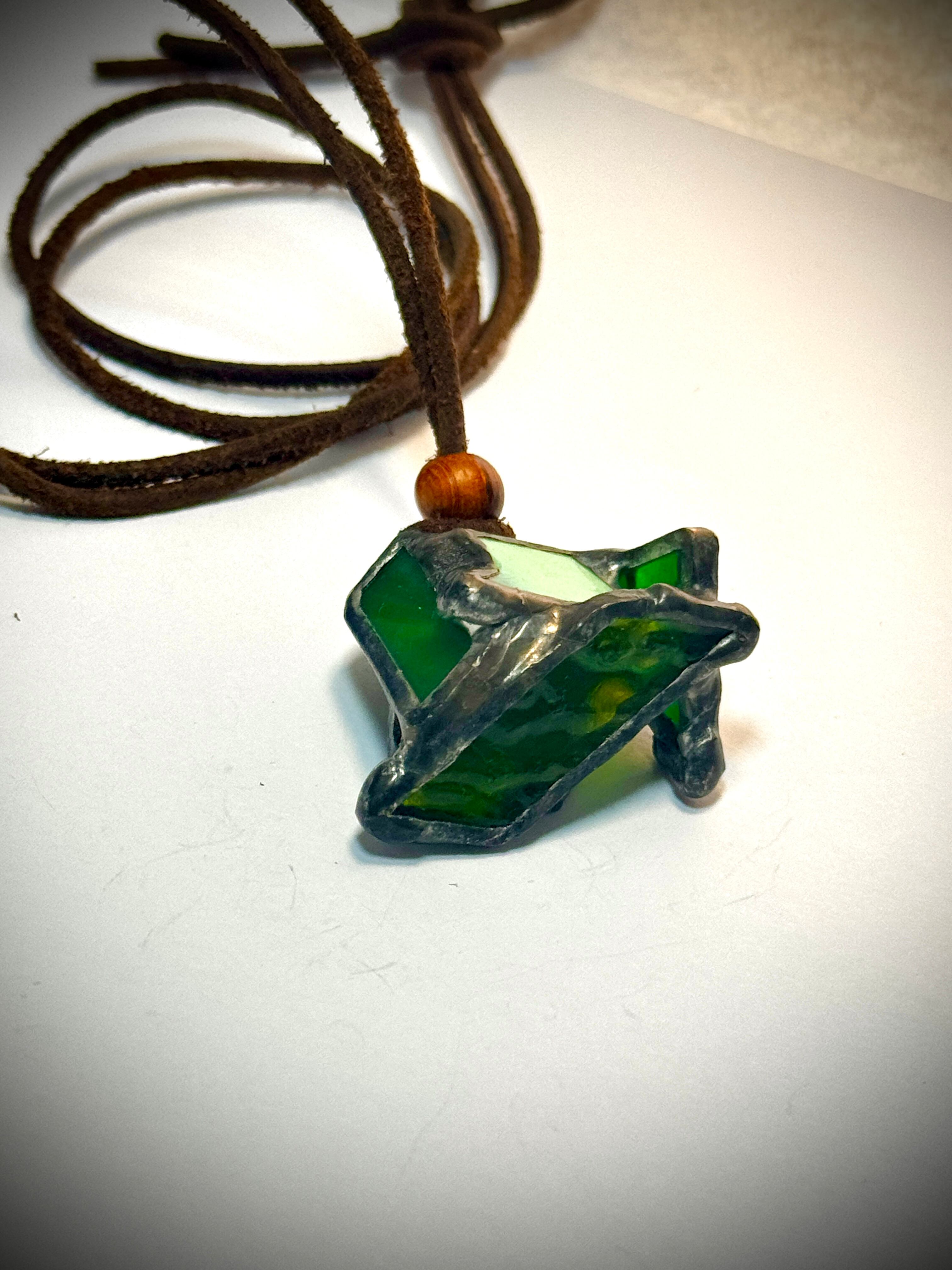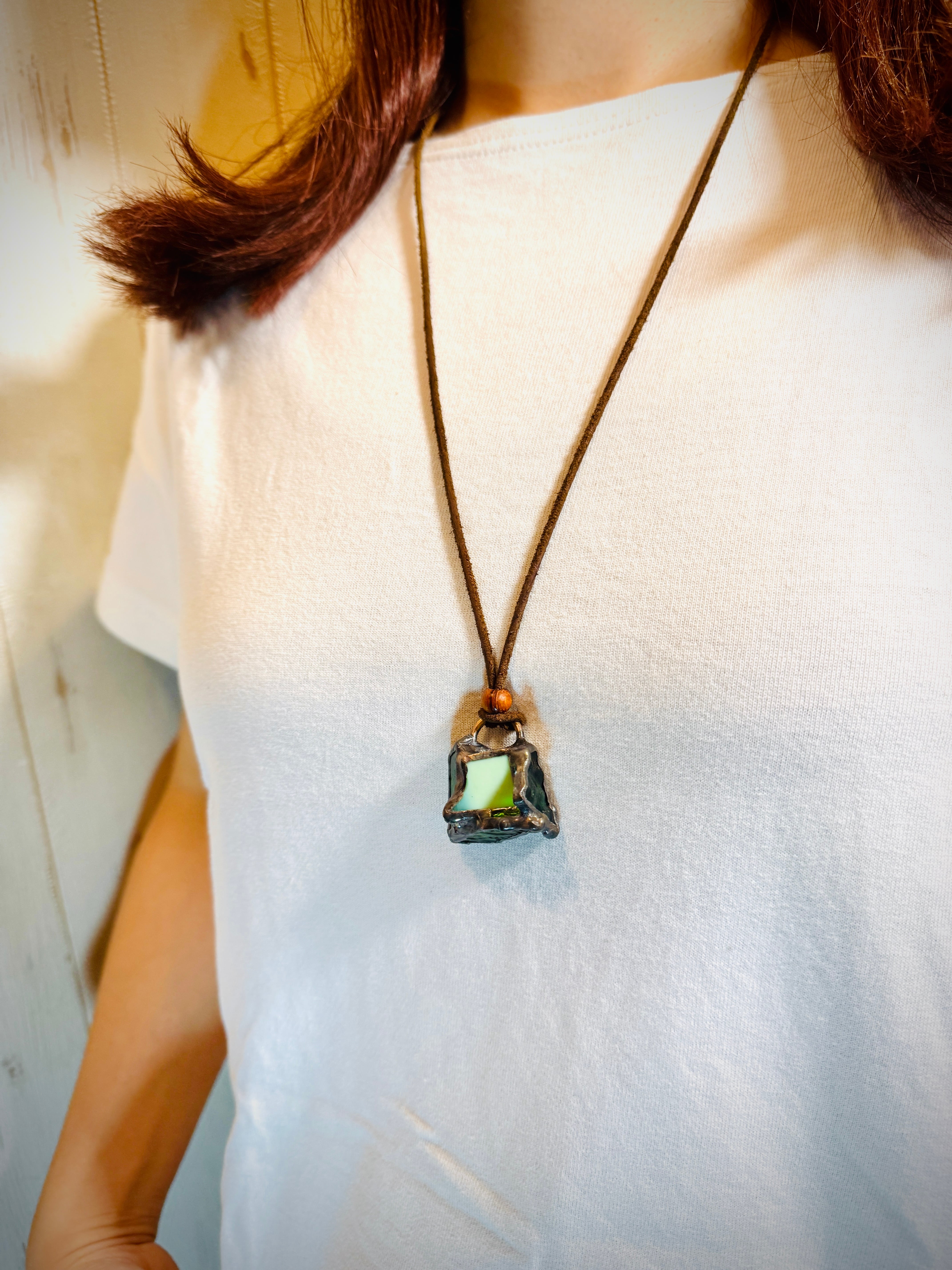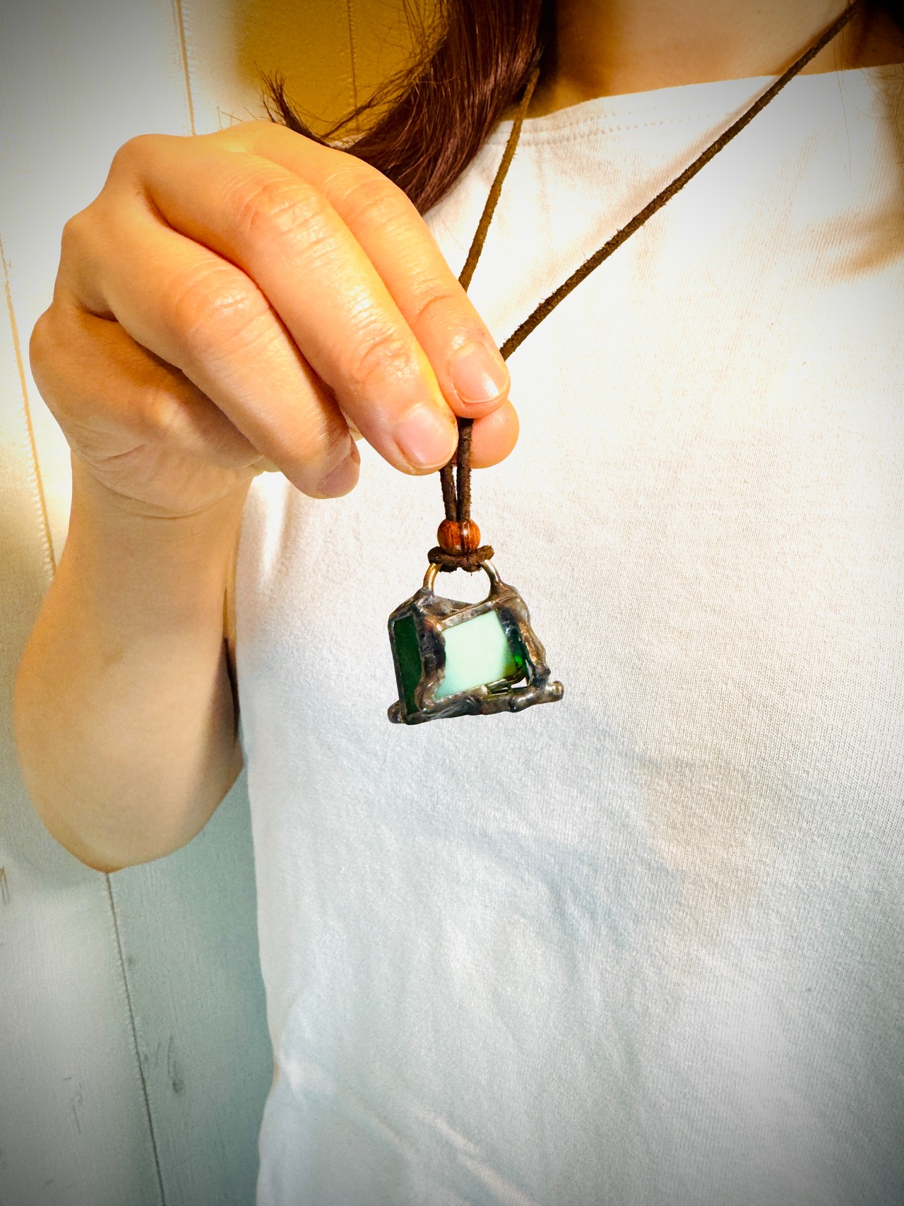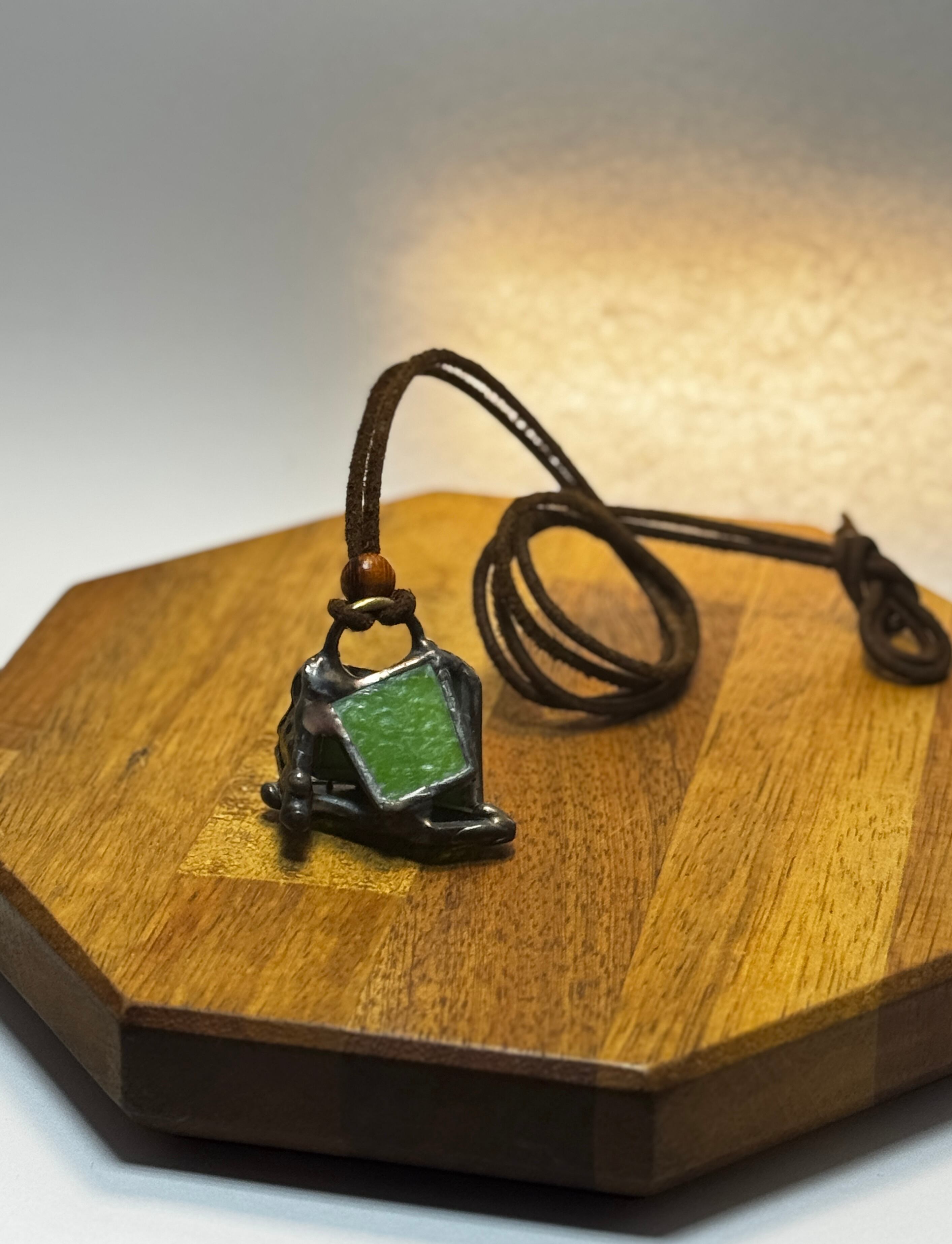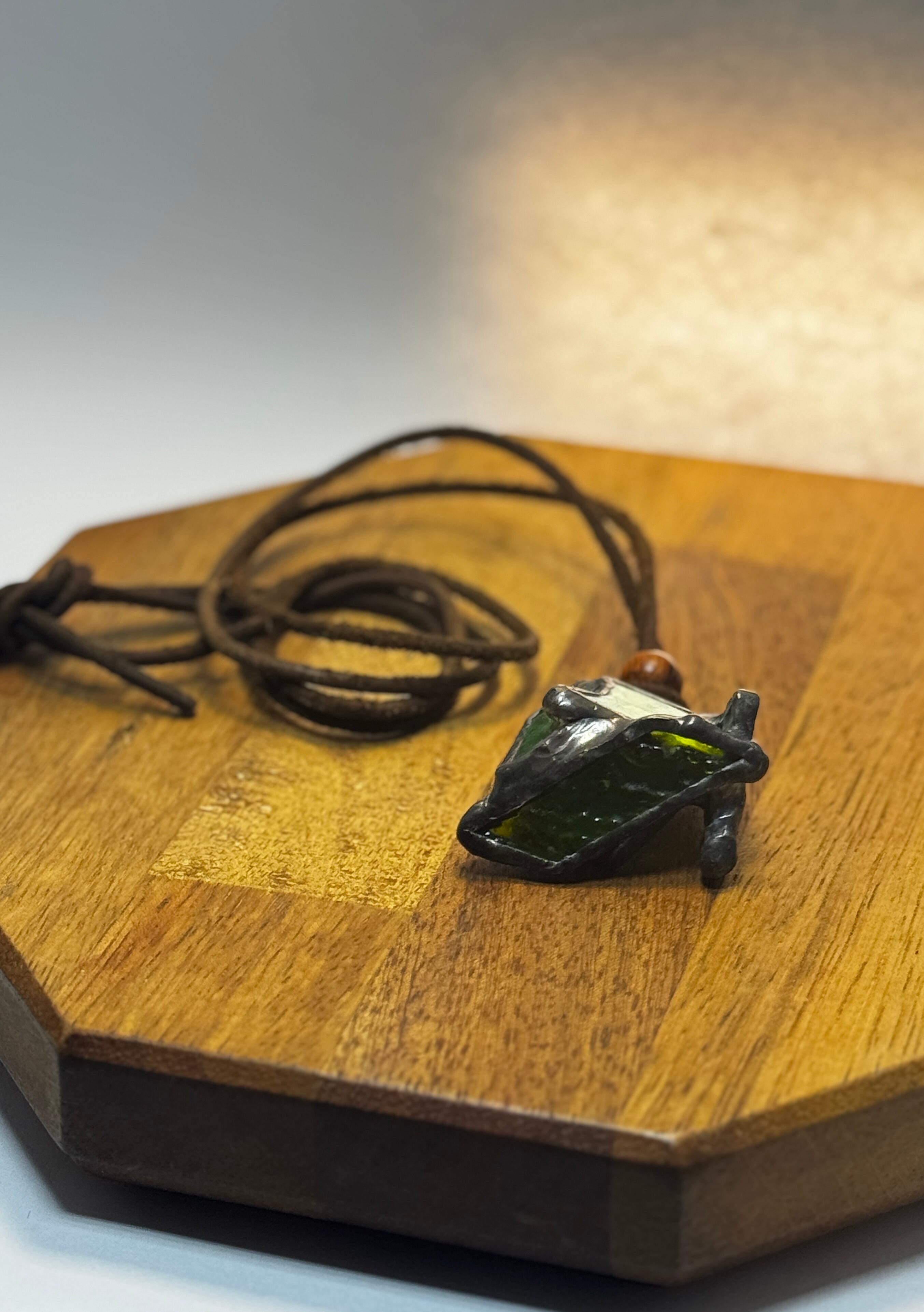 ガラス、ハンダ(すず・鉛)、水牛皮紐(太さ2mm)、