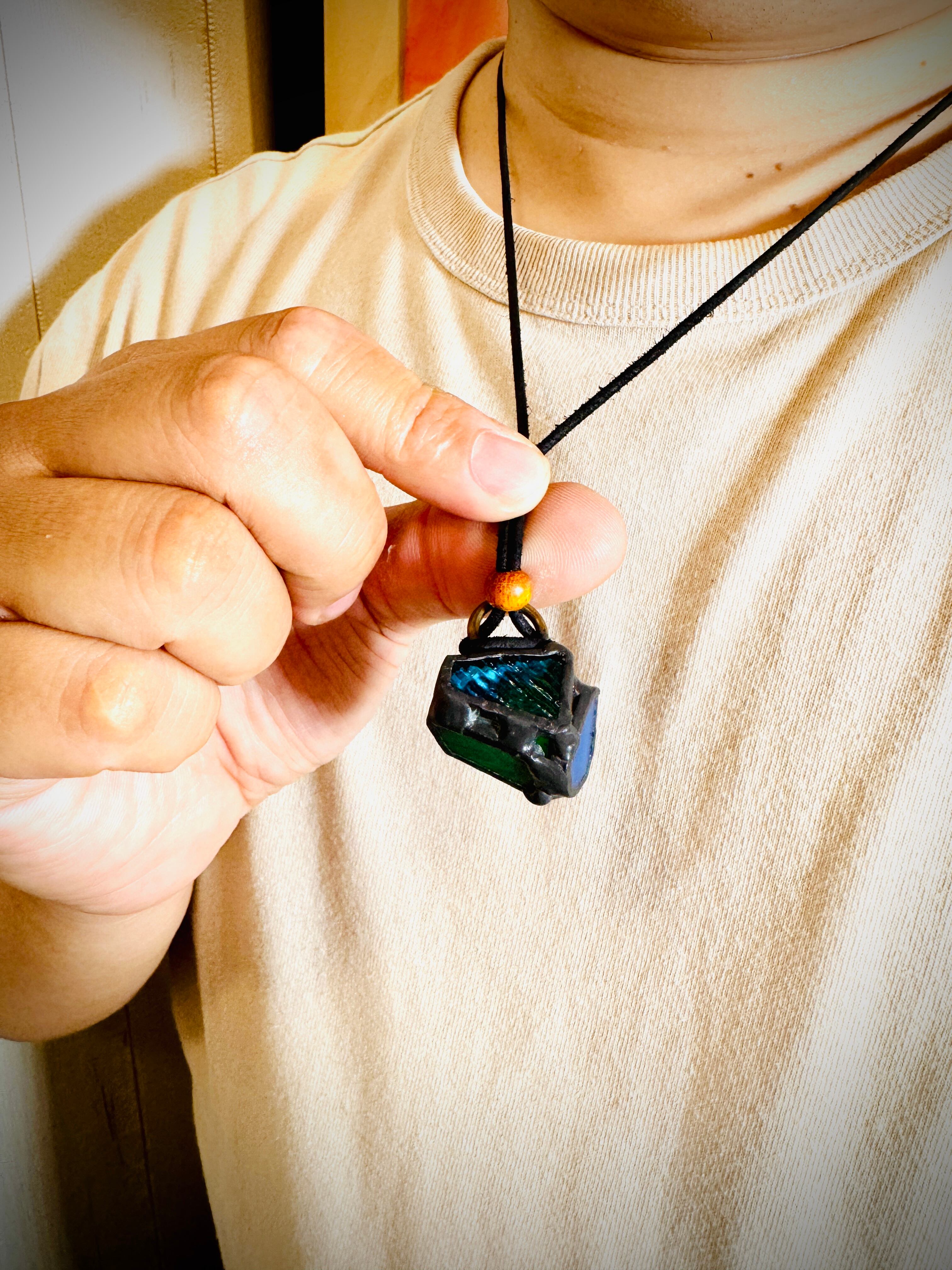 そして、効力とかご利益とかその辺りに関しても、あくまでもステンドグラス作家osotoの勝手な願いを込めた作品であることをご理解いただけたらありがたいです。「安全に過ごせるといいな」「怪我とか事故が無いといいな」「楽しい外時間になるといいな」という感じのペンダントです。