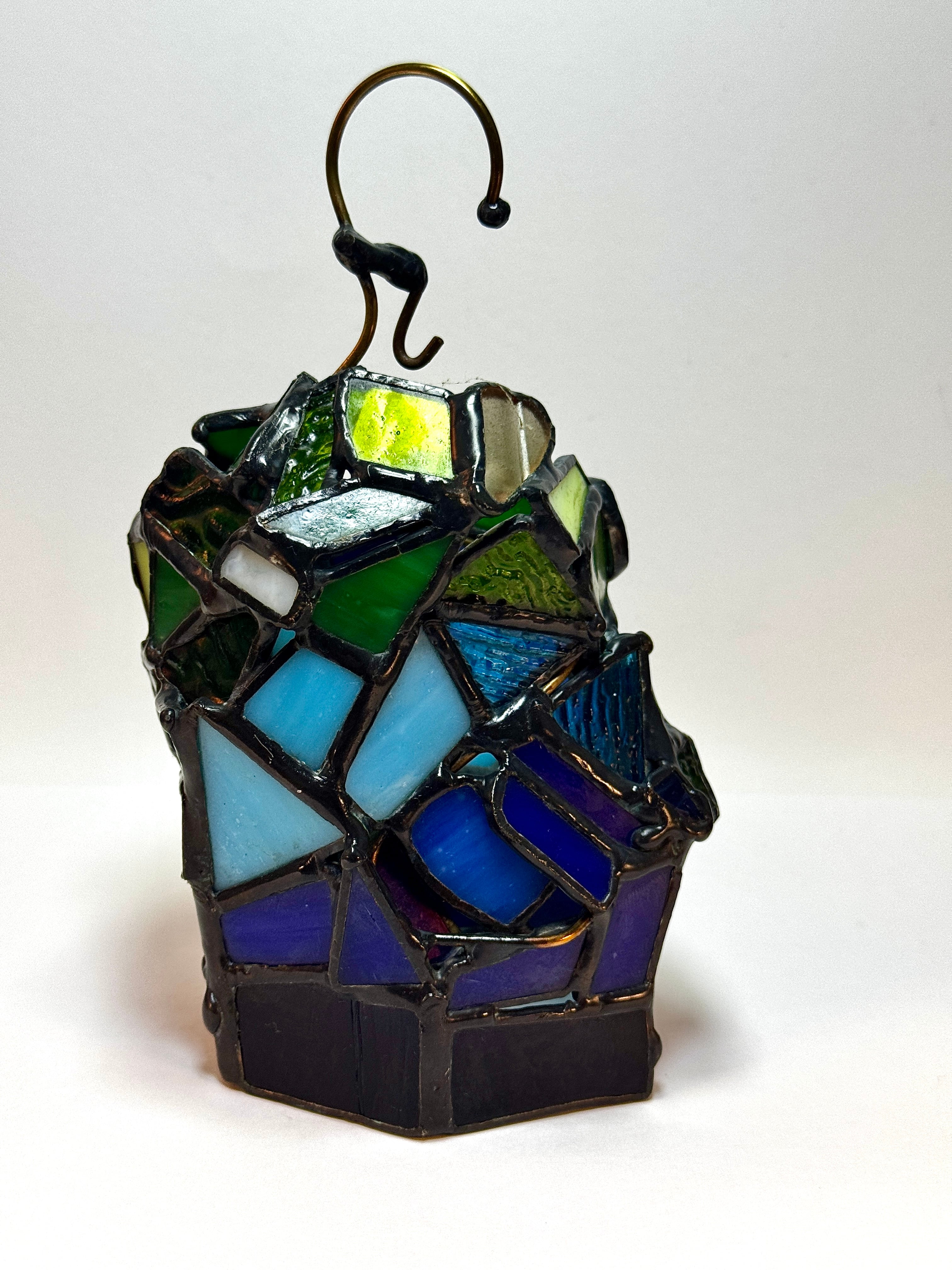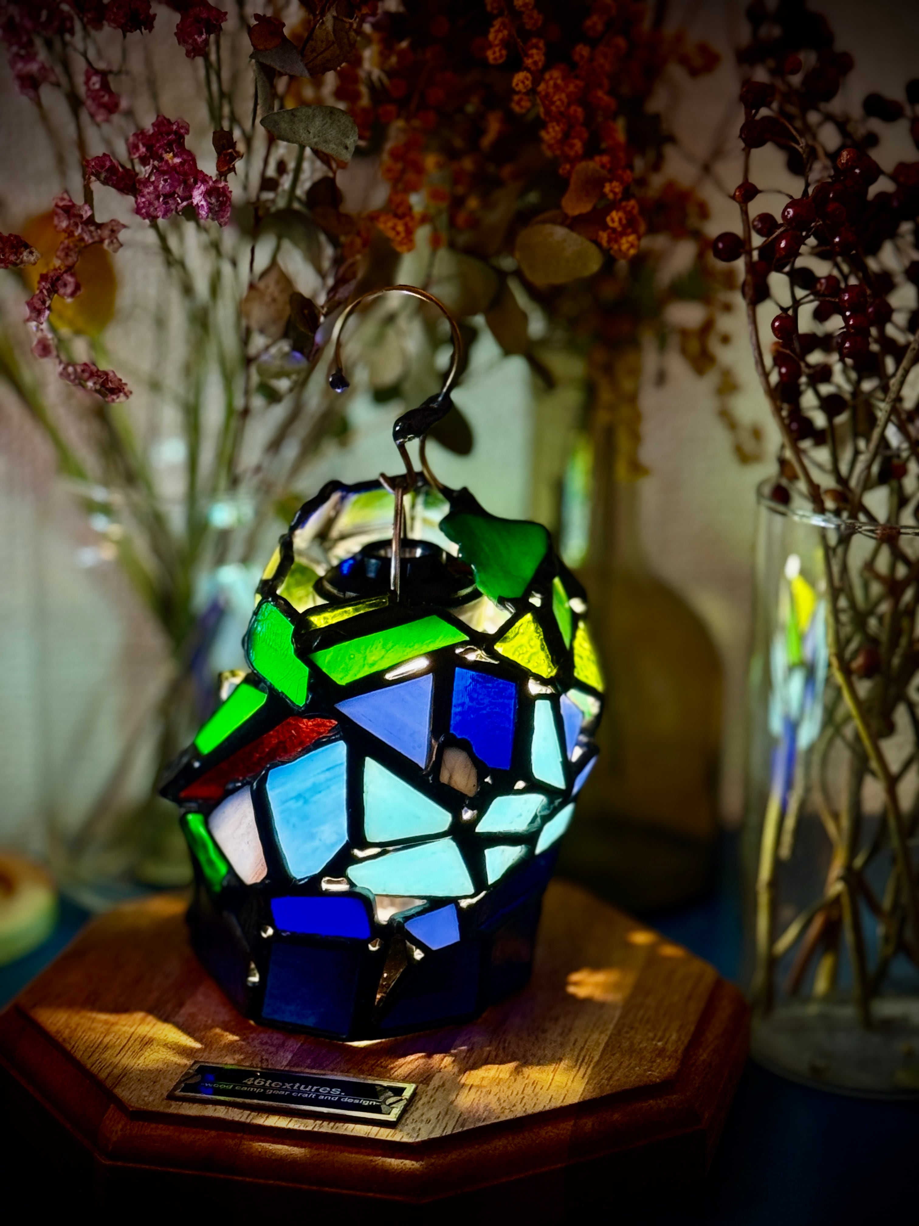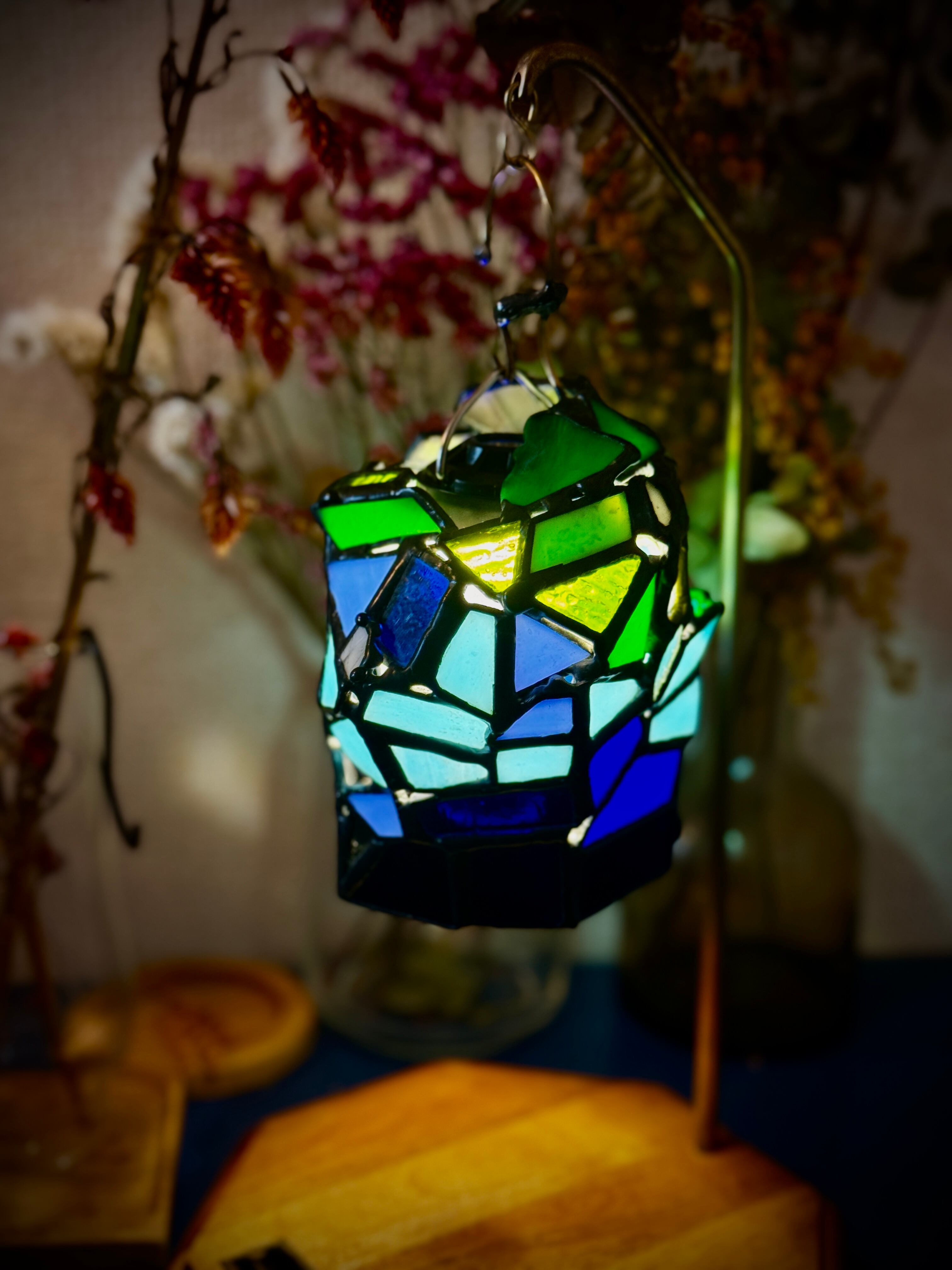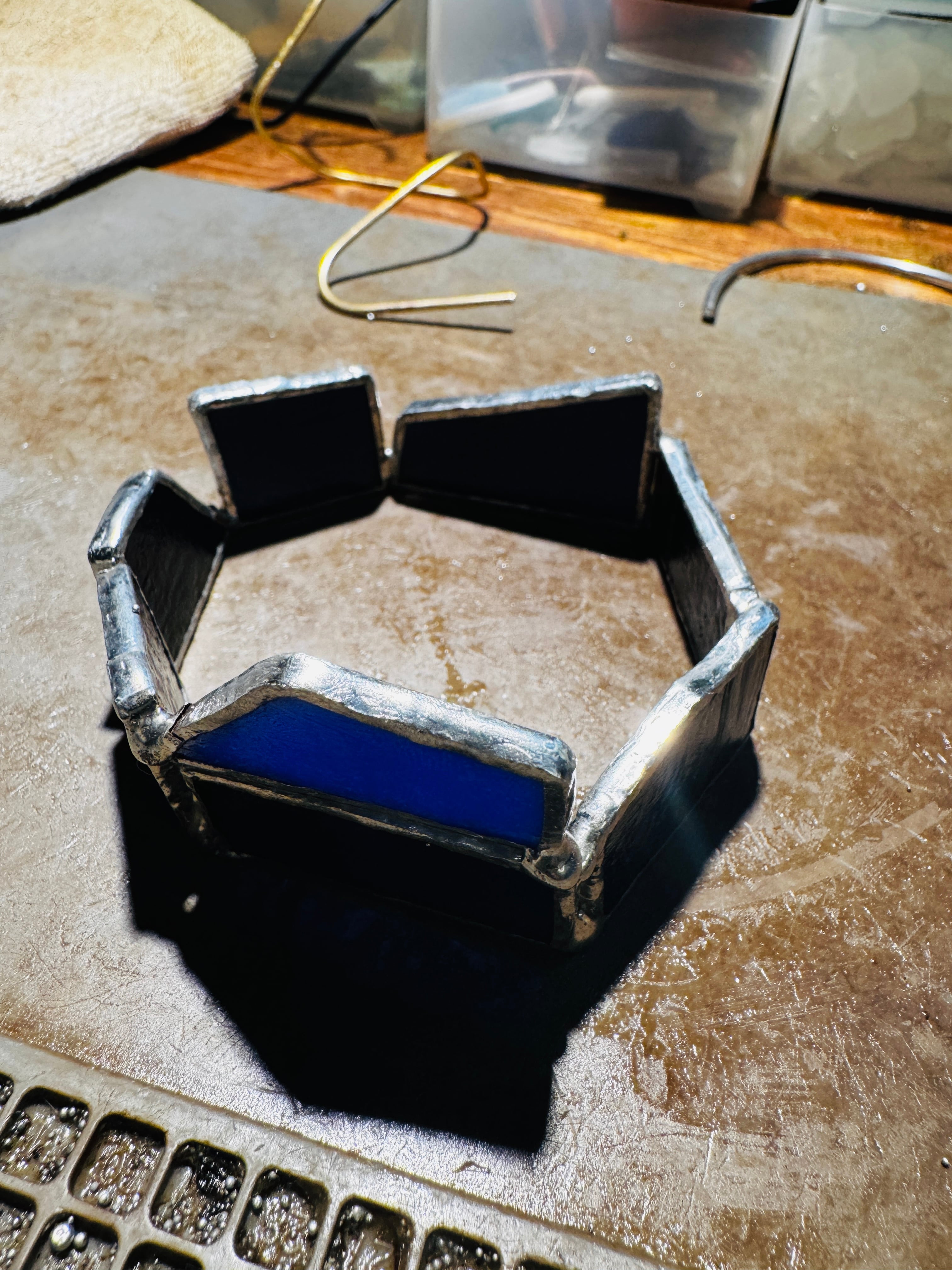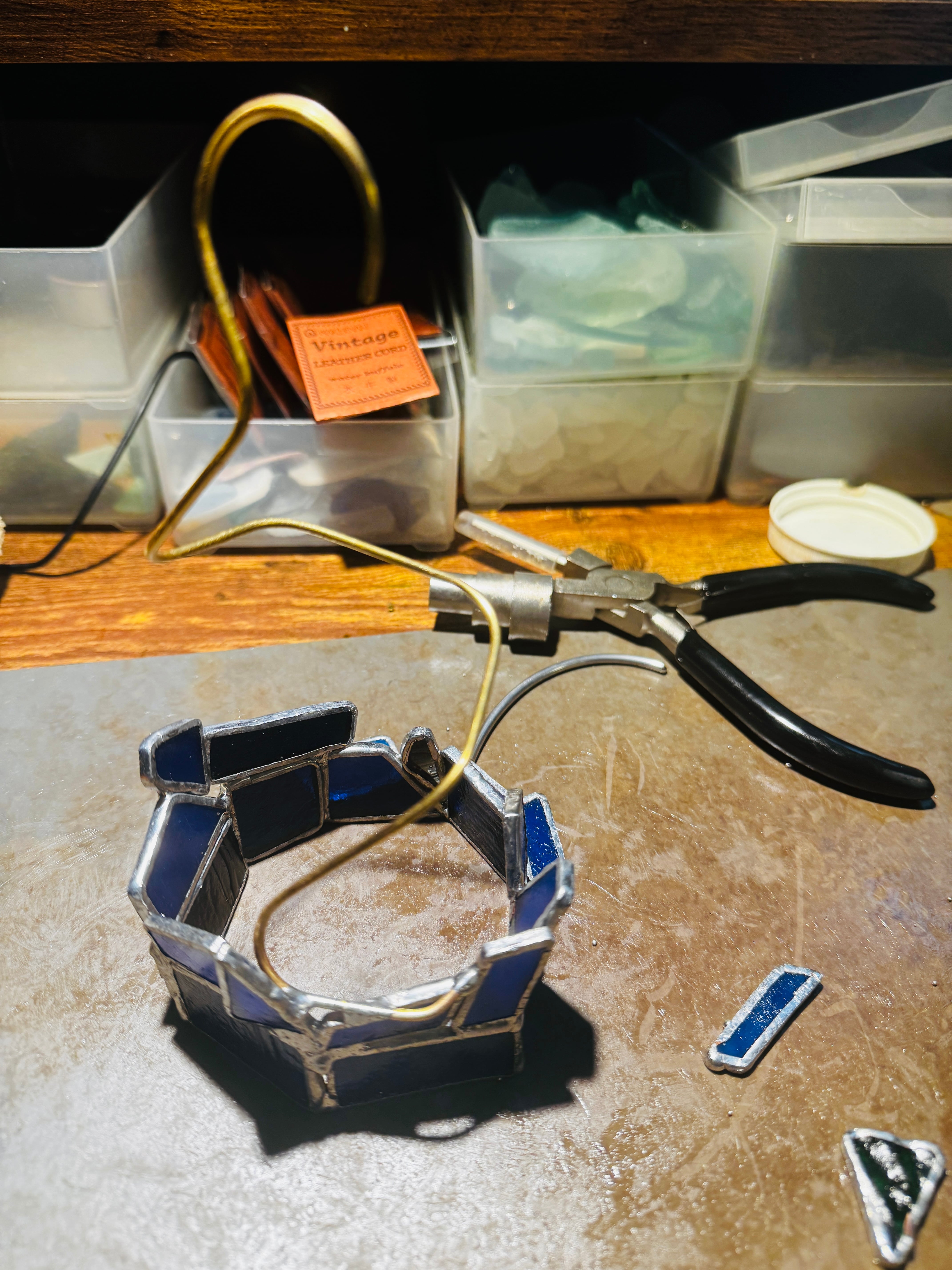 ハンダはガラスの鮮やかな青や緑が際立つように真っ黒にしてあります。
