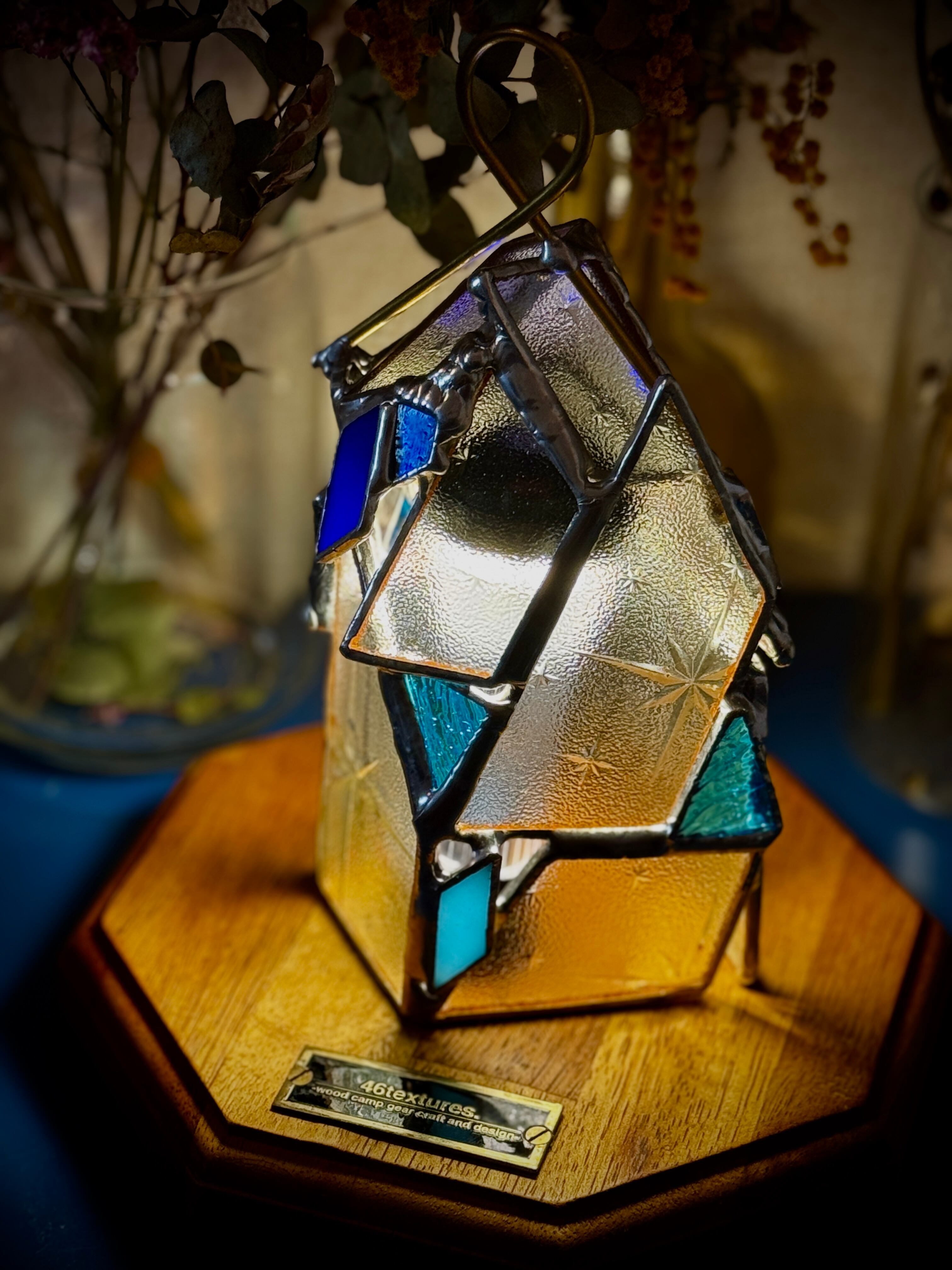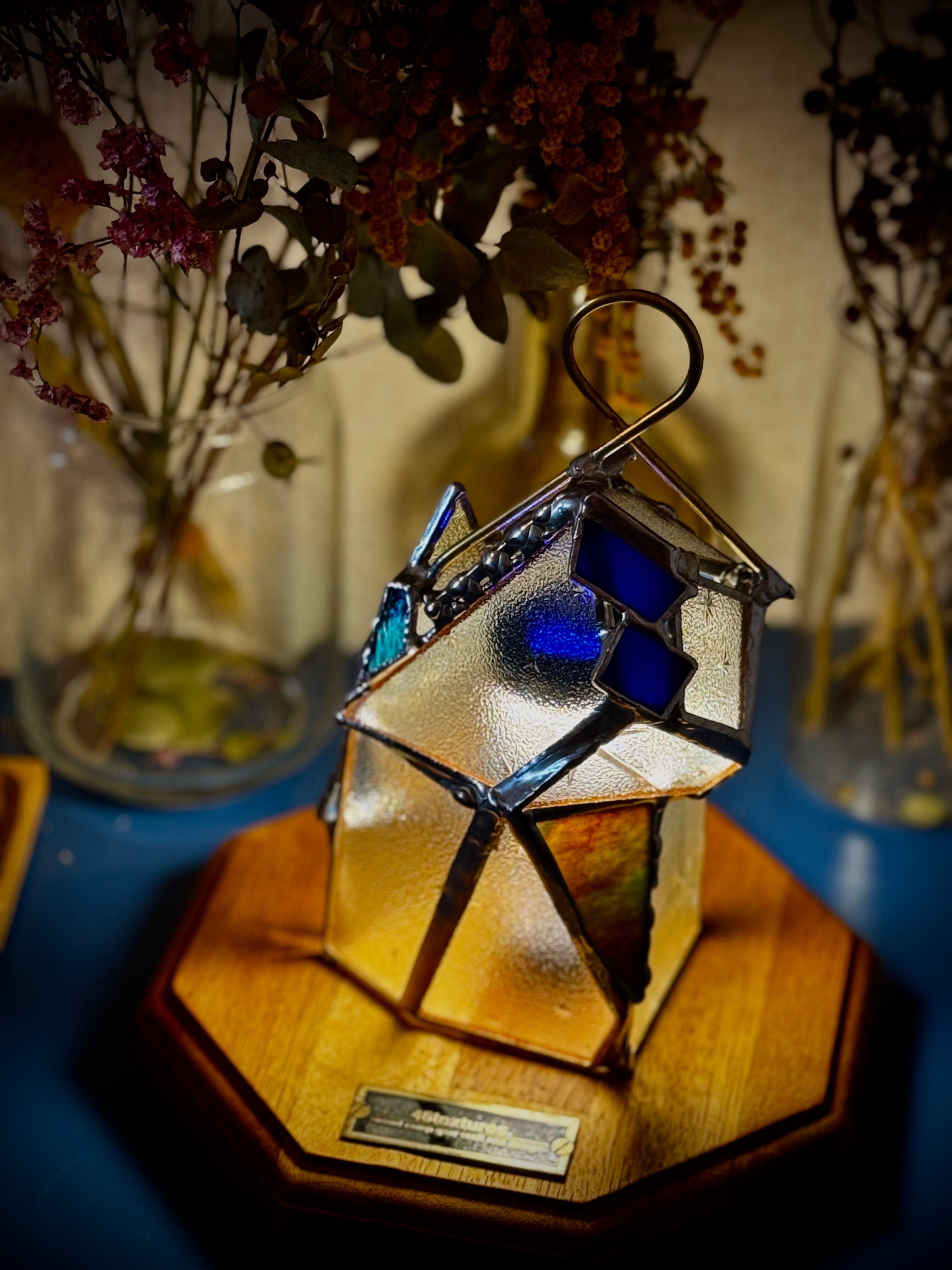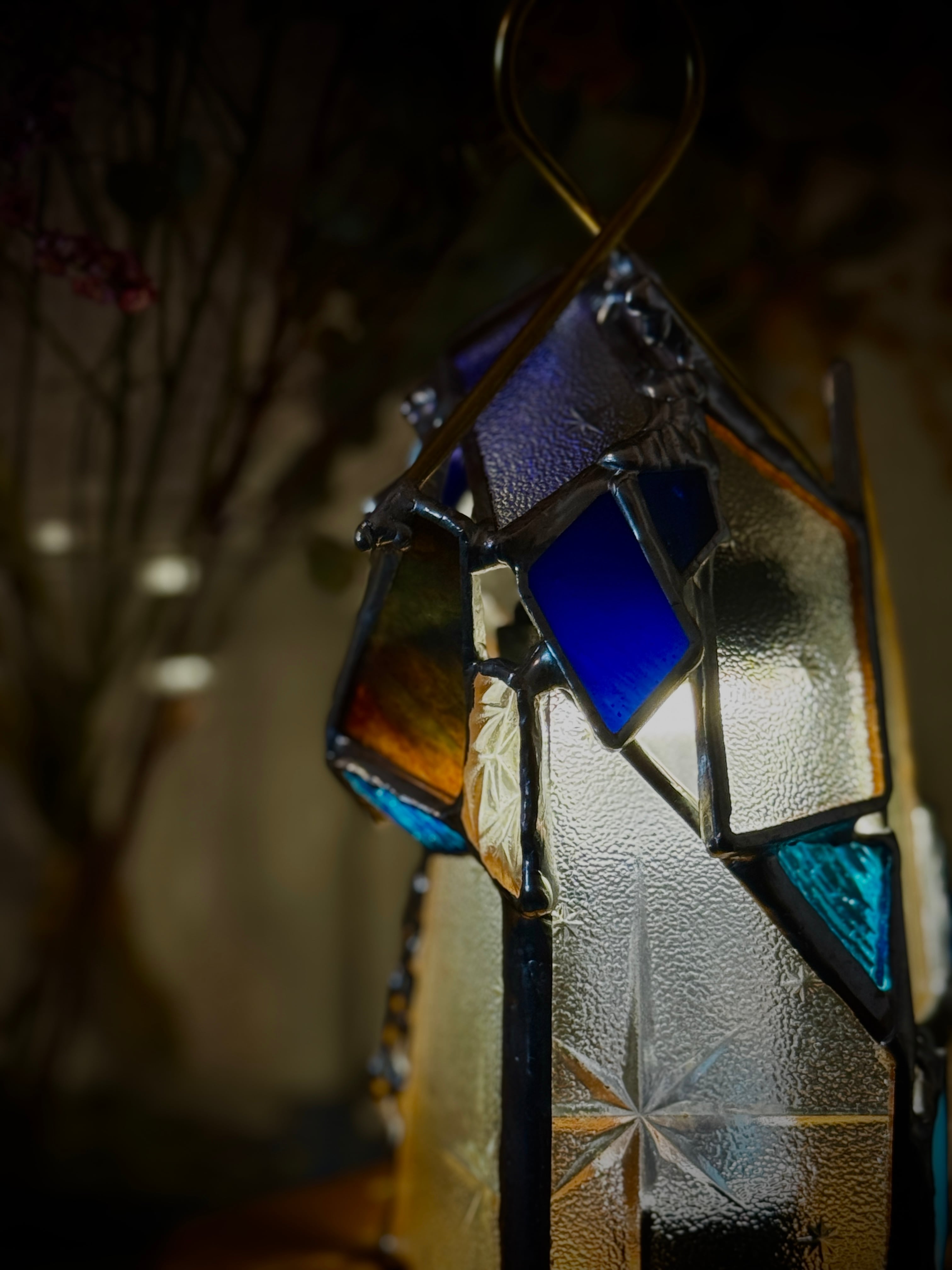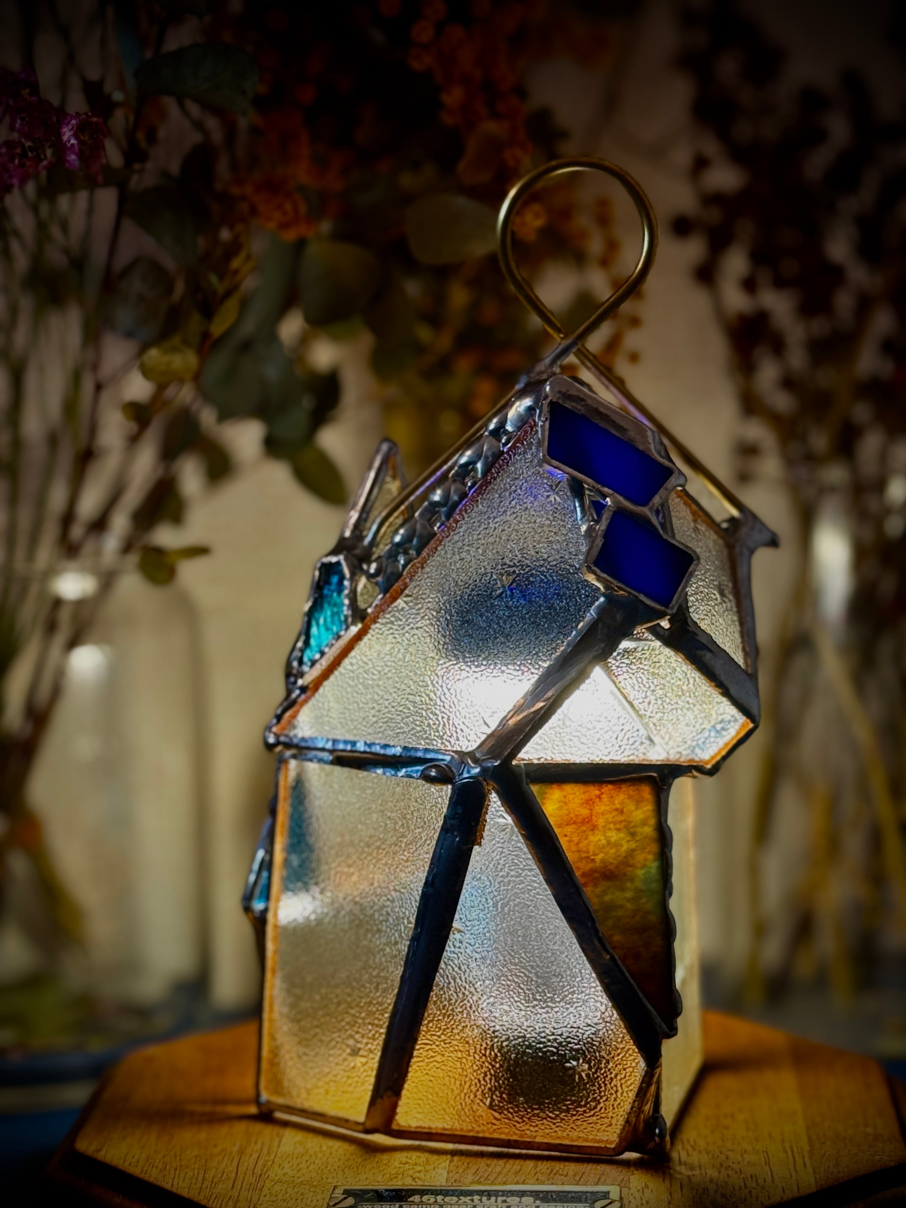 昭和の雰囲気を漂わせる型板ガラスを大きく使い、とんがり屋根の小さなおうちのように組み上げました。所々に青系の板ガラスを小さめにあしらってポップな雑貨感を出してます。