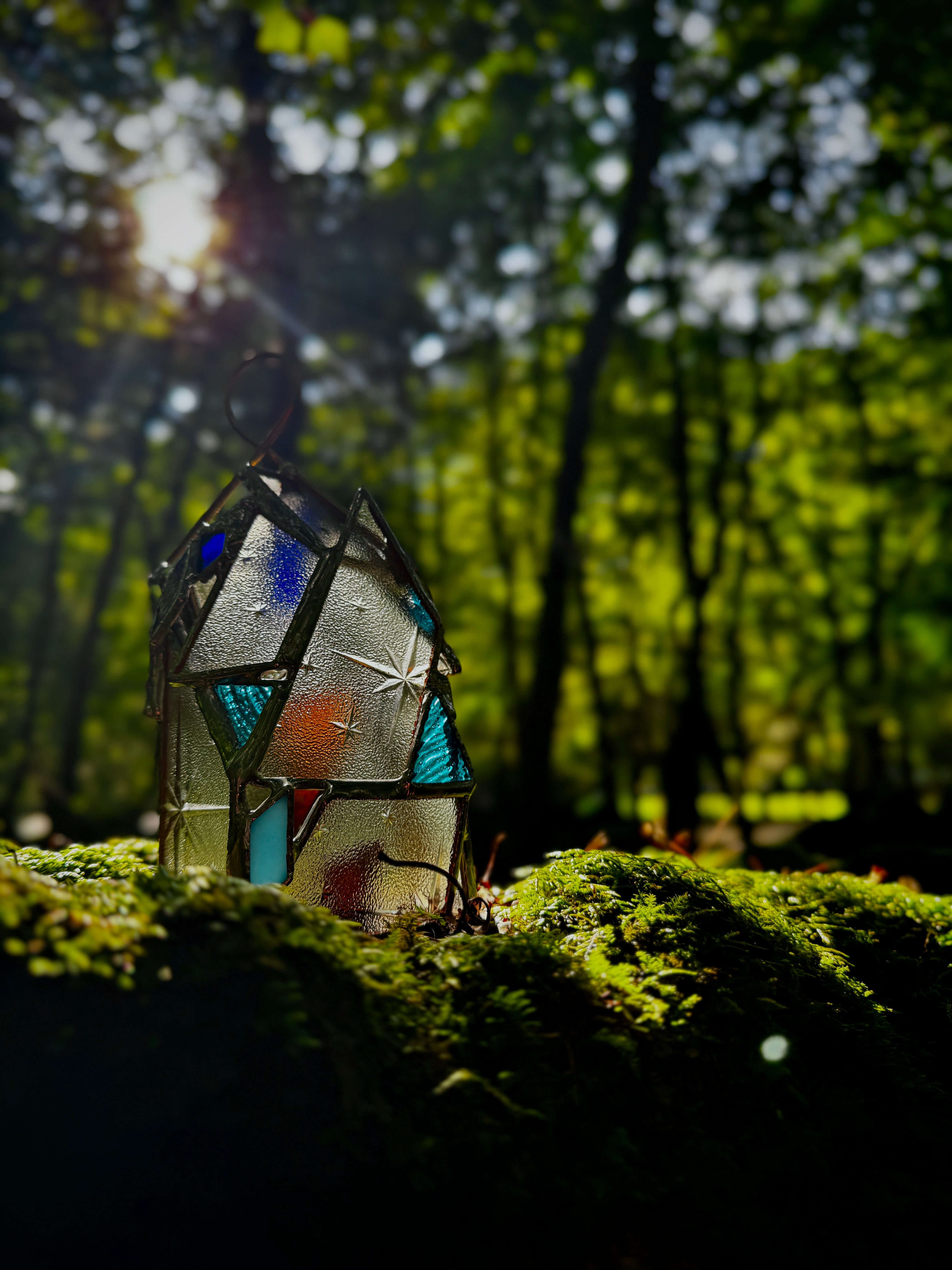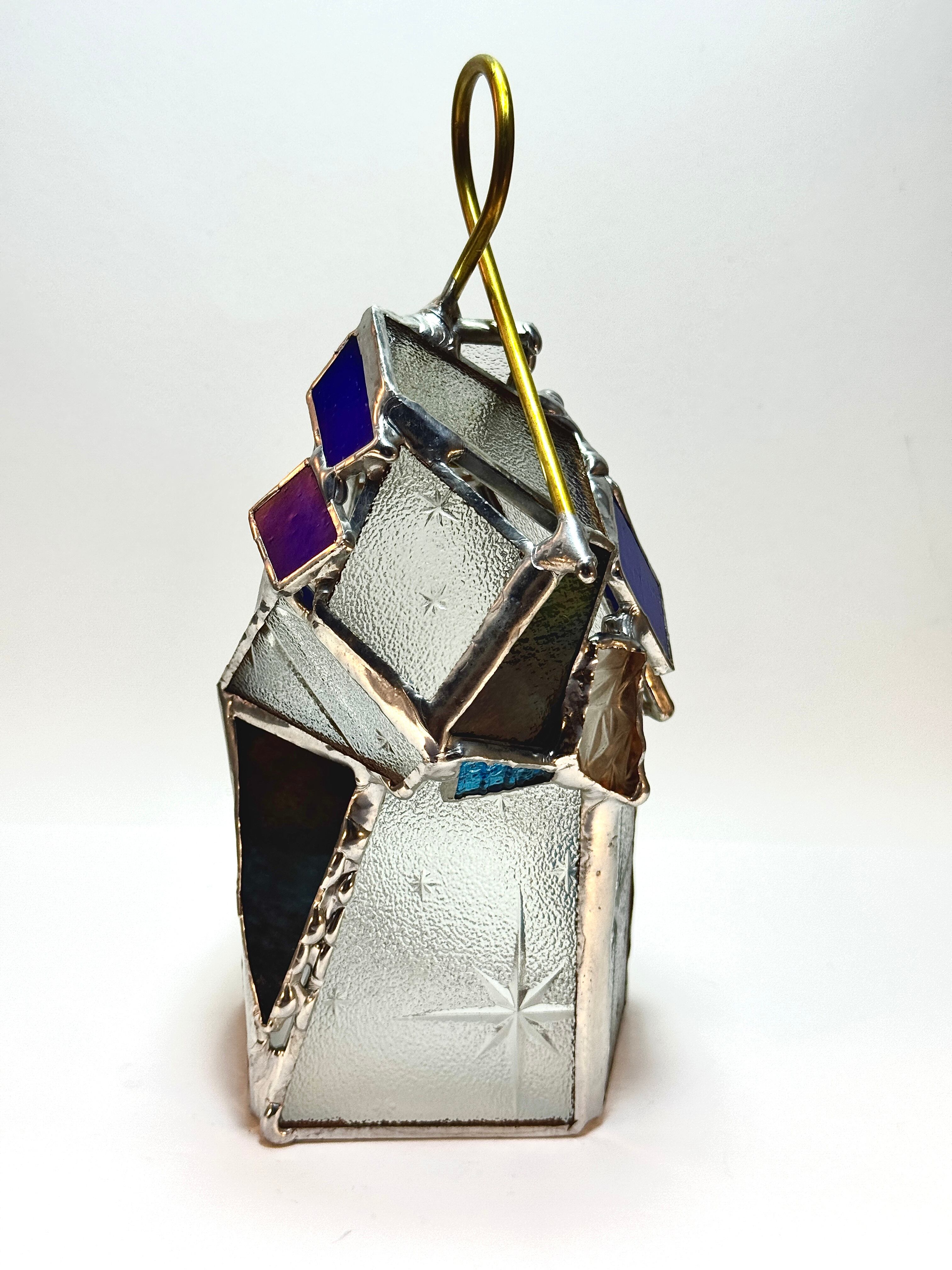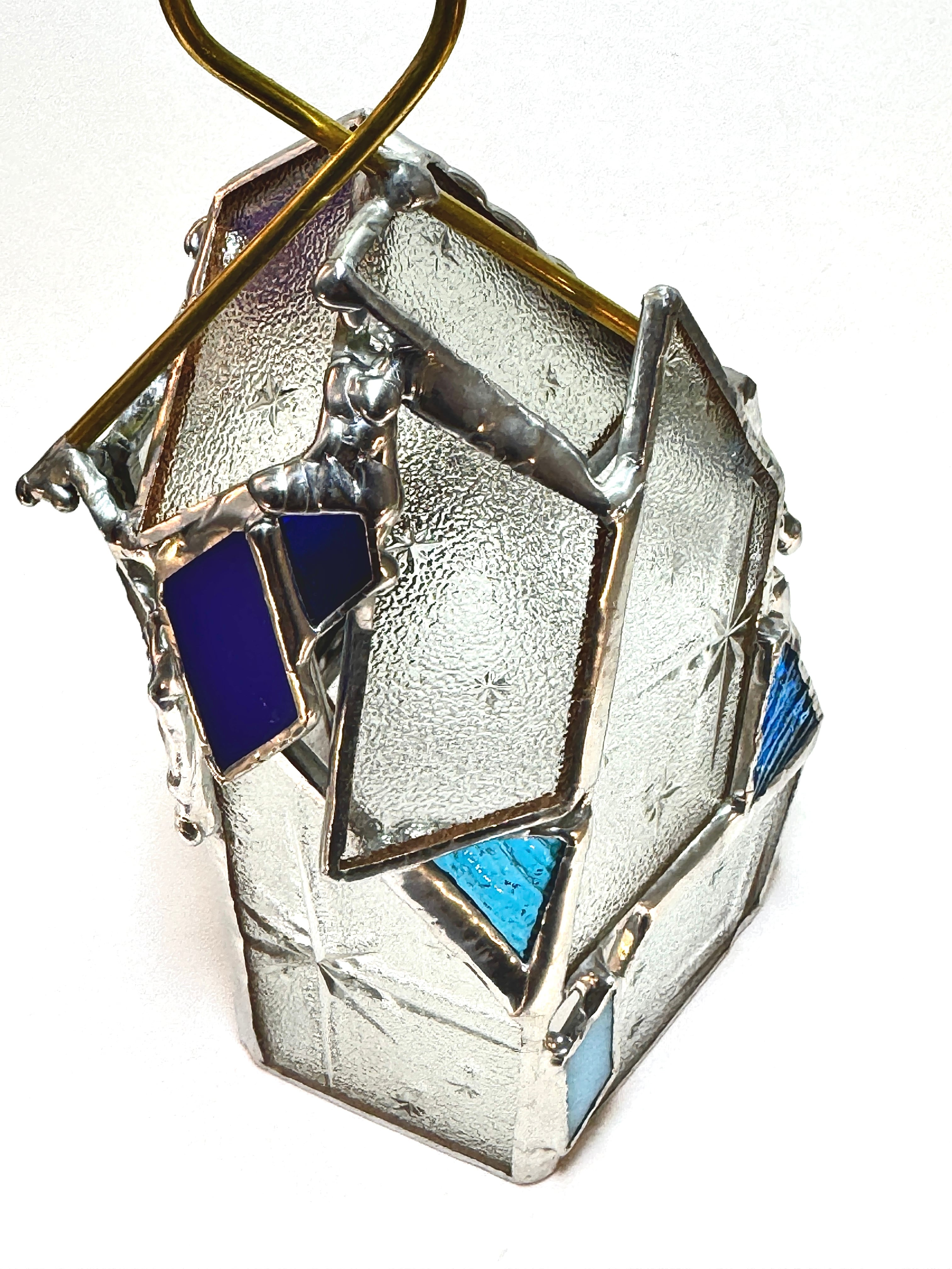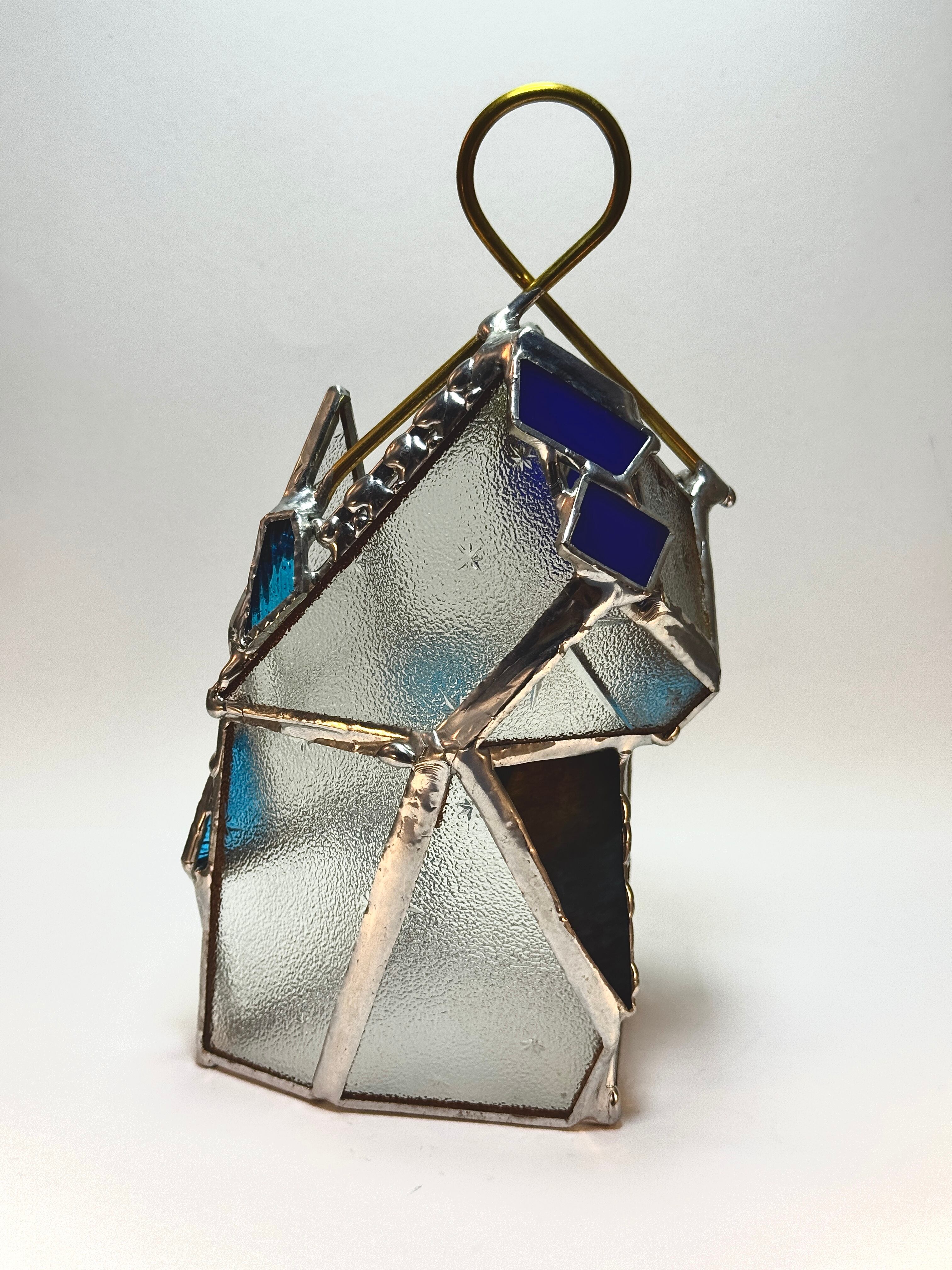 昭和の雰囲気を漂わせる型板ガラスを大きく使い、とんがり屋根の小さなおうちのように組み上げました。所々に青系の板ガラスを小さめにあしらってポップな雑貨感を出してます。