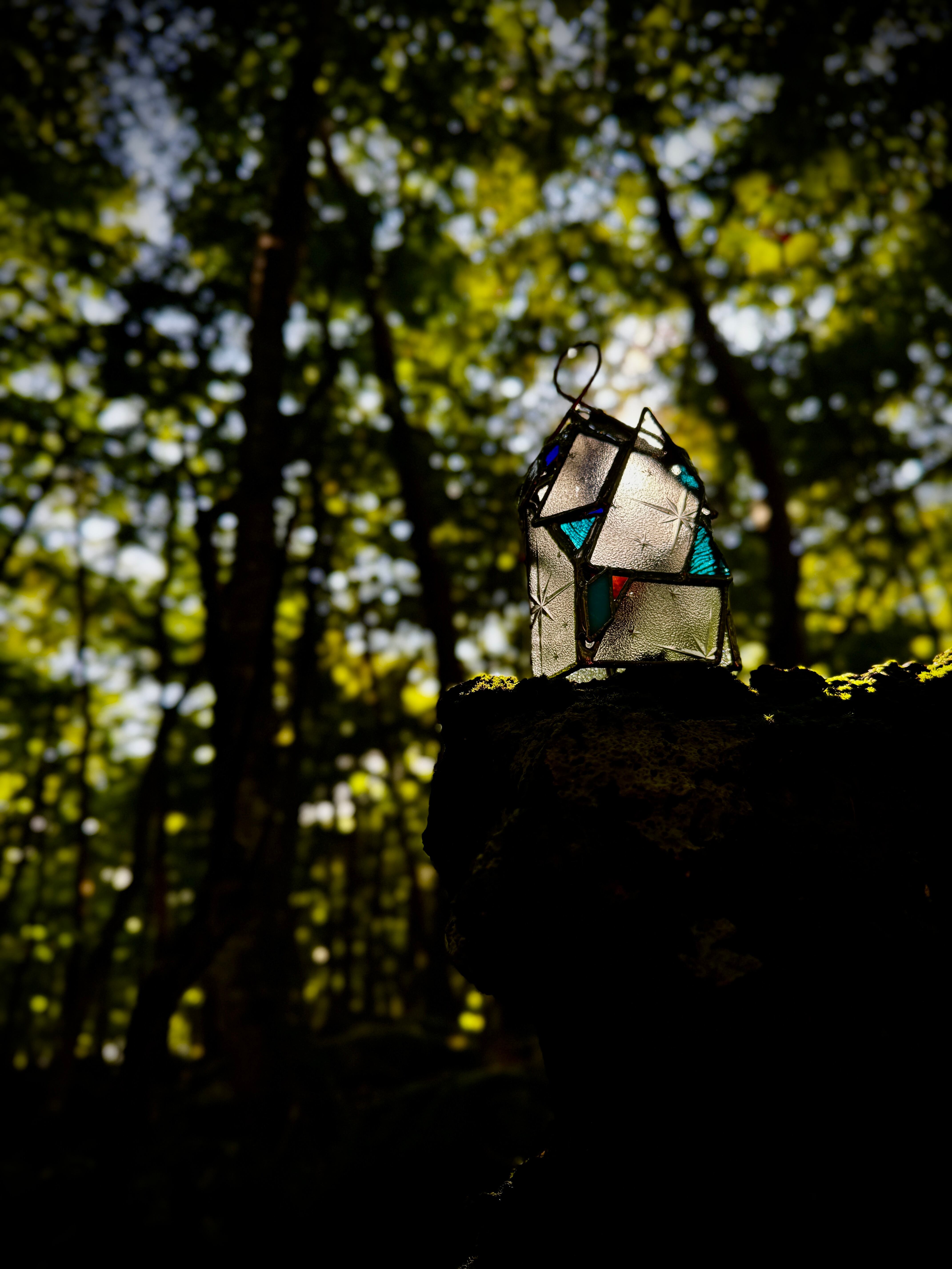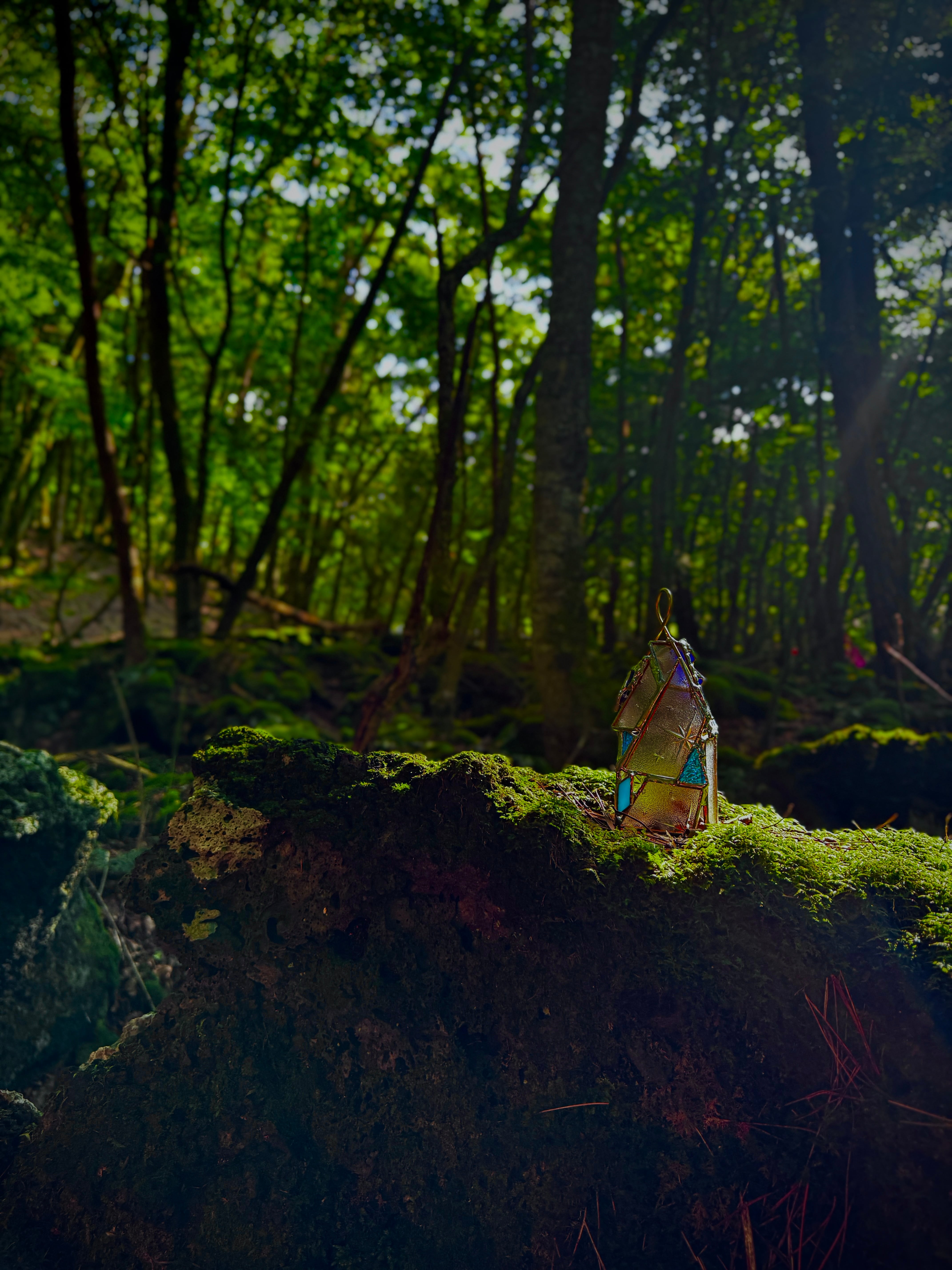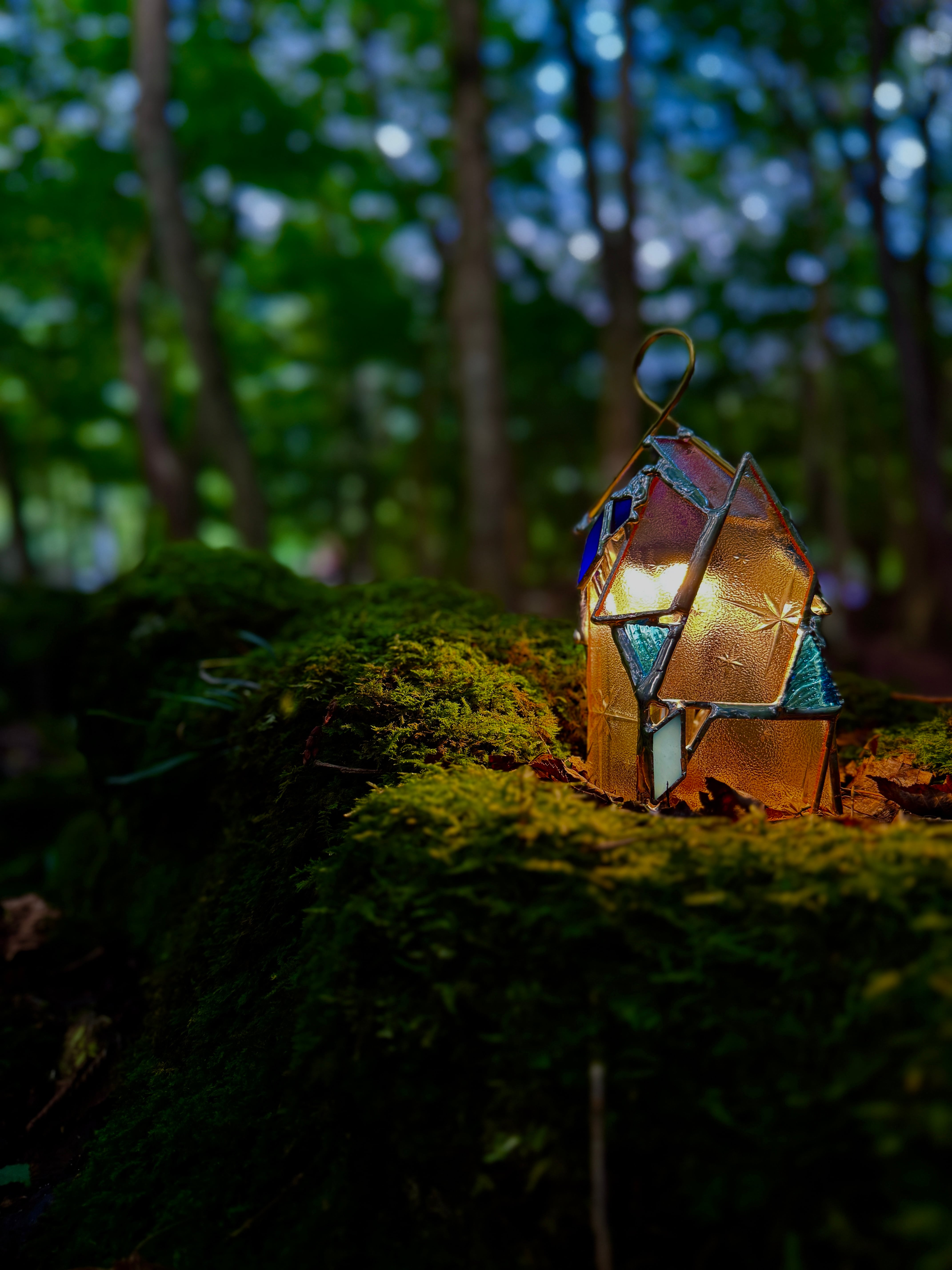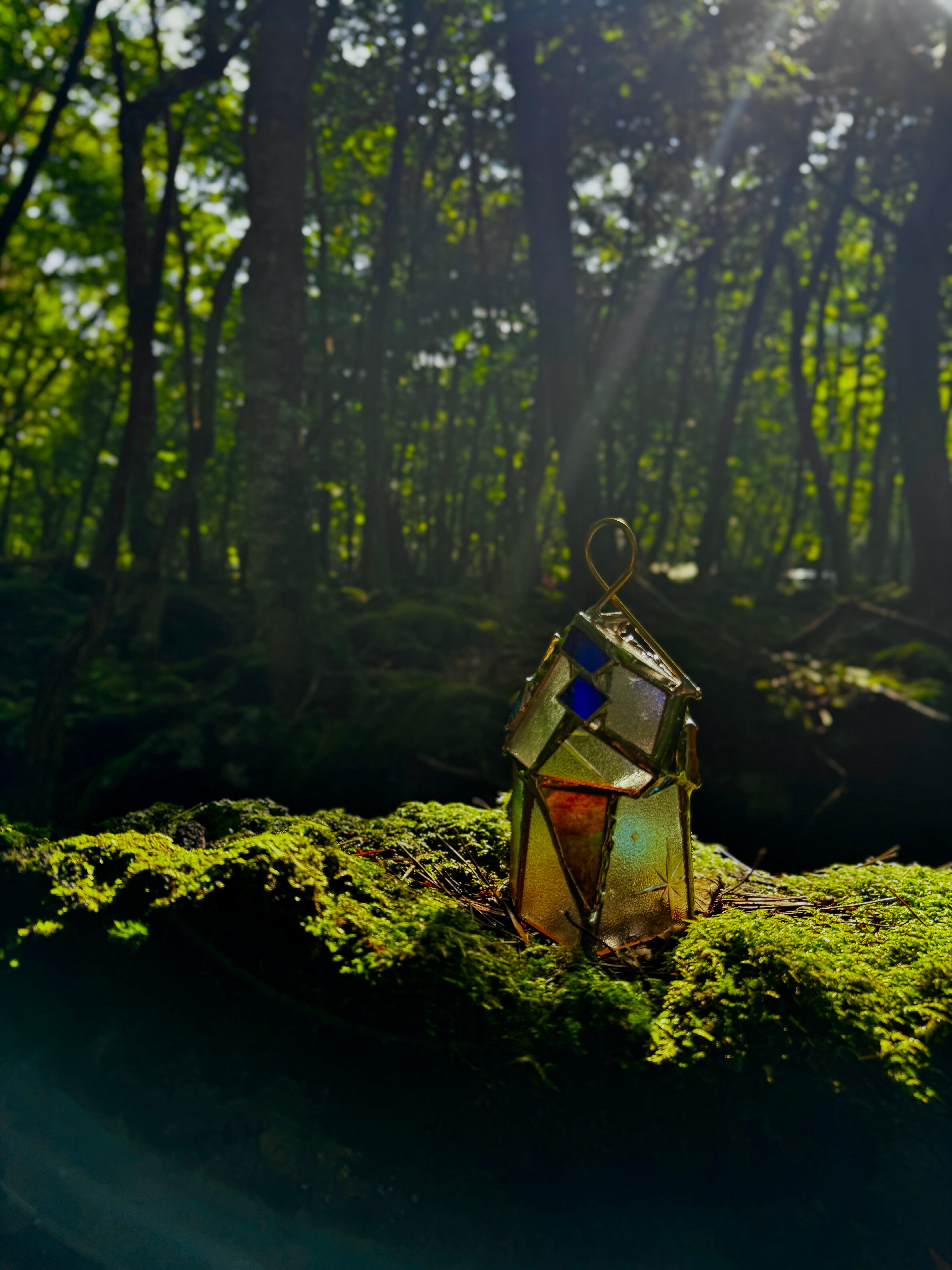 昭和の雰囲気を漂わせる型板ガラスを大きく使い、とんがり屋根の小さなおうちのように組み上げました。所々に青系の板ガラスを小さめにあしらってポップな雑貨感を出してます。