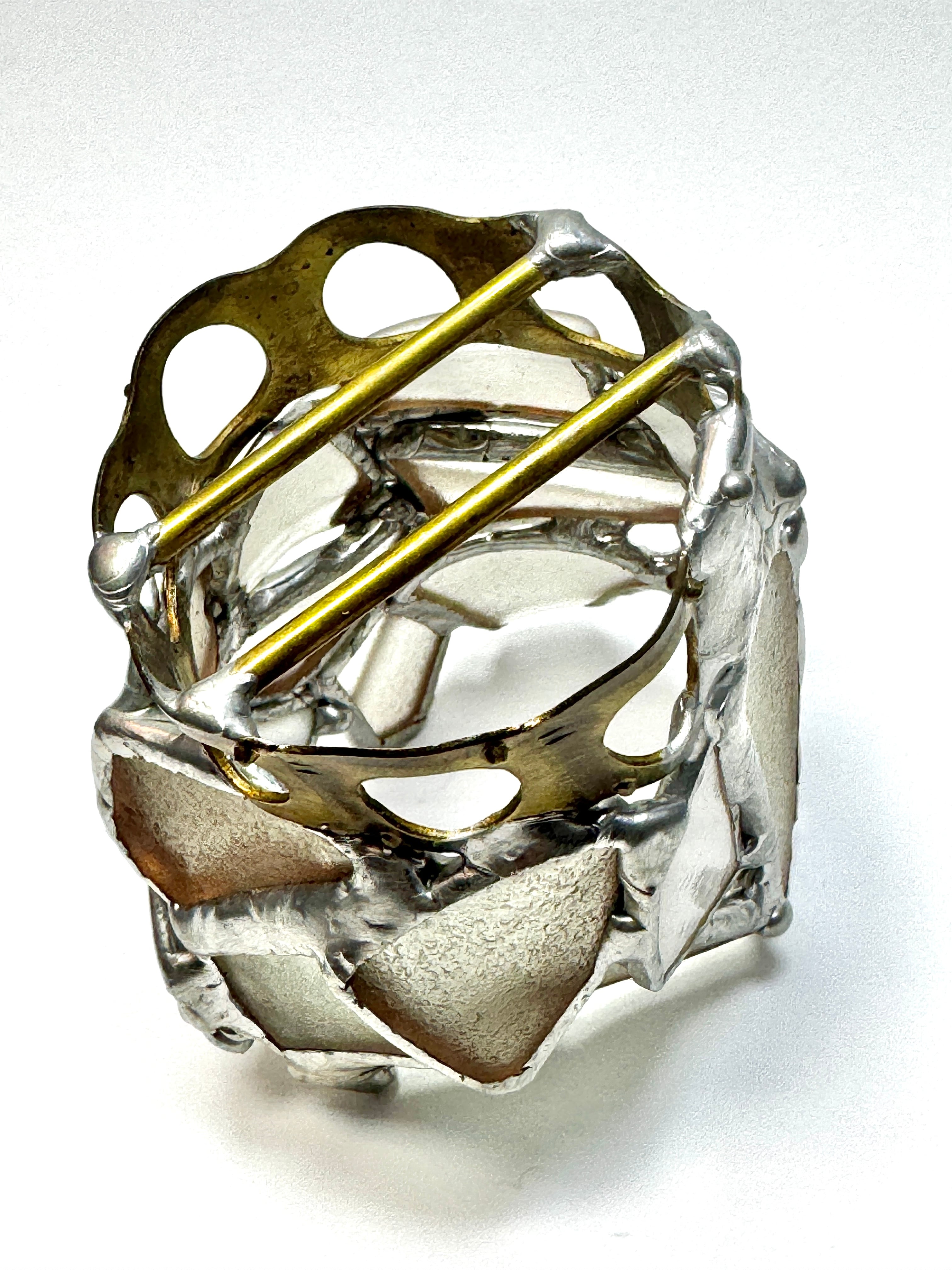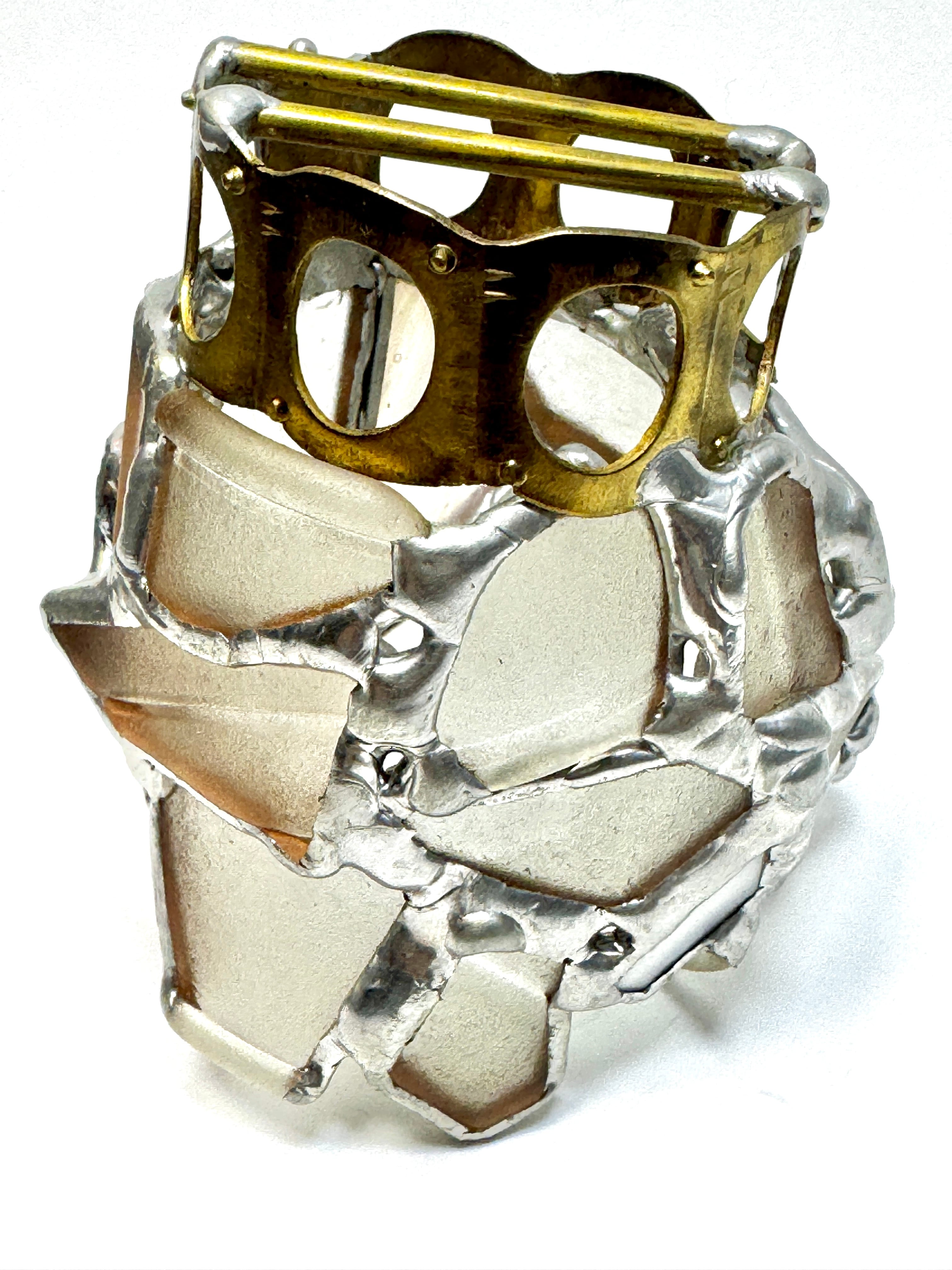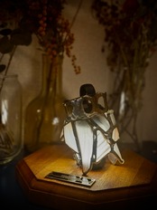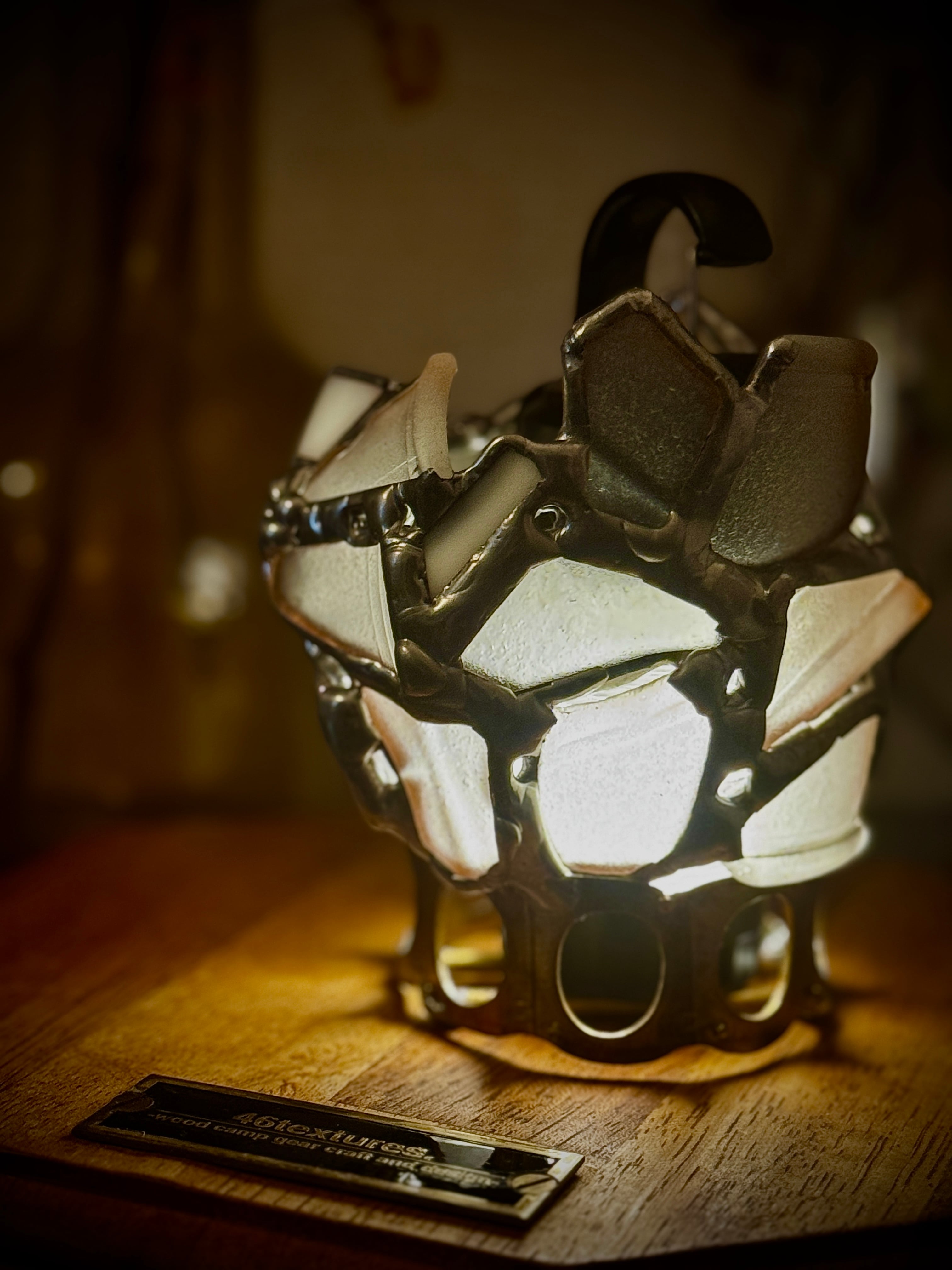 この作品は LEDLENSERさんのML4というLEDライトがピッタリハマるように作ってあります。その為、上部の真鍮針金部分は、今までのシェードと違い、ライトのフック部分が突き出て、上部で止まるように取り付けてあります。作品によって上部の形やバランスが違うため、水平に引っかかるように真鍮針金を微調整して仕上げてあります。