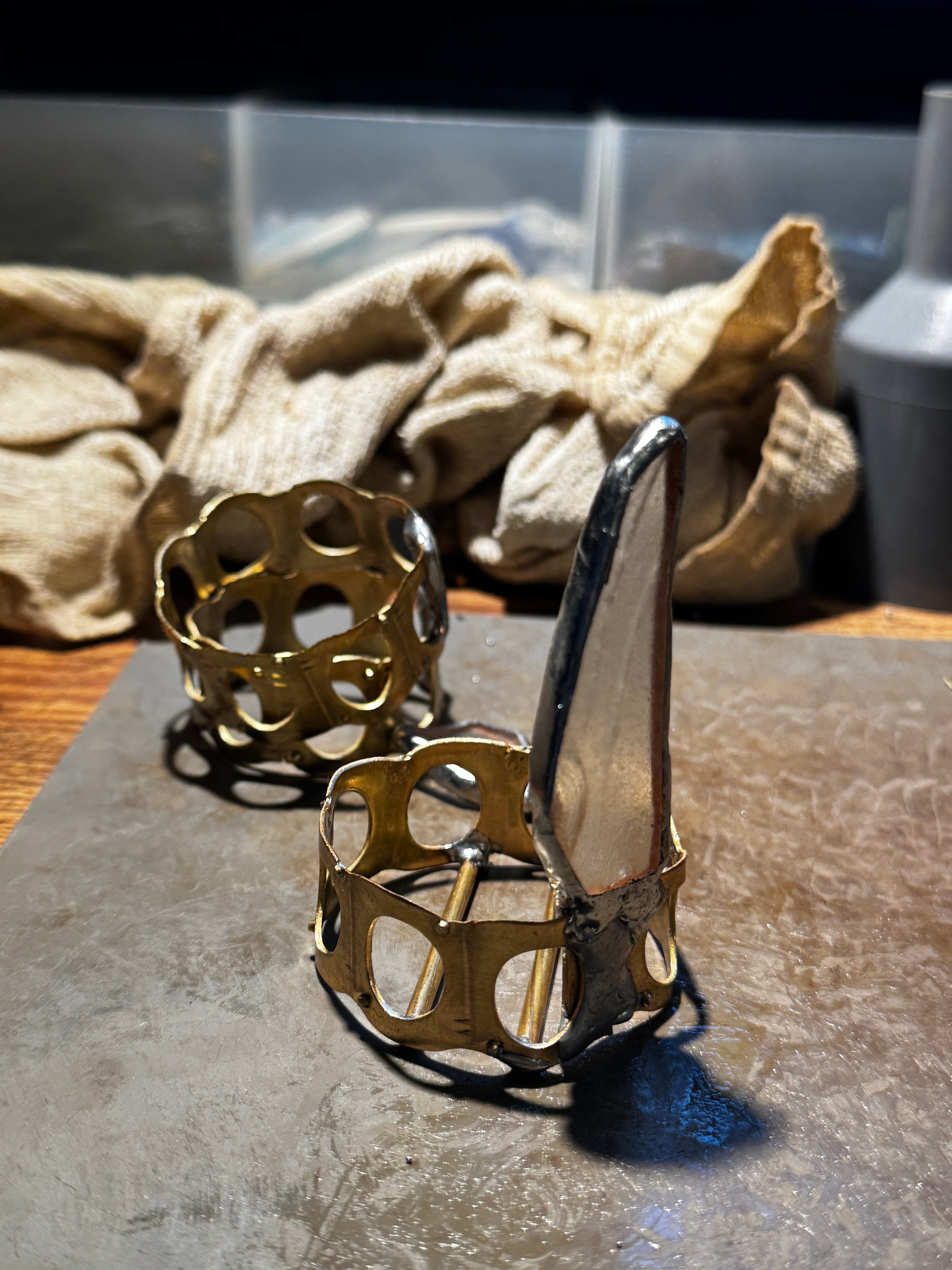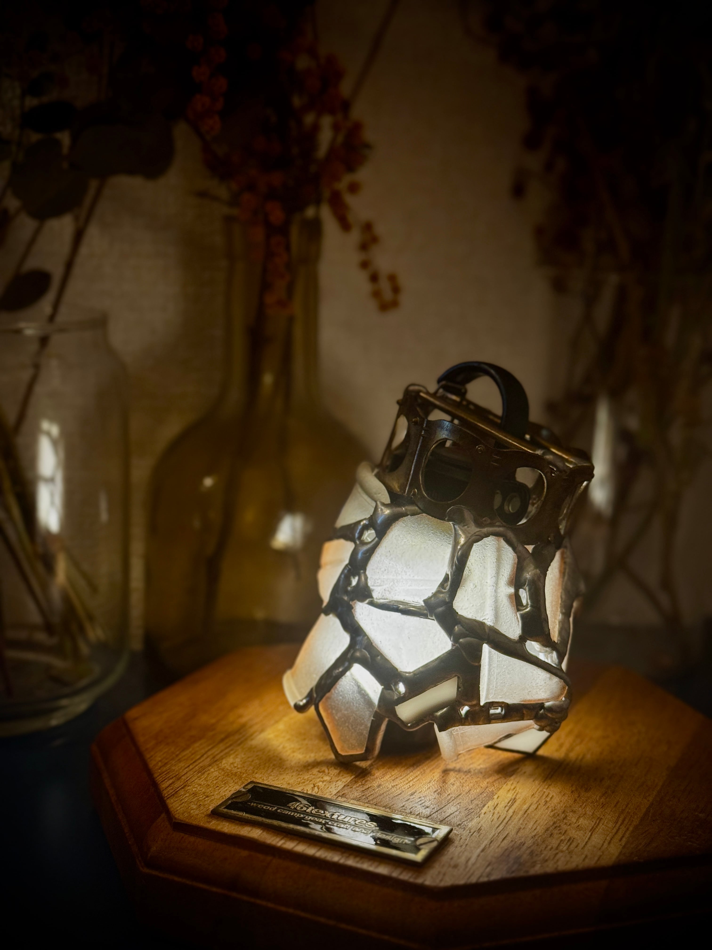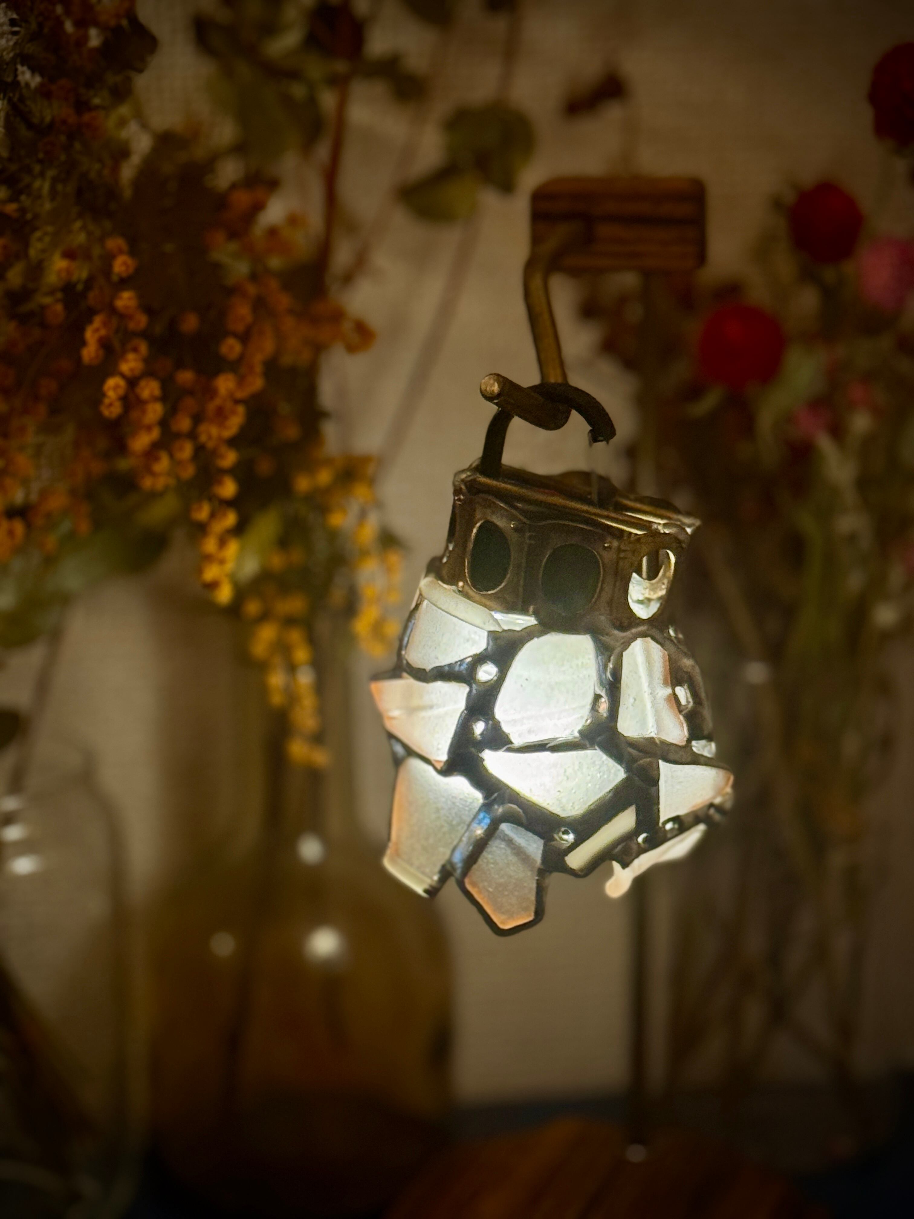 とても小さくフォルムもシンプルな為、持ち運びやすいランタンシェードです。ハンダの加工はアンティーク色に変色させています。このシェードの1番のウィークポイントは、上部の王冠に見立てた真鍮パーツです。そうです。これは王様です。