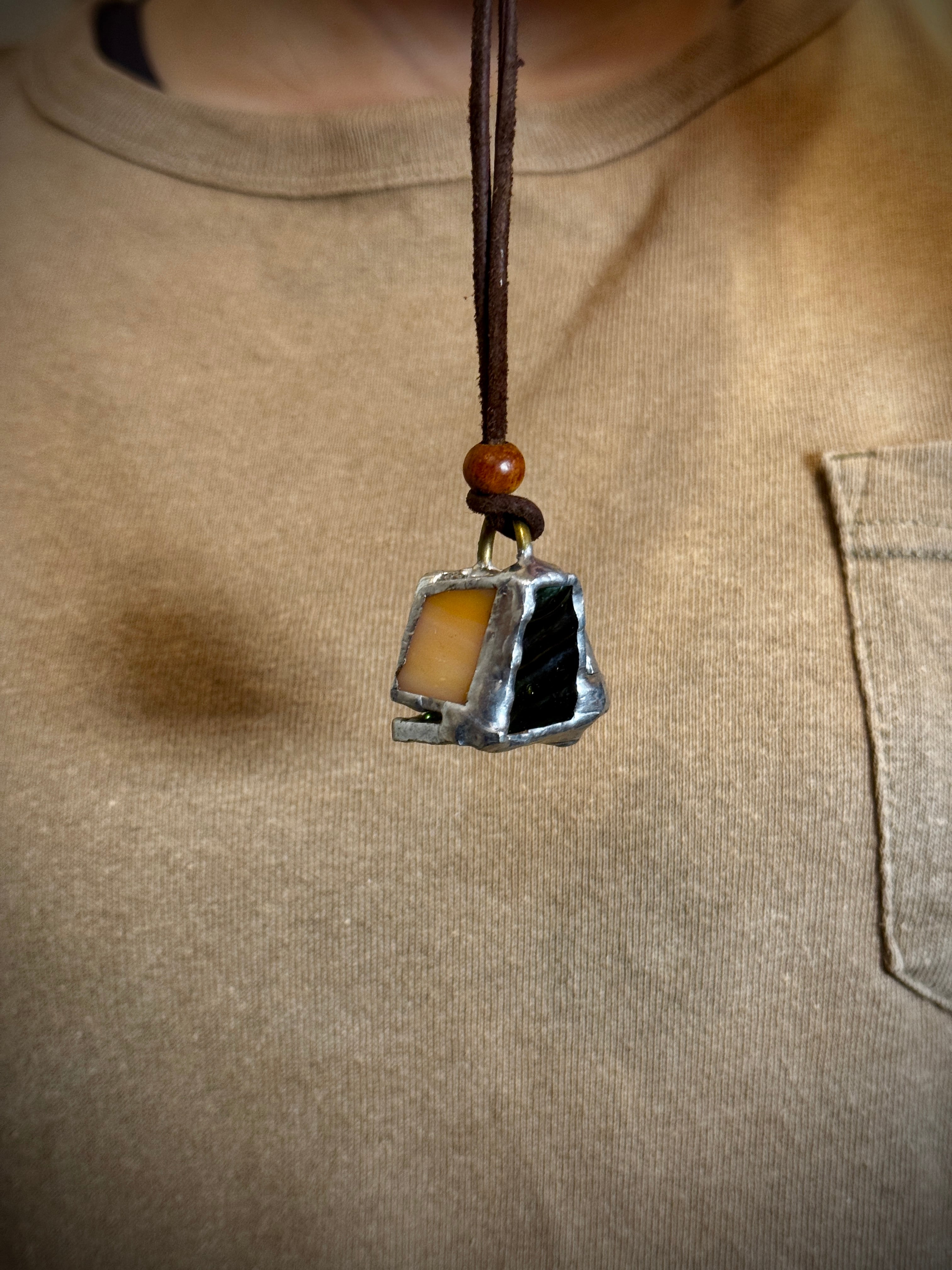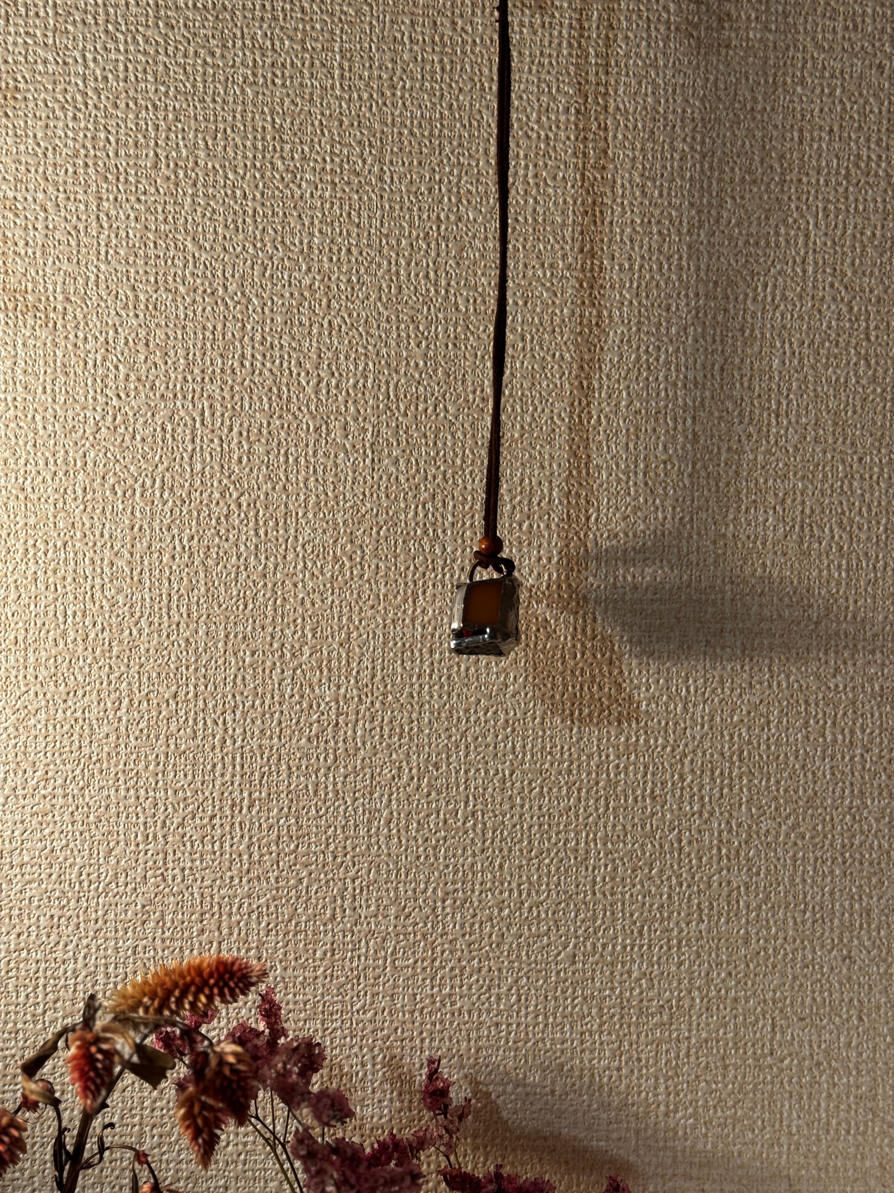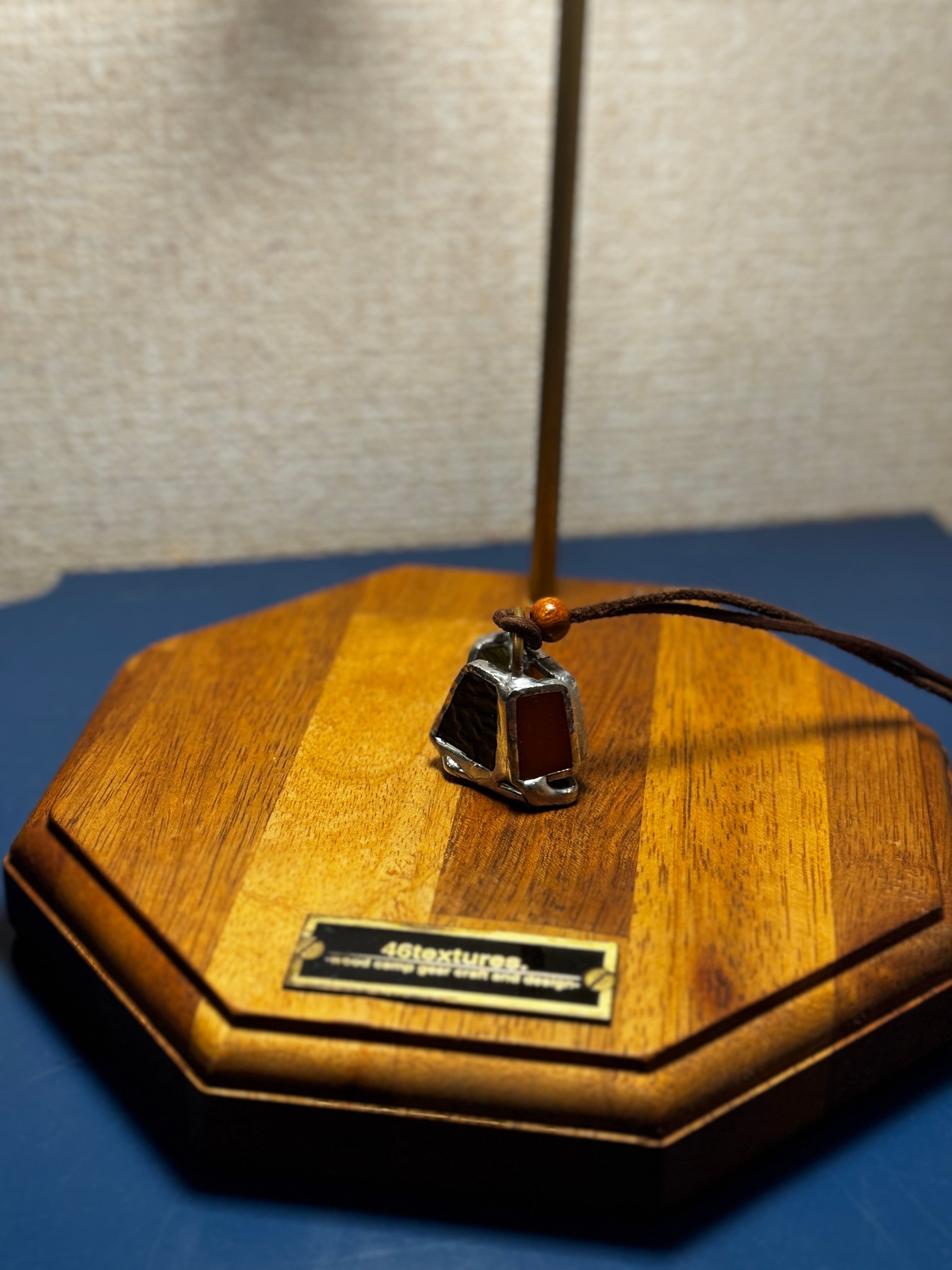 ガラス、ハンダ(すず・鉛)、水牛皮紐(太さ2mm)、