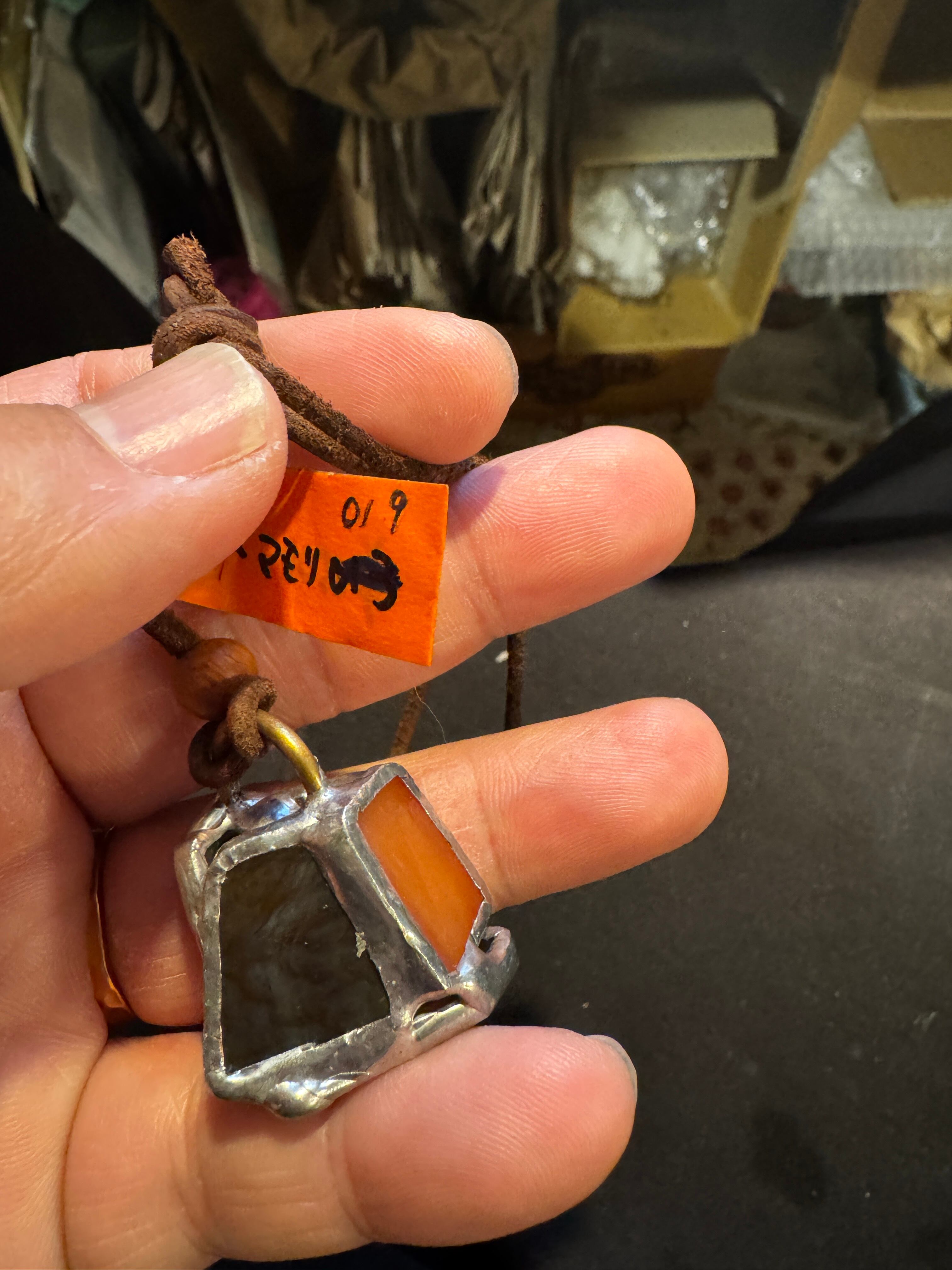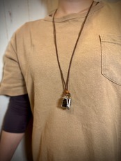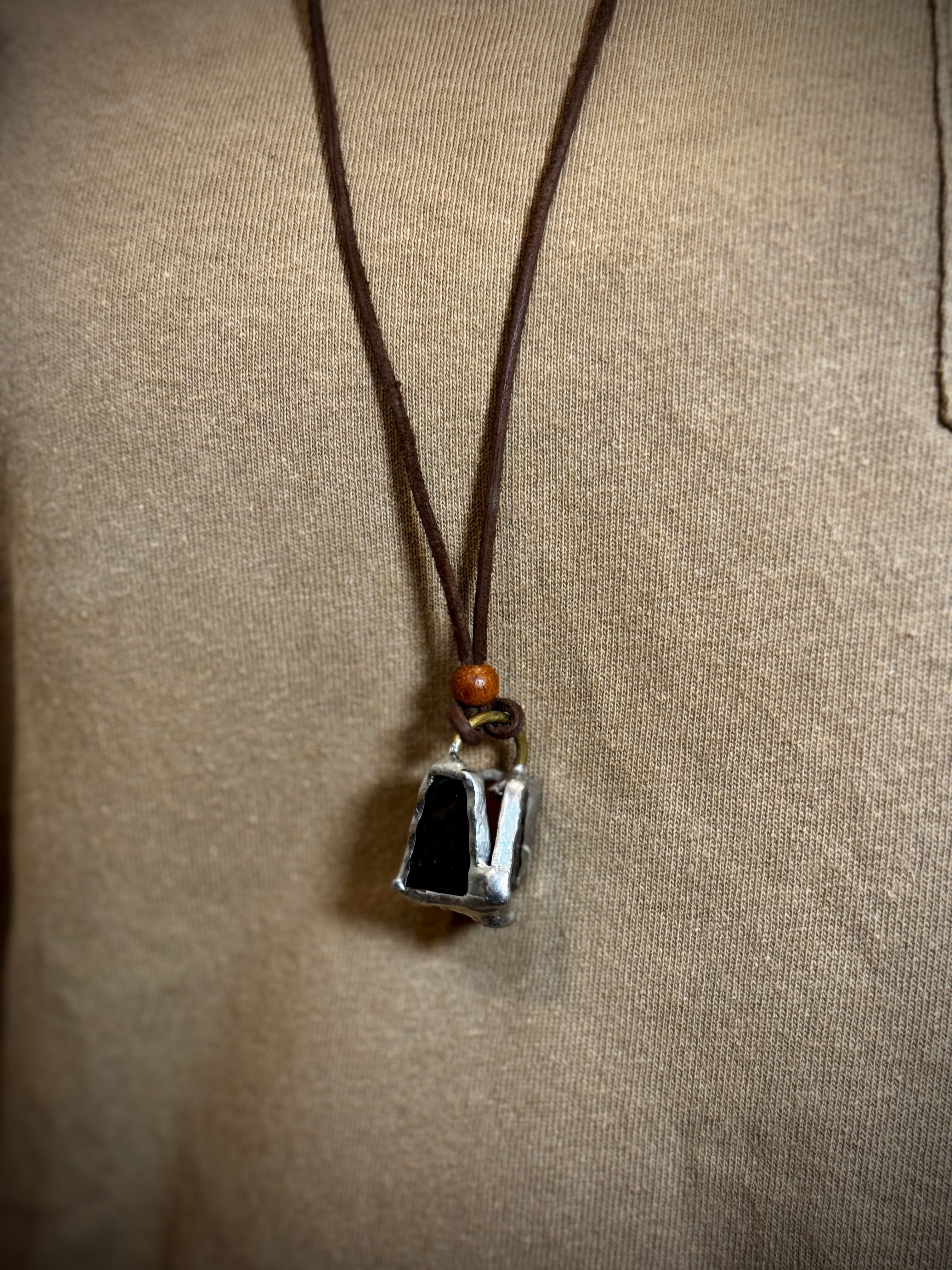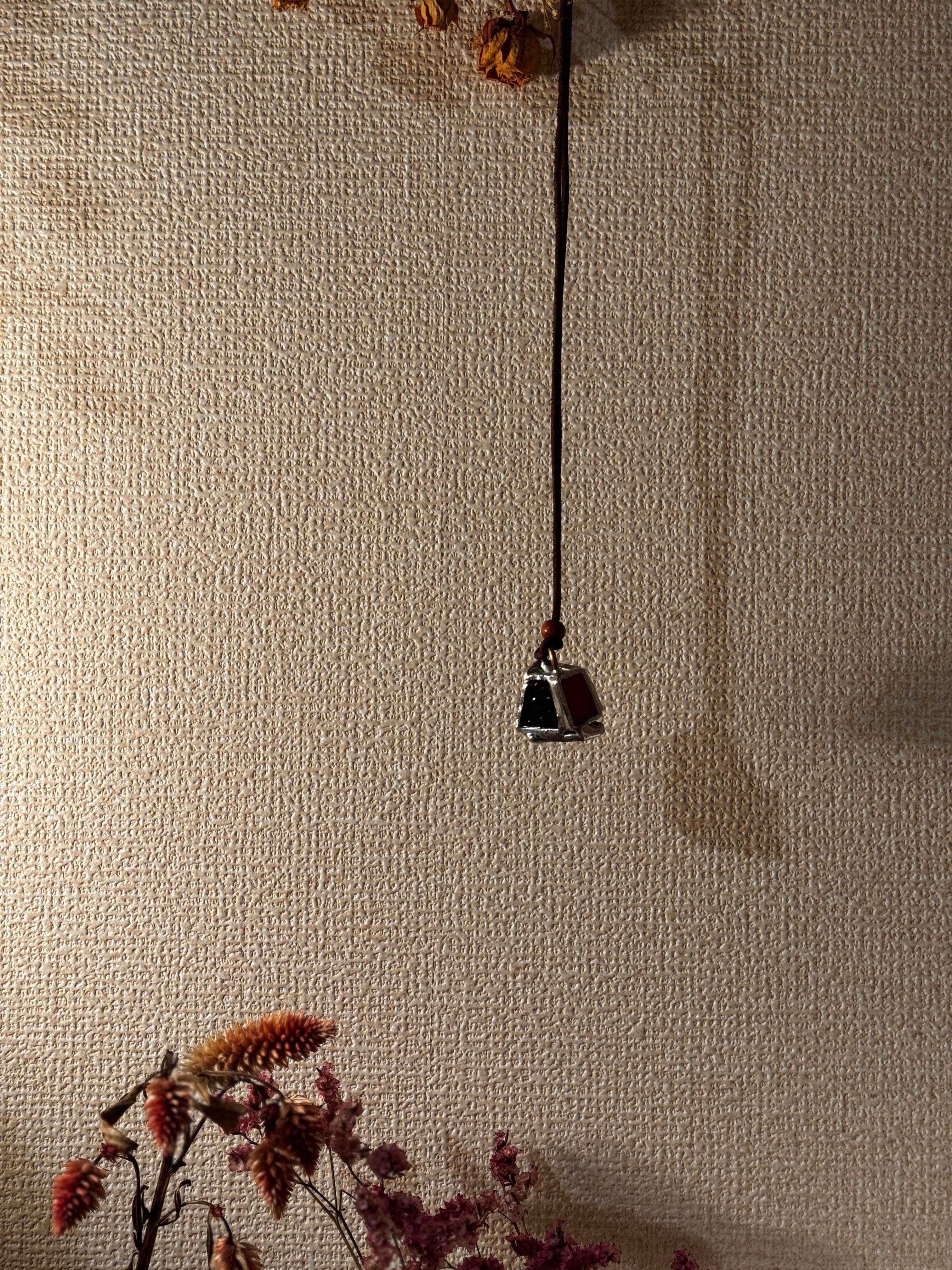 ガラス、ハンダ(すず・鉛)、水牛皮紐(太さ2mm)、