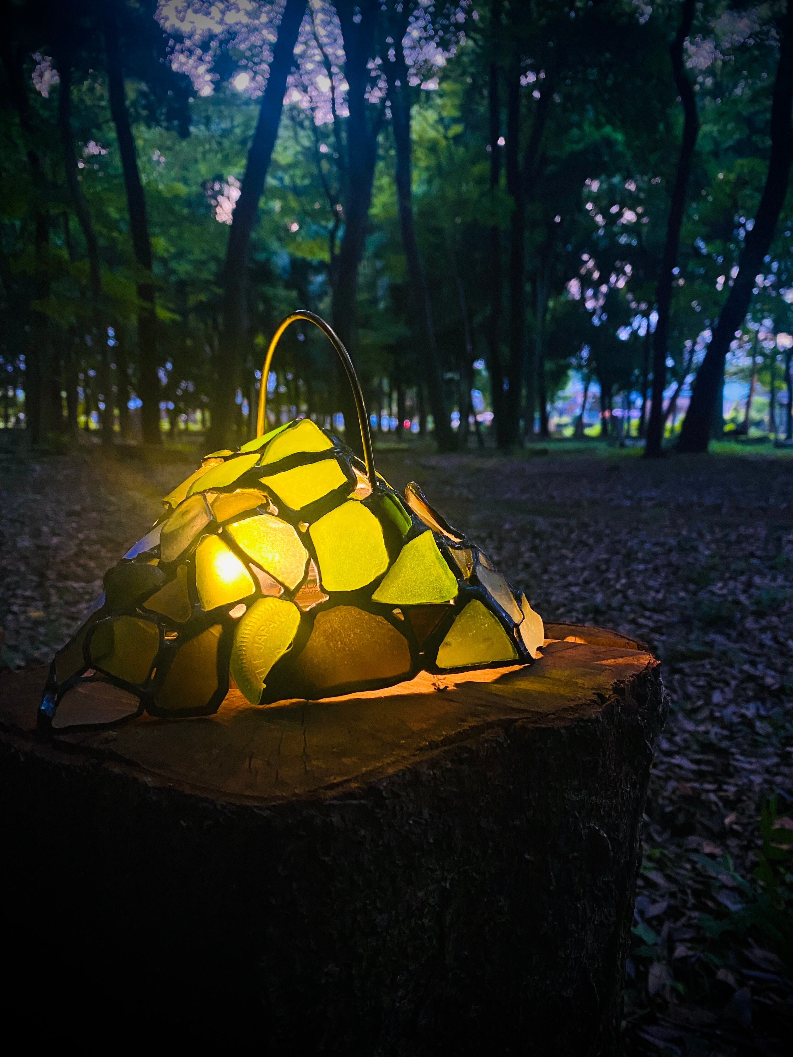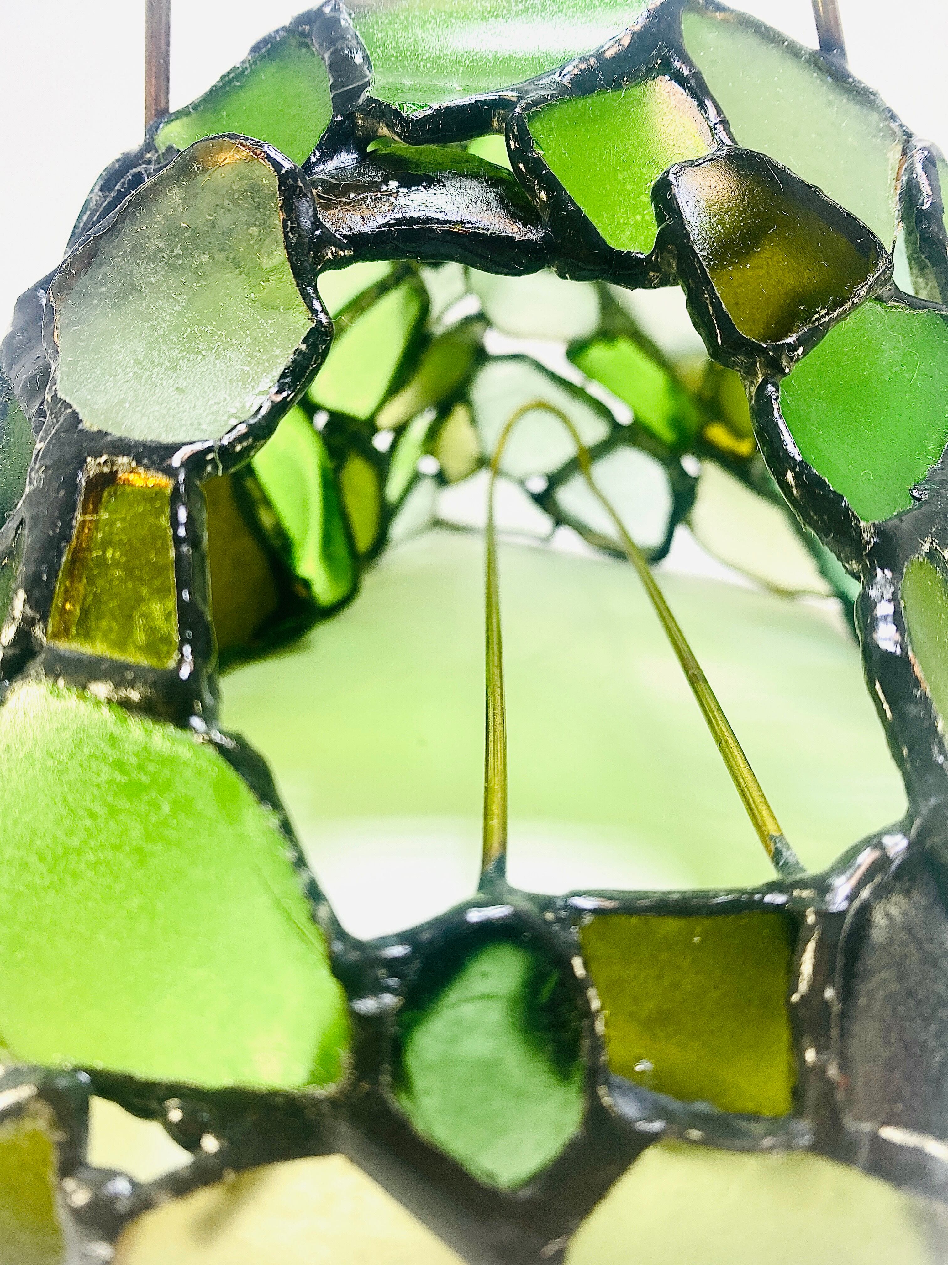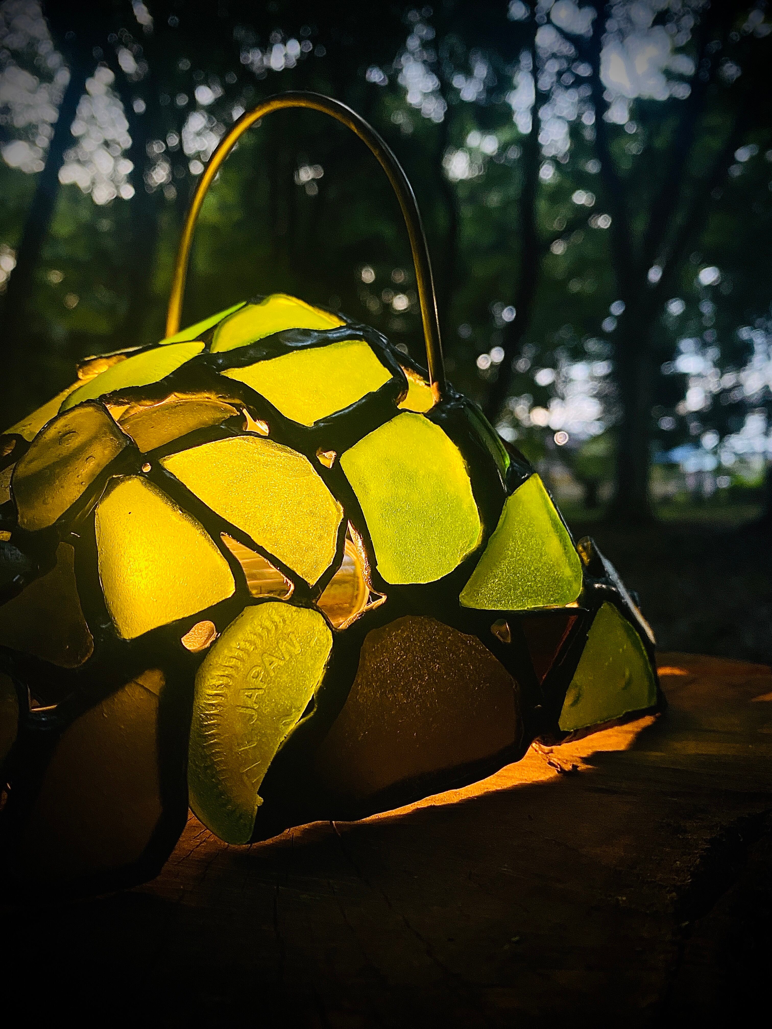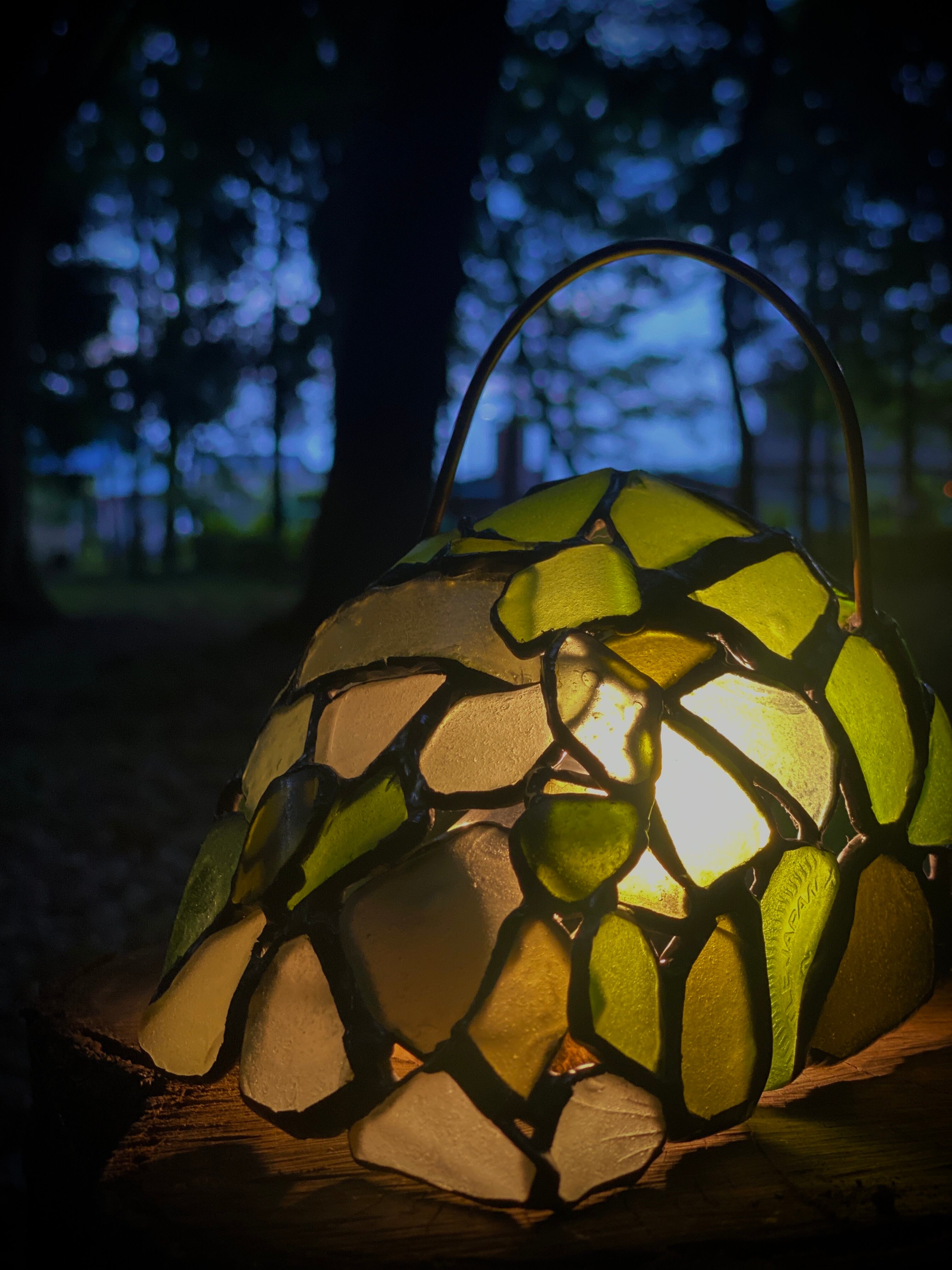 グリーン系のシーグラスのみで作ったステンドグラスのランタンシェードです。この形は、作者がソロキャンプで憧れている、”Snugpakのスコーピオン3”というテントにインスパイアされ作りました。テントの美しい曲線を、柔らかく湾曲したシーグラスでなら表現できると思い挑戦しました。LEDライトはテントの入り口部分から入れ、中に針金で作った台座に、横向きで置いて光を灯してください。