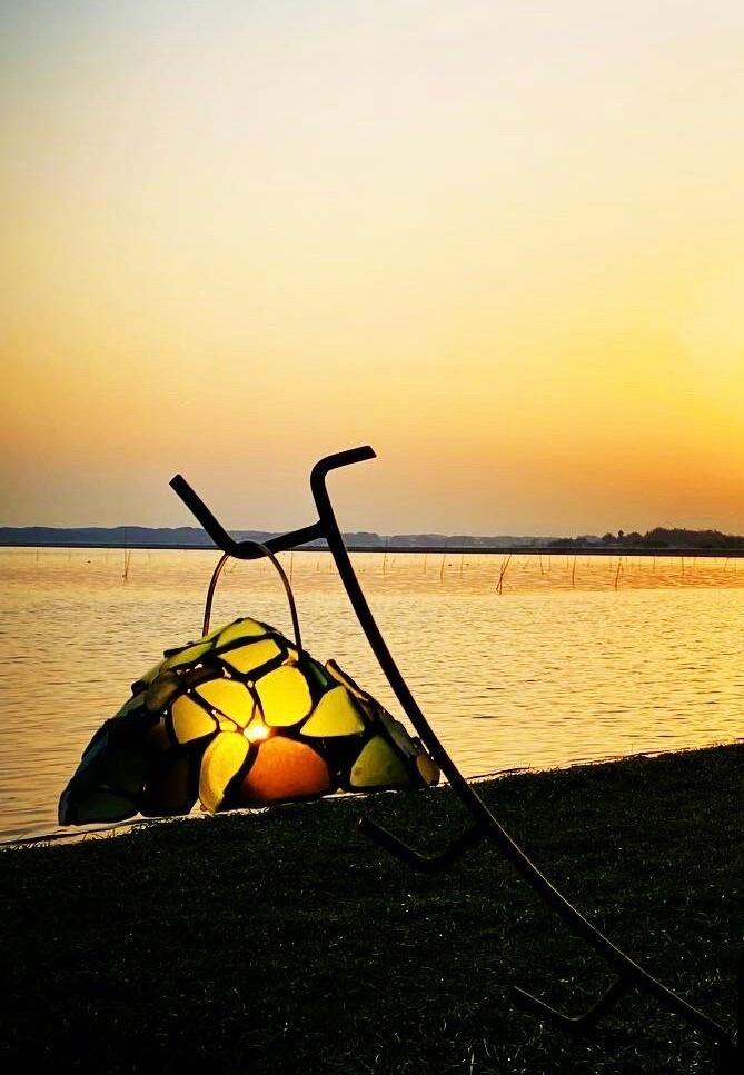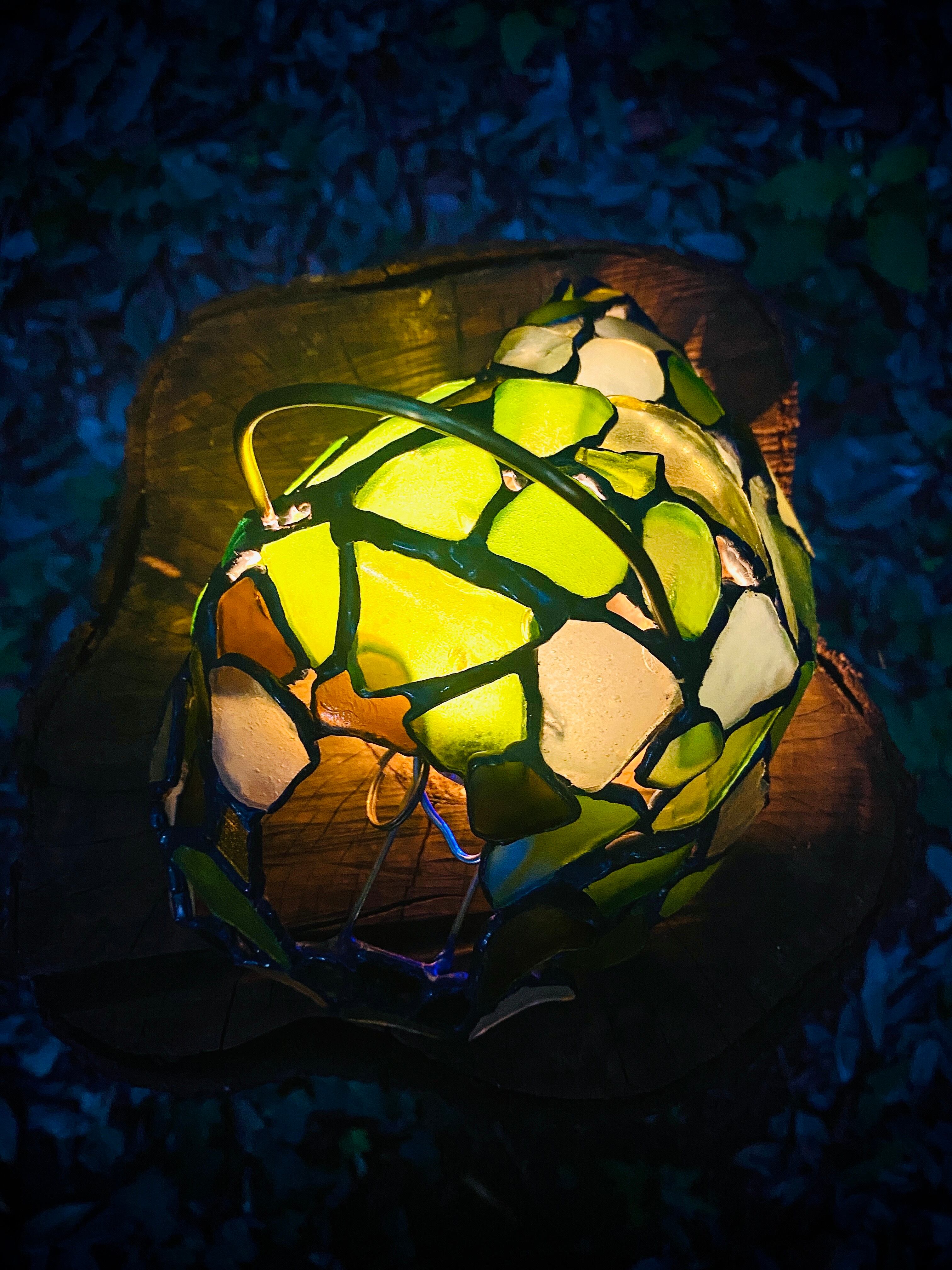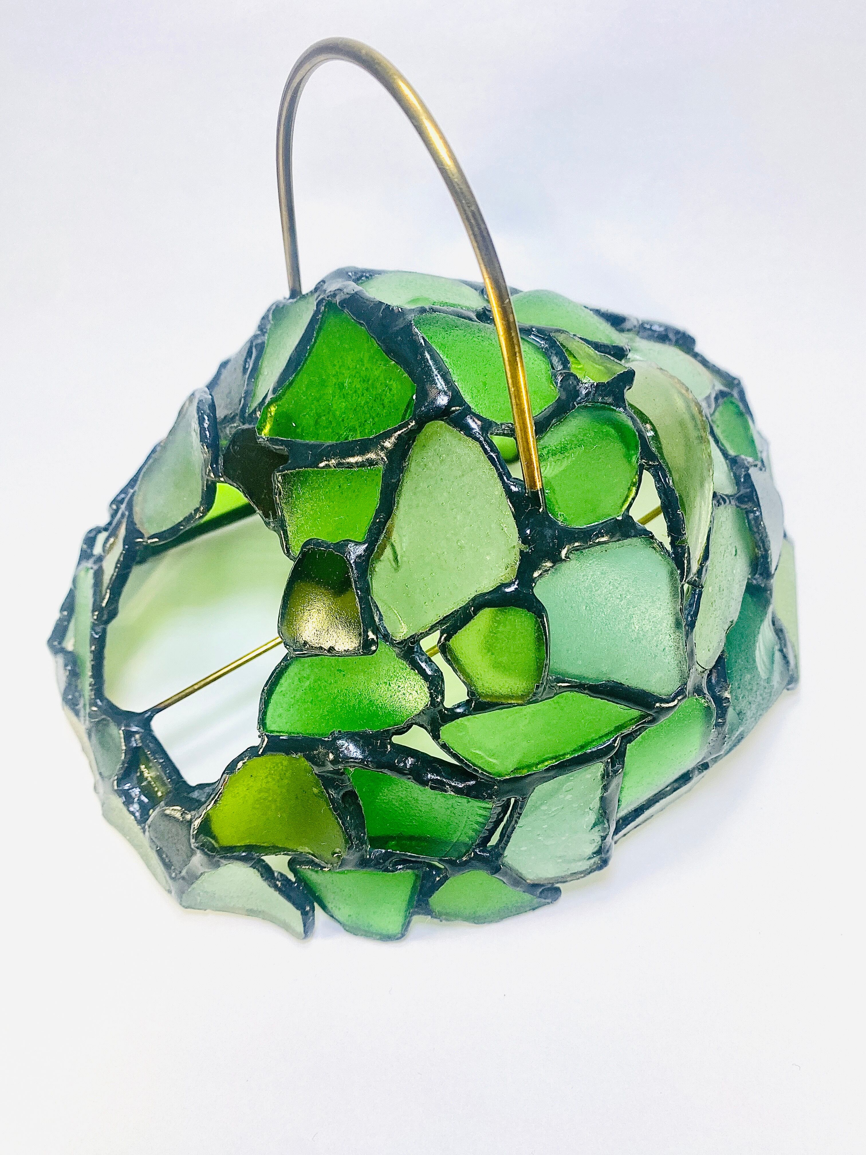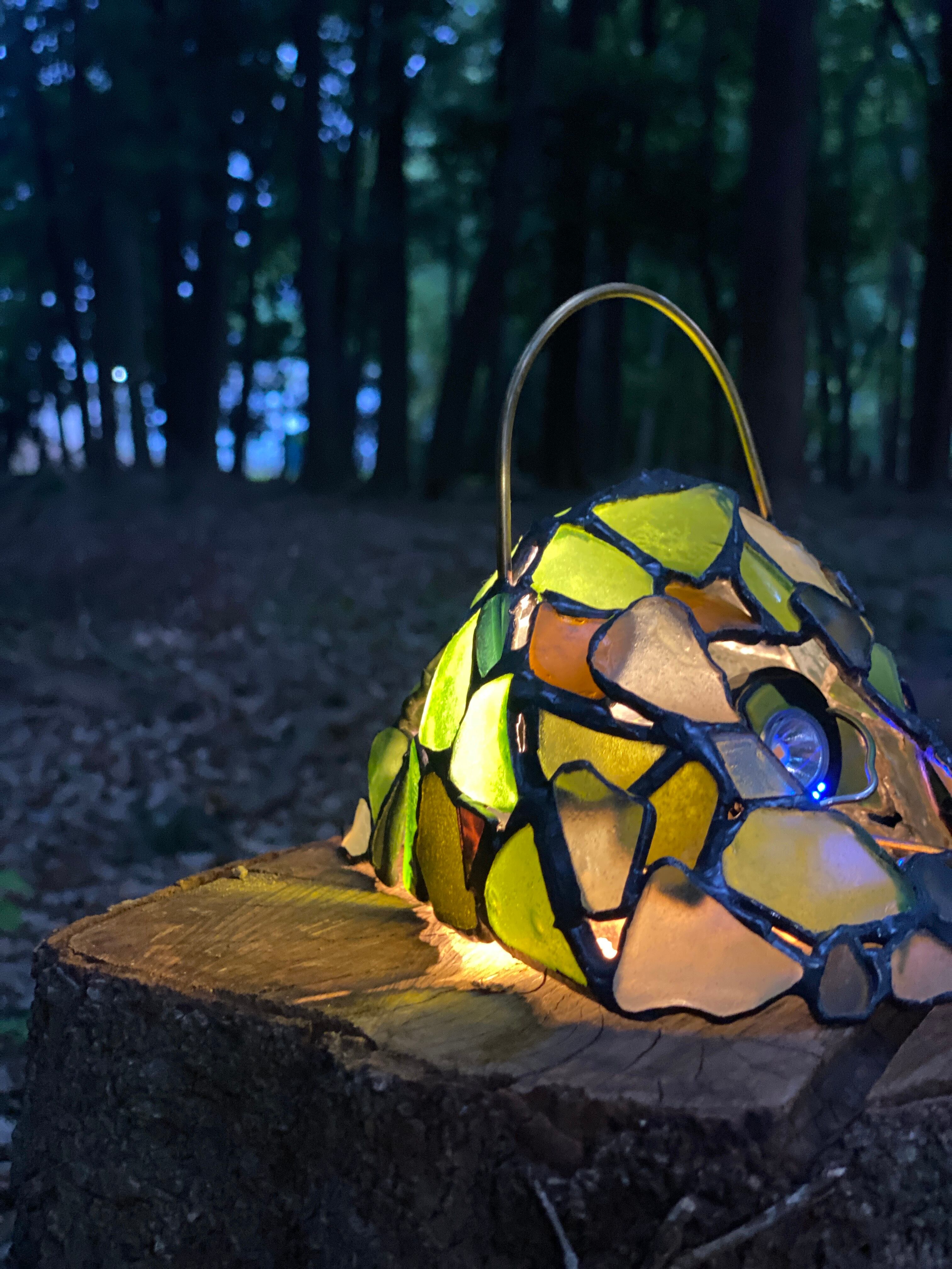 グリーン系のシーグラスのみで作ったステンドグラスのランタンシェードです。この形は、作者がソロキャンプで憧れている、”Snugpakのスコーピオン3”というテントにインスパイアされ作りました。テントの美しい曲線を、柔らかく湾曲したシーグラスでなら表現できると思い挑戦しました。LEDライトはテントの入り口部分から入れ、中に針金で作った台座に、横向きで置いて光を灯してください。