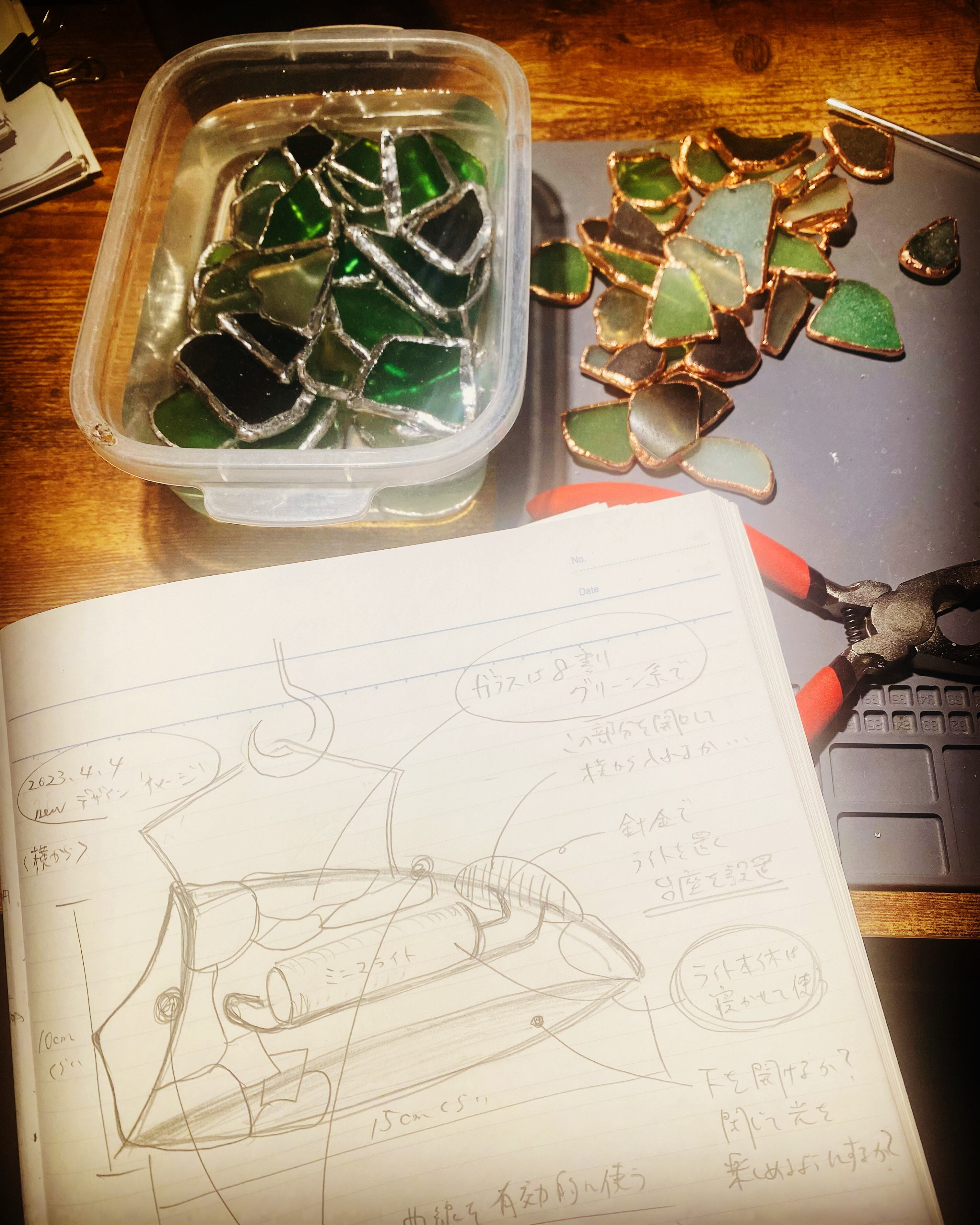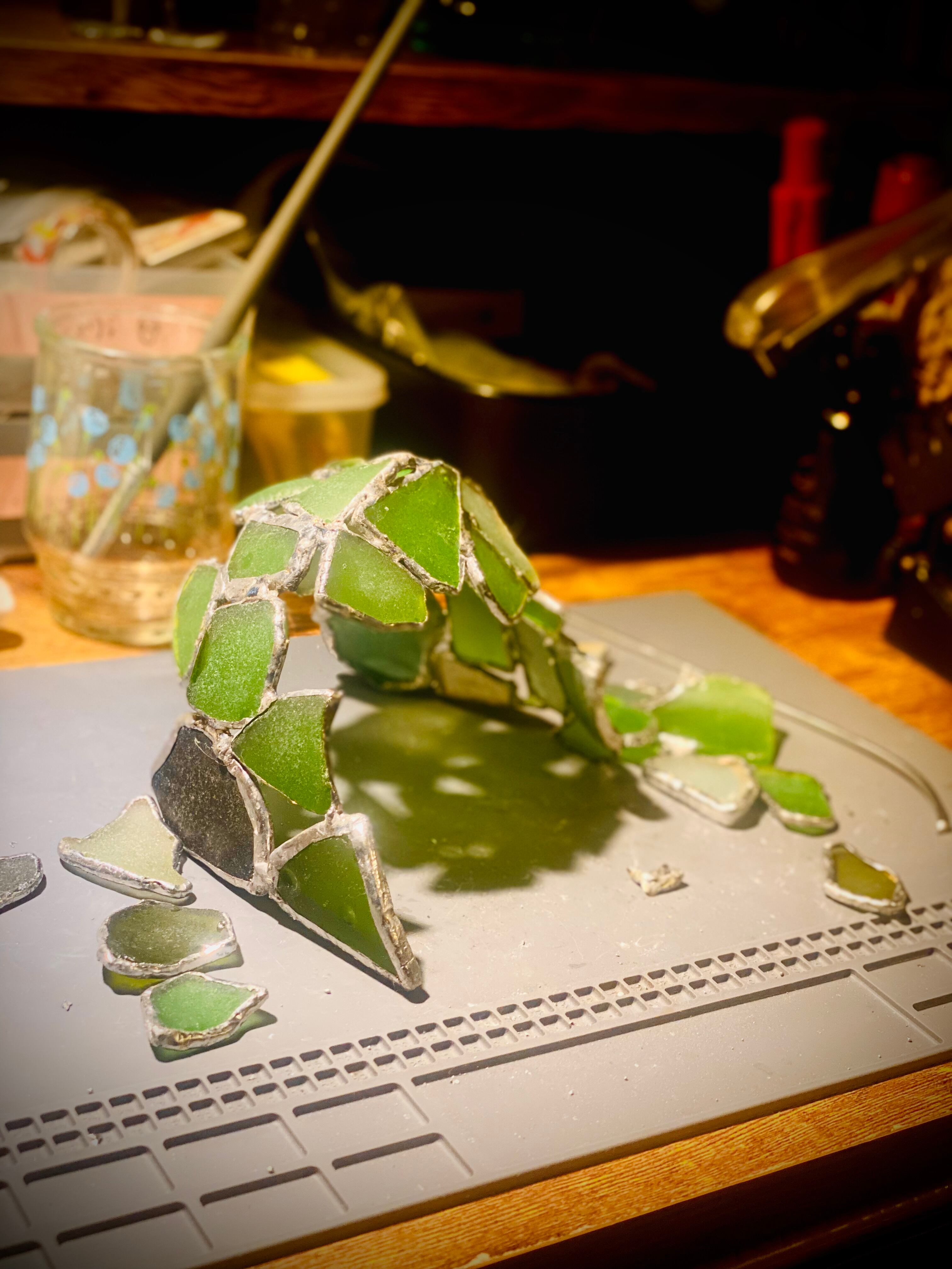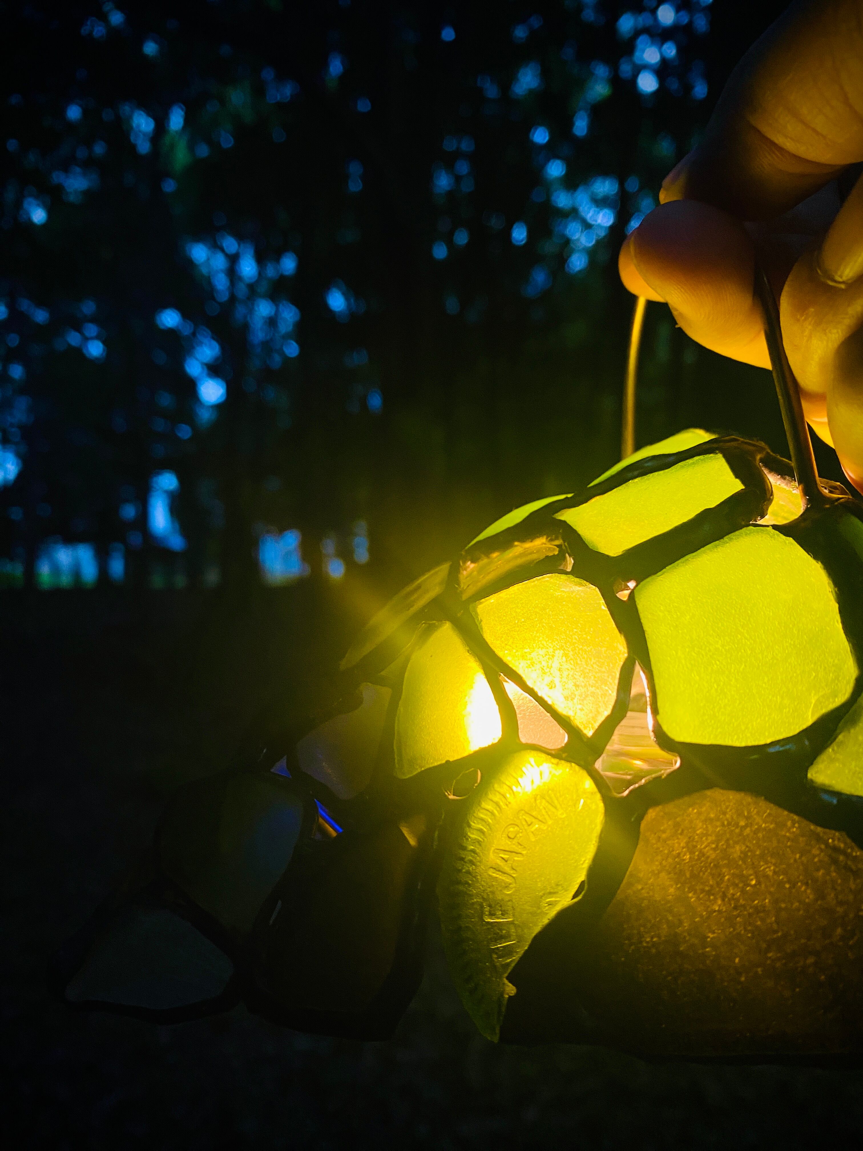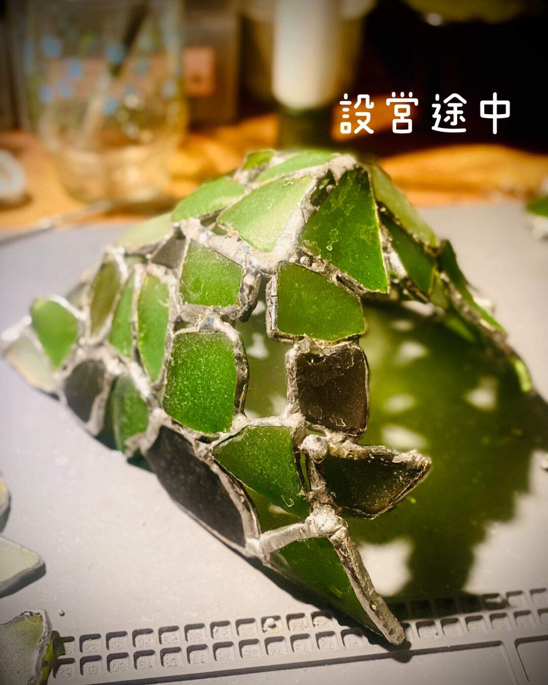 グリーン系のシーグラスのみで作ったステンドグラスのランタンシェードです。この形は、作者がソロキャンプで憧れている、”Snugpakのスコーピオン3”というテントにインスパイアされ作りました。テントの美しい曲線を、柔らかく湾曲したシーグラスでなら表現できると思い挑戦しました。LEDライトはテントの入り口部分から入れ、中に針金で作った台座に、横向きで置いて光を灯してください。