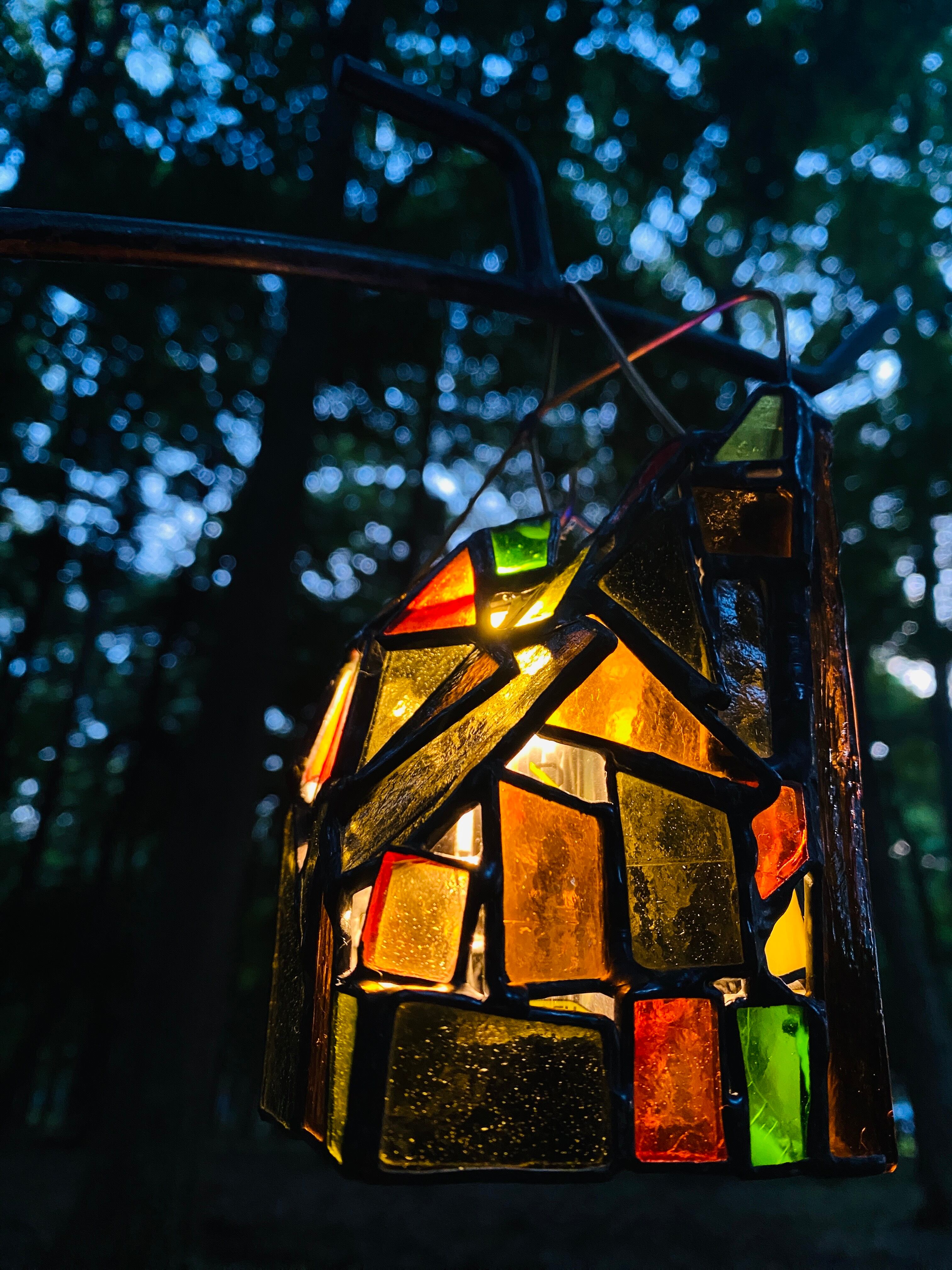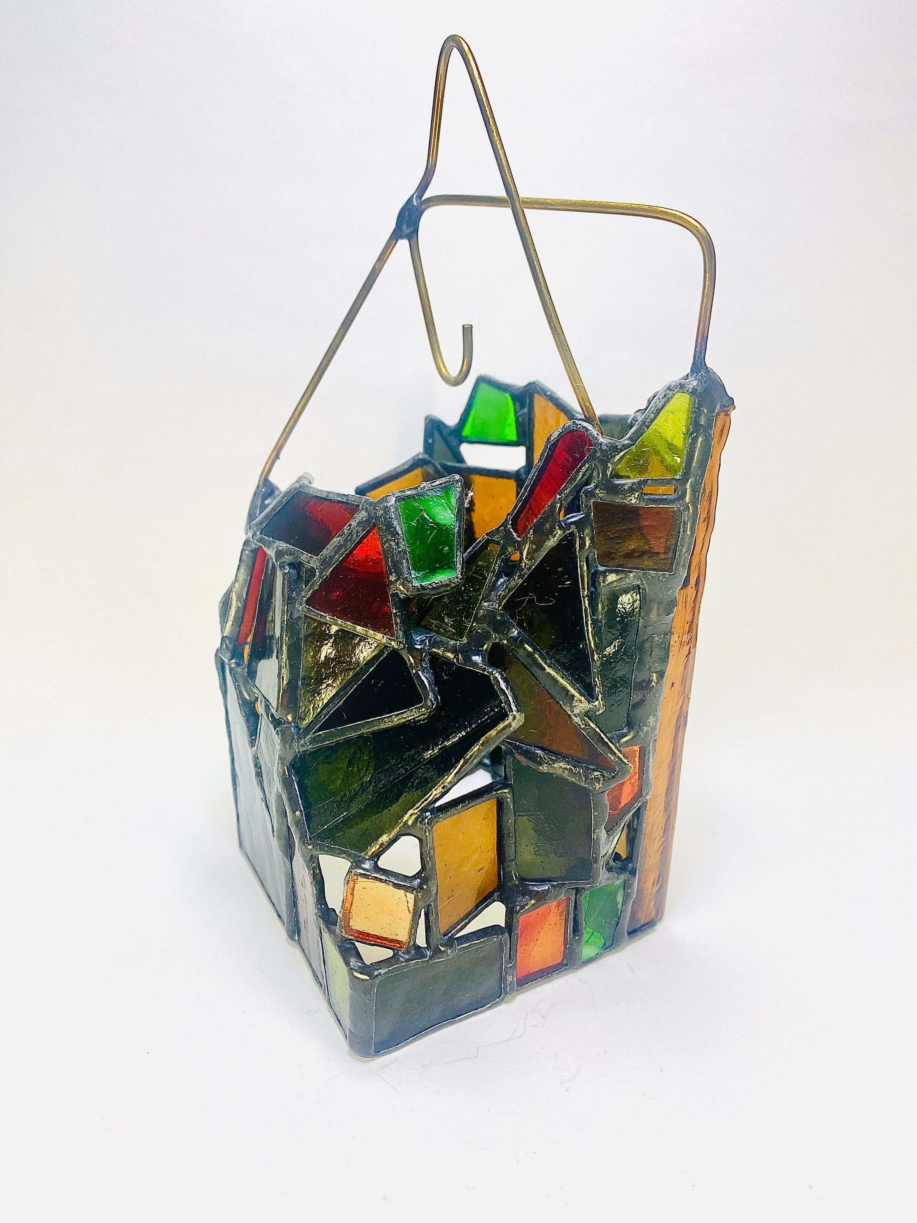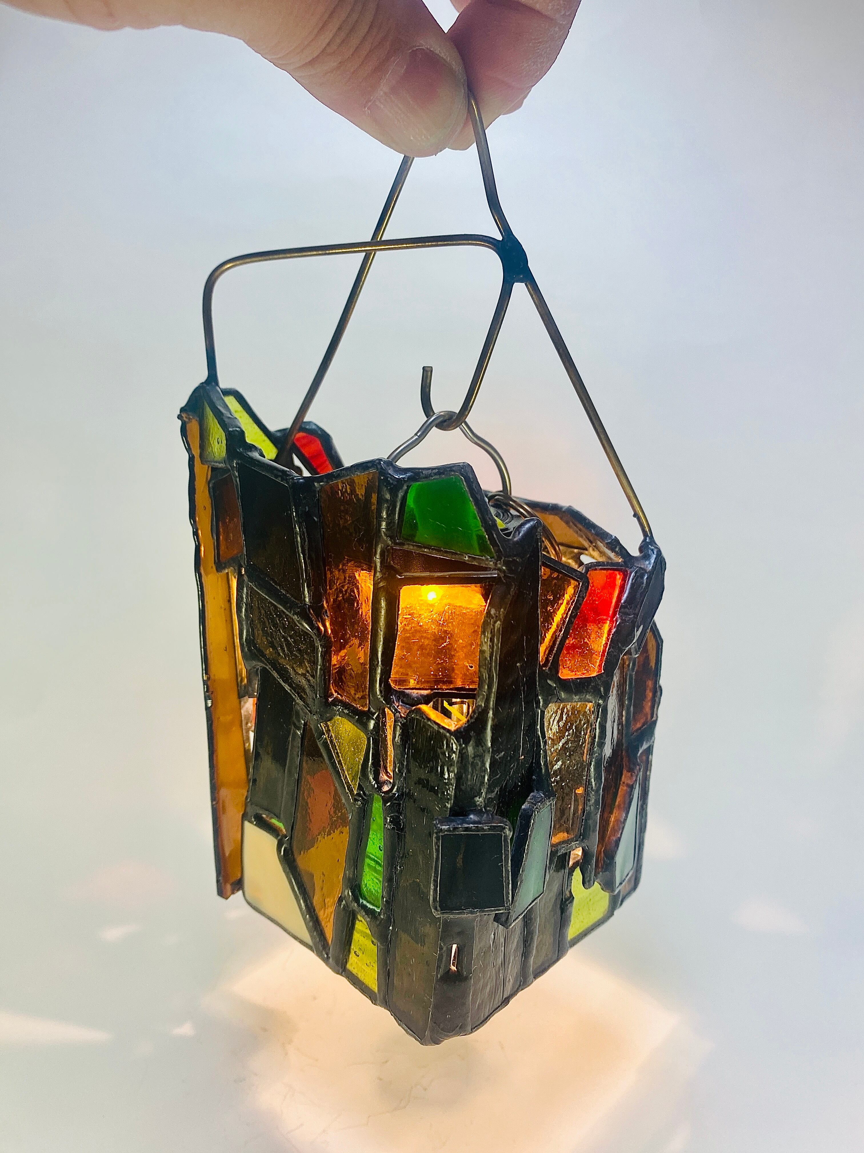 一見小箱のようなサイズ感の小型のステンドグラスランタンシェードです。ハンダ部分は黒で変色させています。