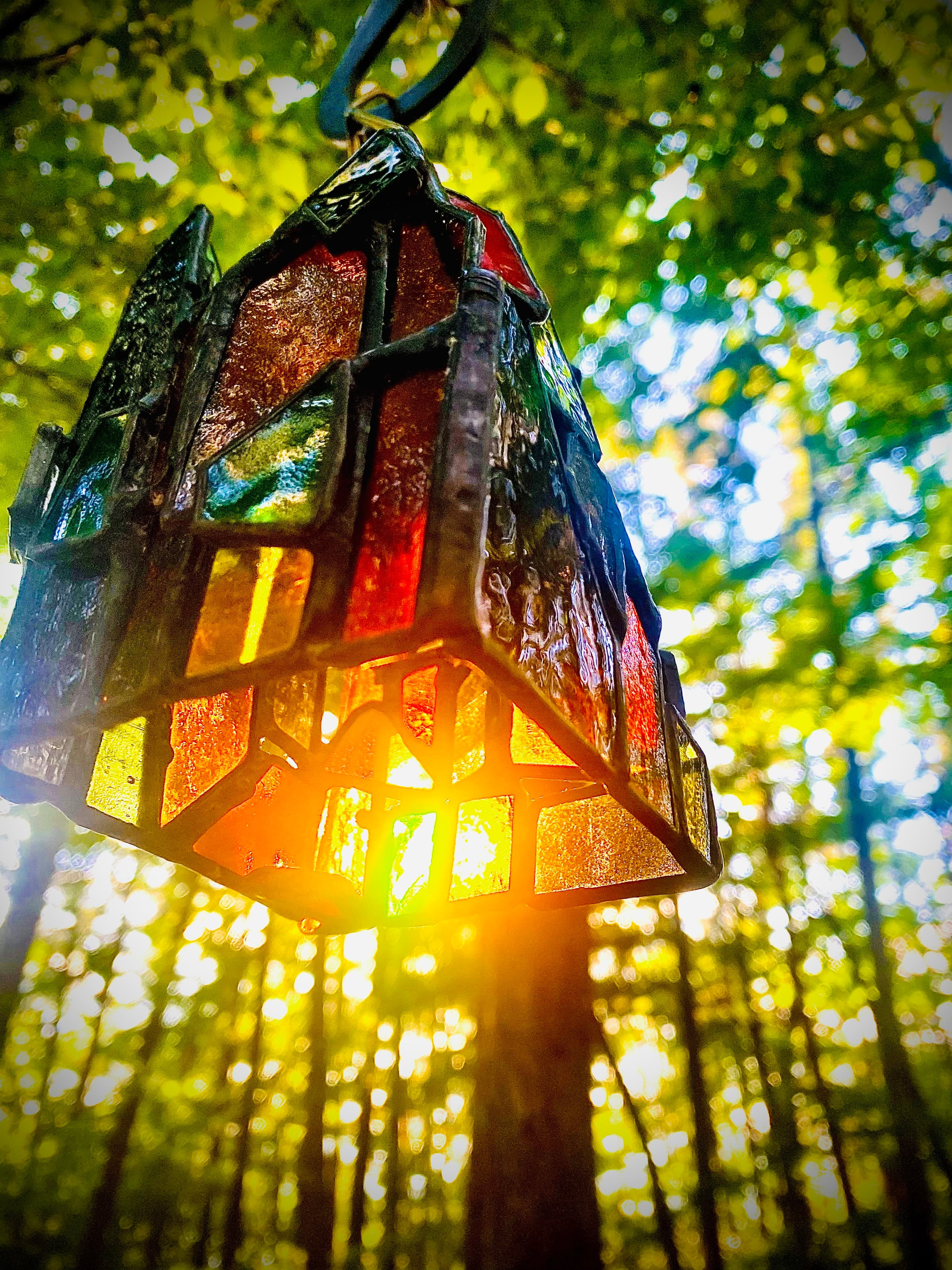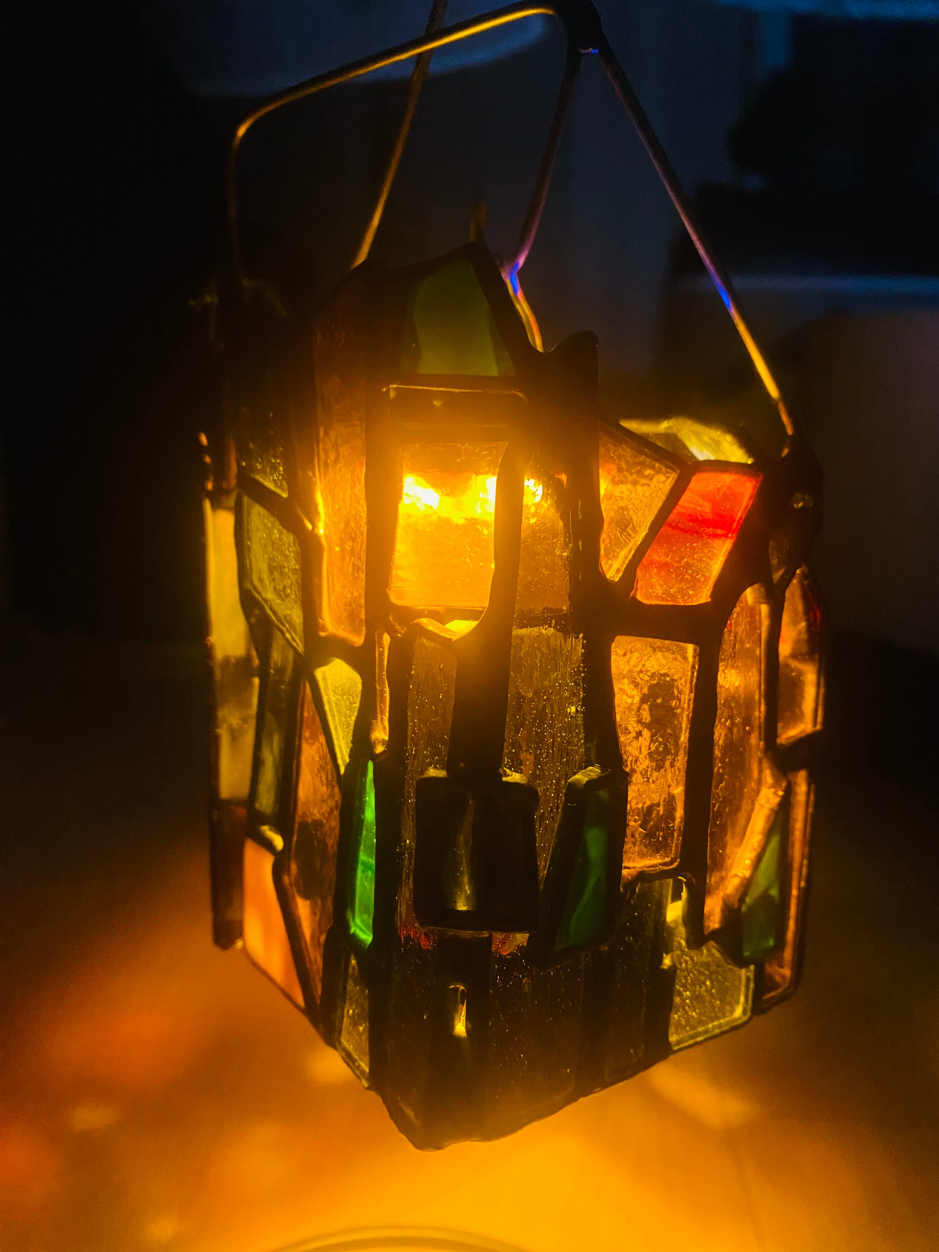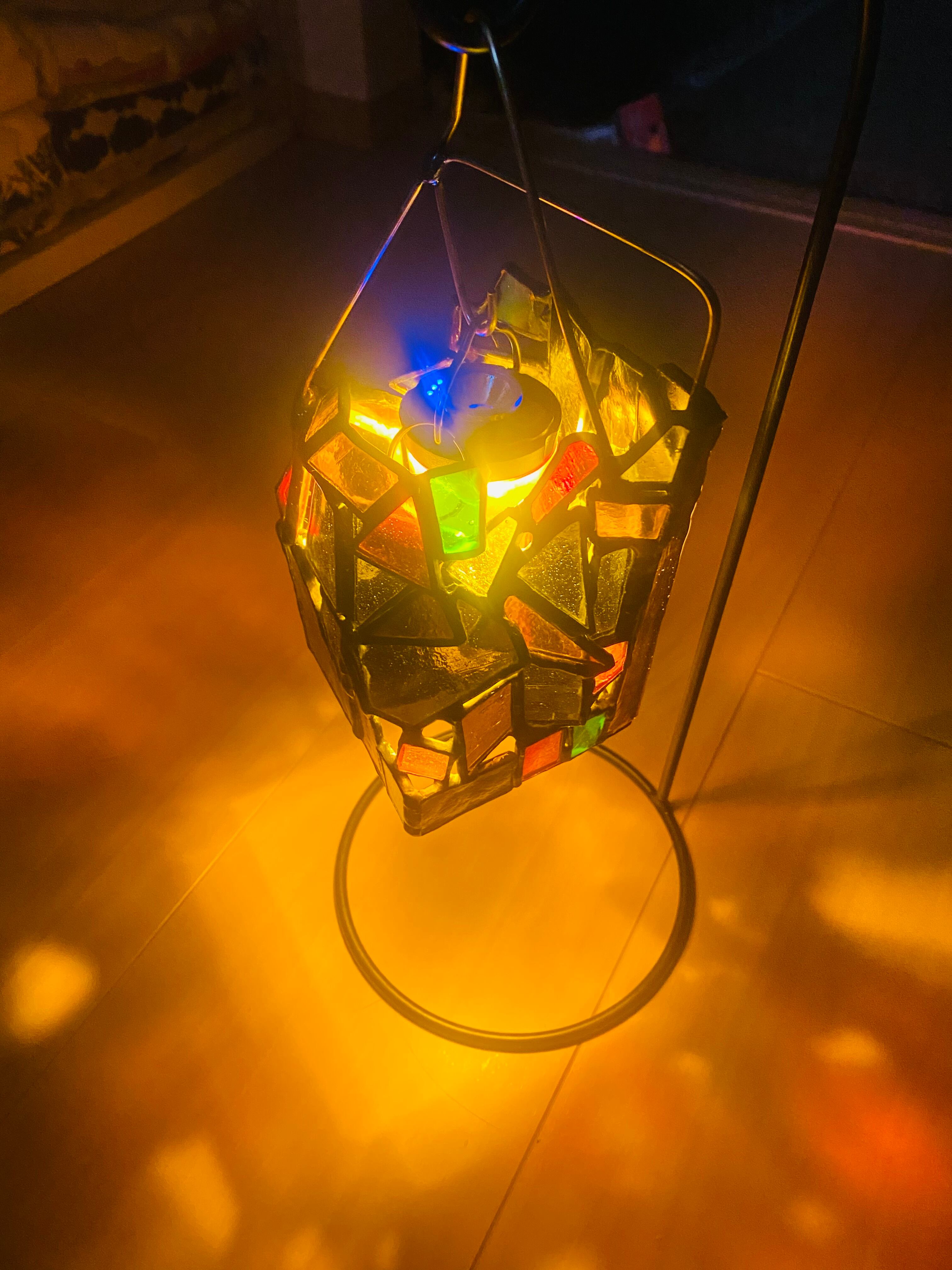 一見小箱のようなサイズ感の小型のステンドグラスランタンシェードです。ハンダ部分は黒で変色させています。
