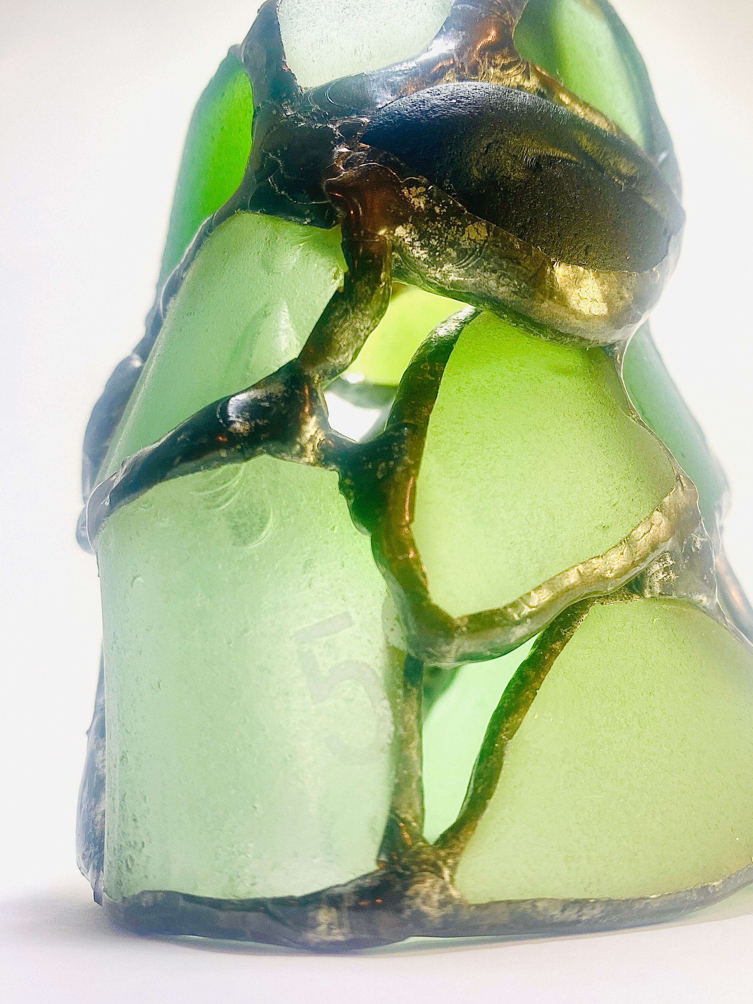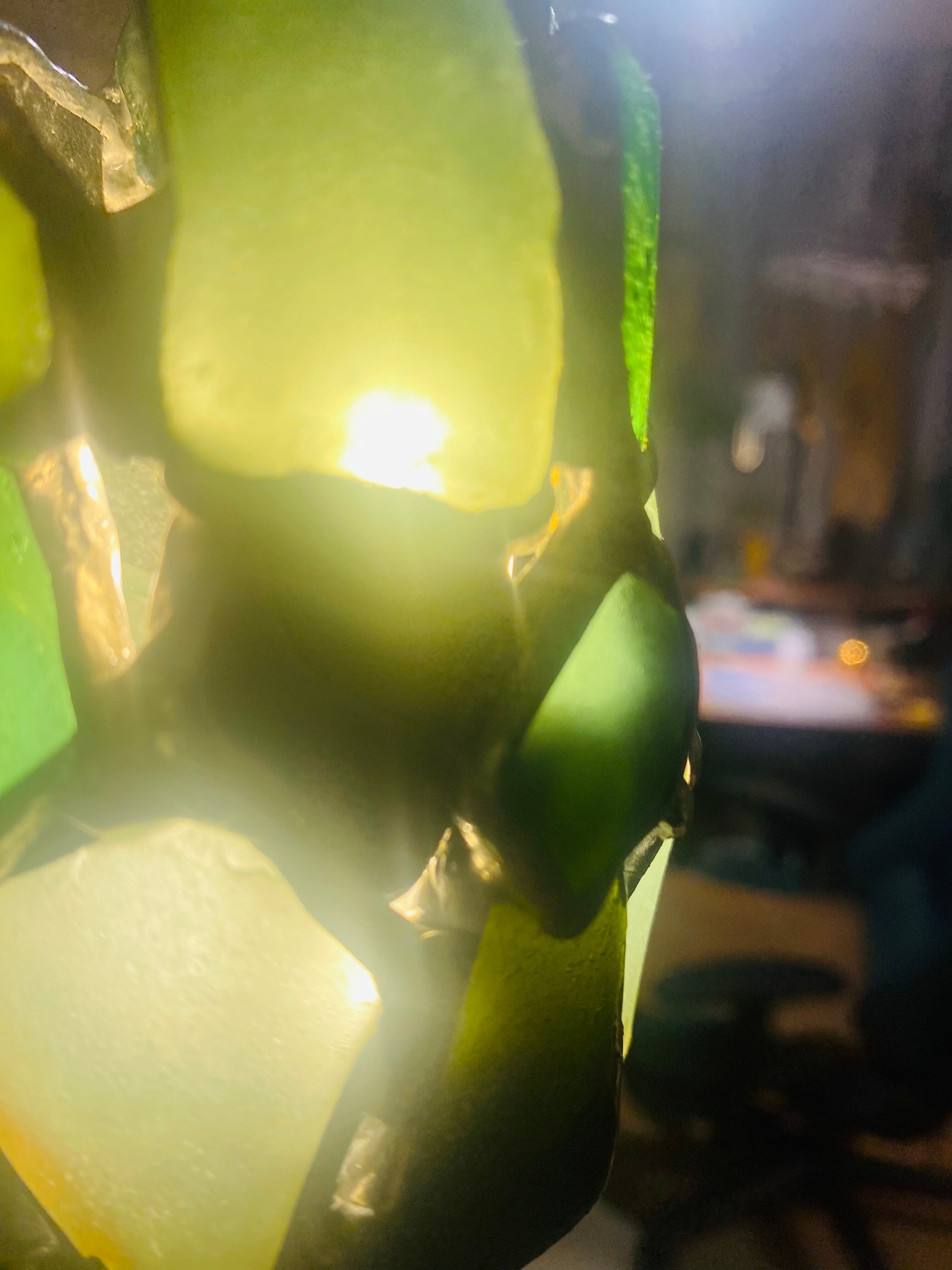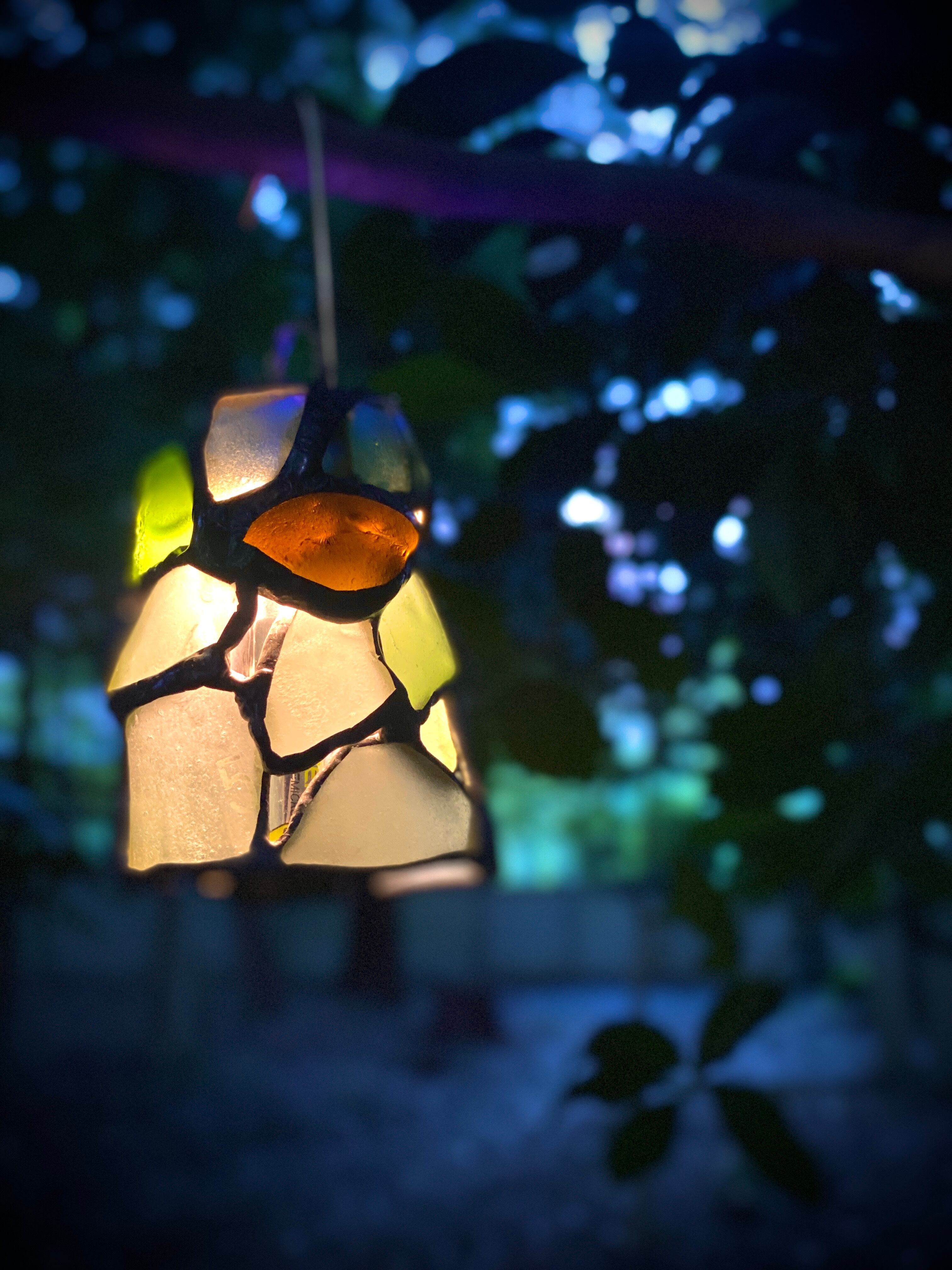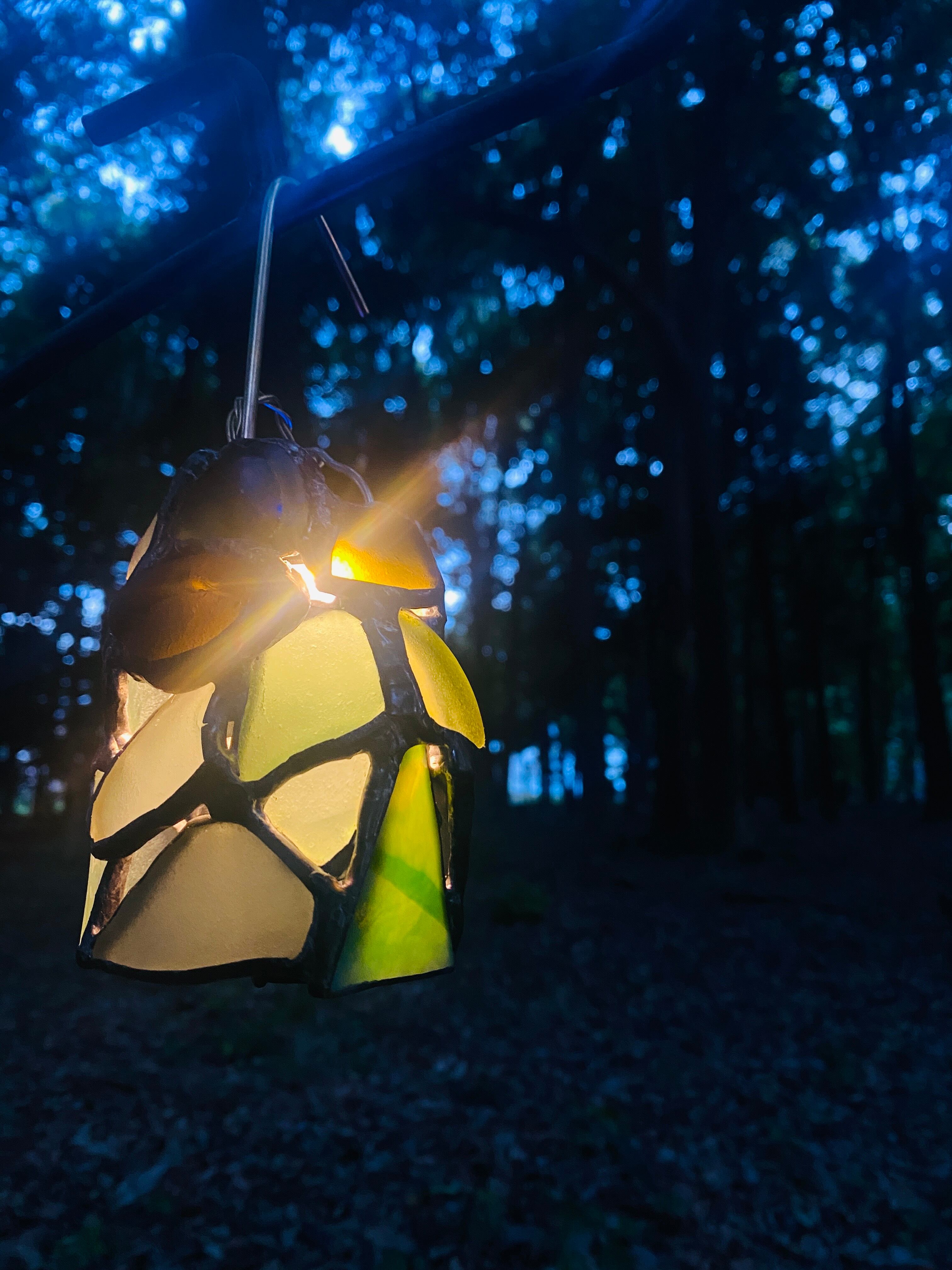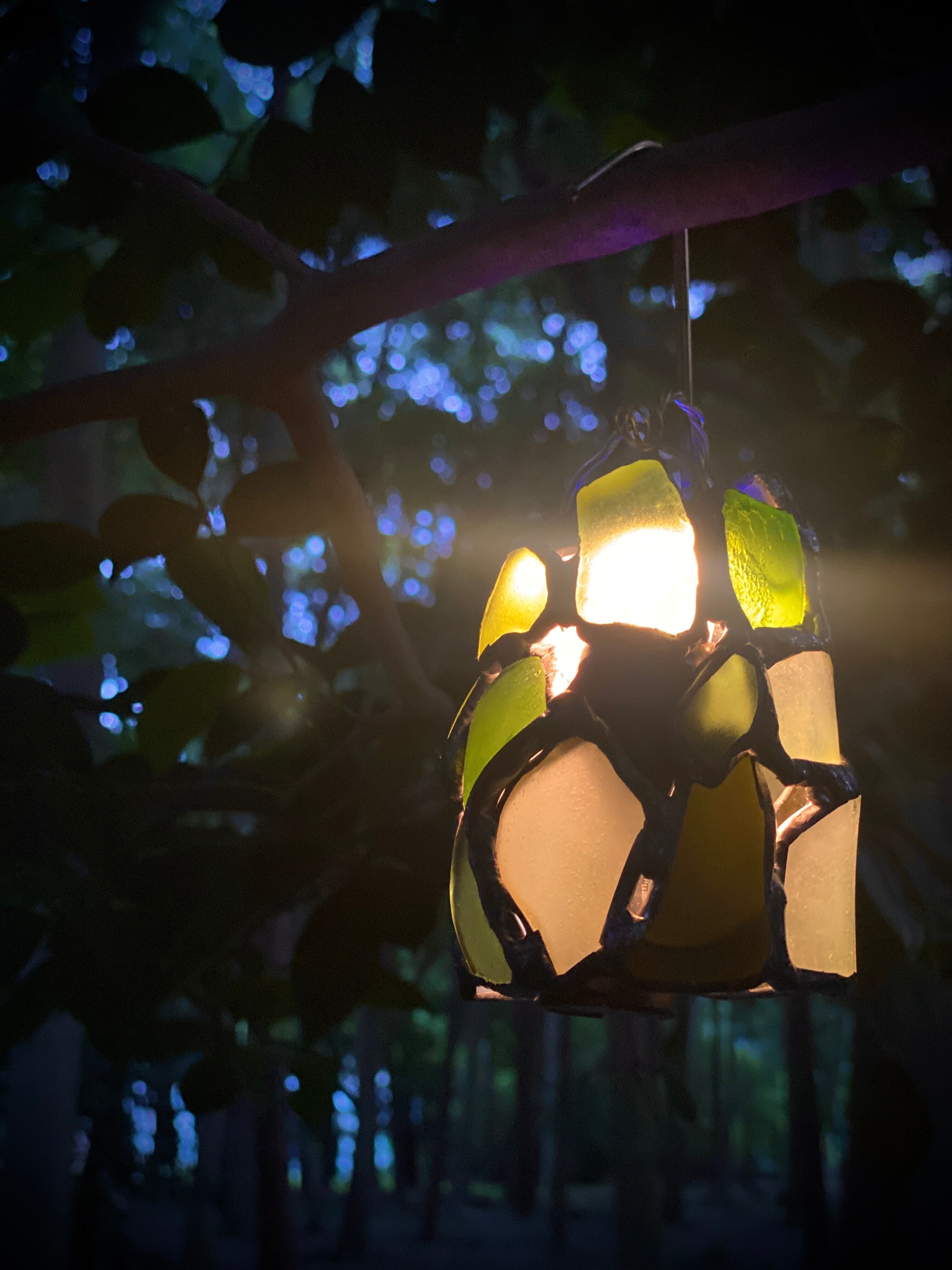 森の中の葉っぱ達が団結し、中のライトを守る鎧のような出立ちから、このタイトルにしました。見た目よりもとても重く、要塞の城壁のような雰囲気なのに、シーグラスの湾曲が功を奏し、とてもカッコ良いキュートな作品になりました。
