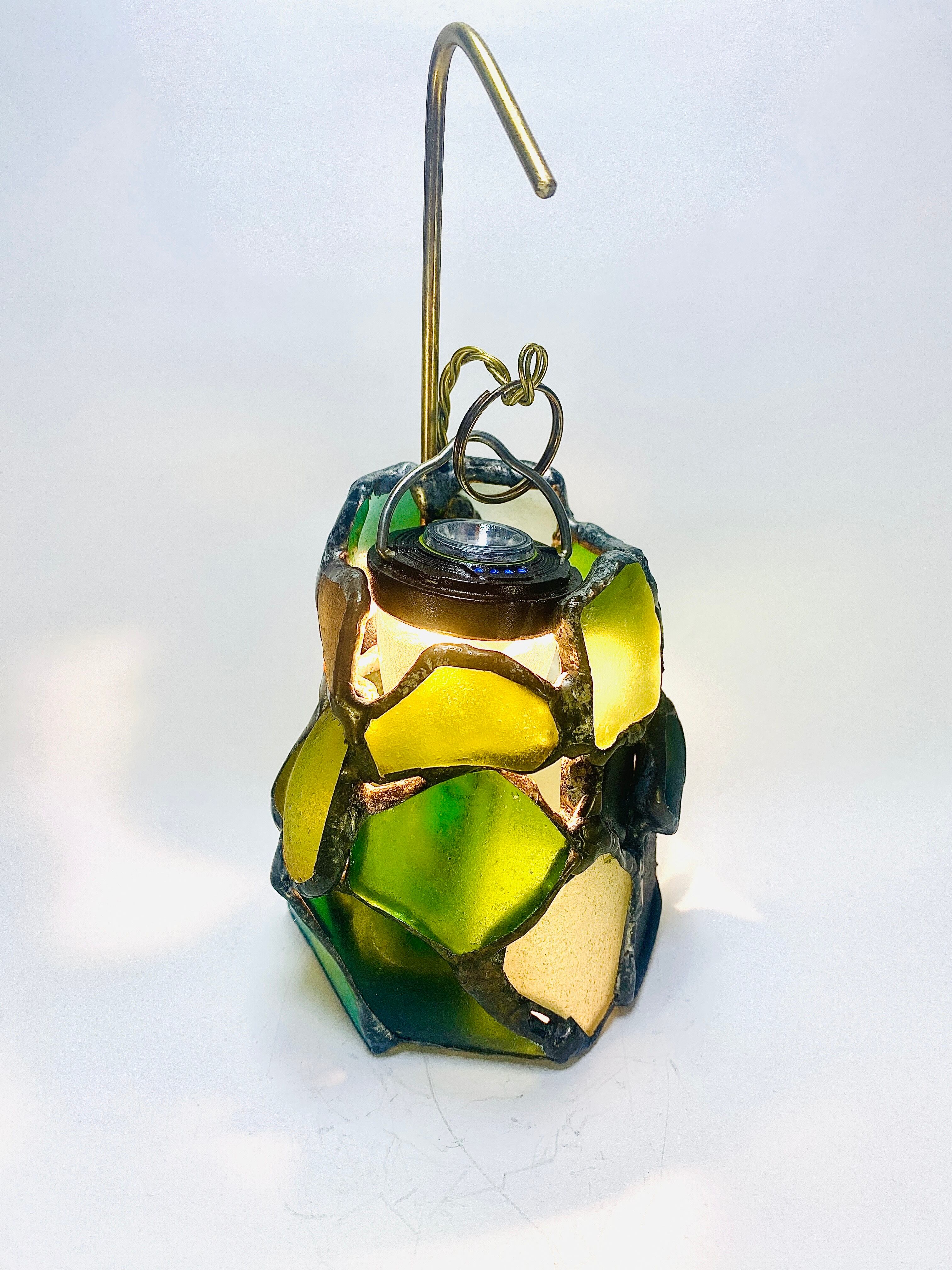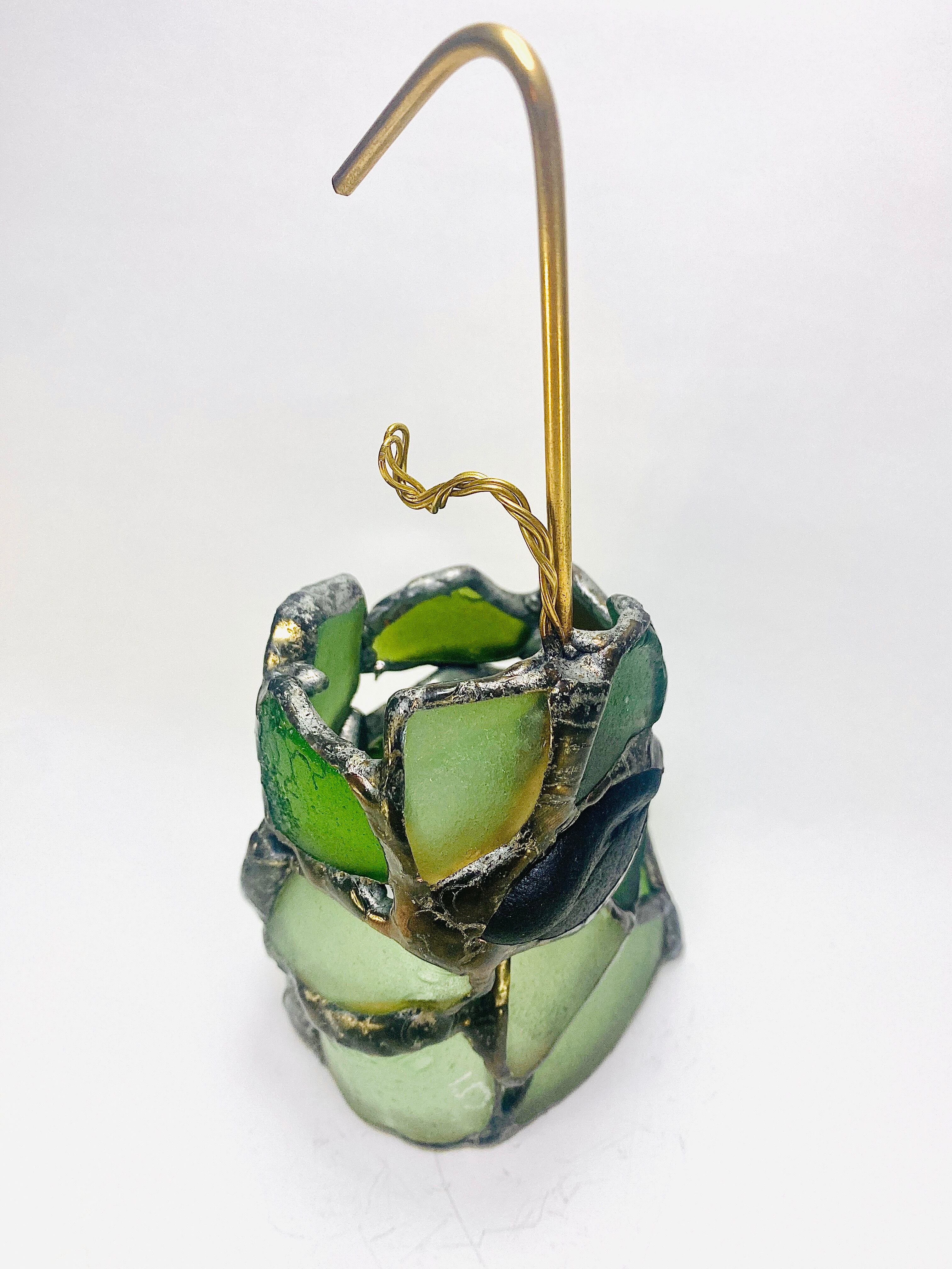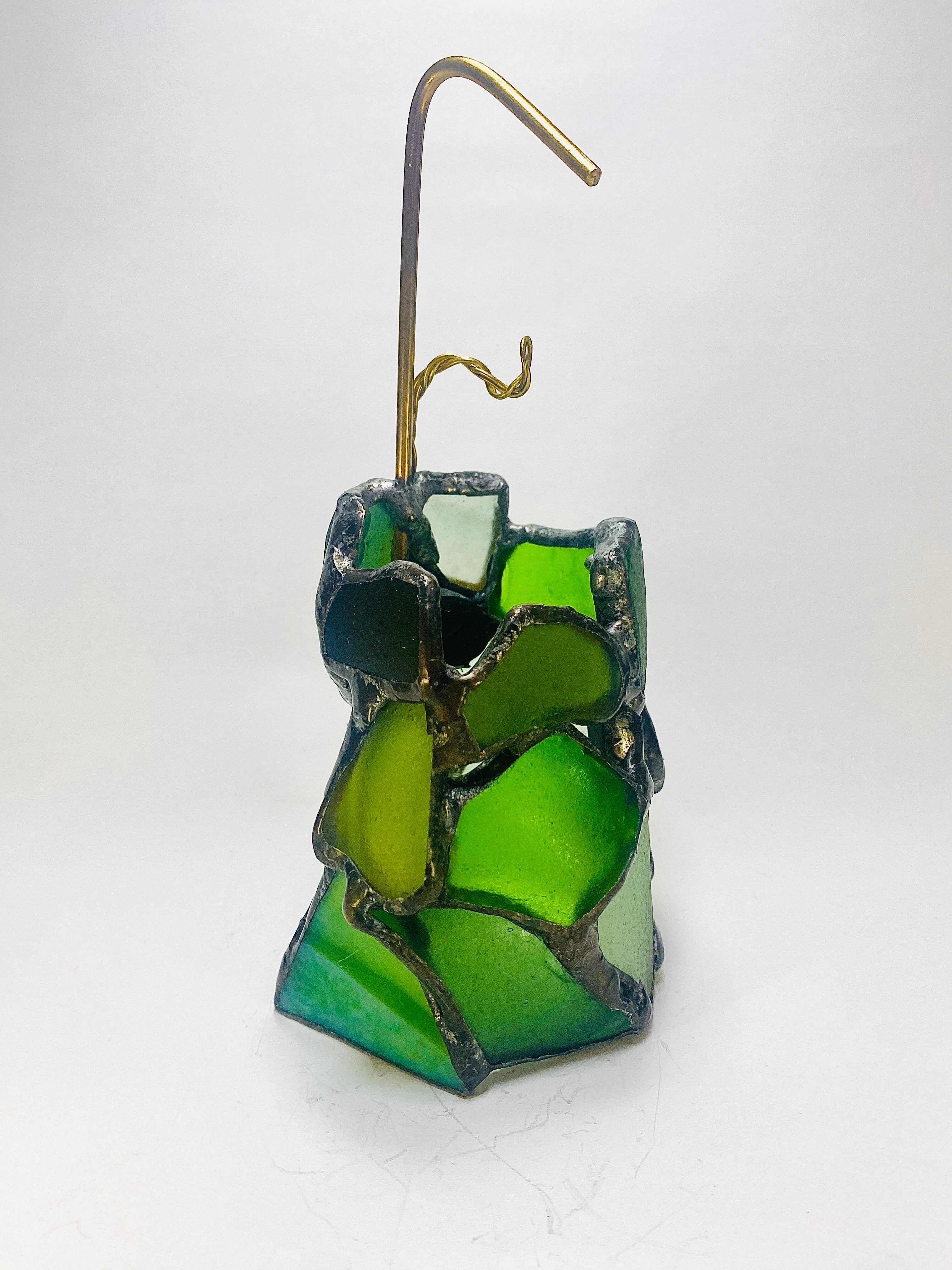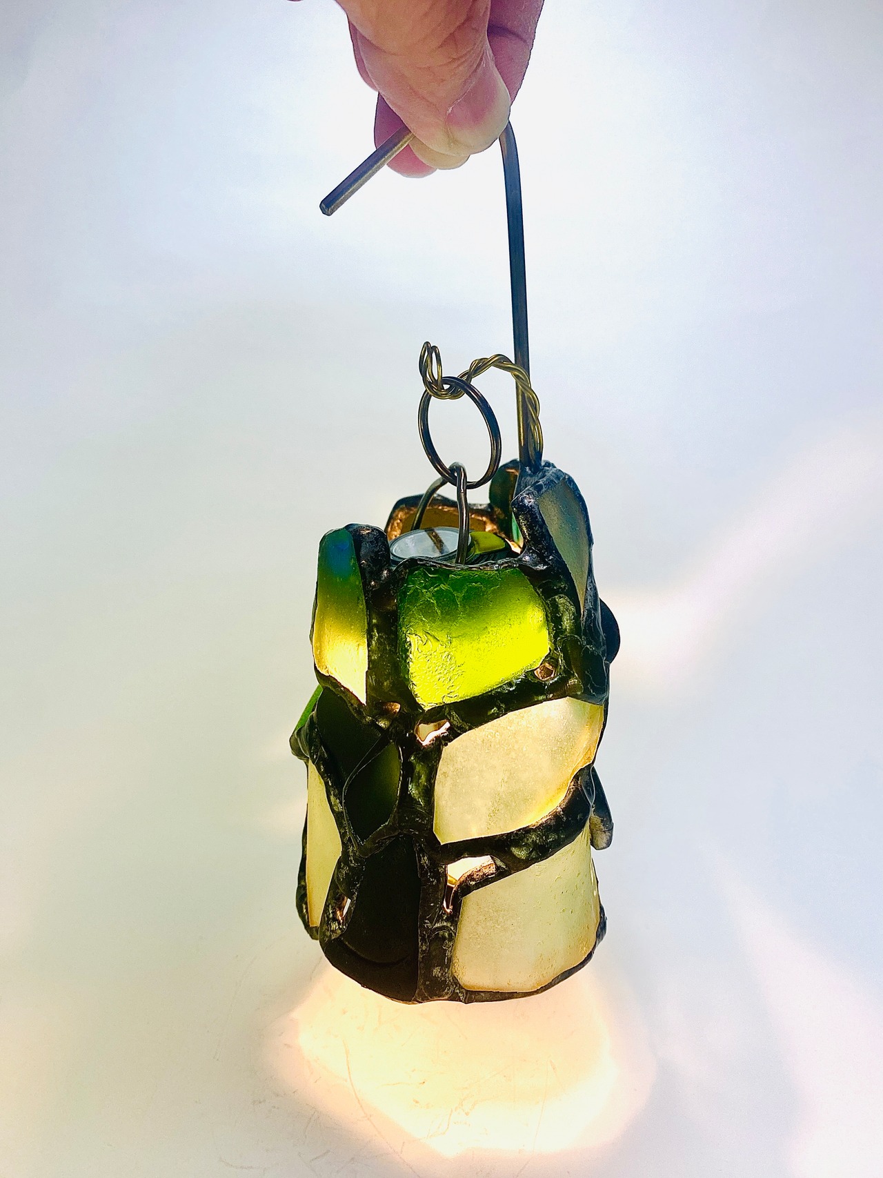 扱っている商品の中で一番小さなのステンドグラスランタンシェードです。グリーン系のシーグラスで組み立て、ハンダ部分は薄めのアンティークゴールド調で変色させています。