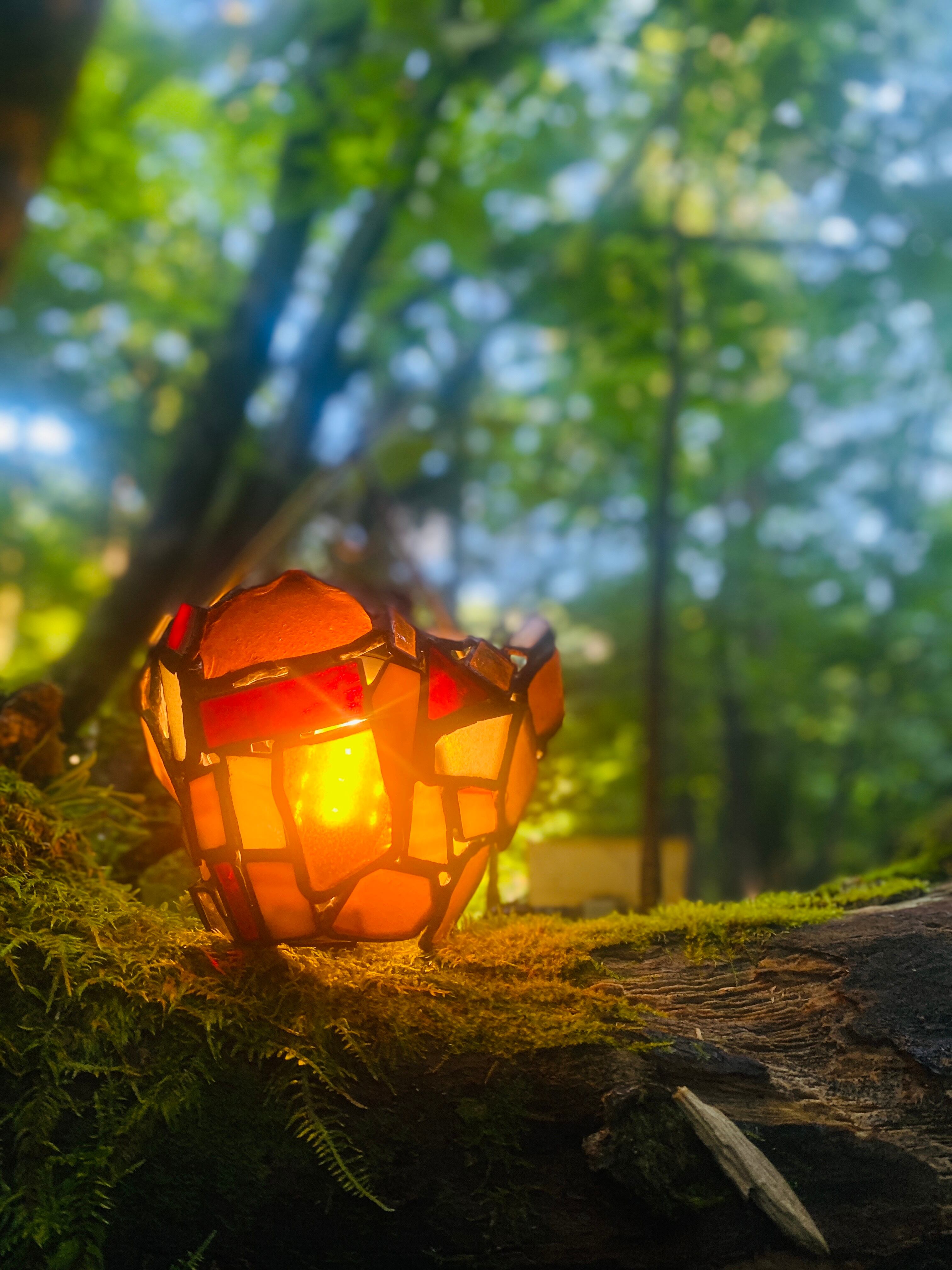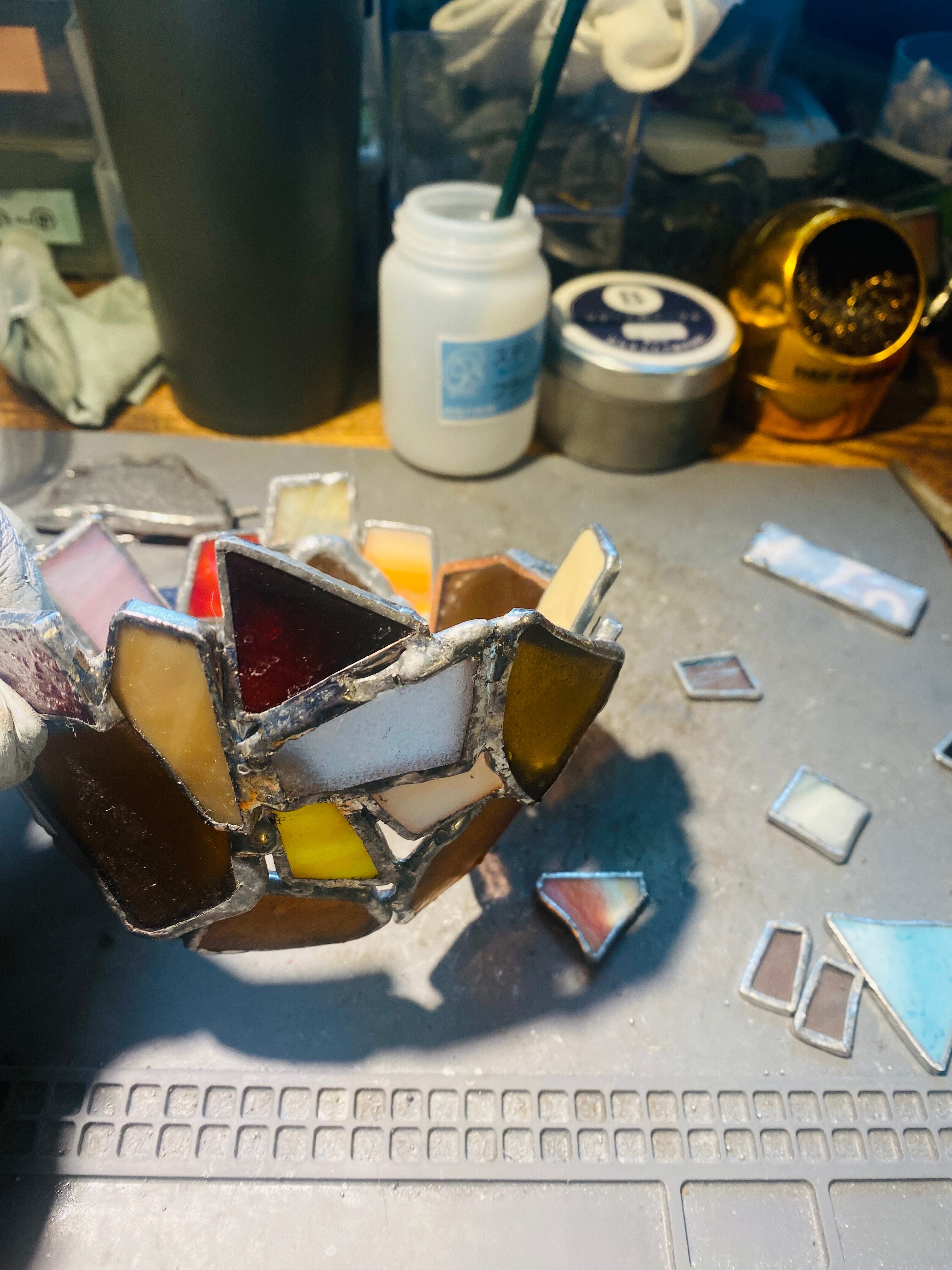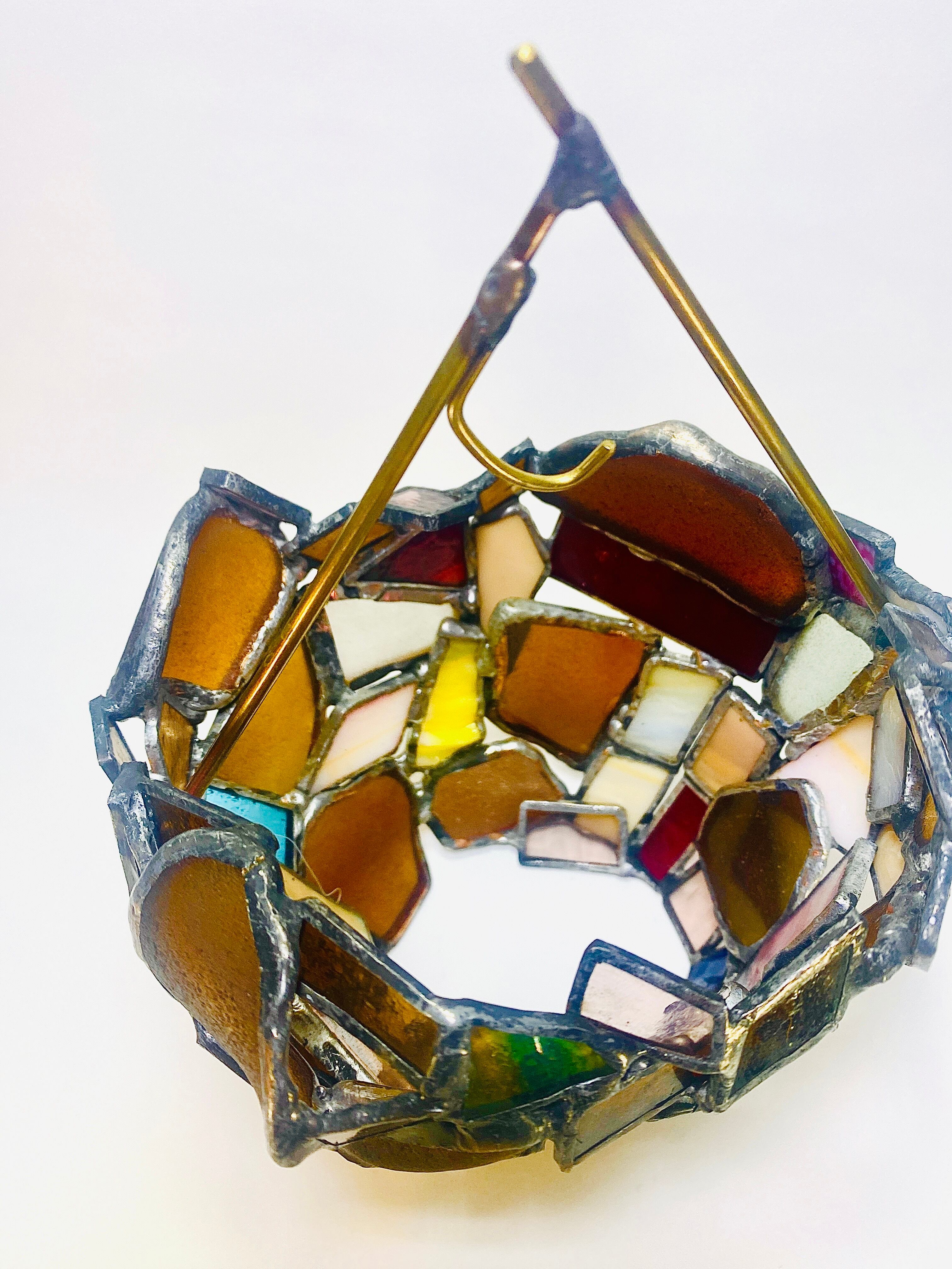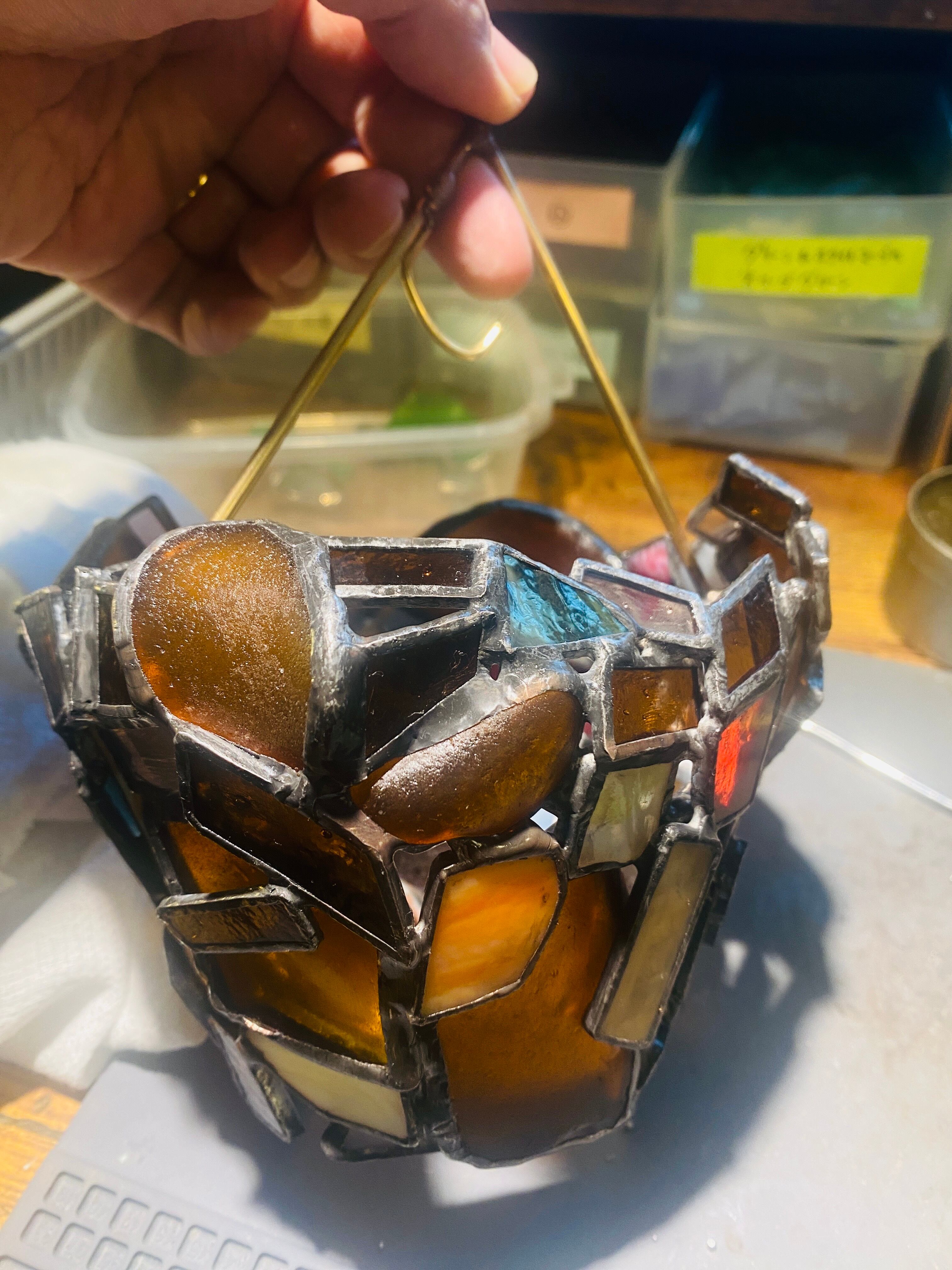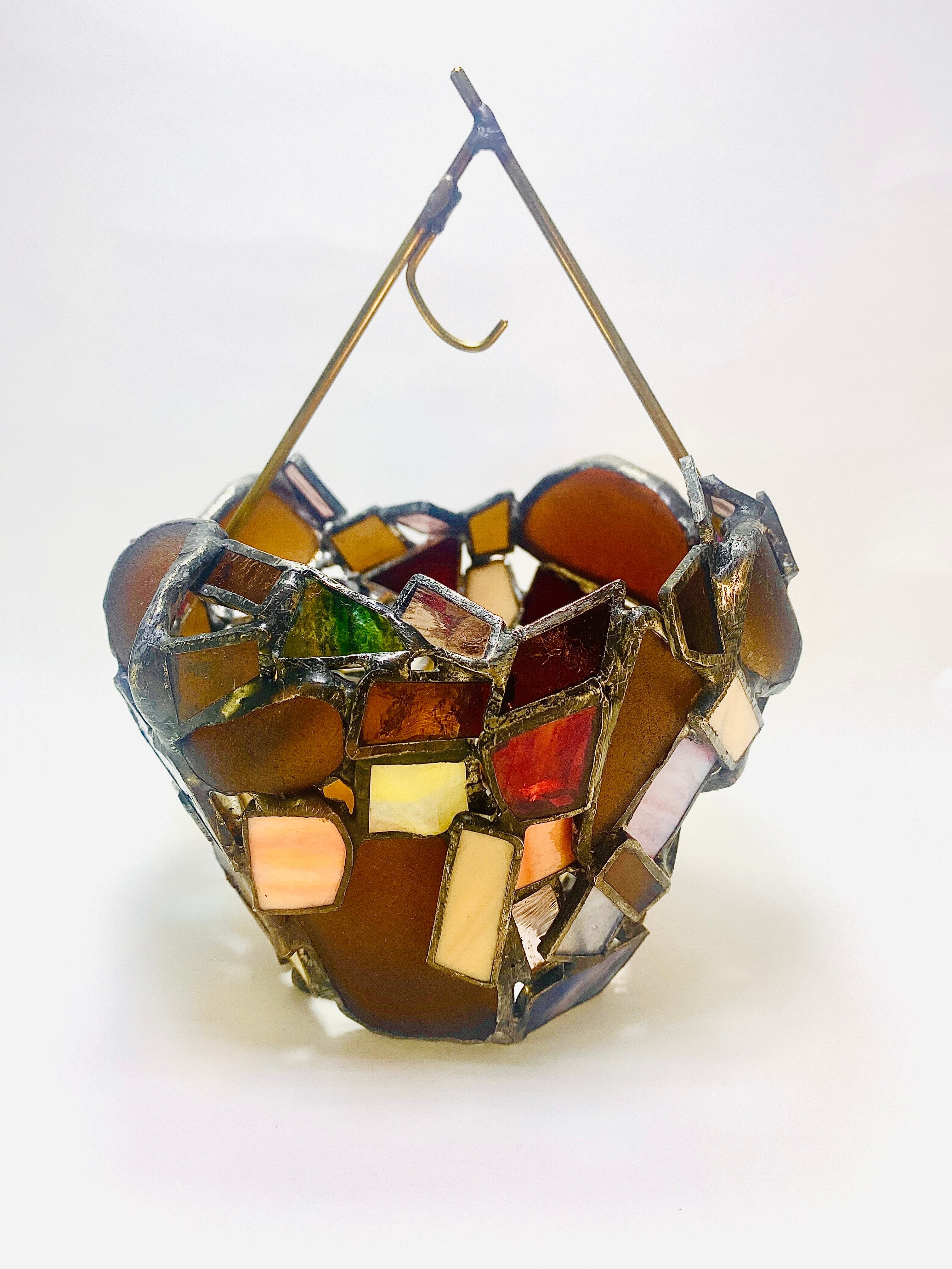 シーグラスのブラウンを基調に、暖色系のガラスを散りばめた、ハートをイメージしたステンドグラスランタンシェードです。ハンダは弱めのブラックに変色させていますが、所々、ガラスの雰囲気に合わせて、一部を強く擦ることでアンティークな風合いを出しました。まるで、昔からずっとそこに置いてあったかの様に。