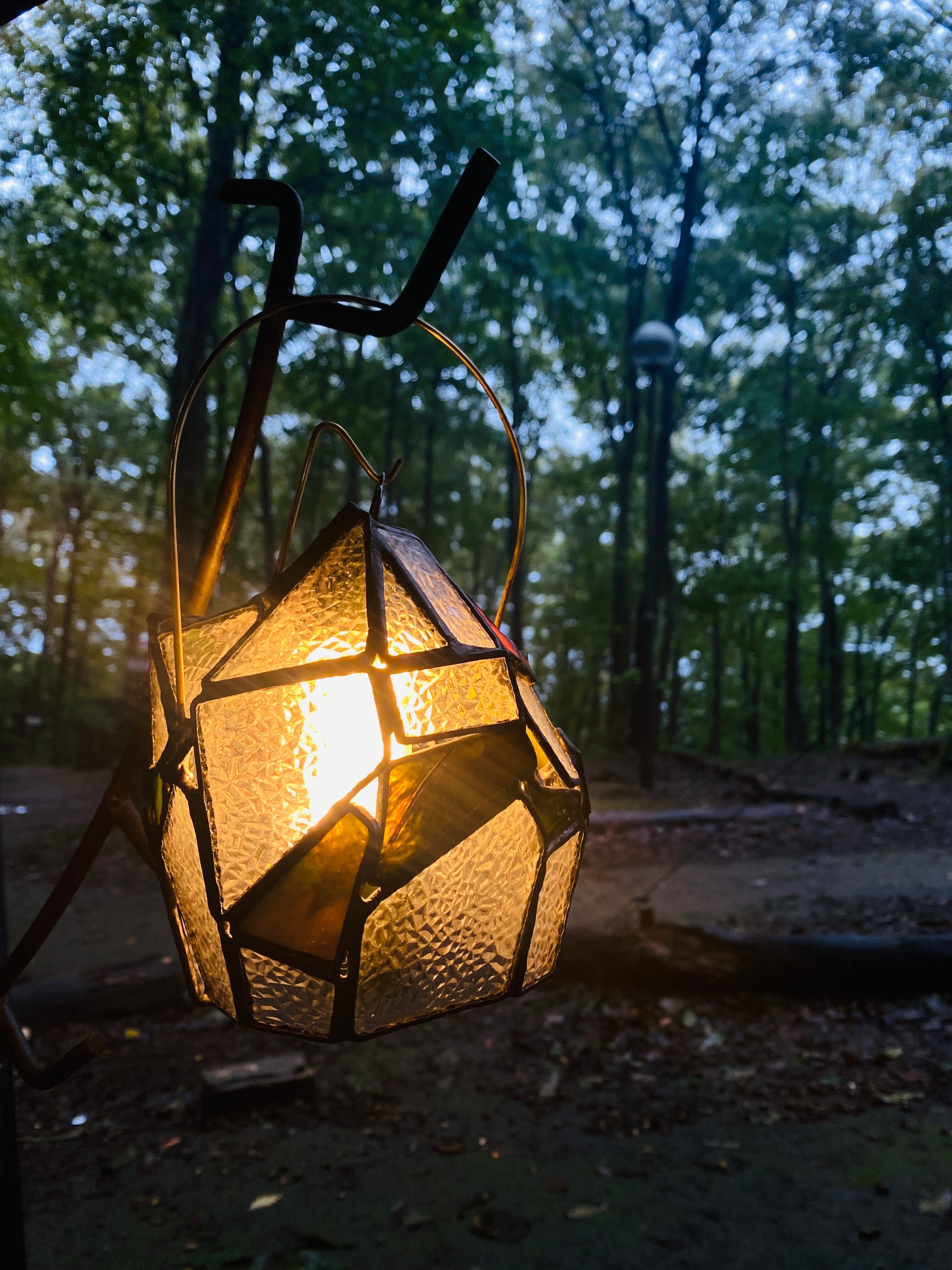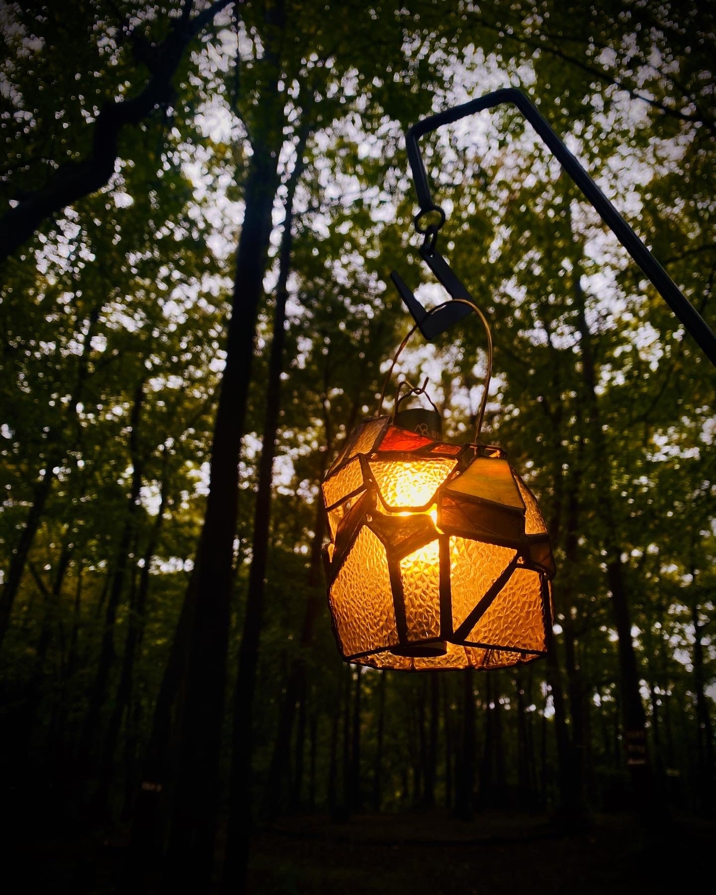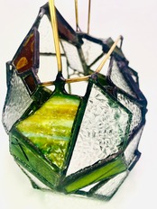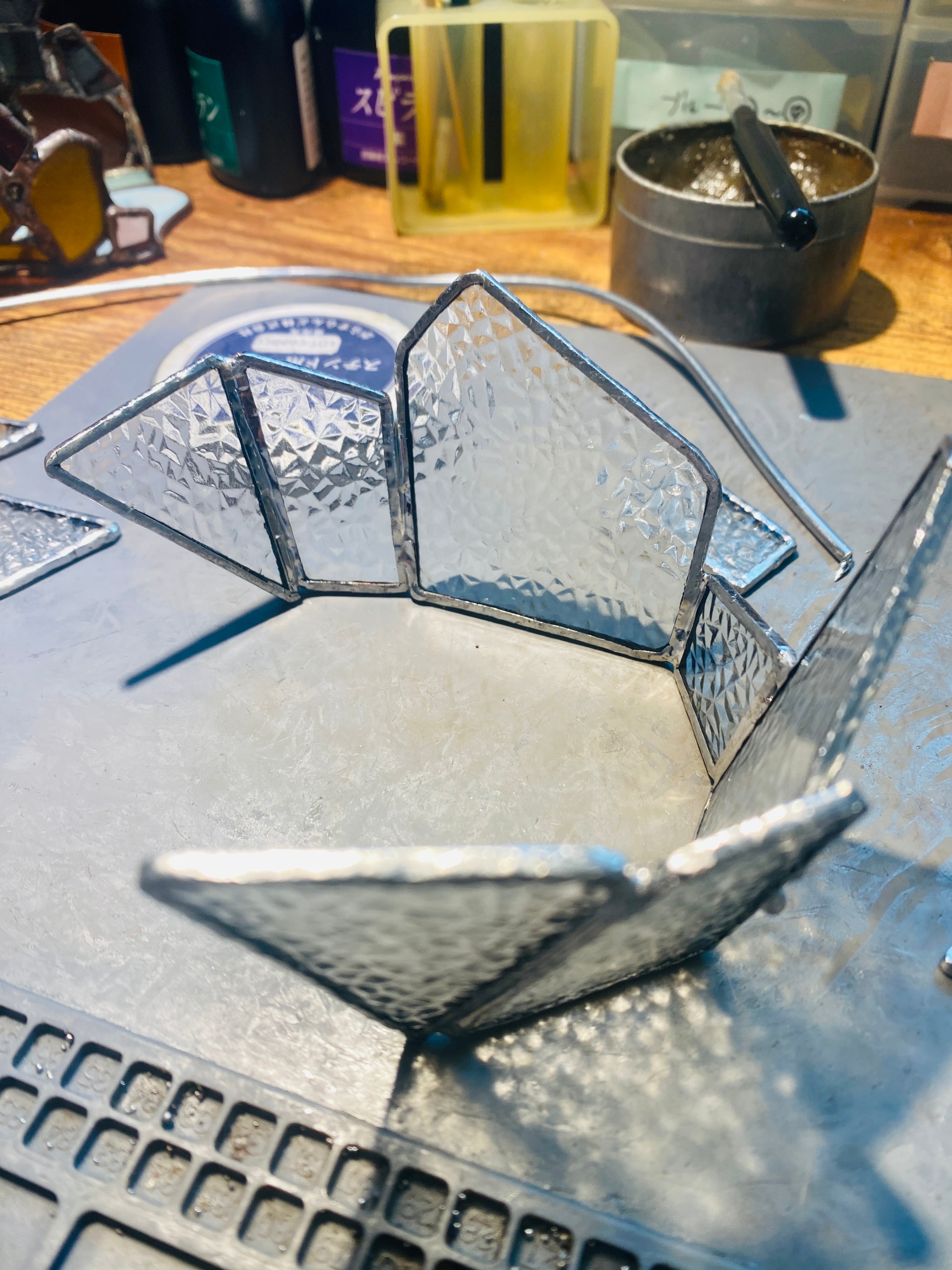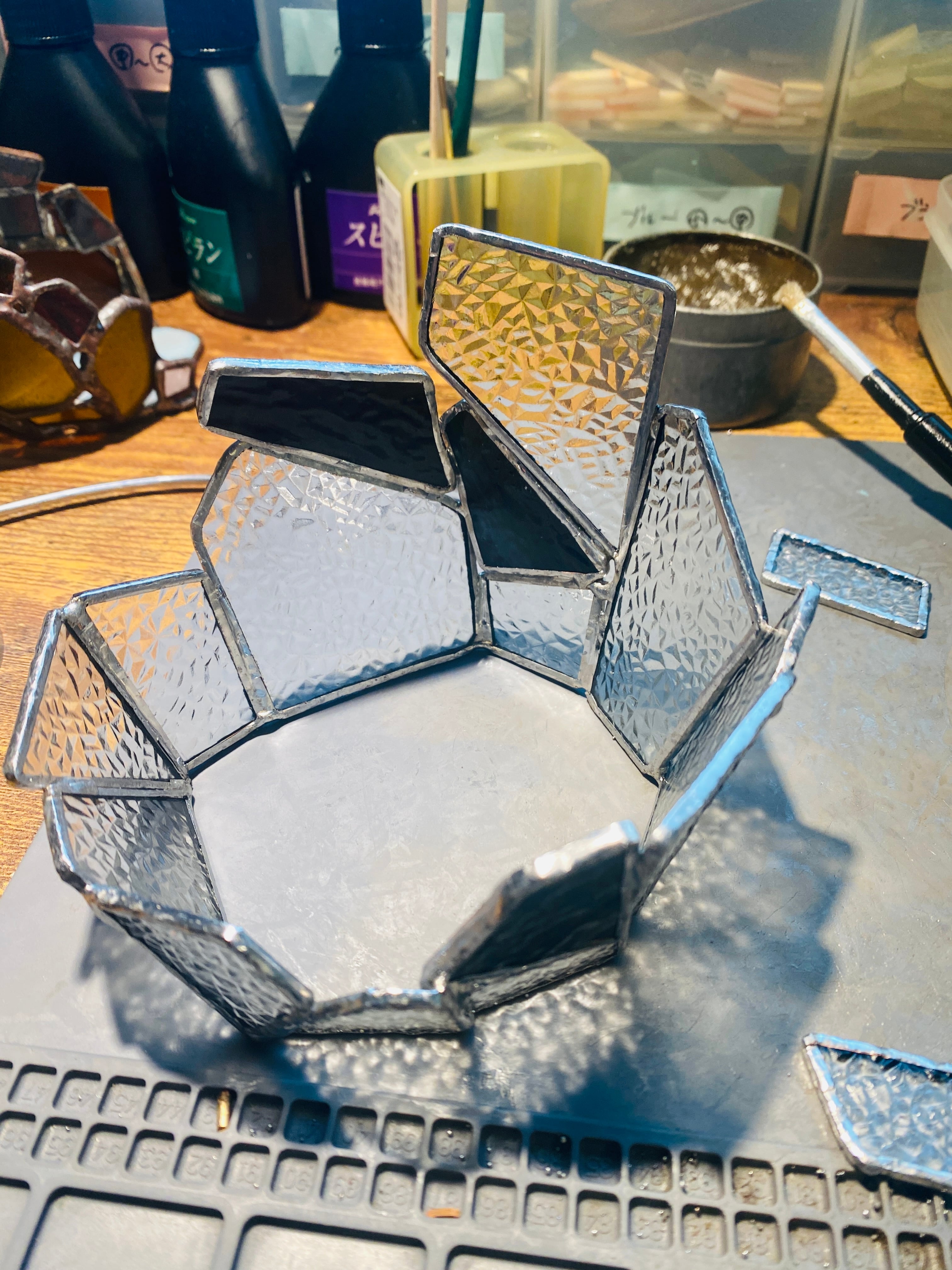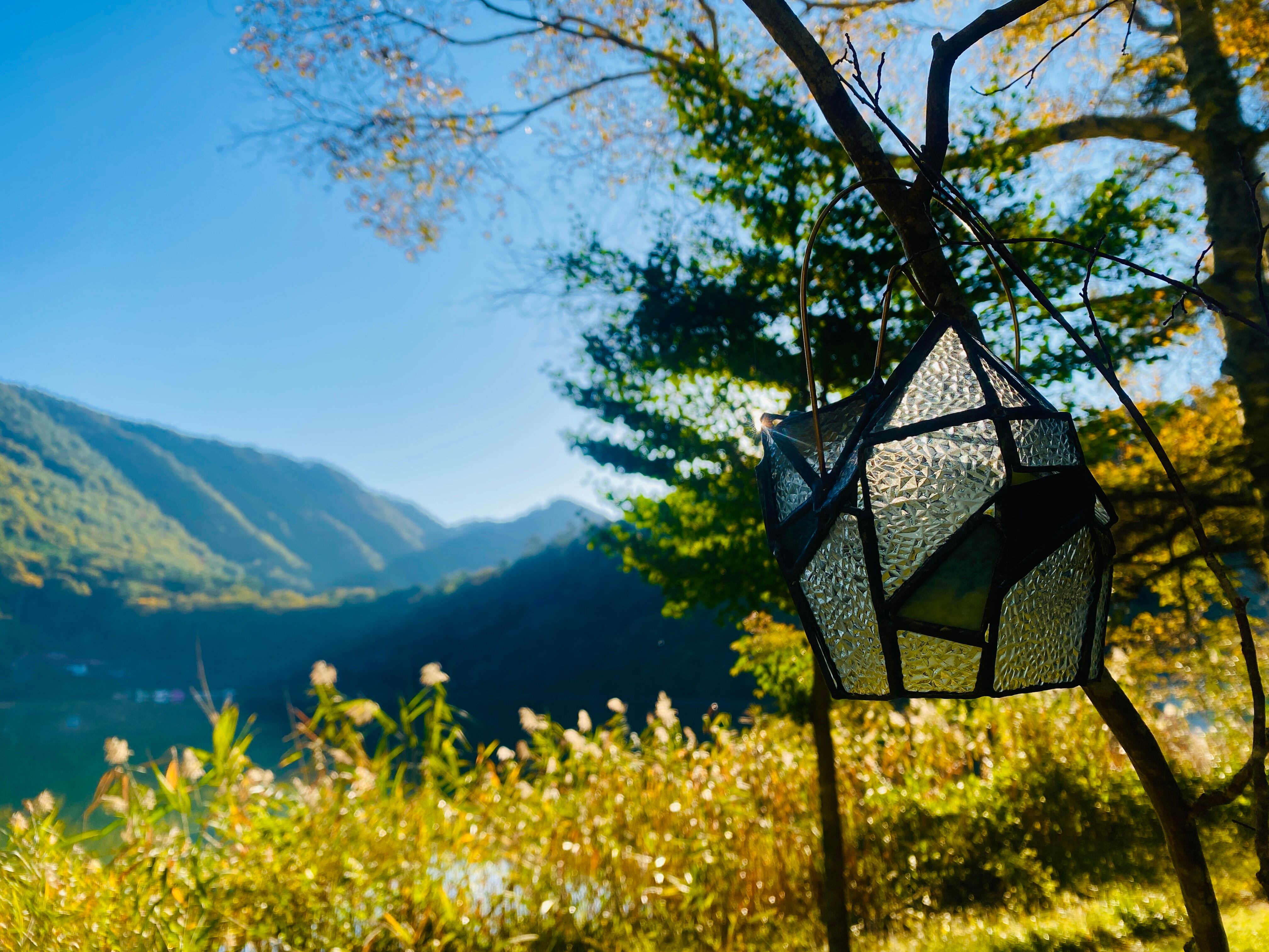 作品の名前にある”虚”の読みは、うつろ。型板ガラスの他に、昔の懐かしい記憶をほんのり色付けるような、ノスタルジックなカラーのガラスを入れています。それと合わせて、頭も心も空っぽにして、少しロマンチックにぼーっと灯りを眺められたらという思いで、このタイトルにしました。静かな夜に、目の前の灯りだけに集中する時間があってもいいのかなと。ハンダはその空虚な時間に没頭できるように、ガラスの雰囲気が締まる黒にしてあります。昼間はダイヤガラスの繊細な反射を、夜は中にライトを入れ、少しのロマンを抱きながら心地の良い時間のお供にしていただければと思います。