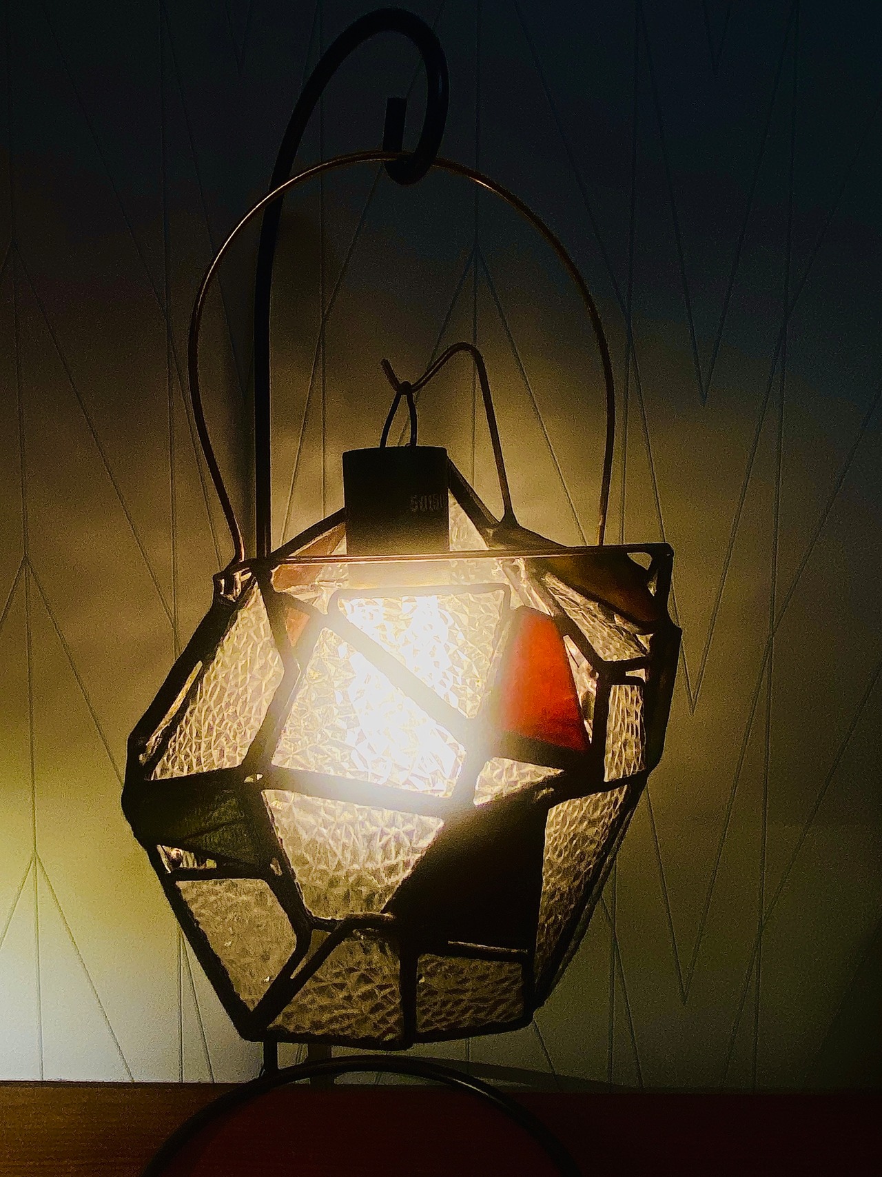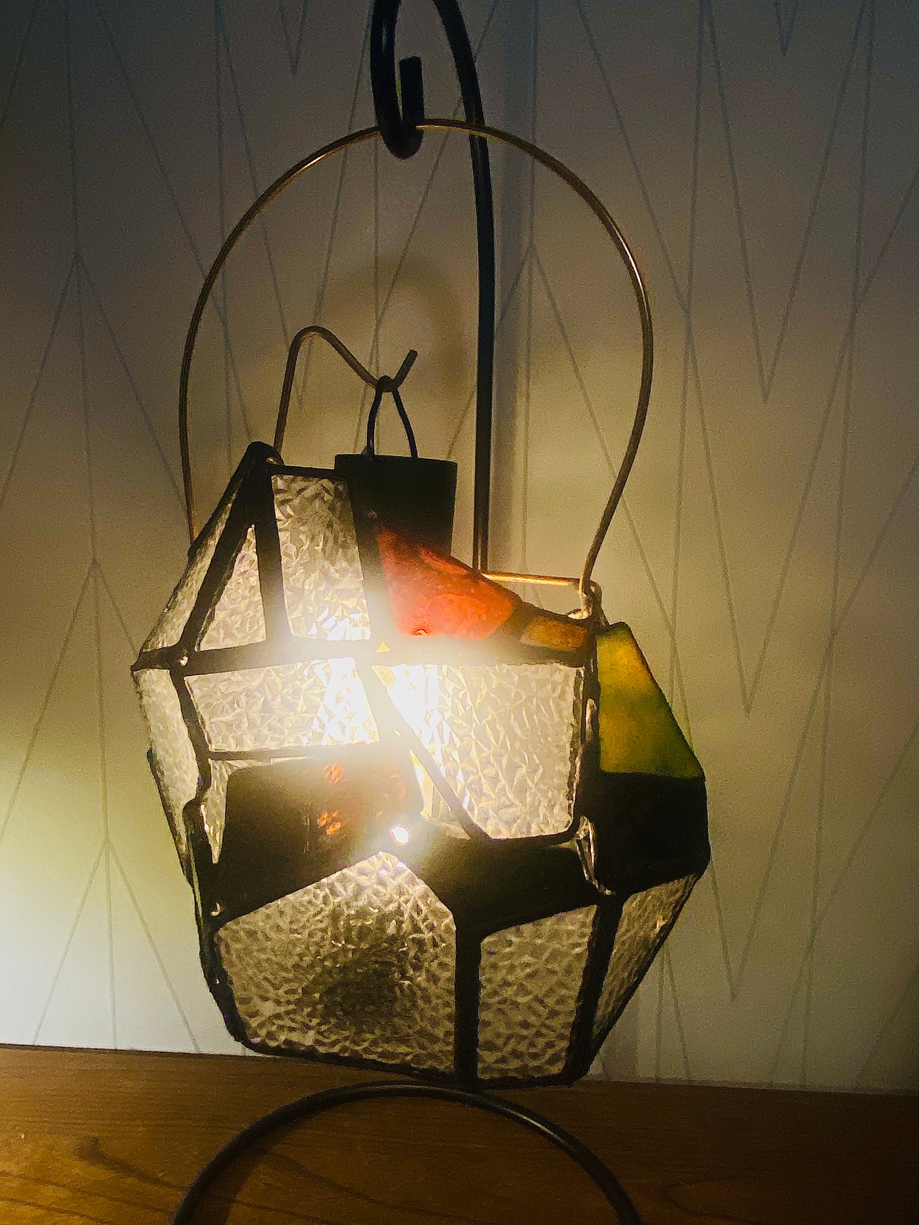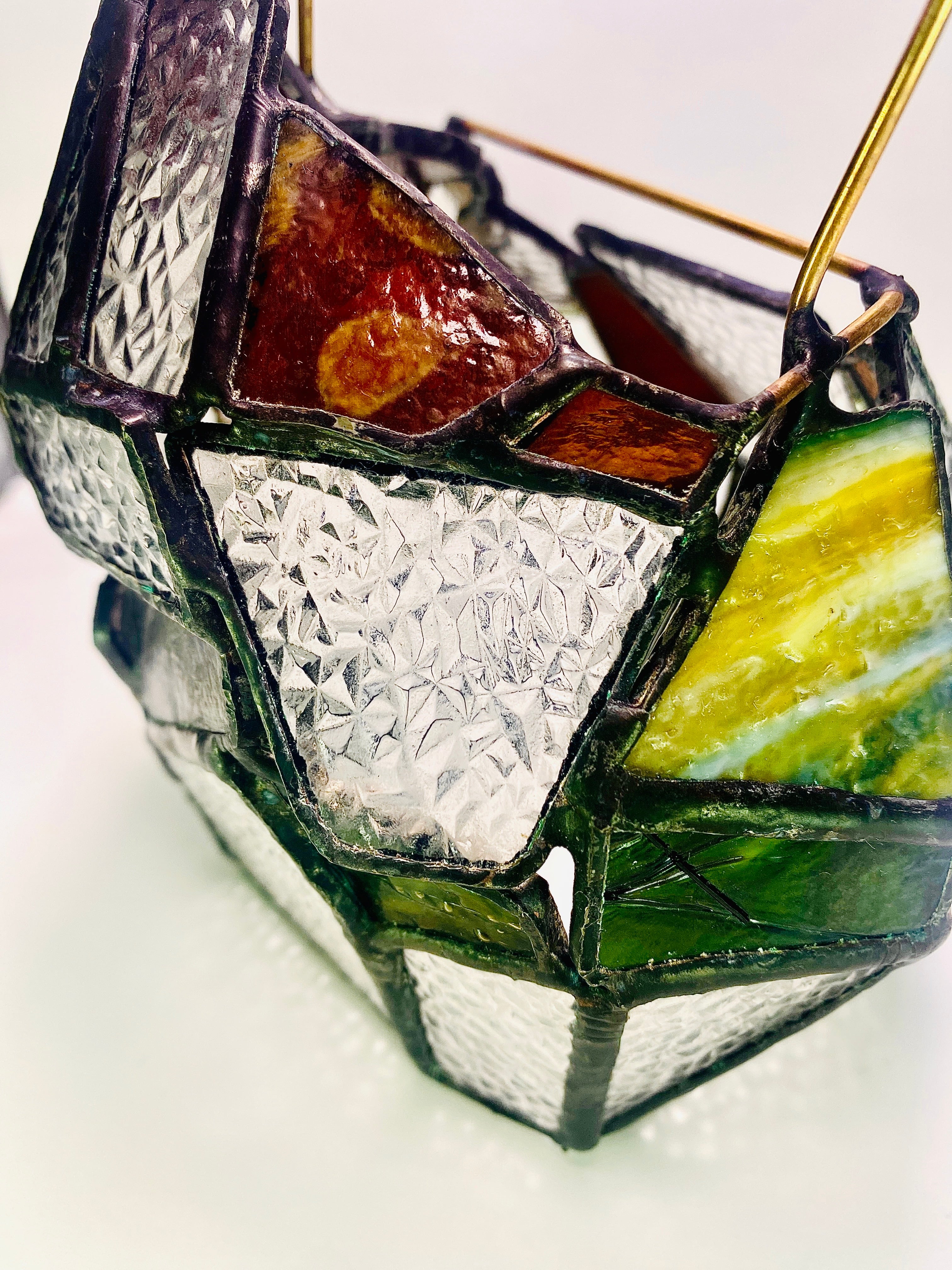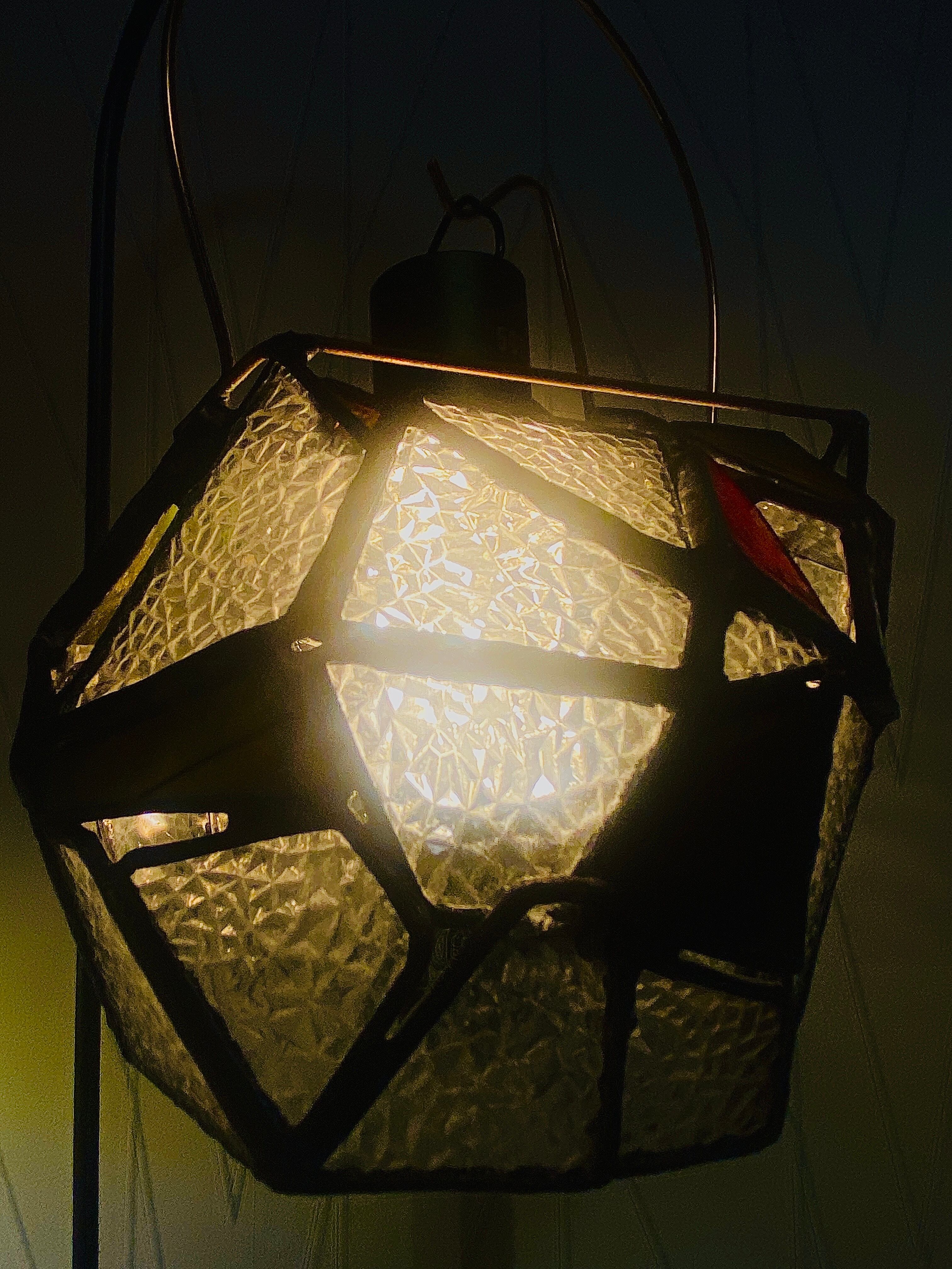 昭和の時代を思い出す、当時の一般的な家庭でよくみた型板ガラス”ダイヤ”を使用した、ステンドグラスのランタンシェードです。