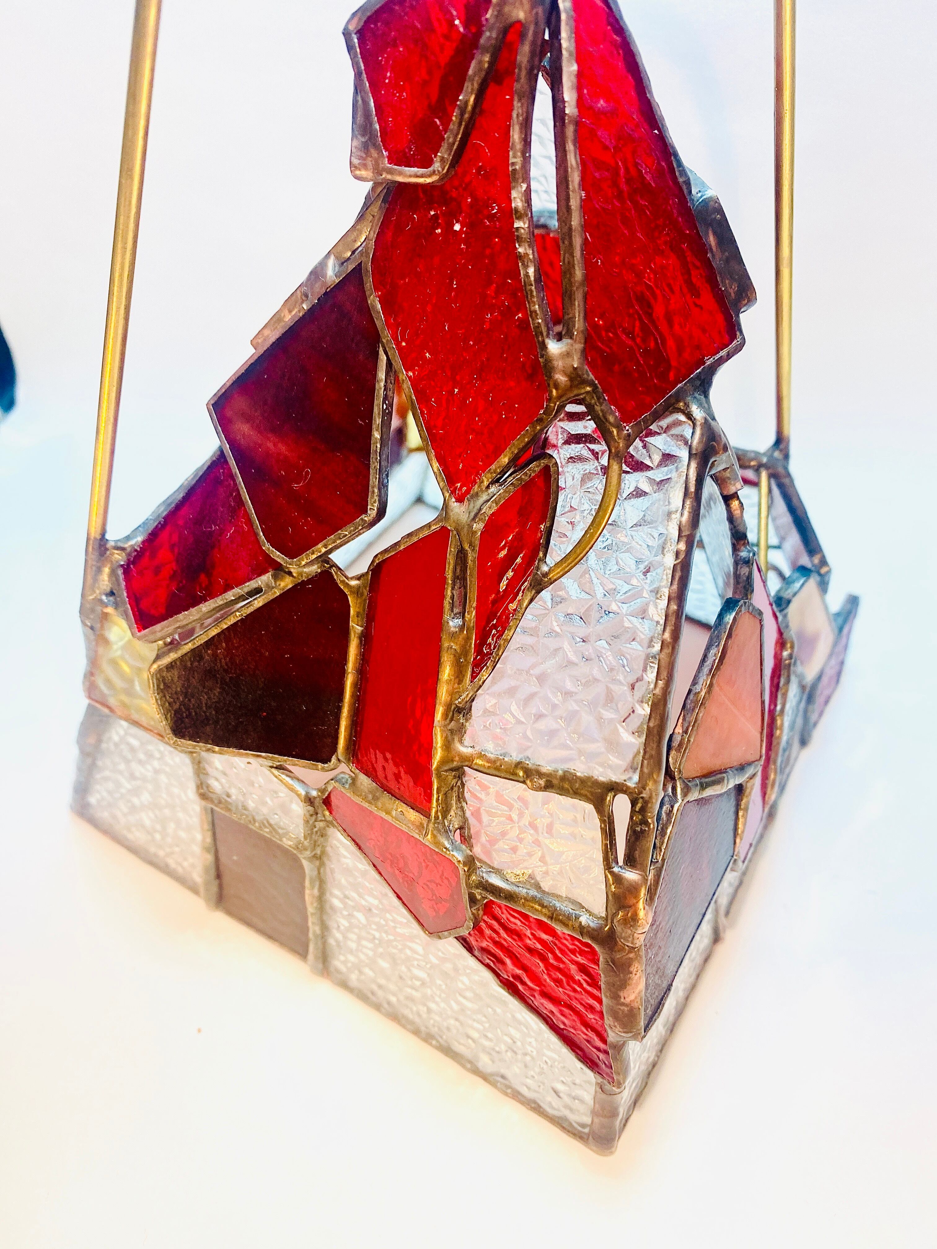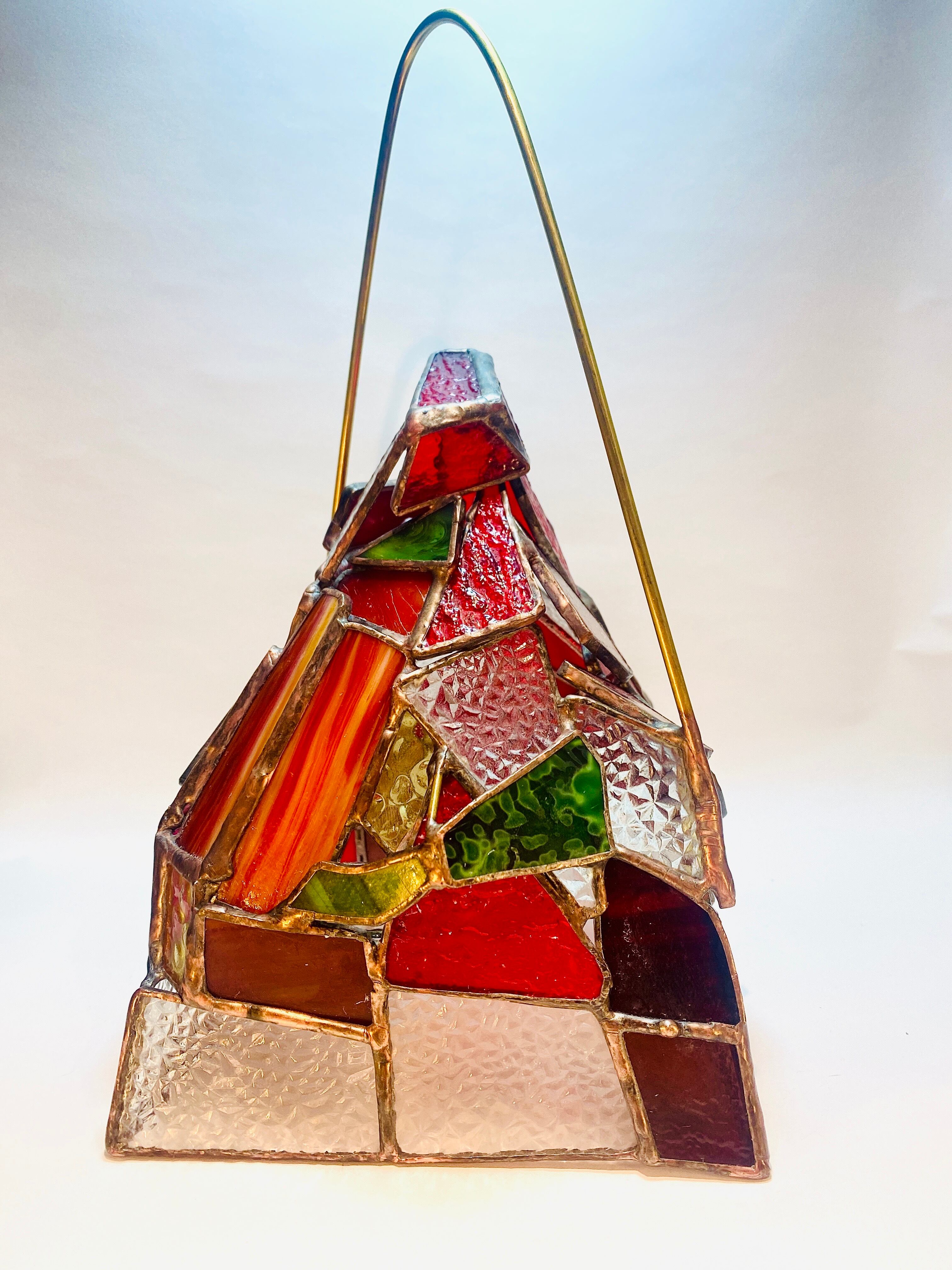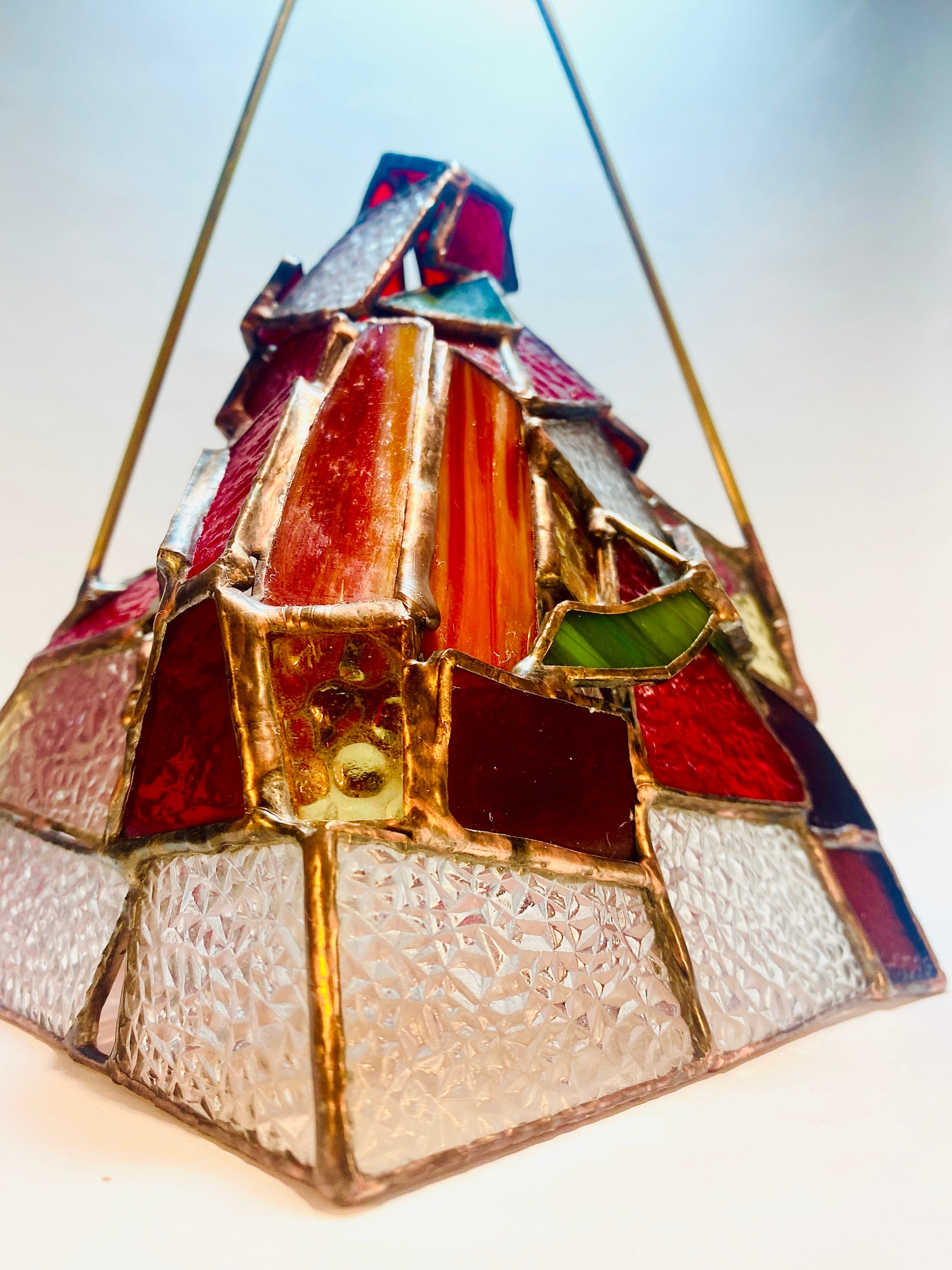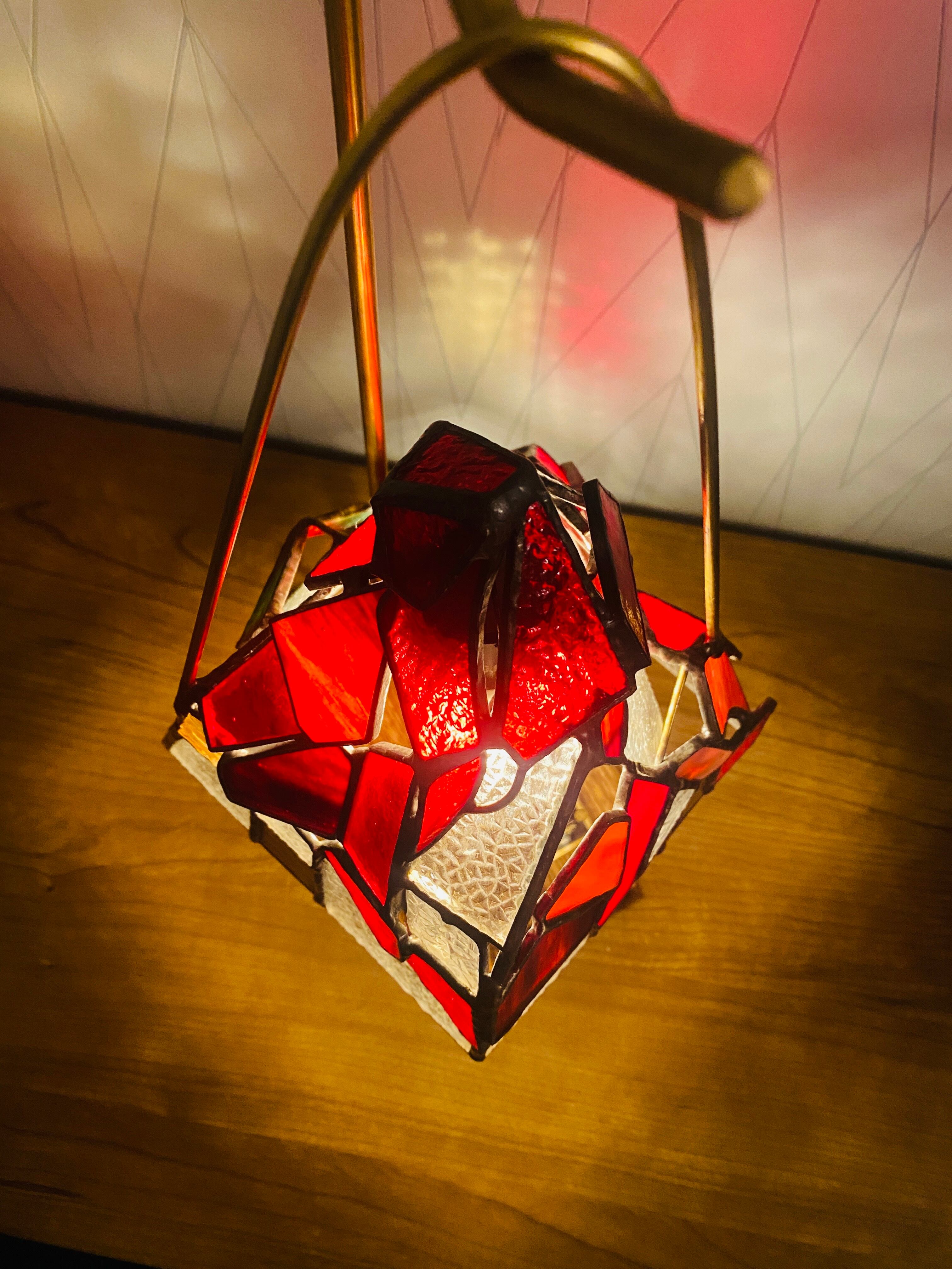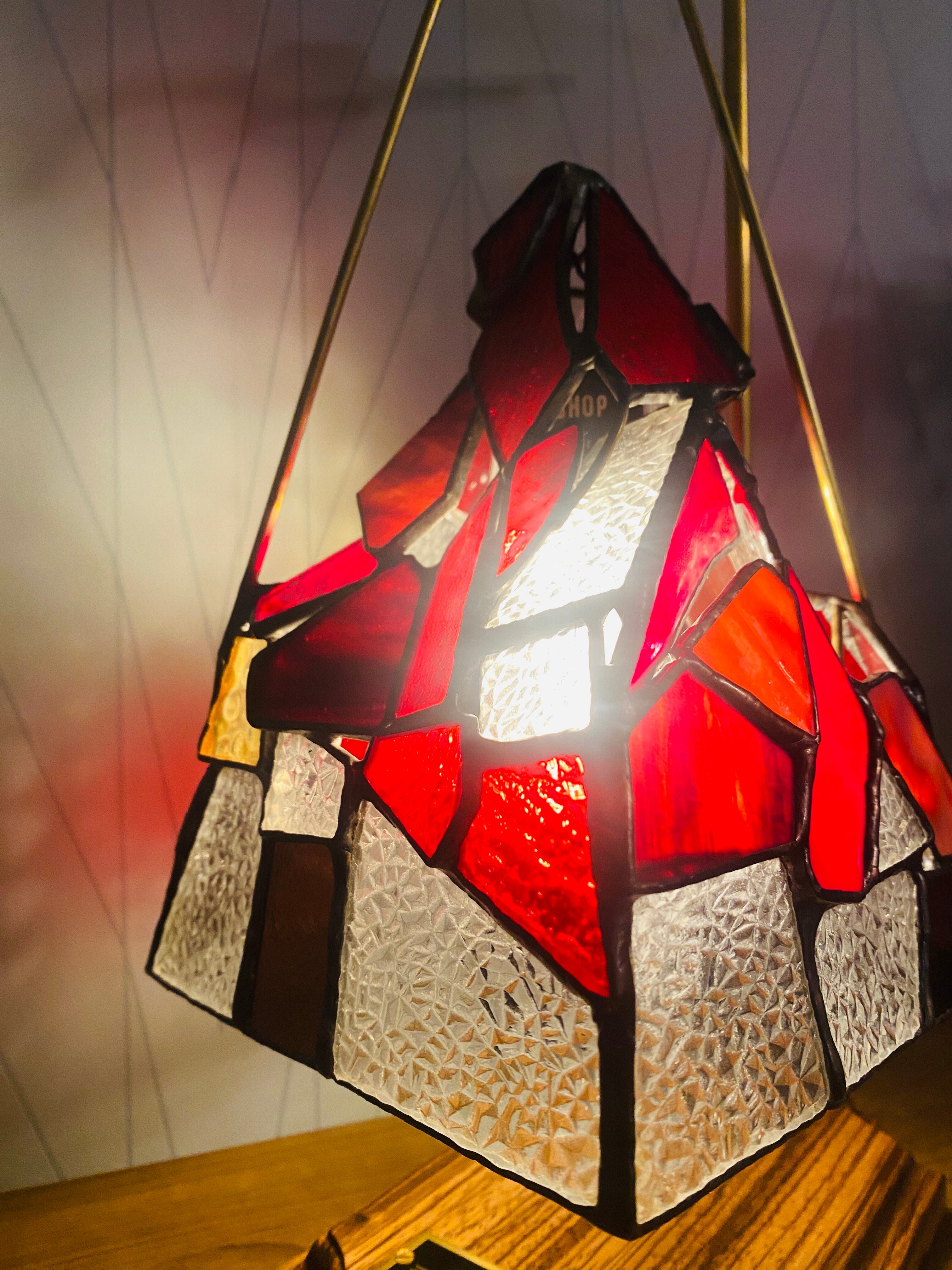 昭和の時代を思い出す、当時の一般的な家庭でよくみた型板ガラス”ダイヤ”を使用した、ステンドグラスのランタンシェードです。