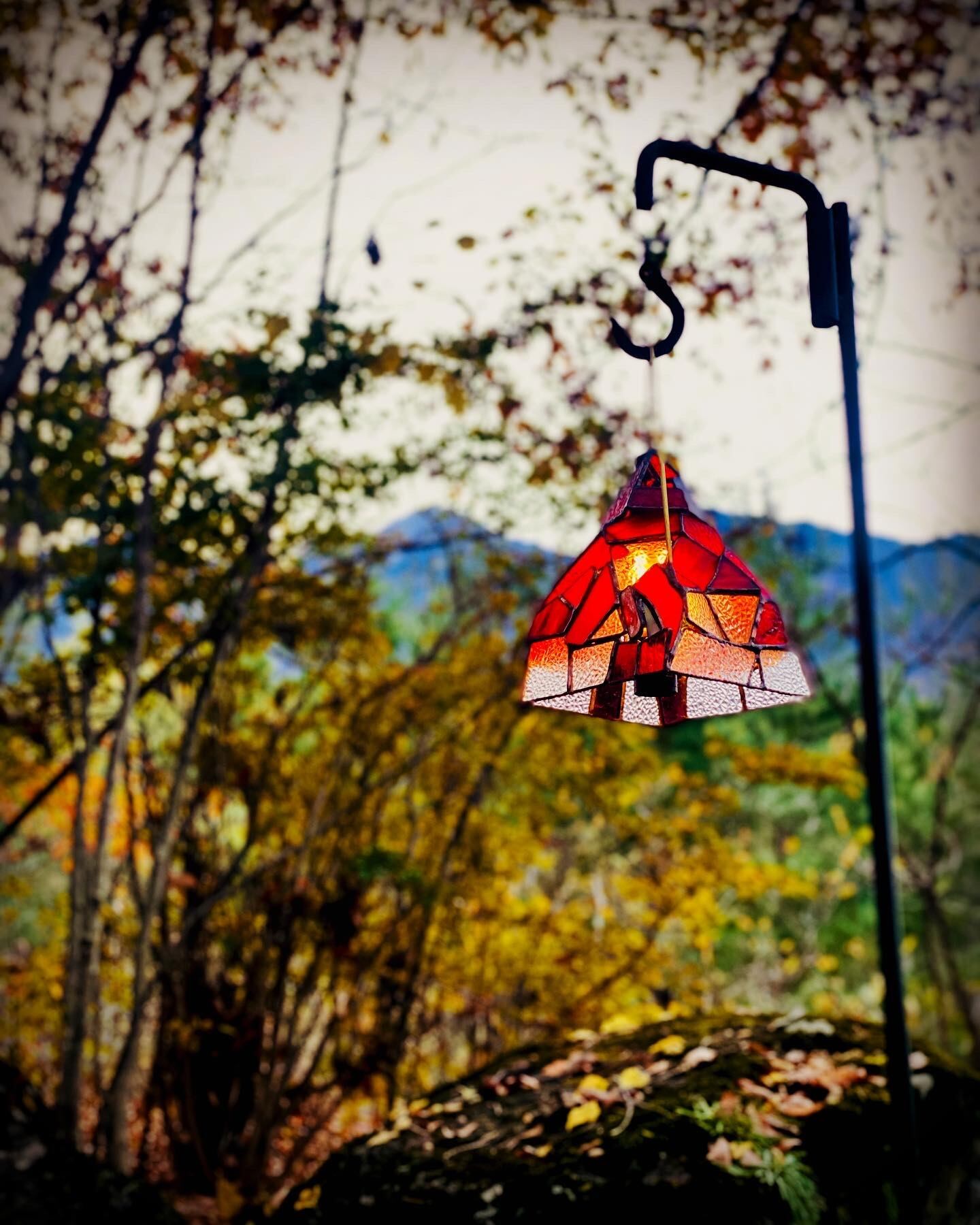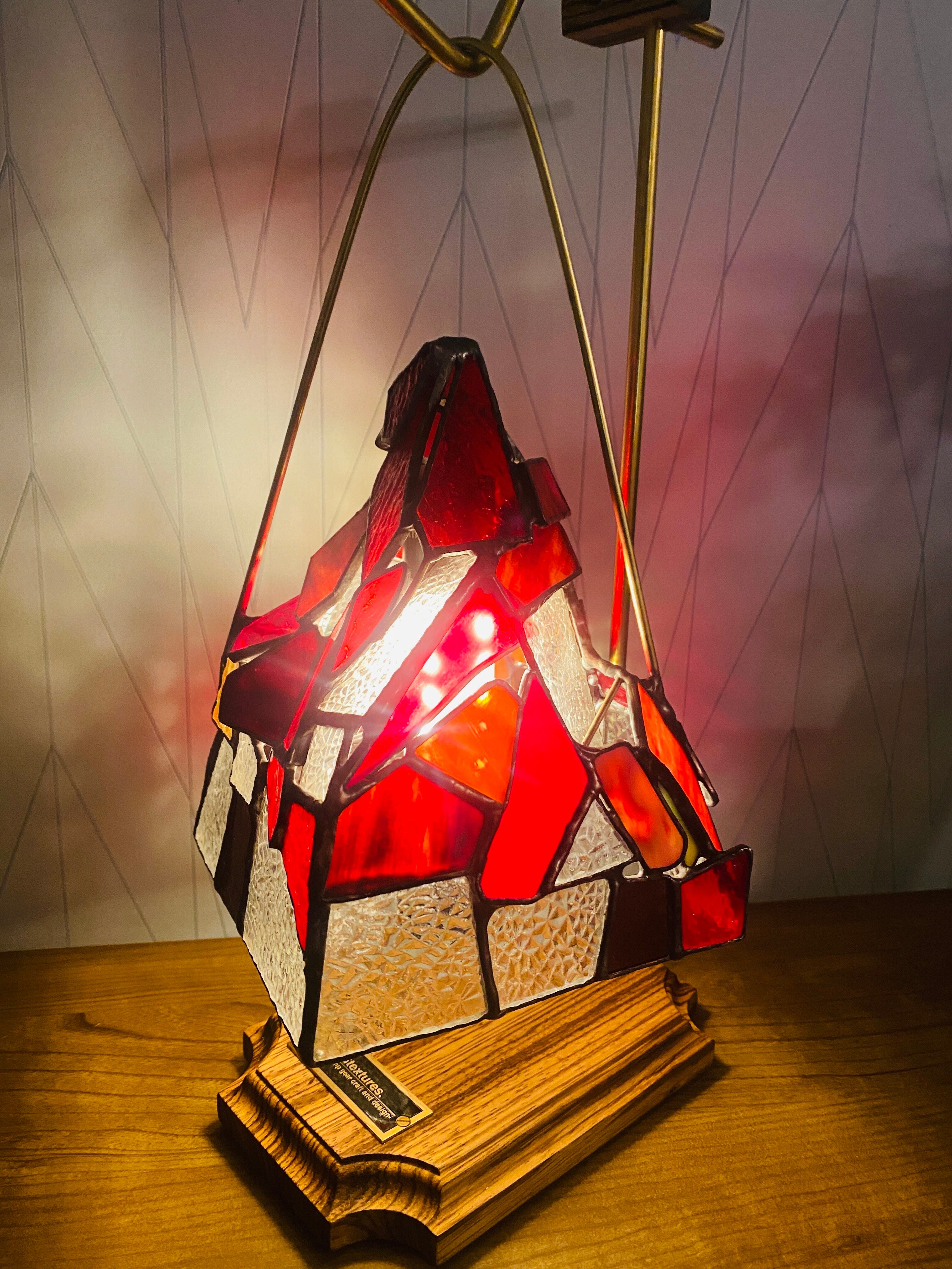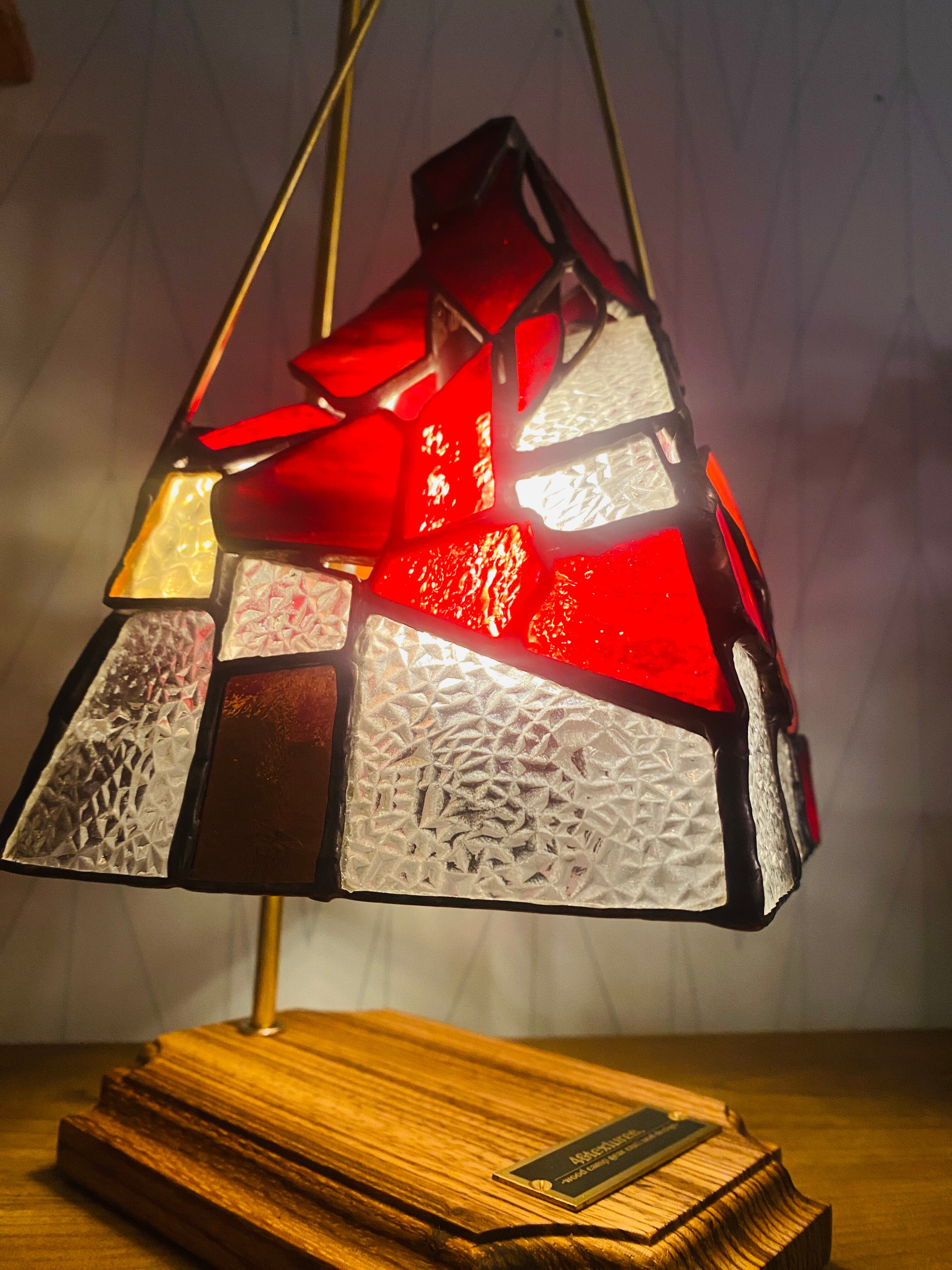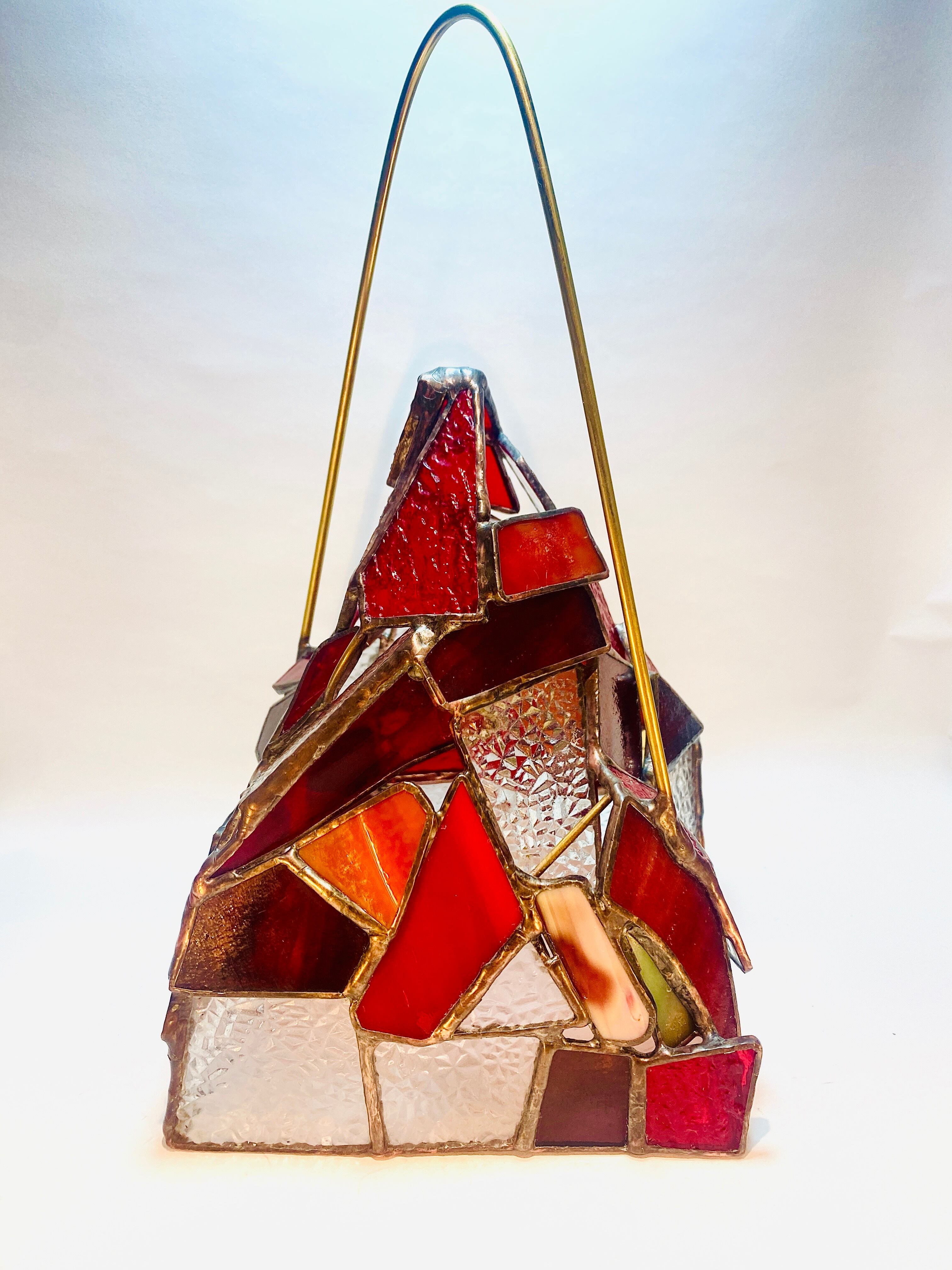シェードの形は、以前製作した”翳りゆく岳”のようにイメージして作りました。型板ガラス"ダイヤ"の演出が後押しし、冬の鮮やかで儚い沈む直前の朱色の夕日が、山全体にあたり妖艶にそそり立つ雰囲気が出ました。”翳りゆく岳”で表現したものとは完全に真反対で、”山”の堂々たる姿はやっぱり美しく勇ましい。赤はあまりにも鮮やかで強く、魅力的な色です。太陽の力を借りて透かして楽しむ時間も素敵だと思います。また夜はライトを入れ、潔く赤く灯るガラスをゆったりとした時間の中でお楽しみいただけたらと、作者は思います。