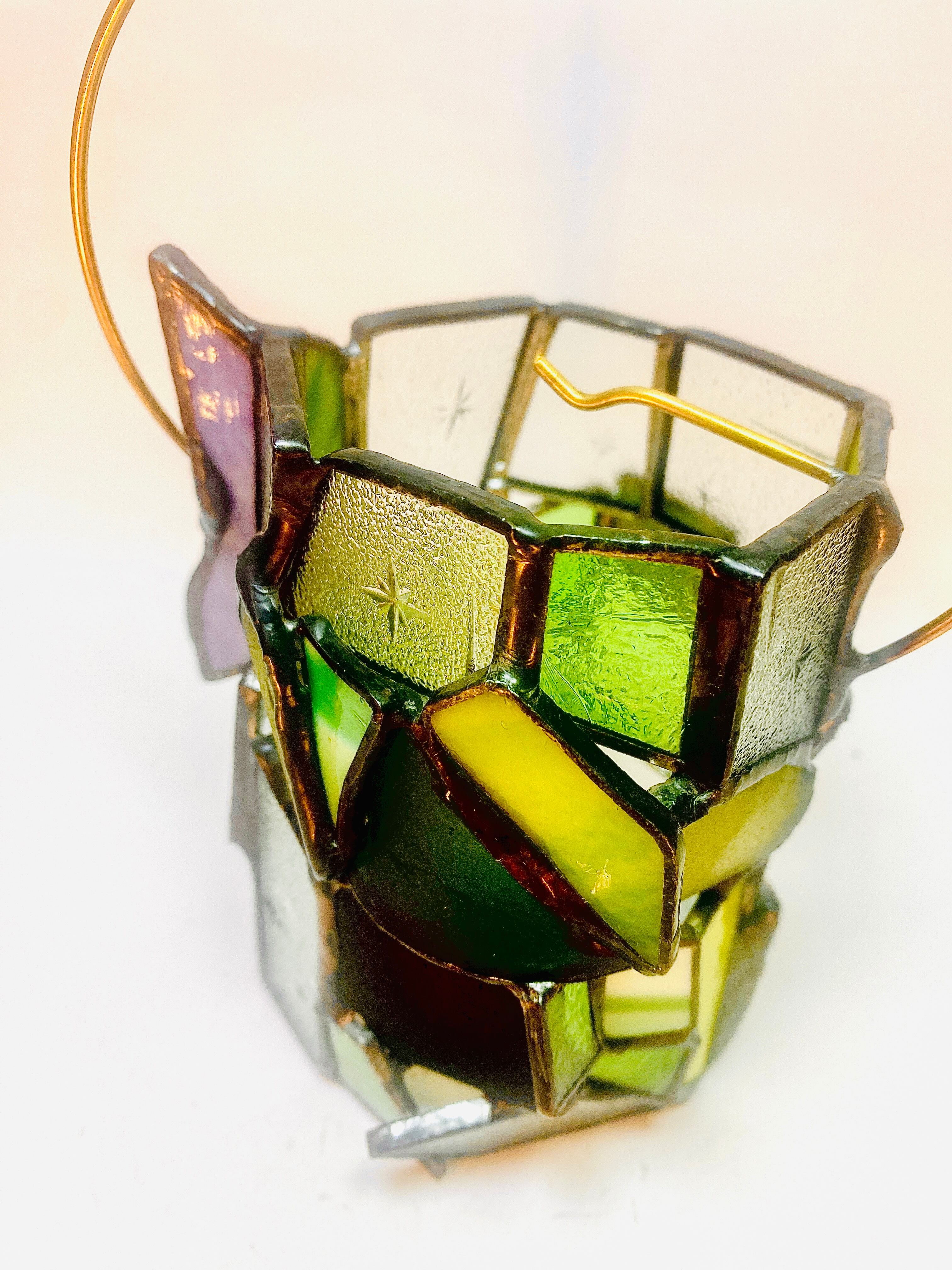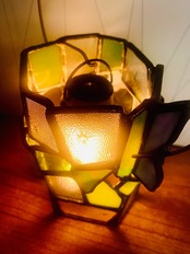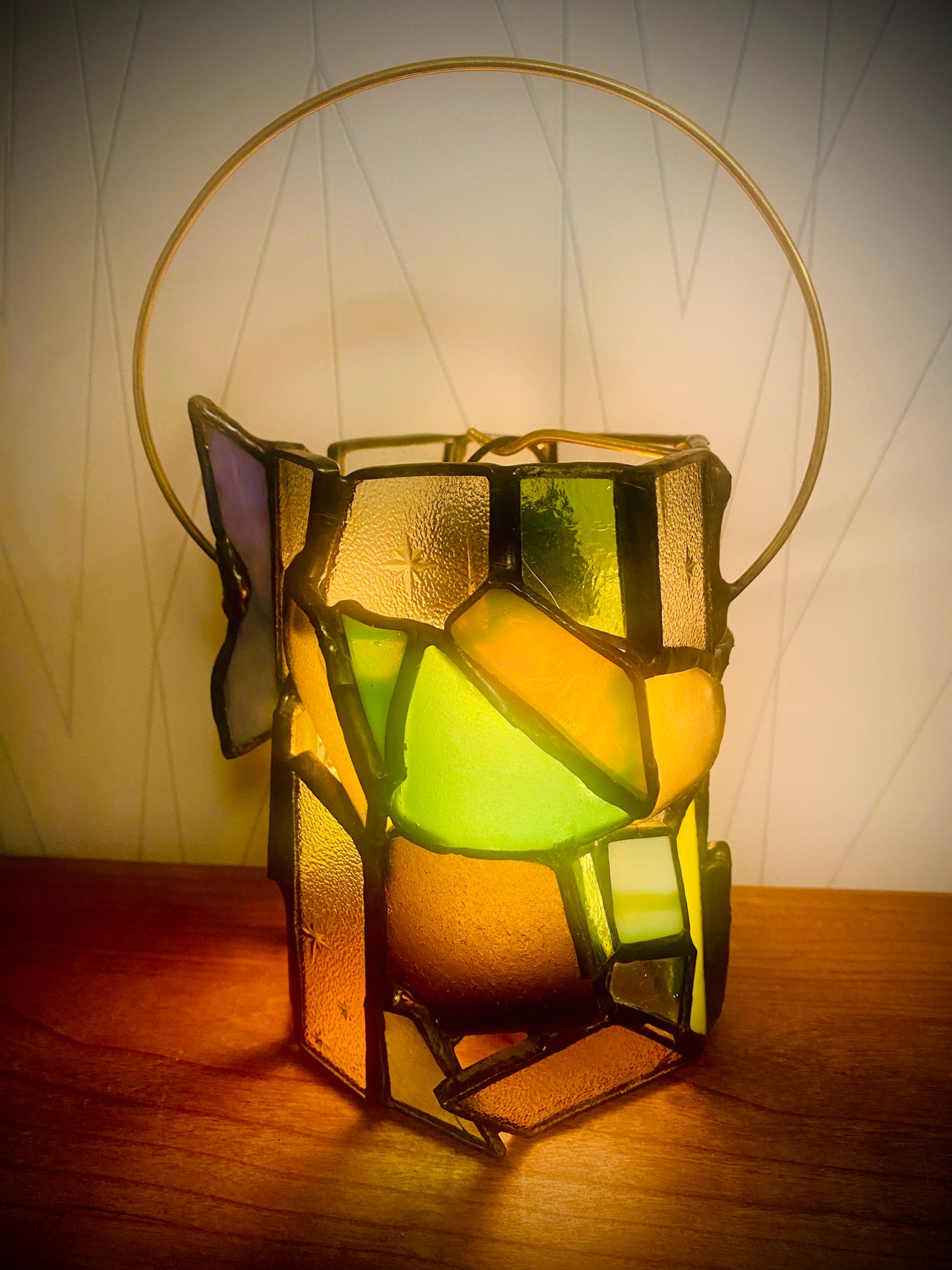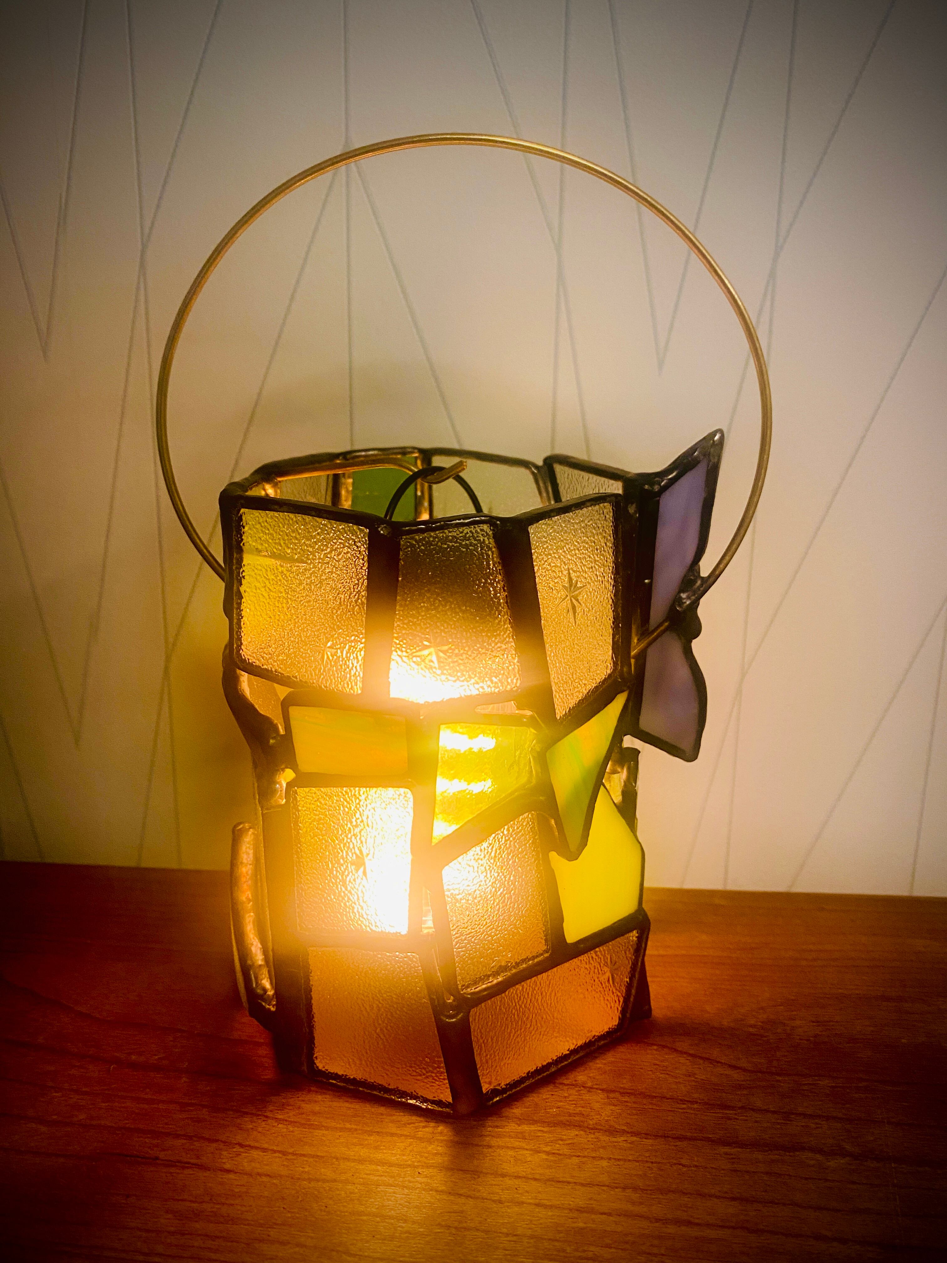これは作者しかわからないことですが、今回のこの作品は今までやったことがない組み立て方をしました。筒状のこのシェードは下部分と上部分は別々に作り、平らな部分を外側にして合体させました。真鍮のハンドルをつけてしまったのでもう意味はないのですが、このハンドルがないと、上下逆さまにしても立たせることができます。ただそれだけです。ハンドルの丸みは、エルフの後ろに光輪が浮かぶ様を表現しました。あとは、行燈のように持ってもらいたかったので。ぜひ外に出かけ、行燈のようにして夜の道をほんのり灯しがら歩いてもらえたら楽しいと思います。