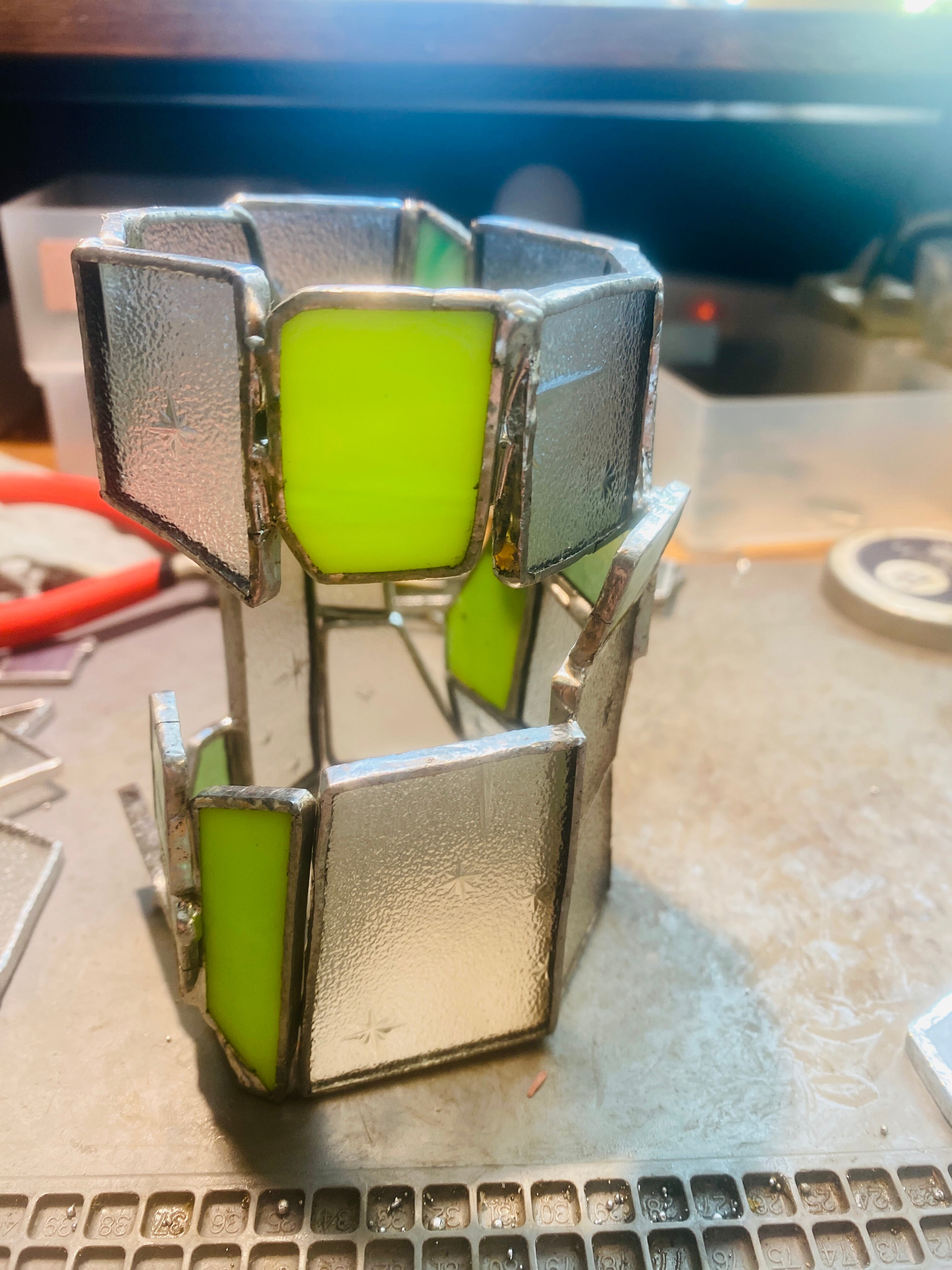 ハンダ部分は時間の経過と共に色が褪せてきます。艶出し・錆止めも含め、専用のポリワックス(jujo ステンドグラス仕上げ用ポリワックス)で定期的にメンテナンスをお願いいたします。