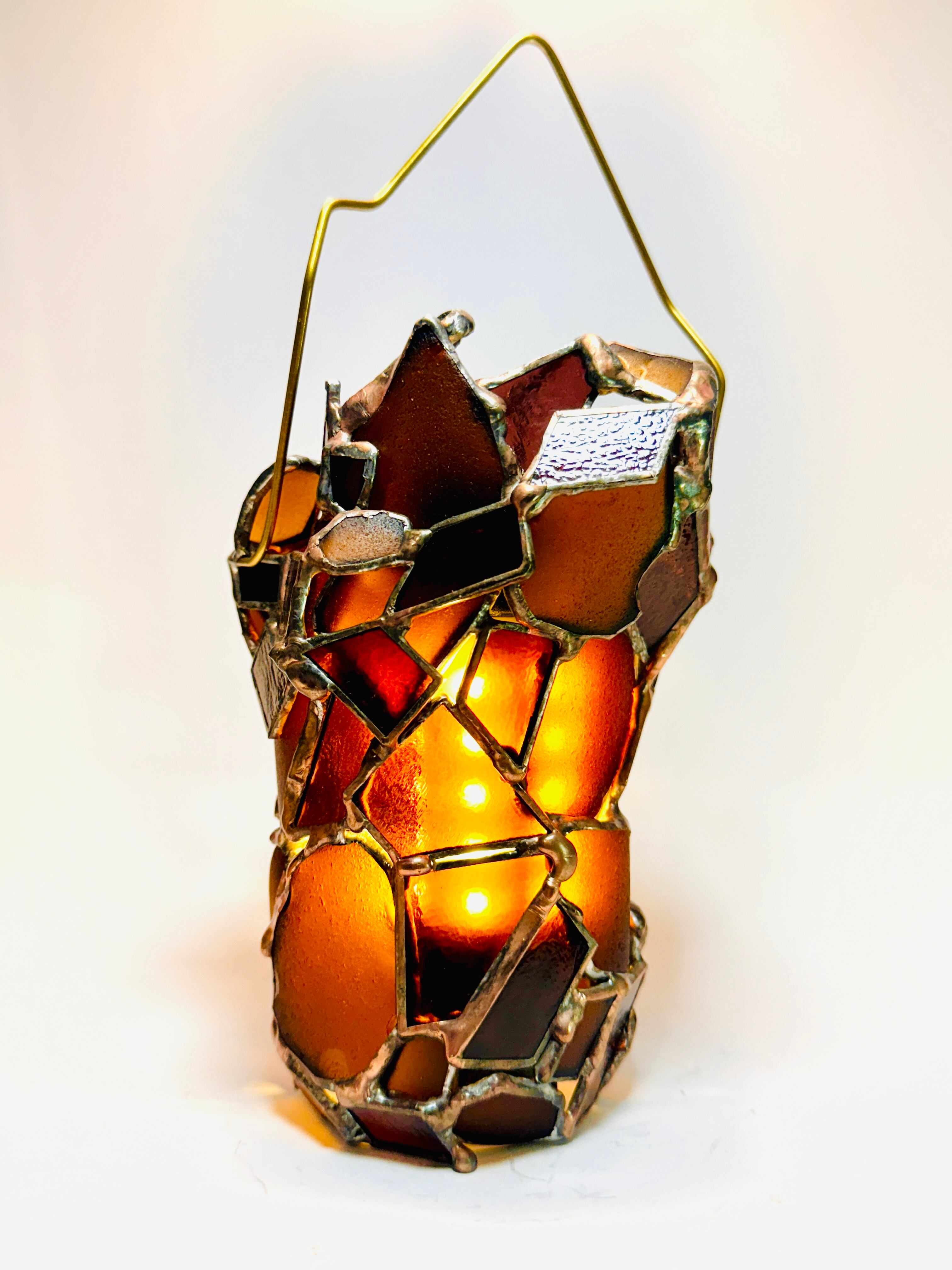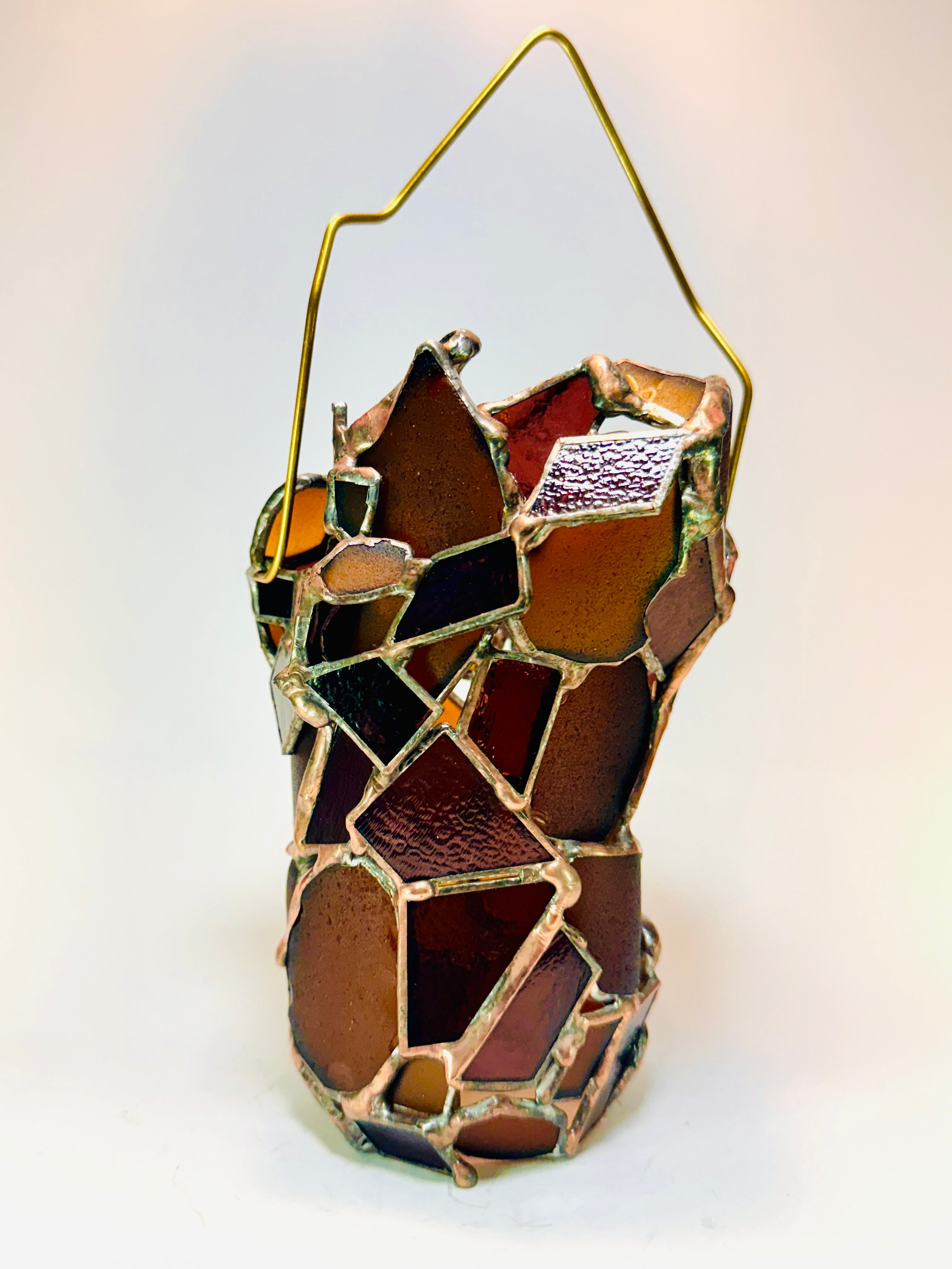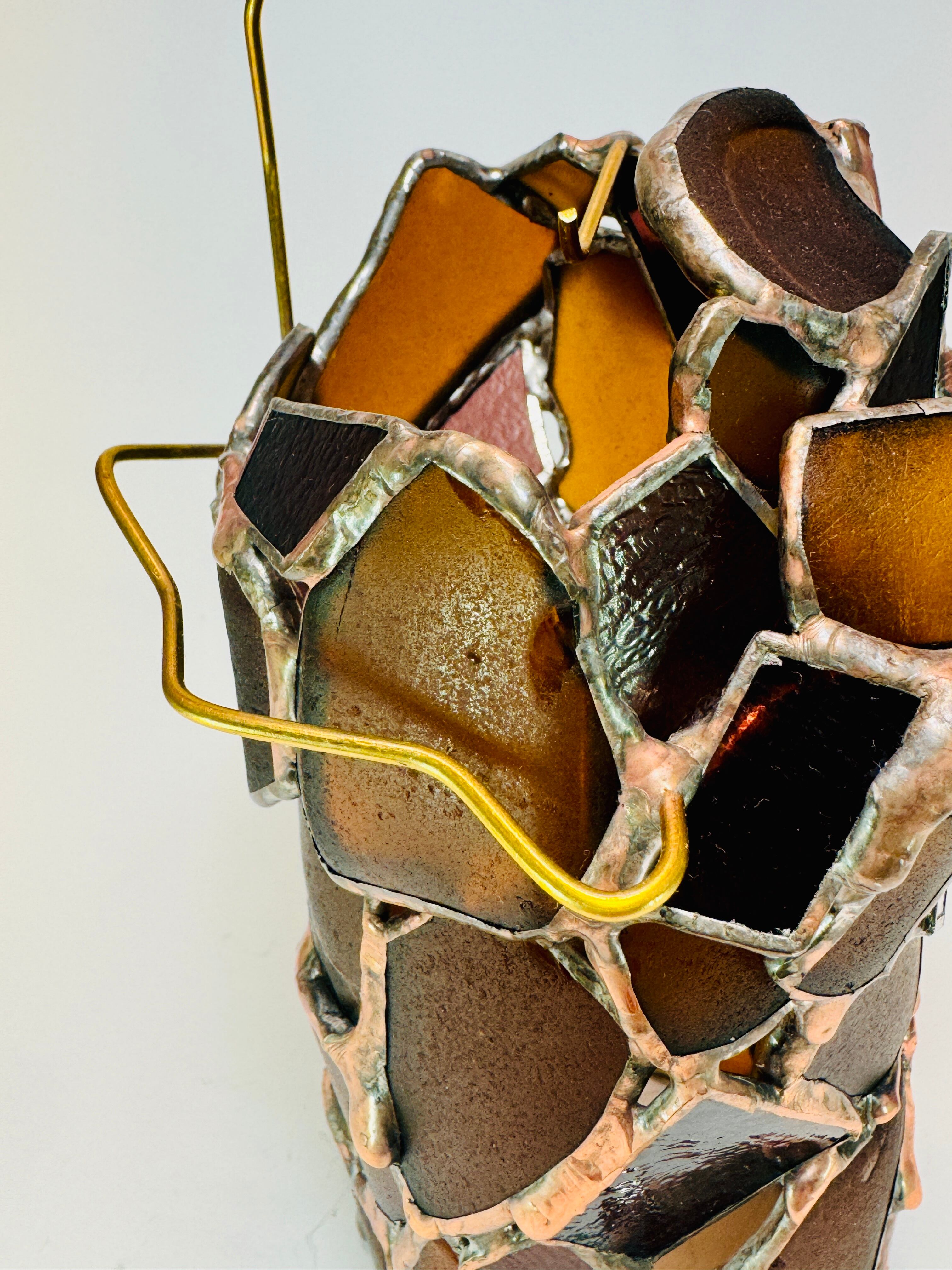 湾曲のあるシーグラスと、紫がかった板ガラスの直線が混ざり合った筒形で、ハンドル部分だけでなく、側面にもシルエットに合わせた真鍮針金を付けてあります。