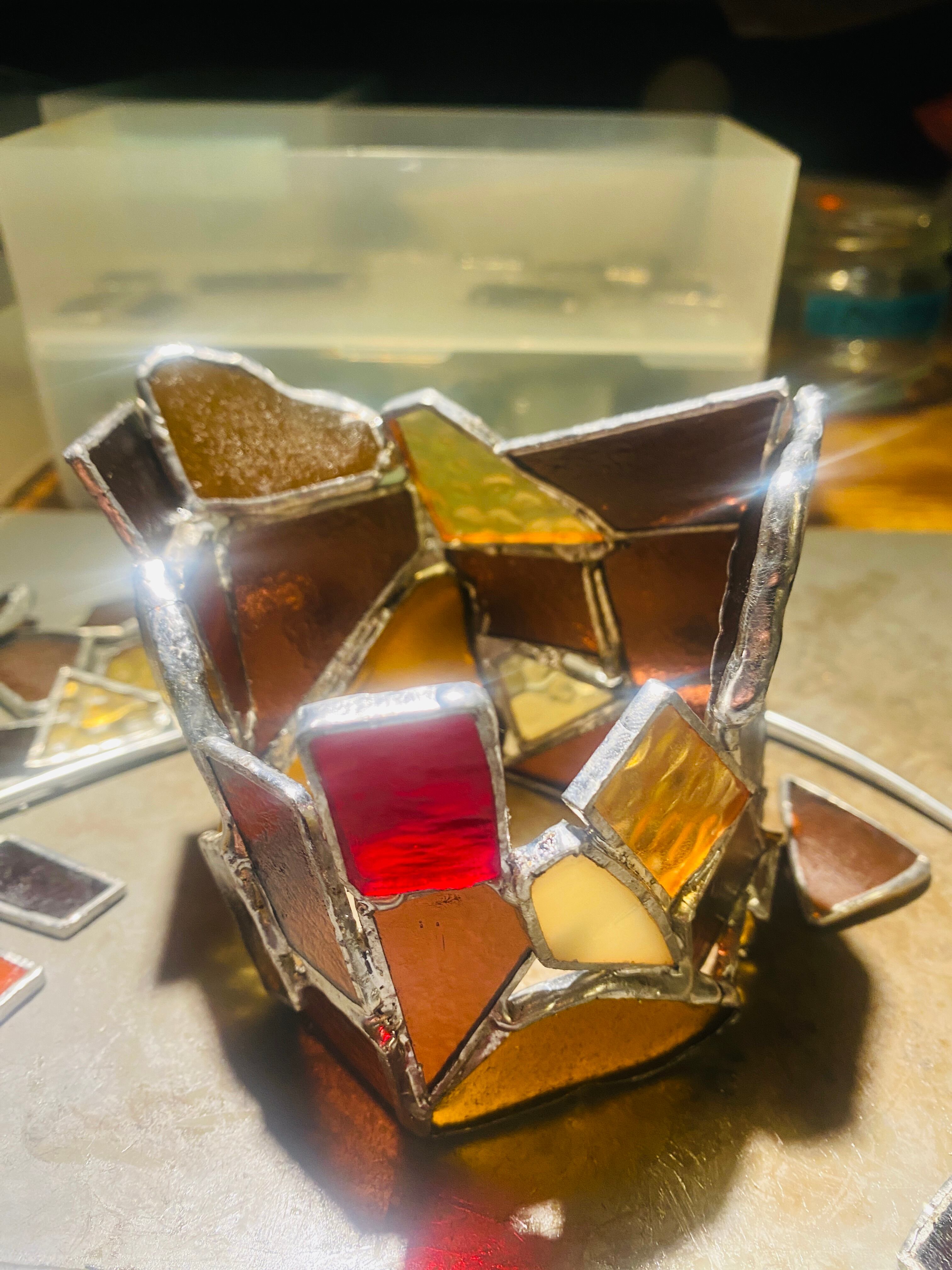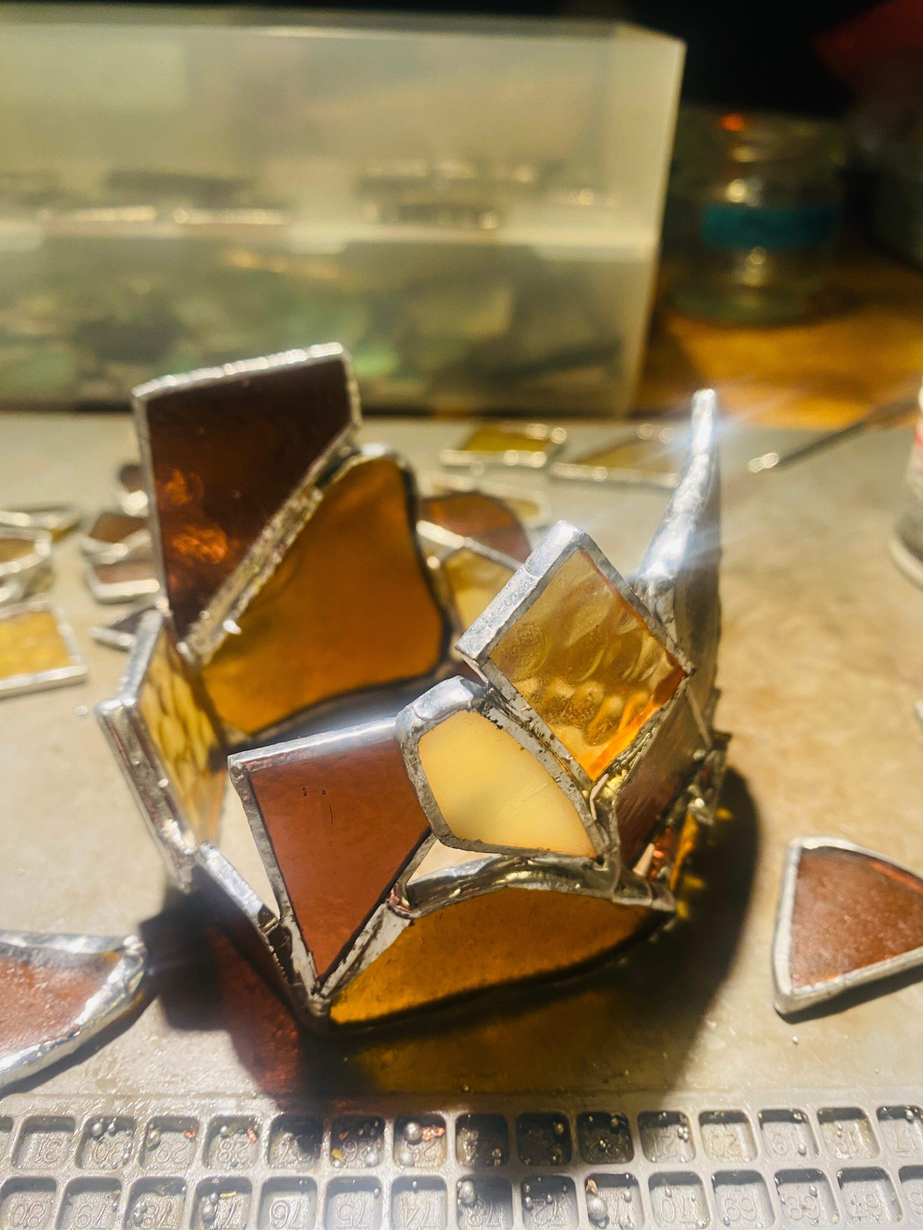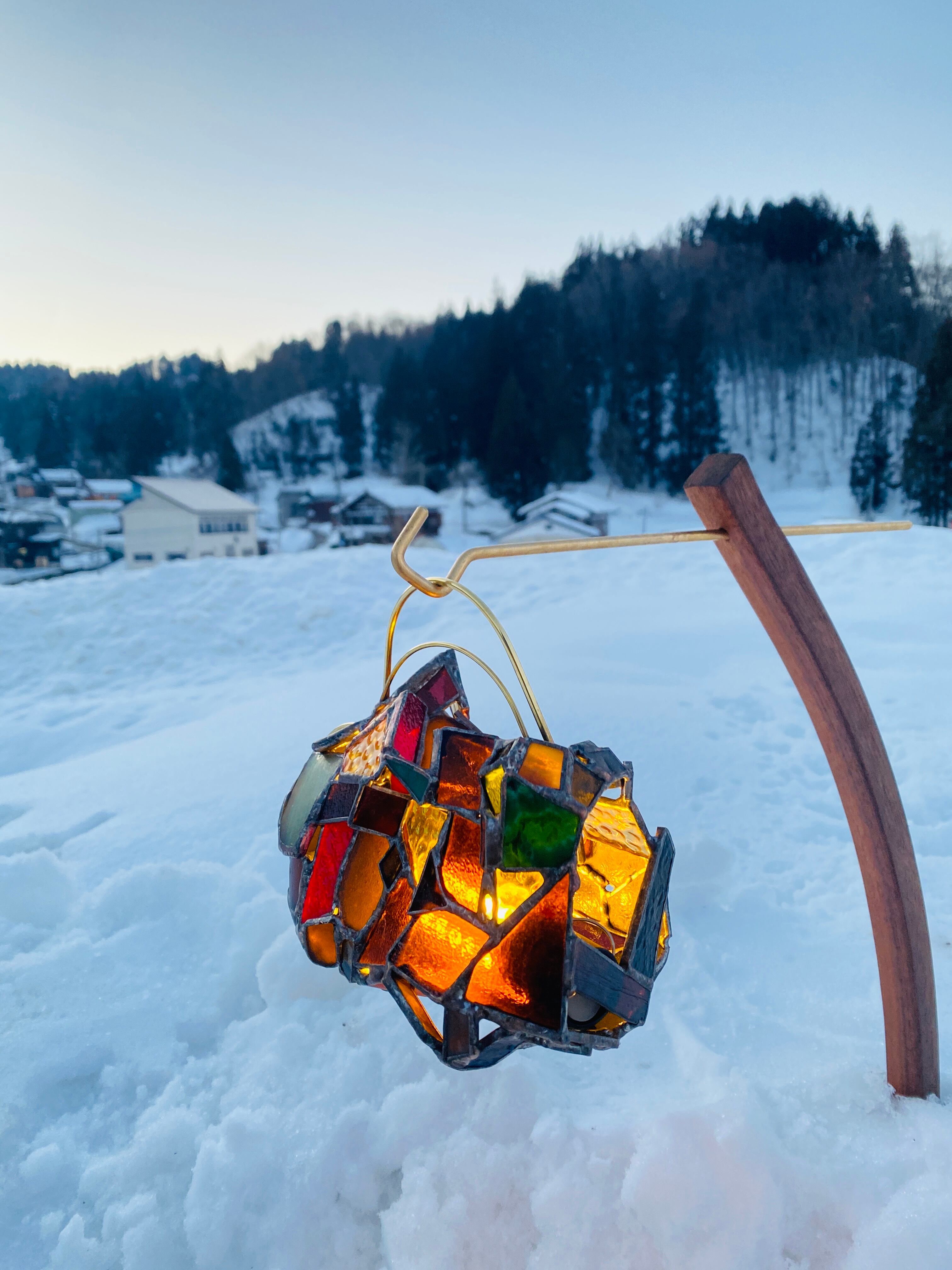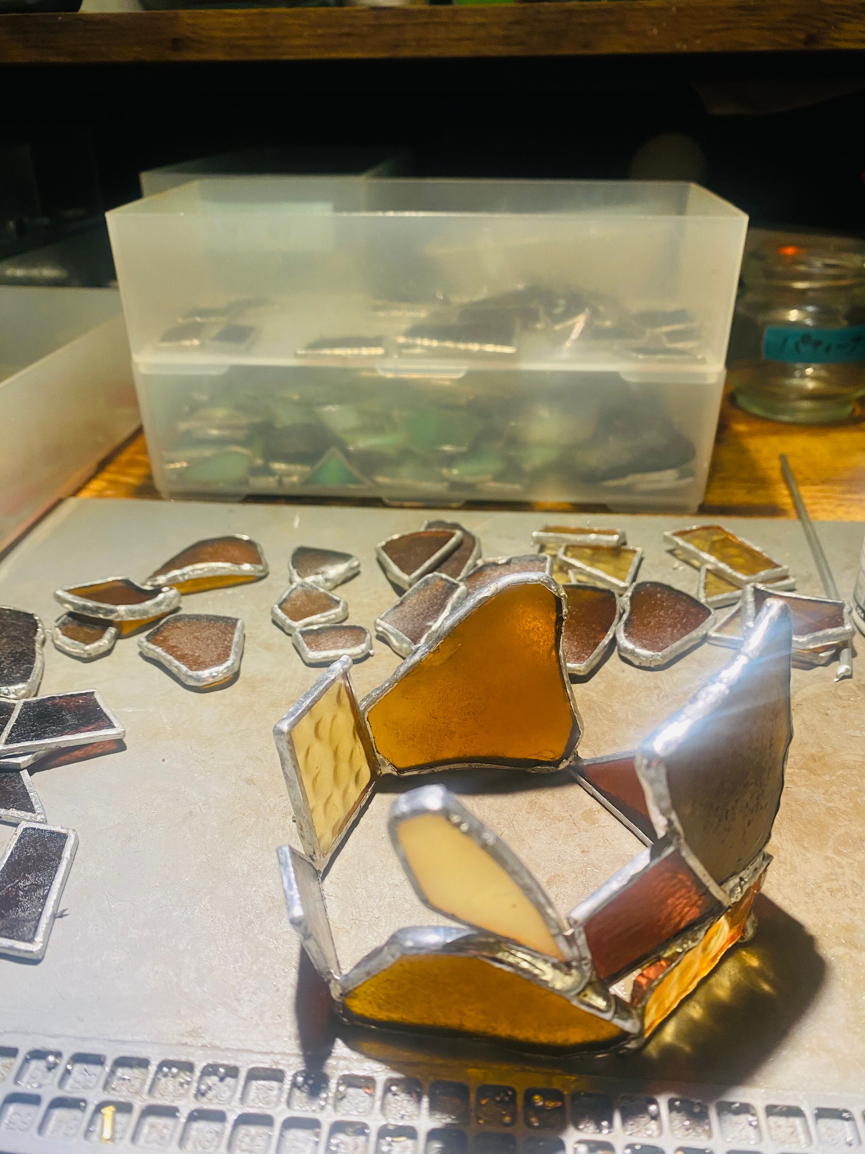 ガラスはアンバーのシーグラスの周りに、少し財宝チックなガラスを配置。なんとも色鮮やかかつどこかアンニュイな雰囲気なりました。