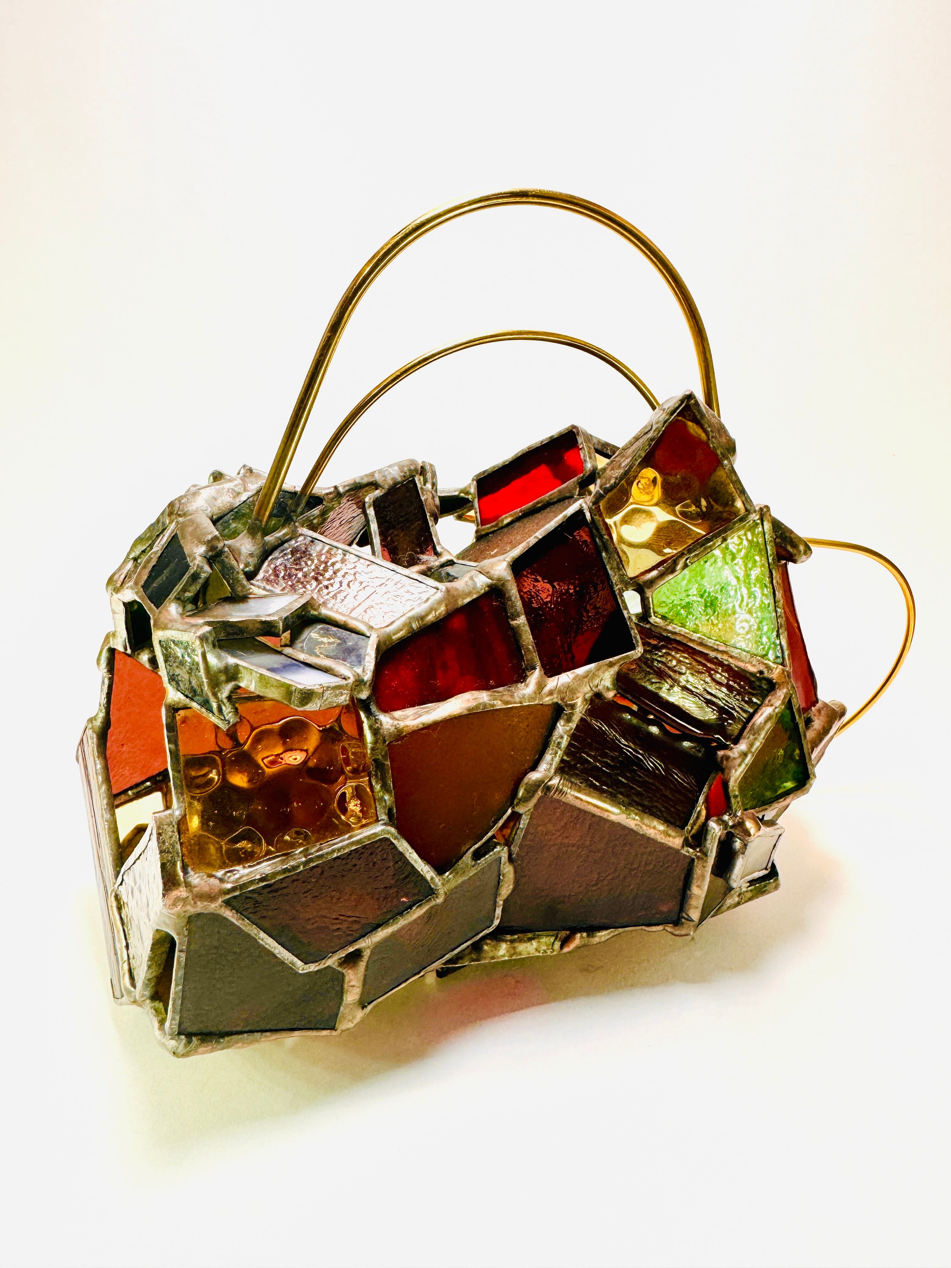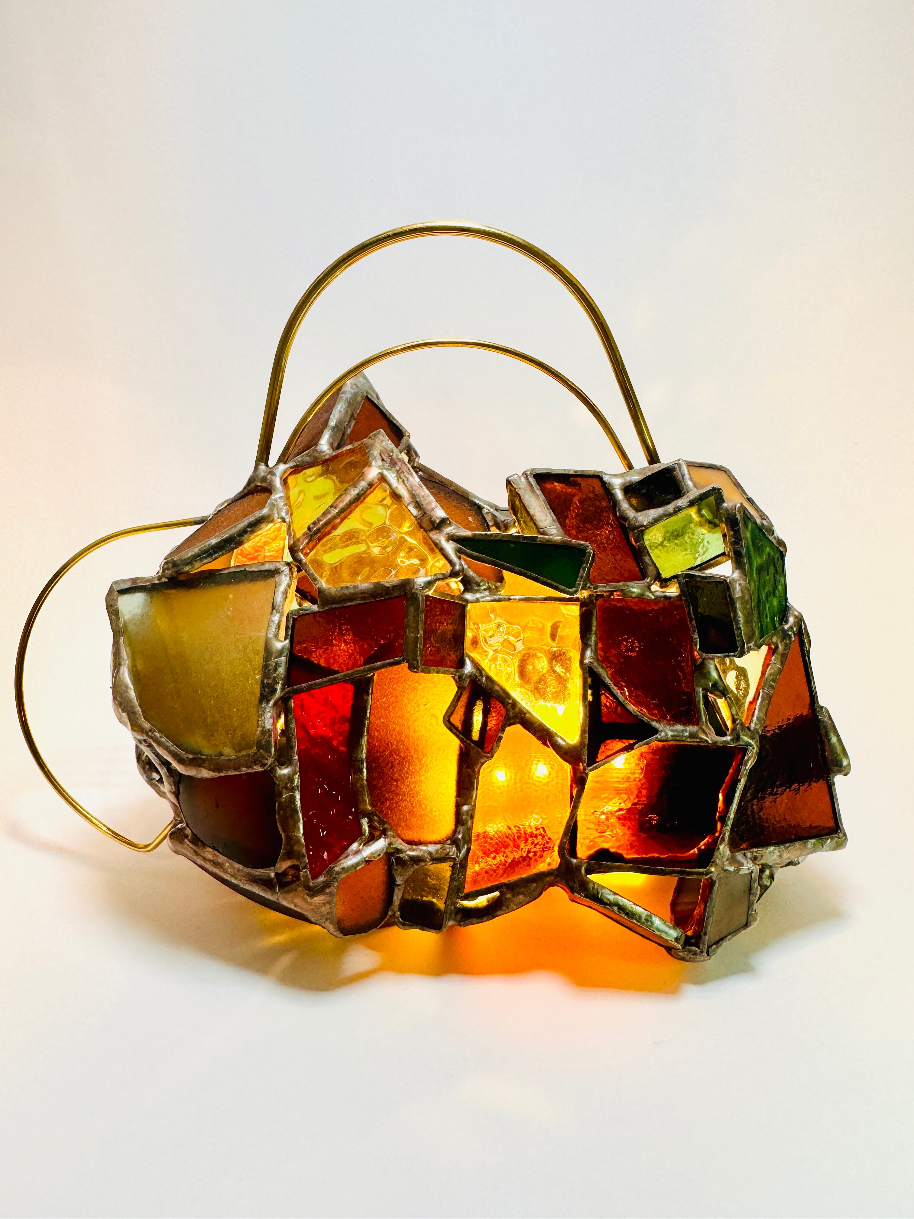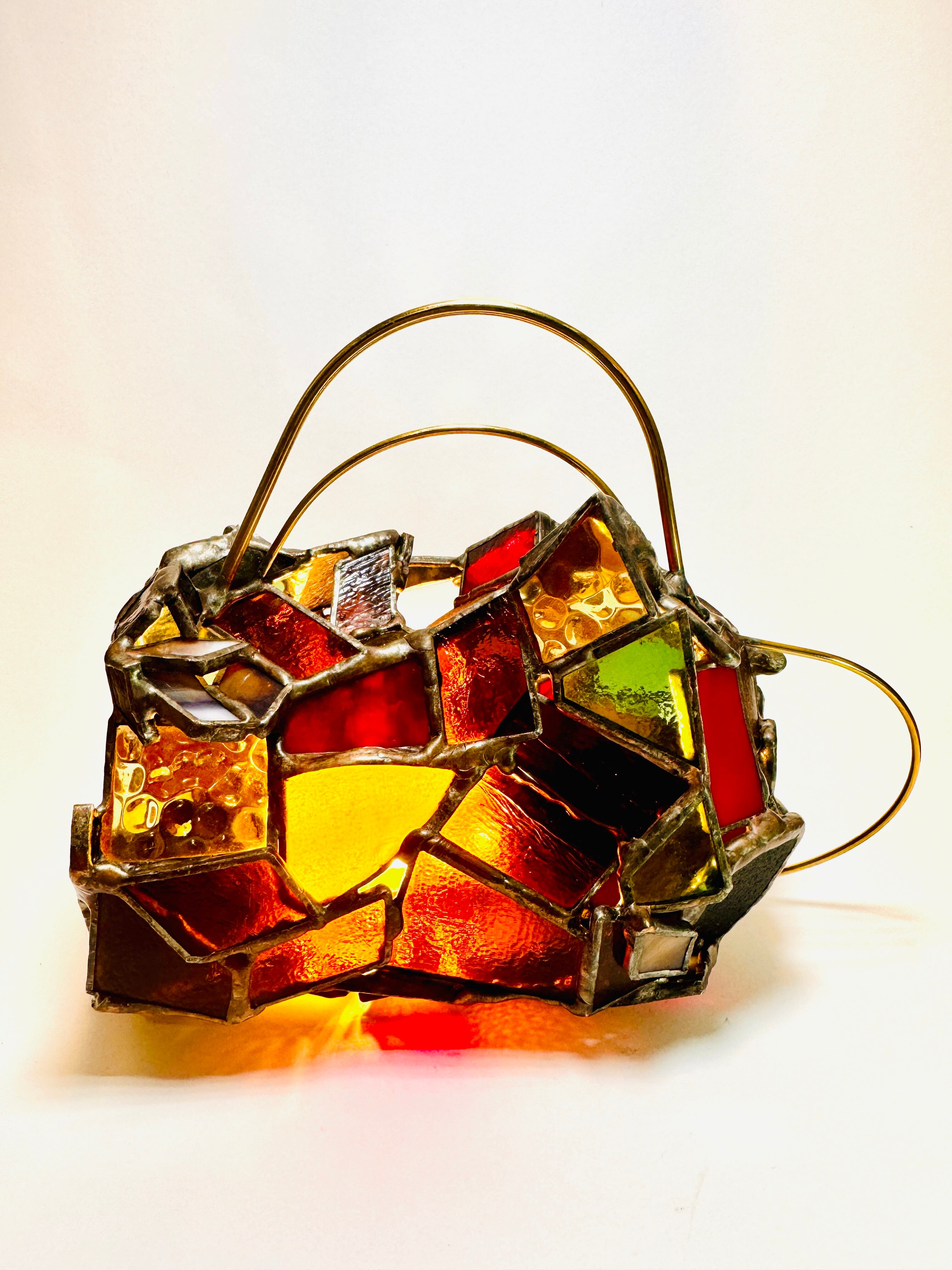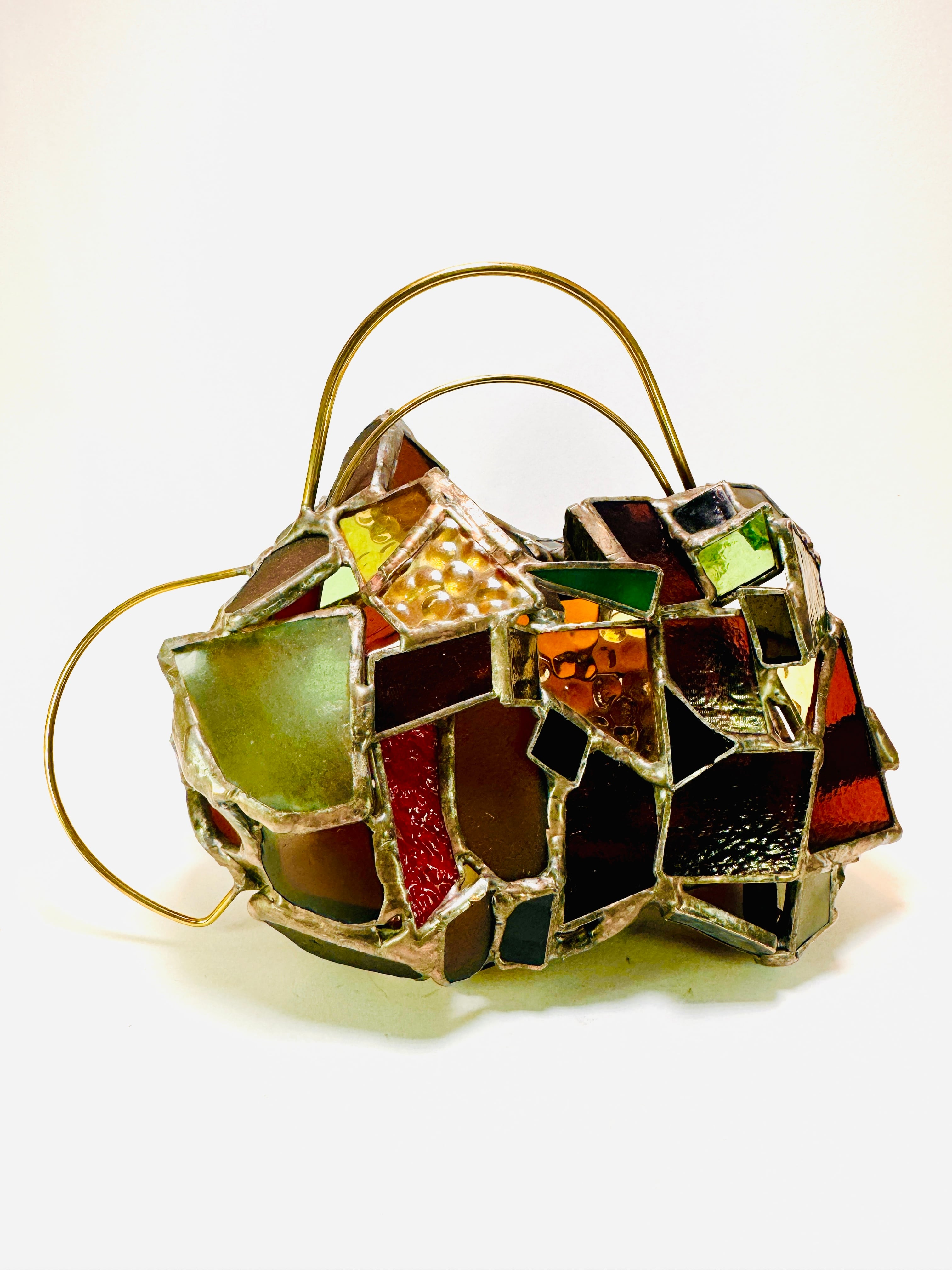 この作品は初め大失敗で完成しました。こんなことは初めてで、いつもなら途中で軌道修正するのですが、なぜか出来上がるまで「かっこいい作品になるぞ〜」と意気揚々でした。きっと私自身の内側の状態に左右されたんだと思います。出来上がったどうしようもない作品を眺め、今度は肩を落として意気消沈。いっそ木っ端微塵にしてしまおうかとも思いましたが、悪あがきできないかと、少しずつ修正を重ねるも、今ひとつ。ふと、見方を変えて横向きだとどうなるかなと90度傾けてみると・・・!。その後は一気にイメージが湧き、ハンドルもそれに見合った動きとにしました。レトロな街を優雅に闊歩する女性が手に持つハンドバッグのような雰囲気に。ただそれでは止まらず、さらに初めはダメだと思っていた縦型も楽しめるように、中のフックを追加し、縦でも横でも楽しめる初めてのスタイルのシェードとなりました。