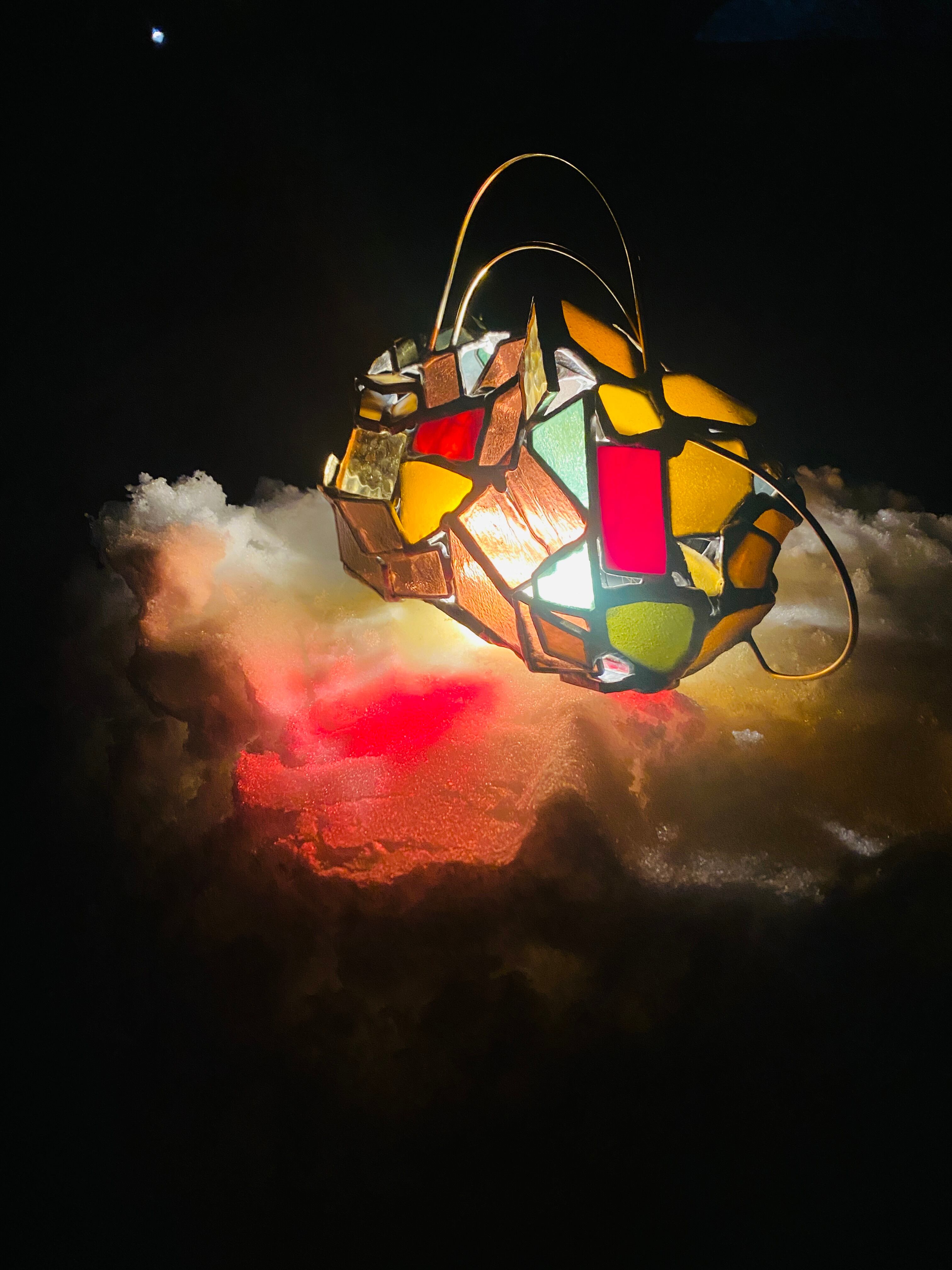 ハンドバッグのイメージはありつつも、横向きにした時に深海を進む財宝を積んだ潜水艦に見えました。また、今回の製作の経緯で私自身が何かしらの魔法にかけられていたような感覚もあった為、タイトルを”財宝in魔法の舟”にしました。ハンドバッグ的な名前も可愛かったけど(笑)