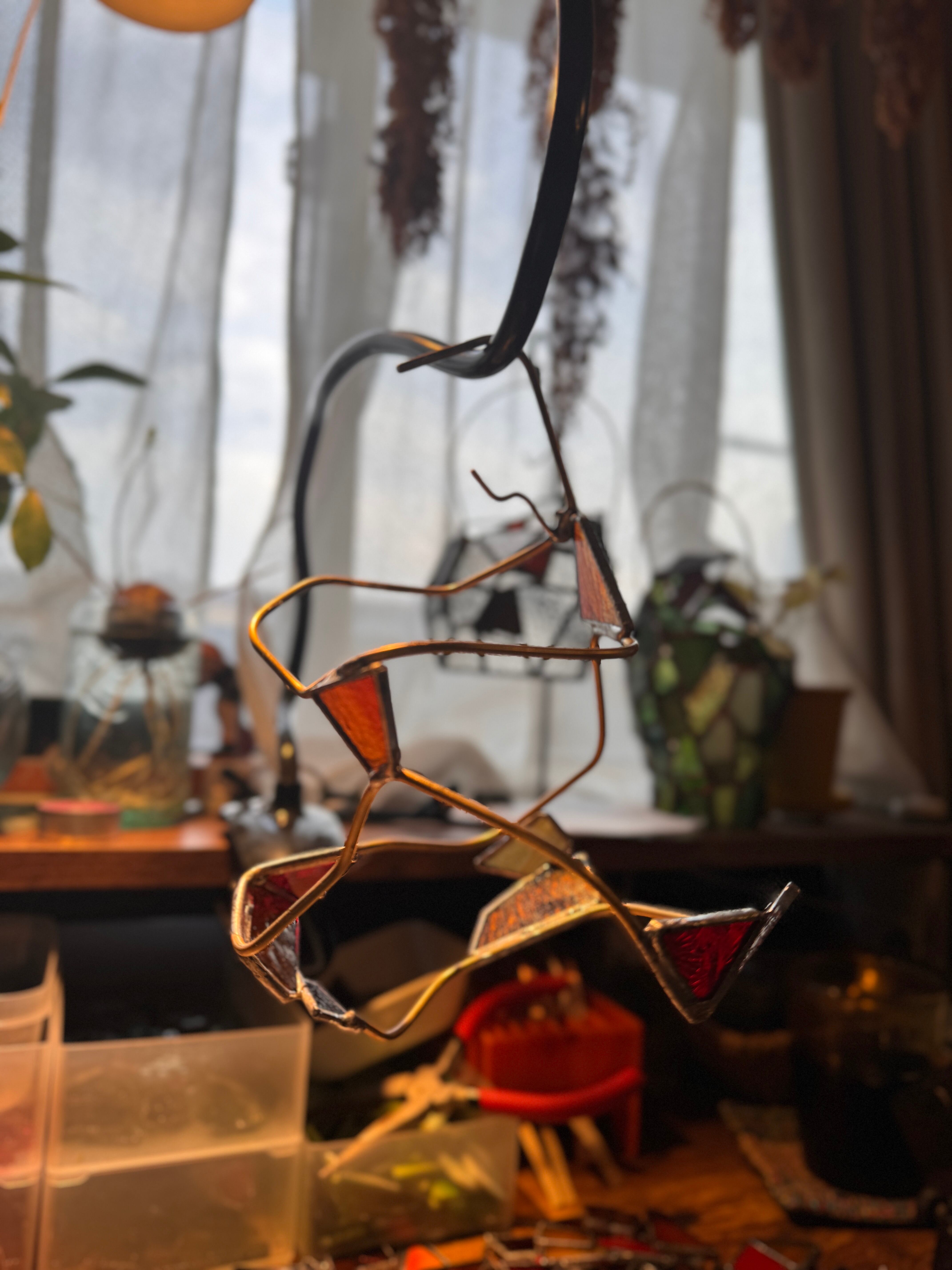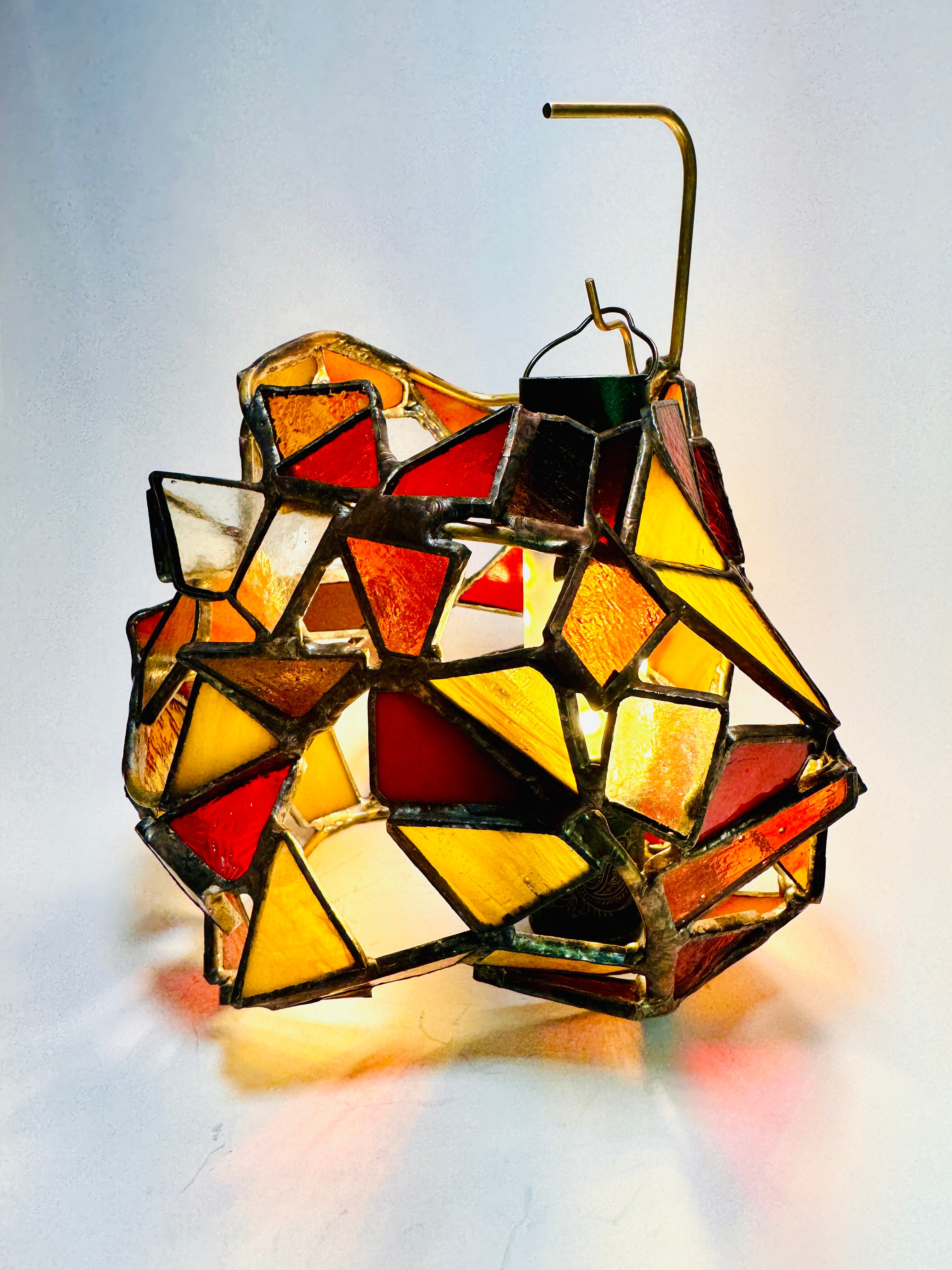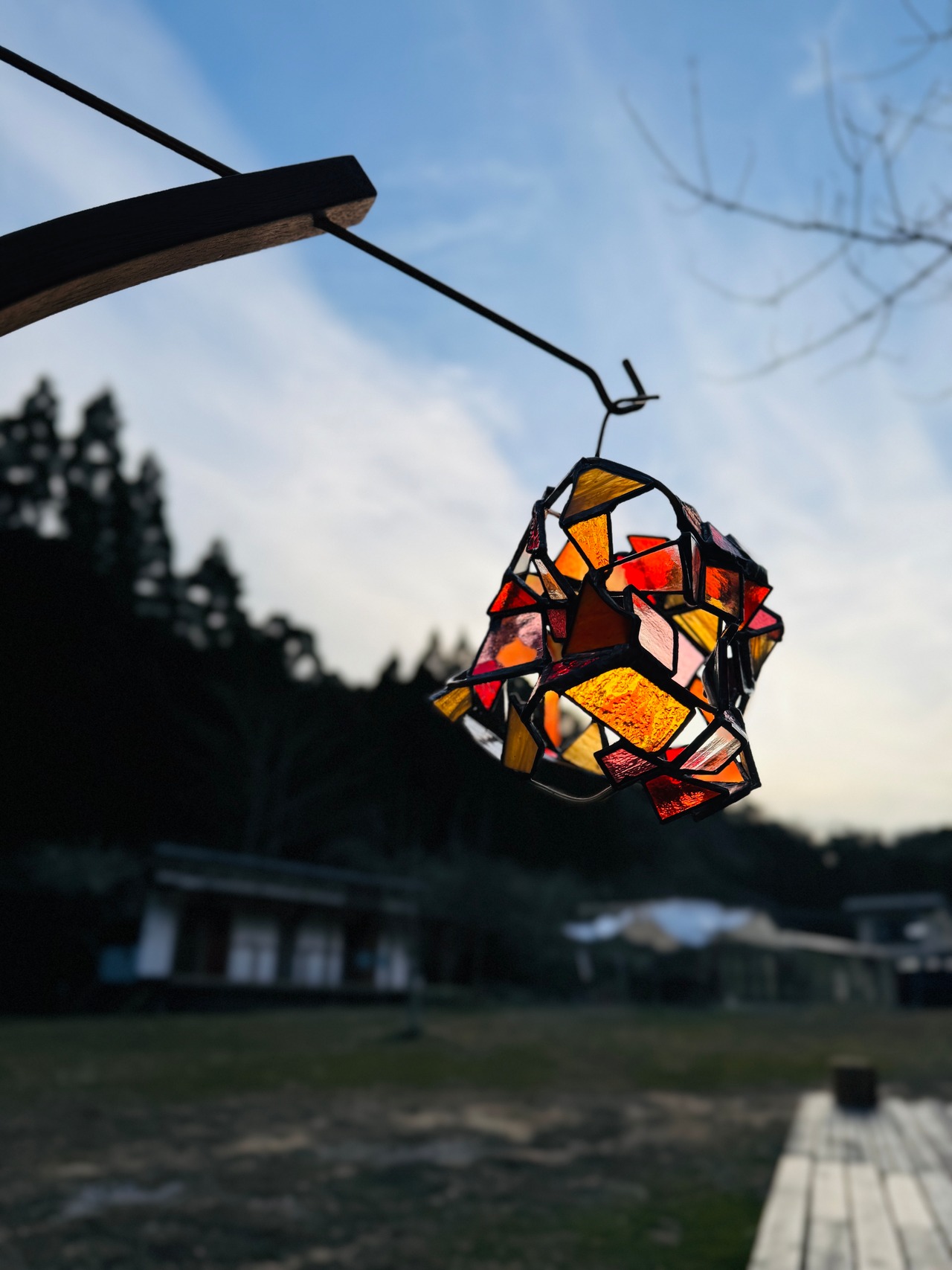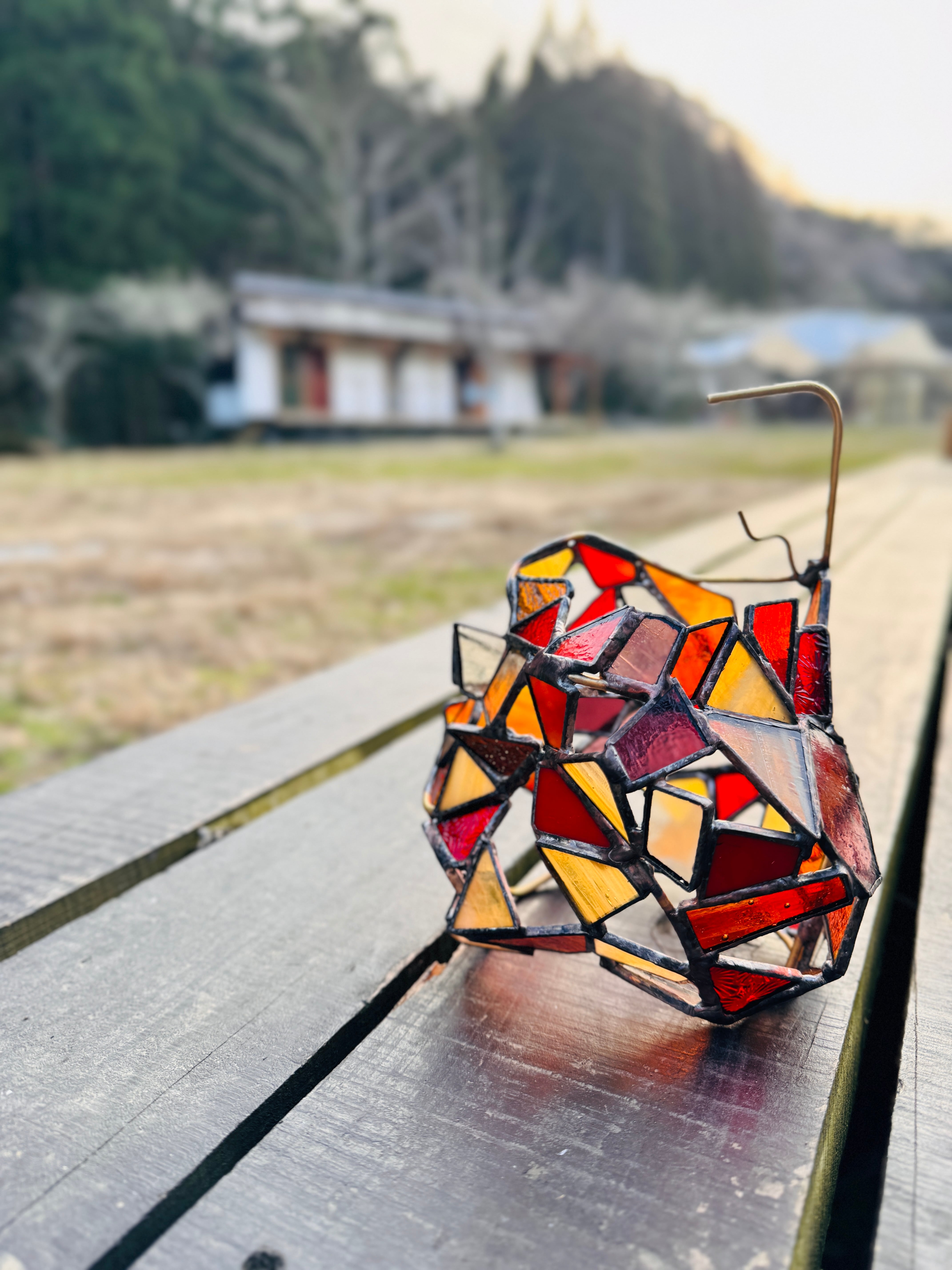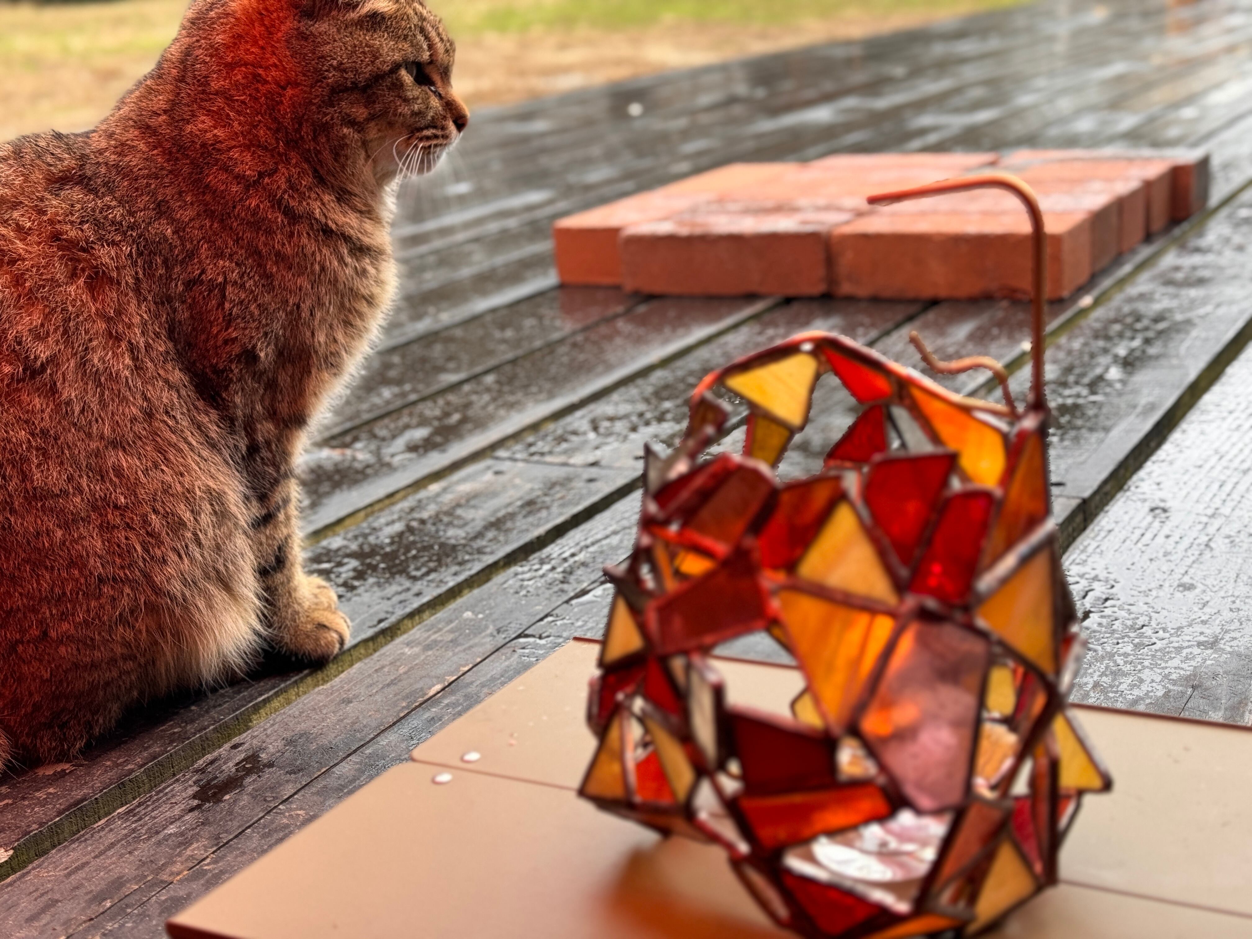 この作品は隙間が多くあり、その効果で向こう側のガラスのシルエットや存在も同じように感じることができます。雲が多い日中ですら、その外の光の明るさを満遍なく受けて、作品全体の雰囲気を浮き立たせます。ライトを入れて灯す夜の時間も良いですが、ぜひ、曇り空や雨の日に窓際でゆっくり眺めてみてください。そばに猫が横になっているような気持ちで。