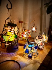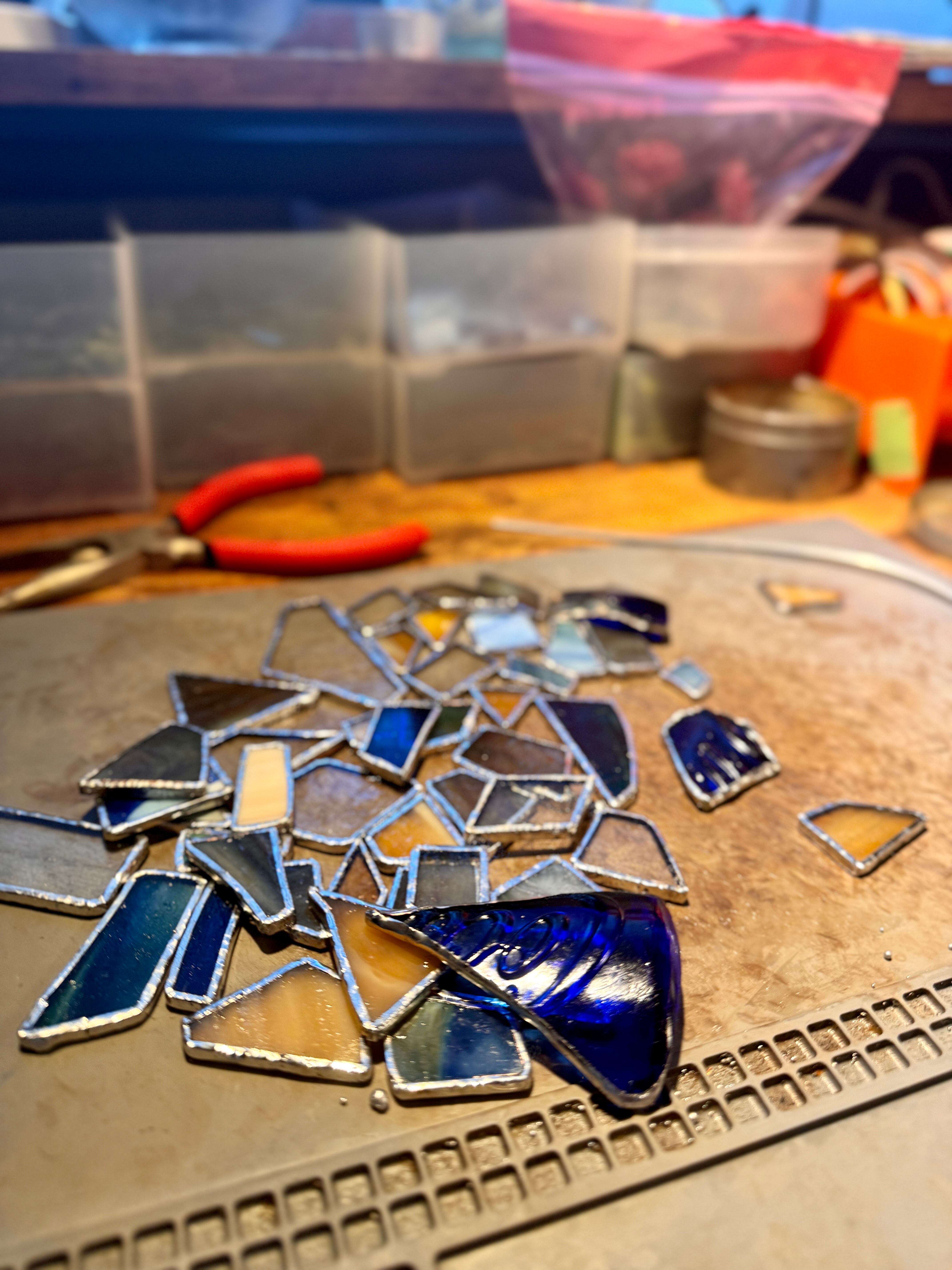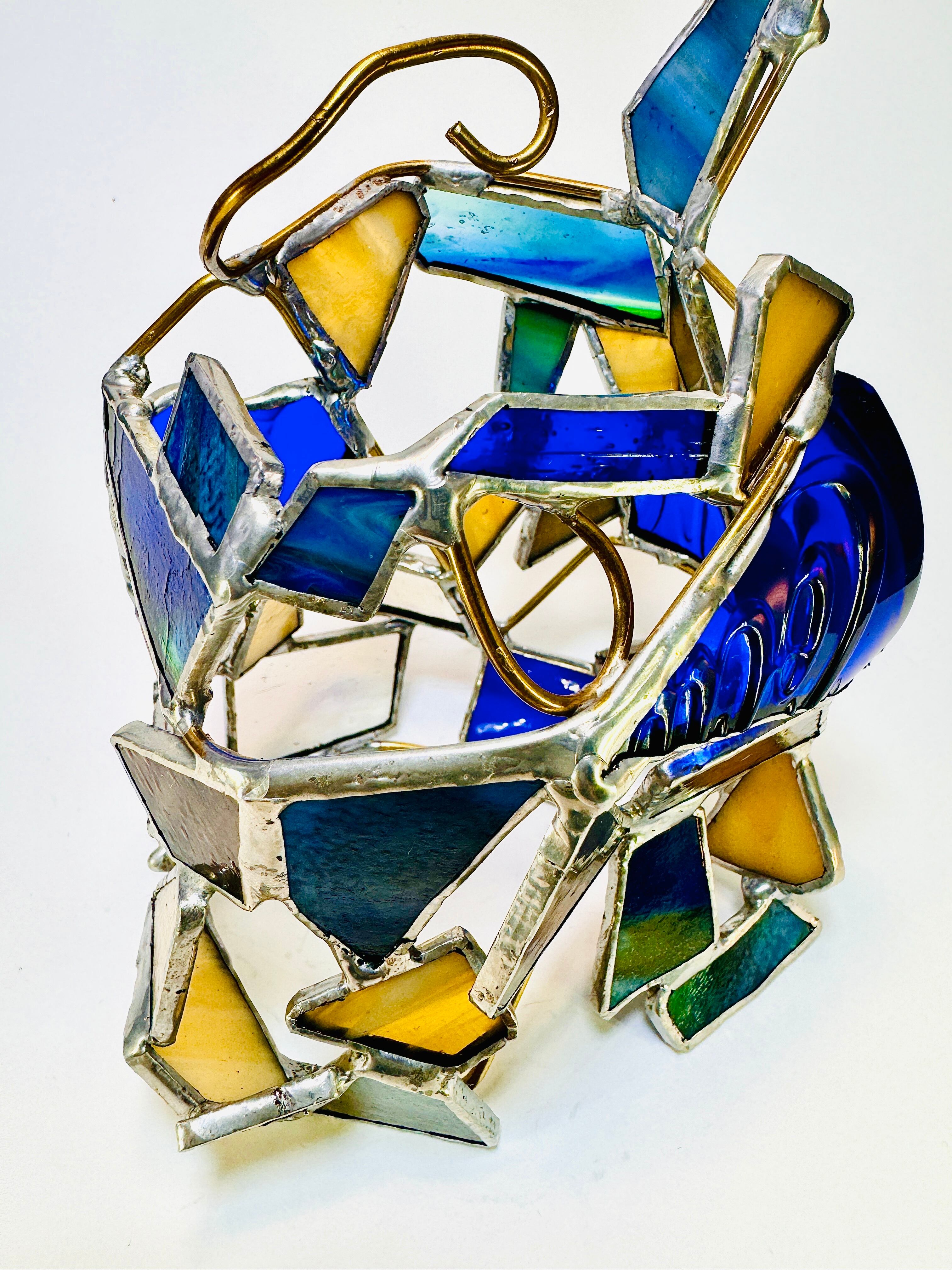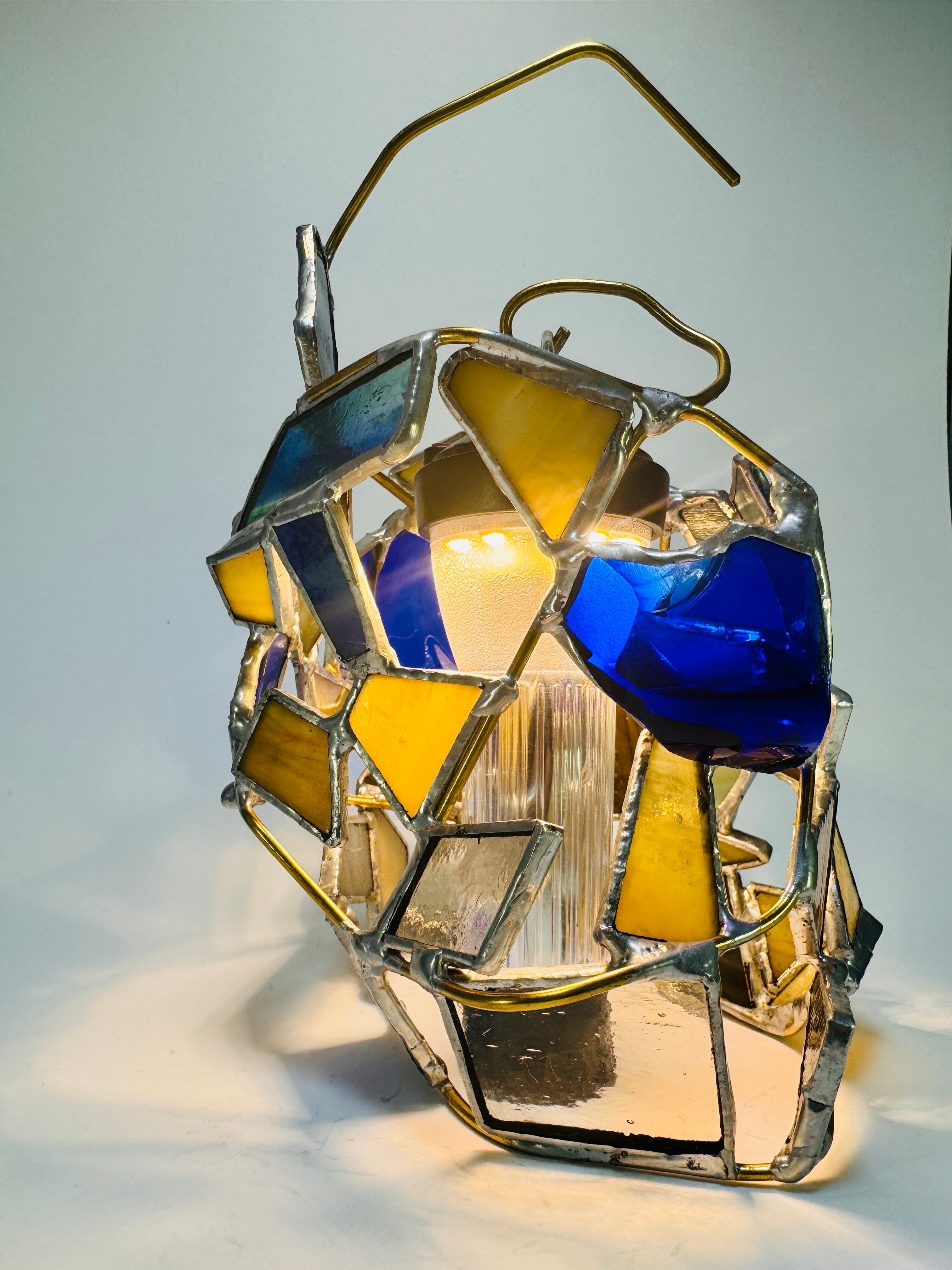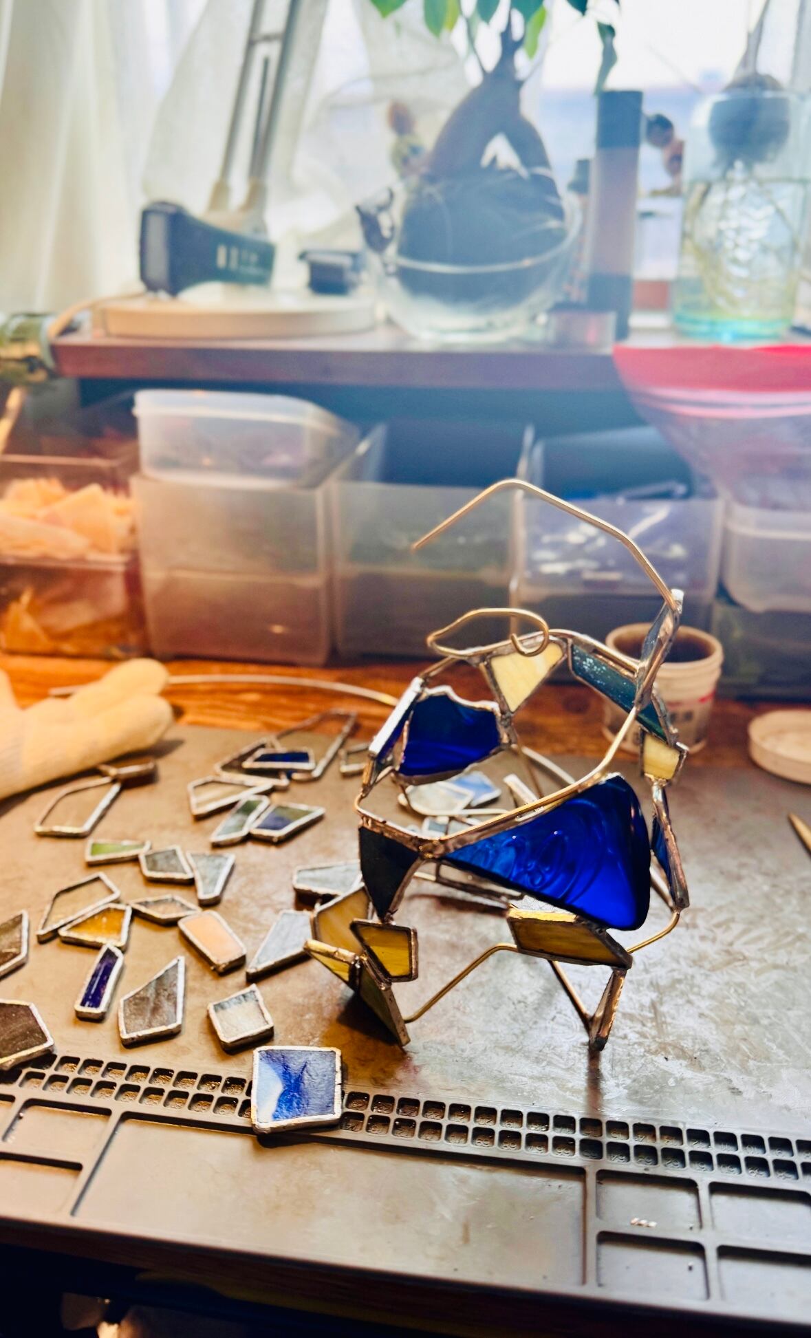 この青いガラスは、以前インスタグラムのライブ配信時に、視聴者の皆さんの前でハンマーで叩き割ってピースにした、某ハンバーガーショップのノベルティとして出された、Coca-Colaのグラスです。どうしてもこの鮮やかな青のガラスをランタンシェードに仕立てたくて、思いを込めてカケラにさせて貰いました。