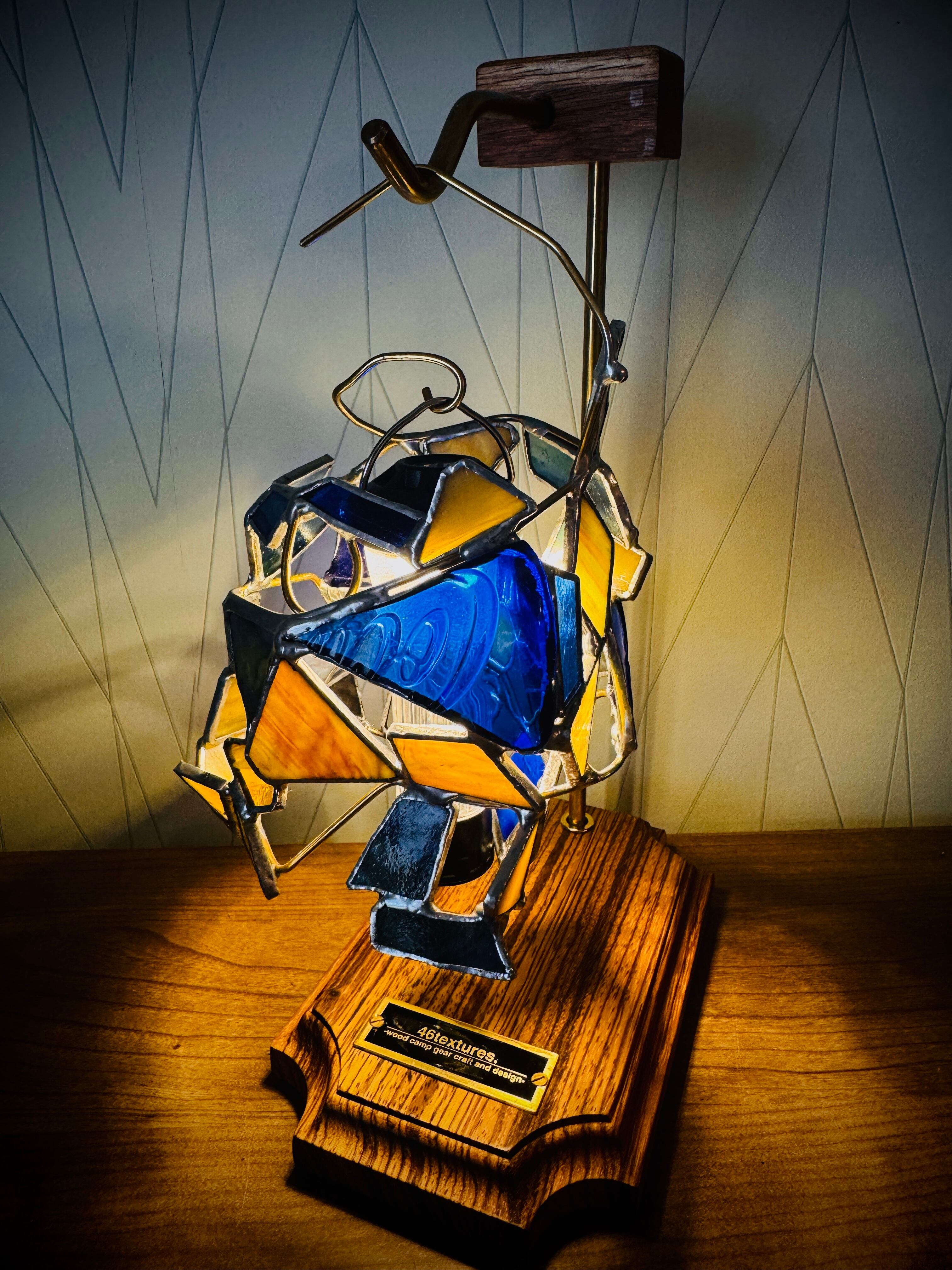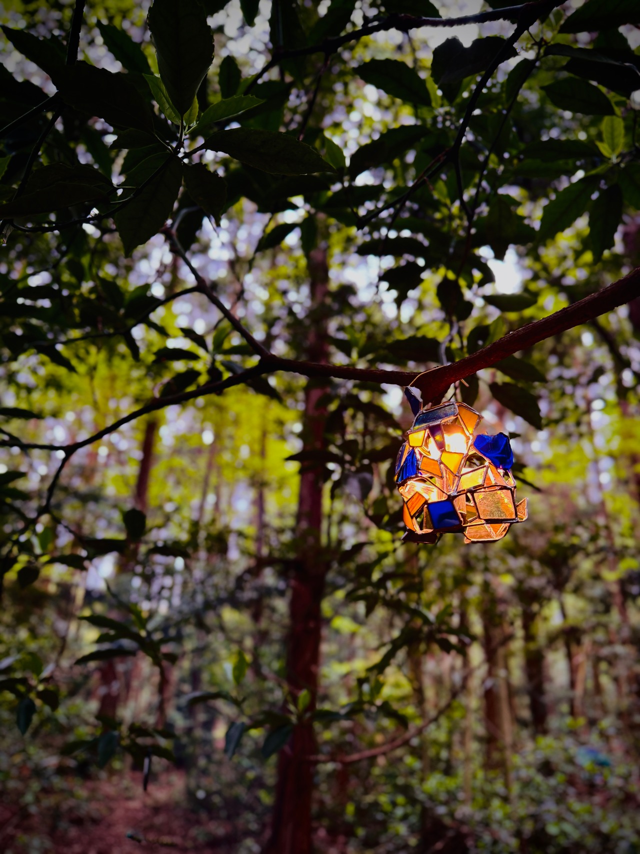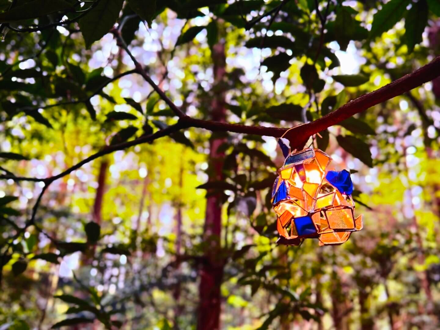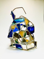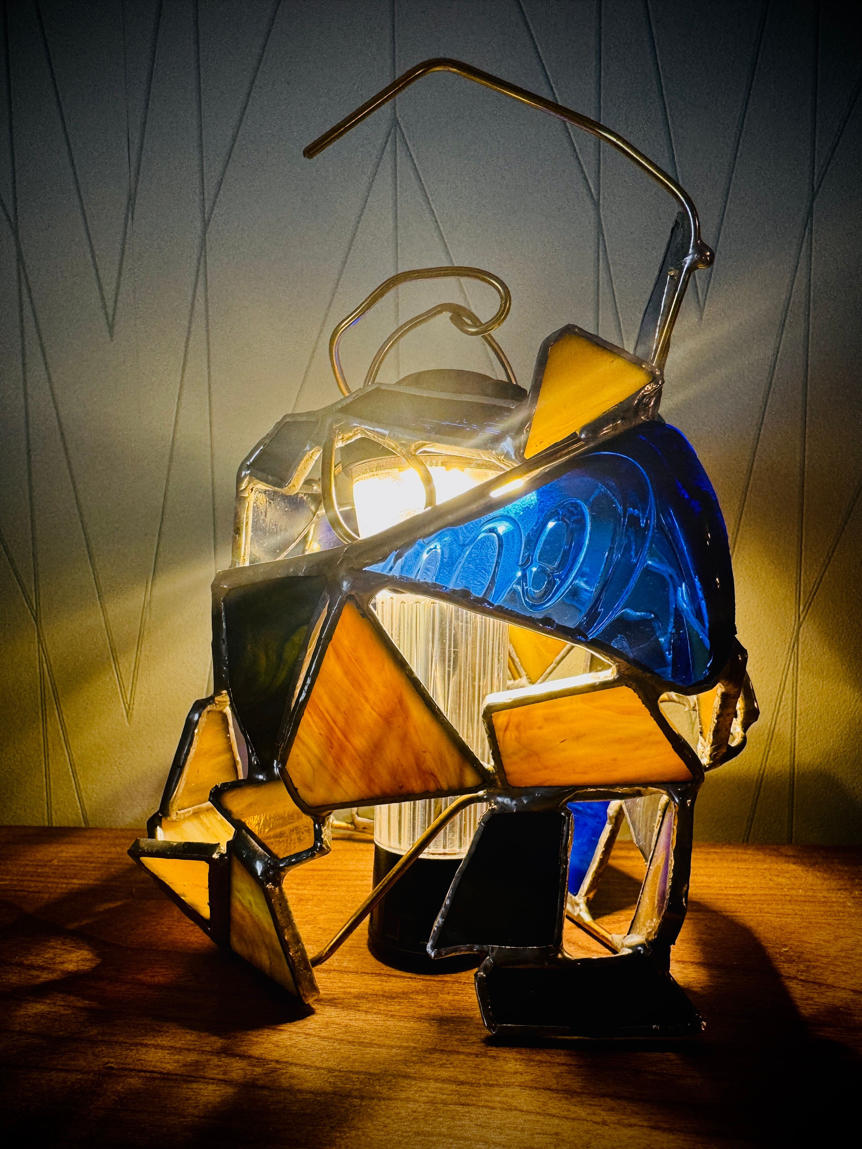 この青いガラスは、以前インスタグラムのライブ配信時に、視聴者の皆さんの前でハンマーで叩き割ってピースにした、某ハンバーガーショップのノベルティとして出された、Coca-Colaのグラスです。どうしてもこの鮮やかな青のガラスをランタンシェードに仕立てたくて、思いを込めてカケラにさせて貰いました。