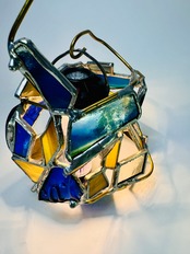 青く潔く輝くガラスが印象的な、小型のステンドグラスシェードです。
