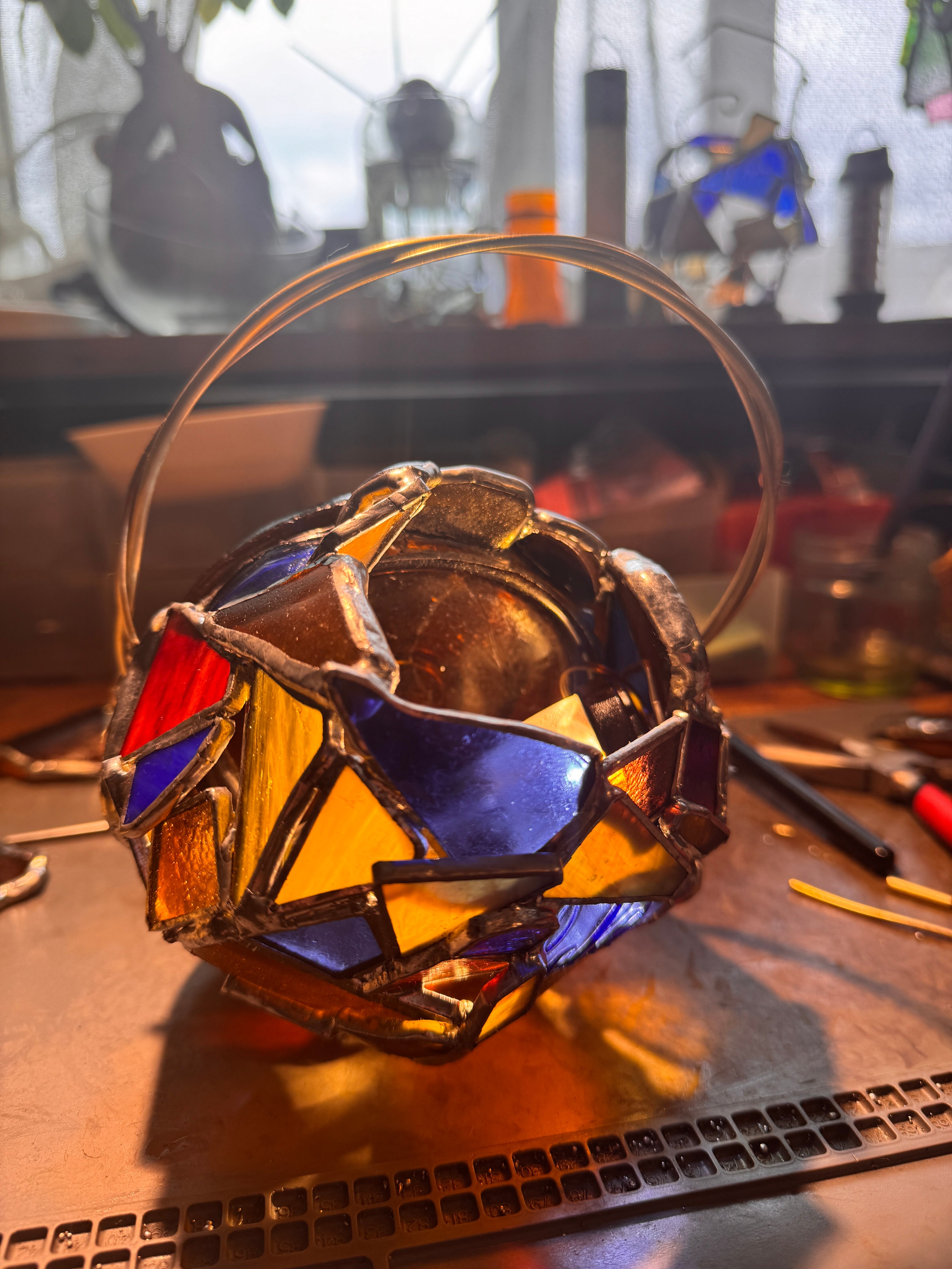 ハンダ部分は時間の経過と共に色が褪せてきます。艶出し・錆止めも含め、専用のポリワックス(jujo ステンドグラス仕上げ用ポリワックス)で定期的にメンテナンスをお願いいたします。
