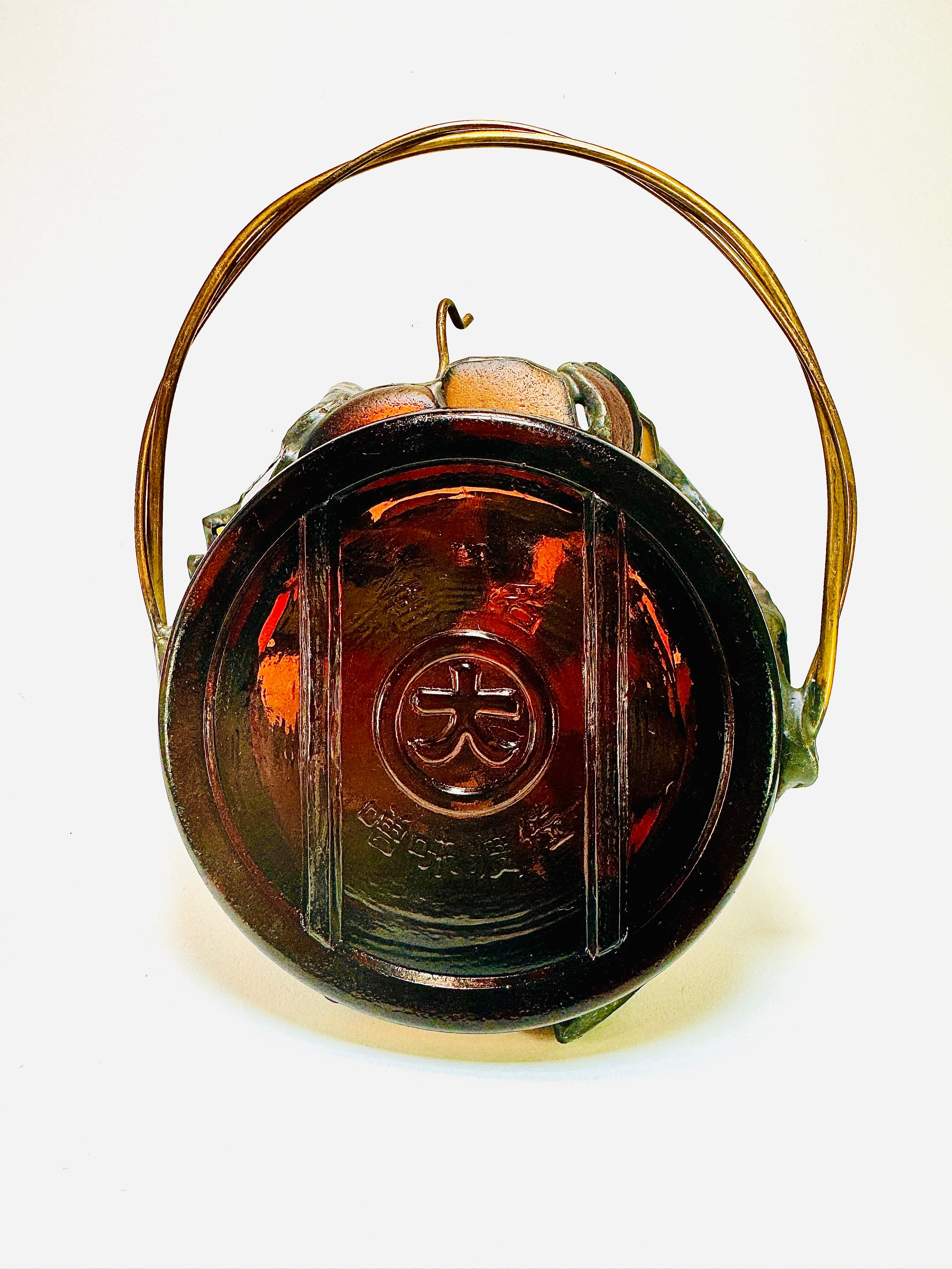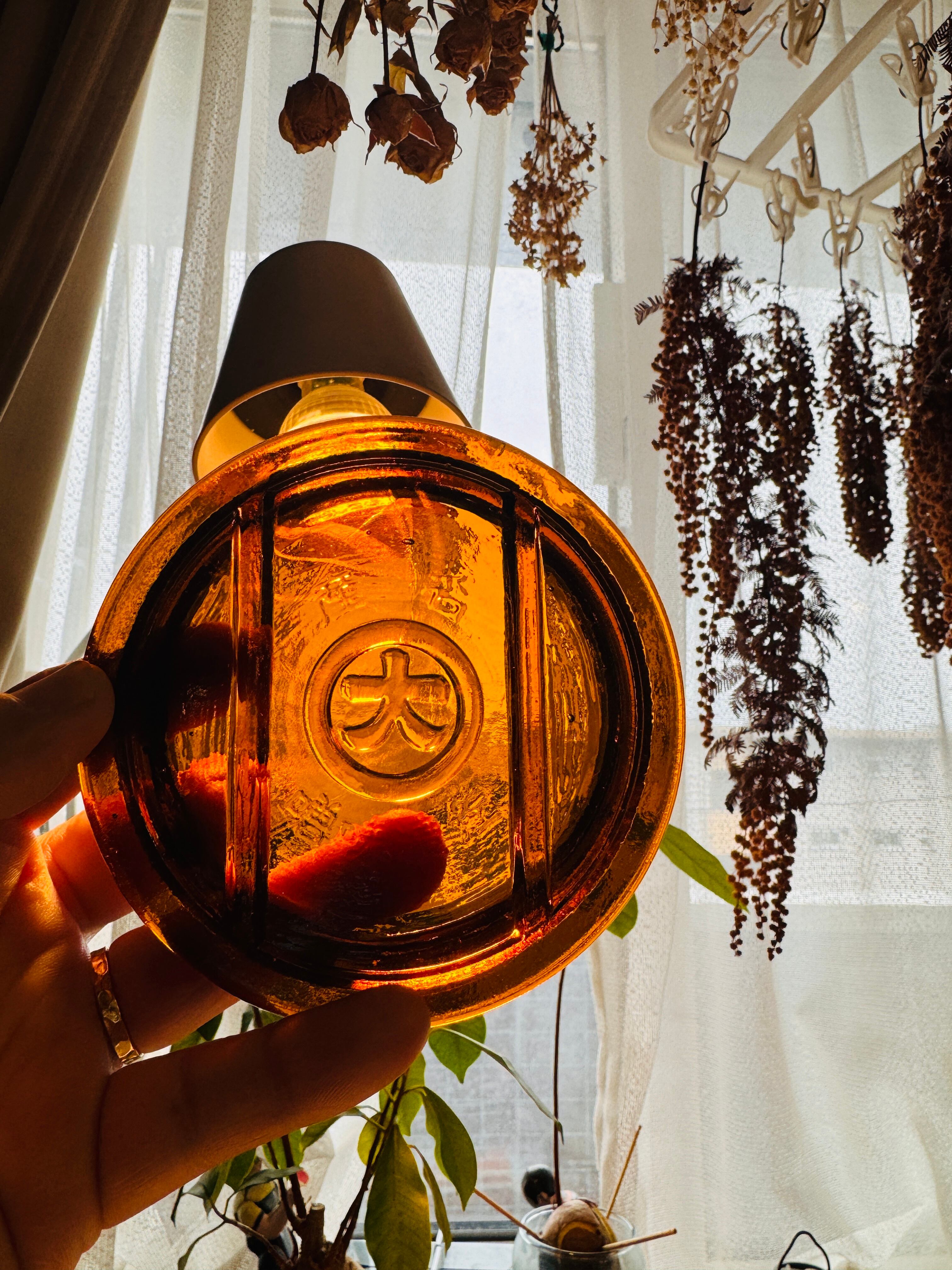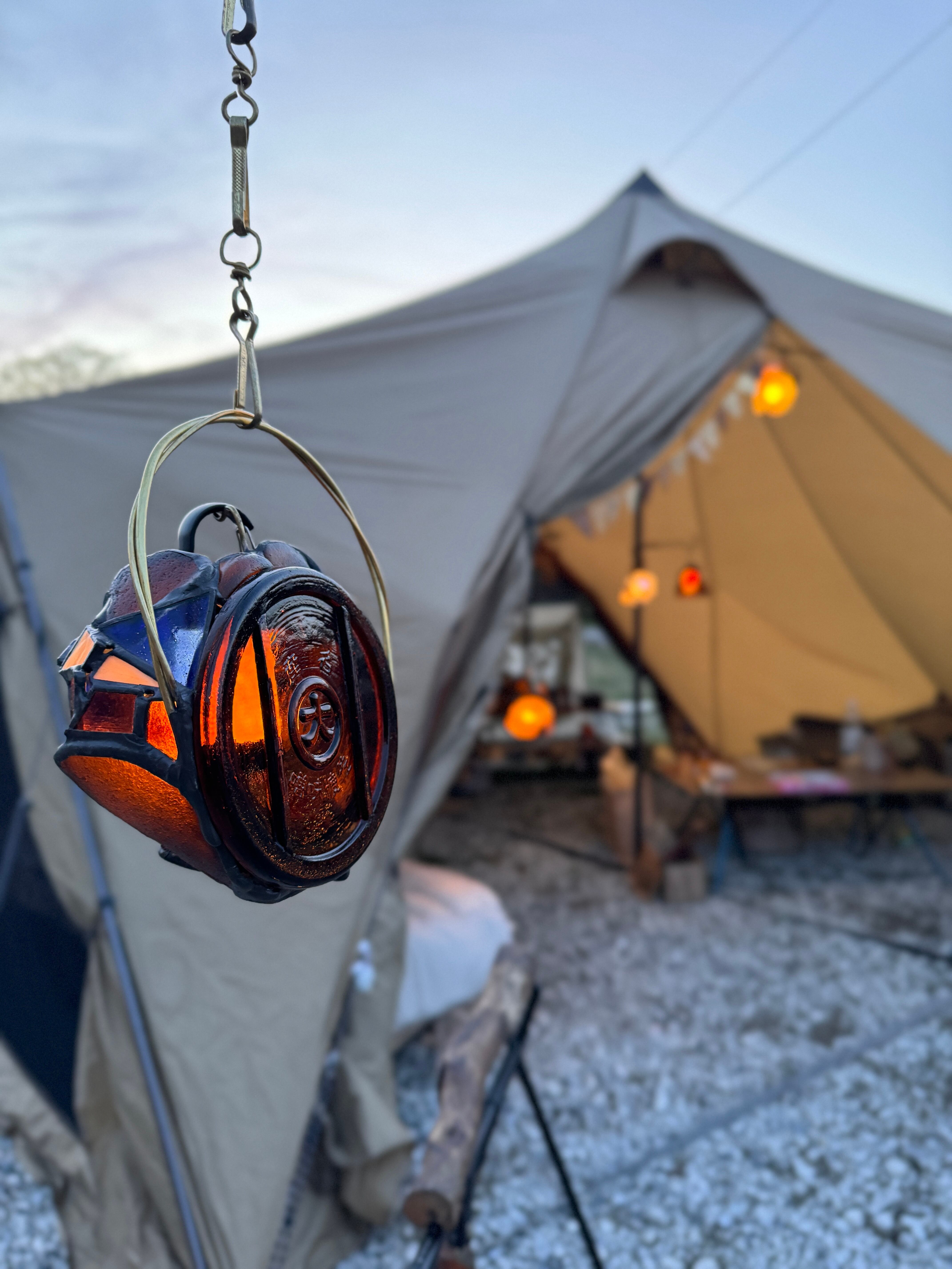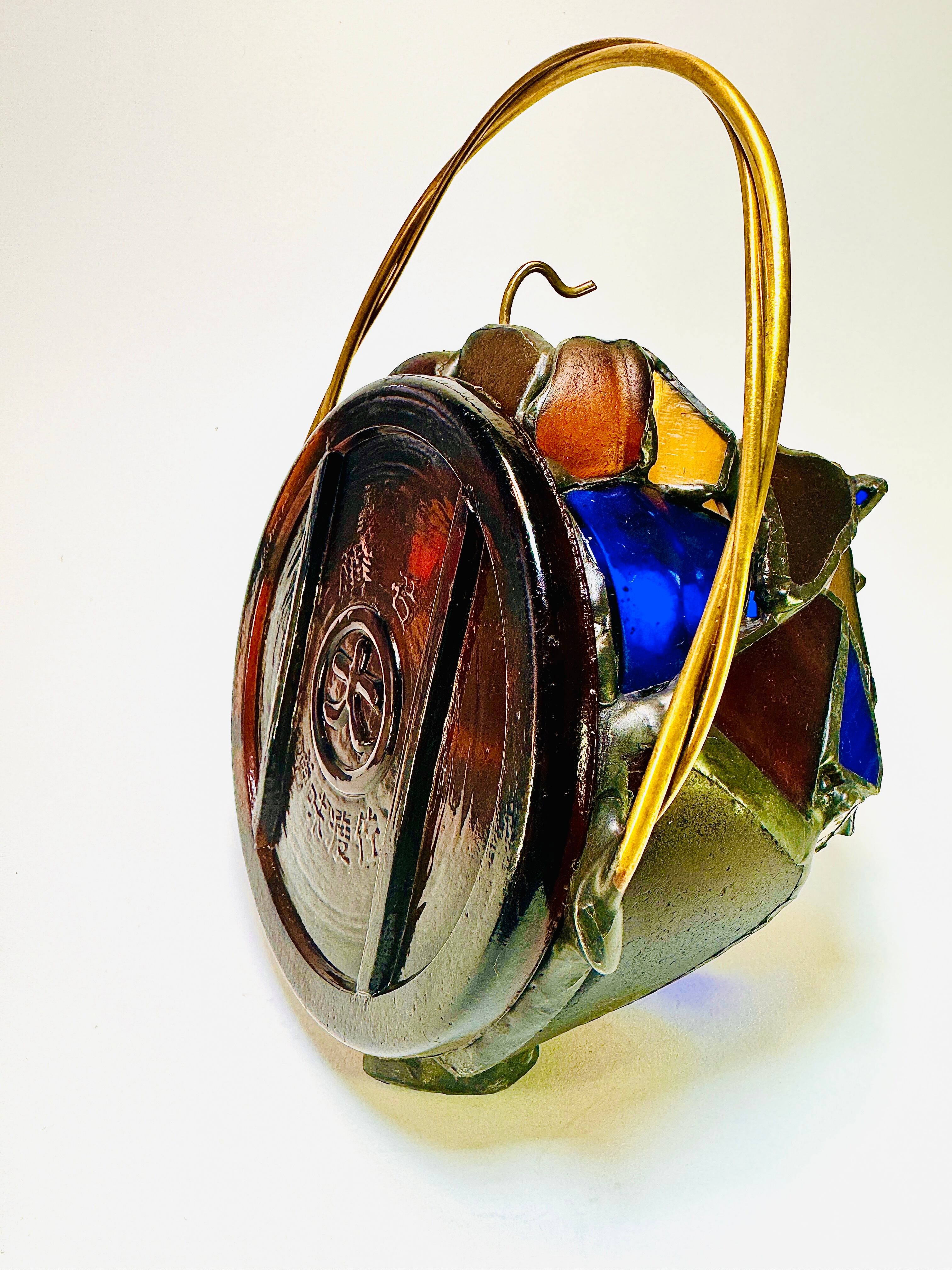 佐渡から本州にわたり、伊豆の土の中に埋まってしまった味噌のビン蓋は、あるコレクターの目に留まり手にされ、千葉の私の元にやってきました。そしてそこでは、他の様々なキャリアを積んだガラスたちと会い、一緒につなぎ合って世界にどこにもない、たった一つのランタンシェードに生まれ変わりました。この目まぐるしく変わる長い時間の中で、今たどり着き命を吹き込み直したこのオソトランタンに私がつけた名前は、