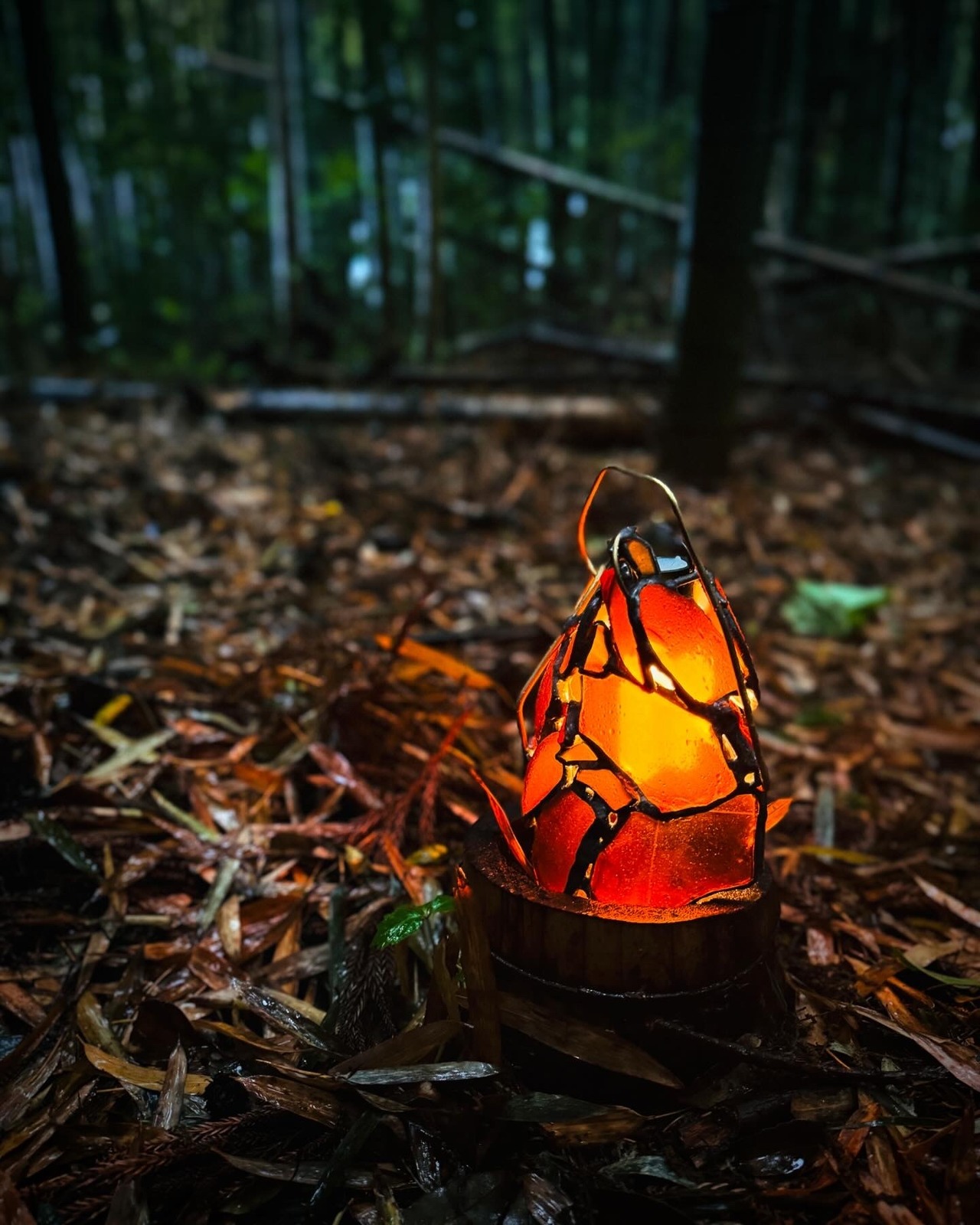 その中でも特に気に入って使ったガラス片が、ハンドルの付け根、中断くらいに組んであるビンの先端部分のガラスです。写真ではわかりづらいですが、熱か何かの力でグネンと押しつぶされています。その中に砂が閉じ込められている為、光で透かしてみると、砂つぶが影となって趣きを演出をしてくれています。この部分を光に透かして見ているだけでも、どこか切なくノスタルジーな悠久の時間を感じます。