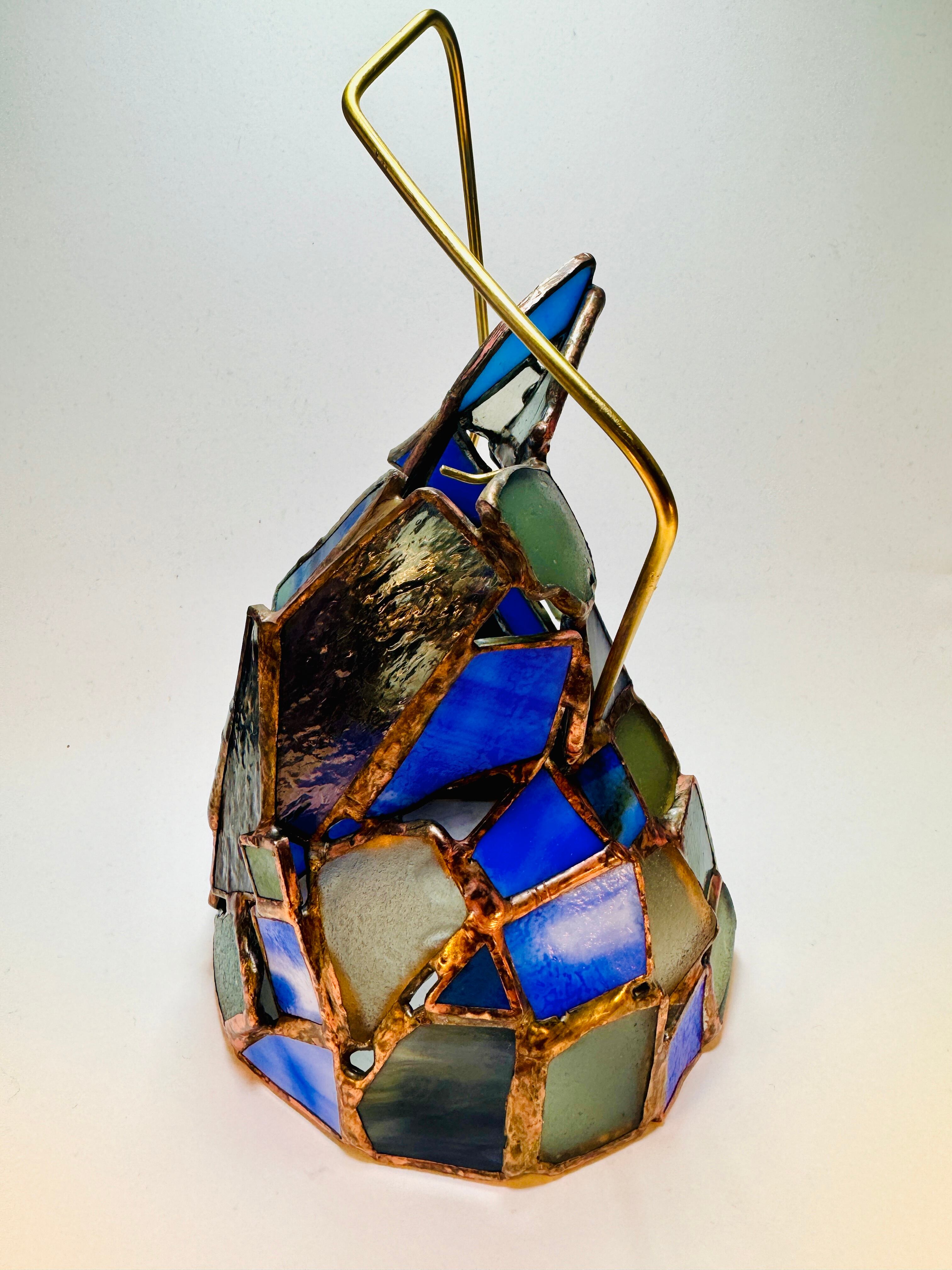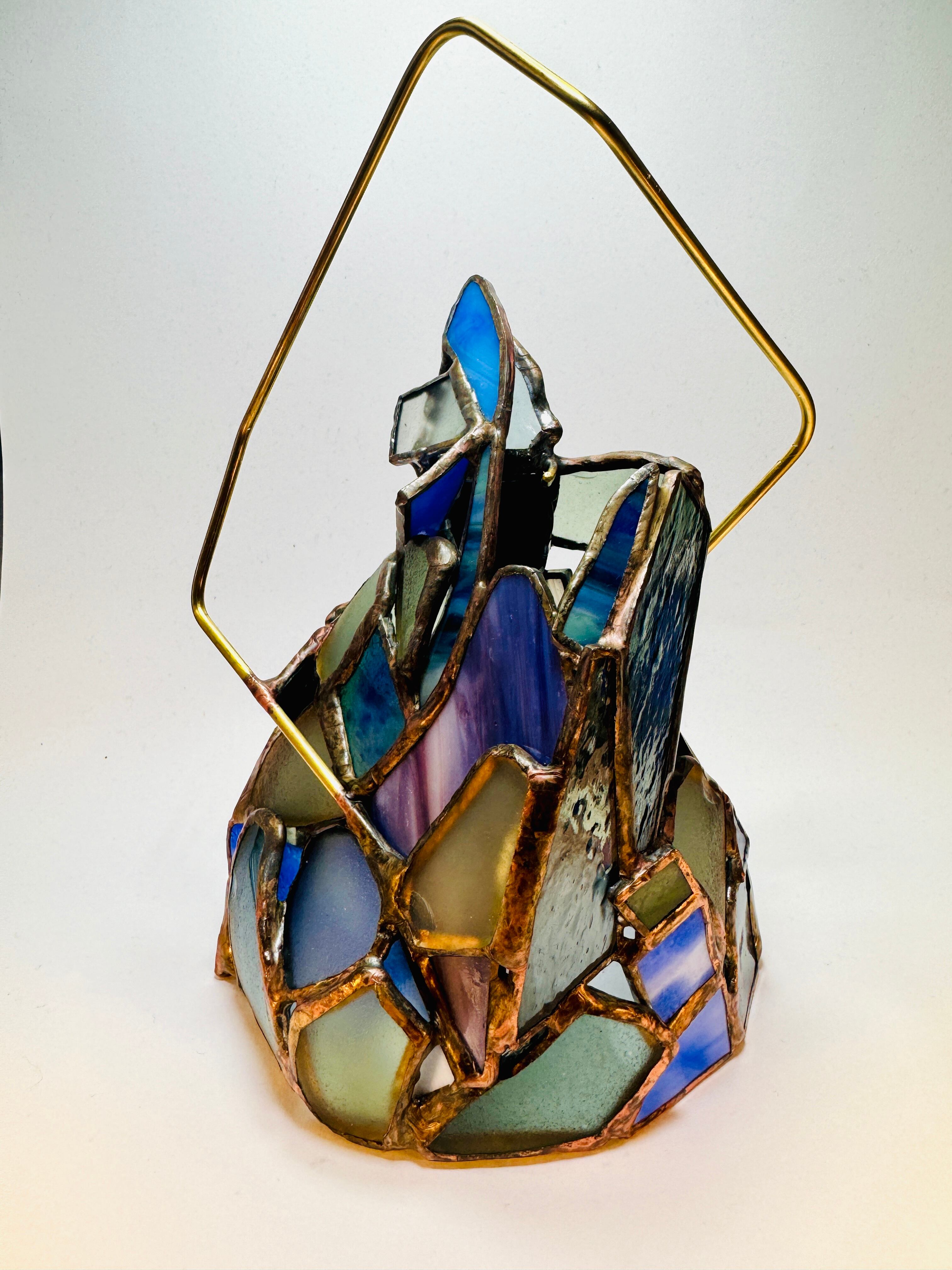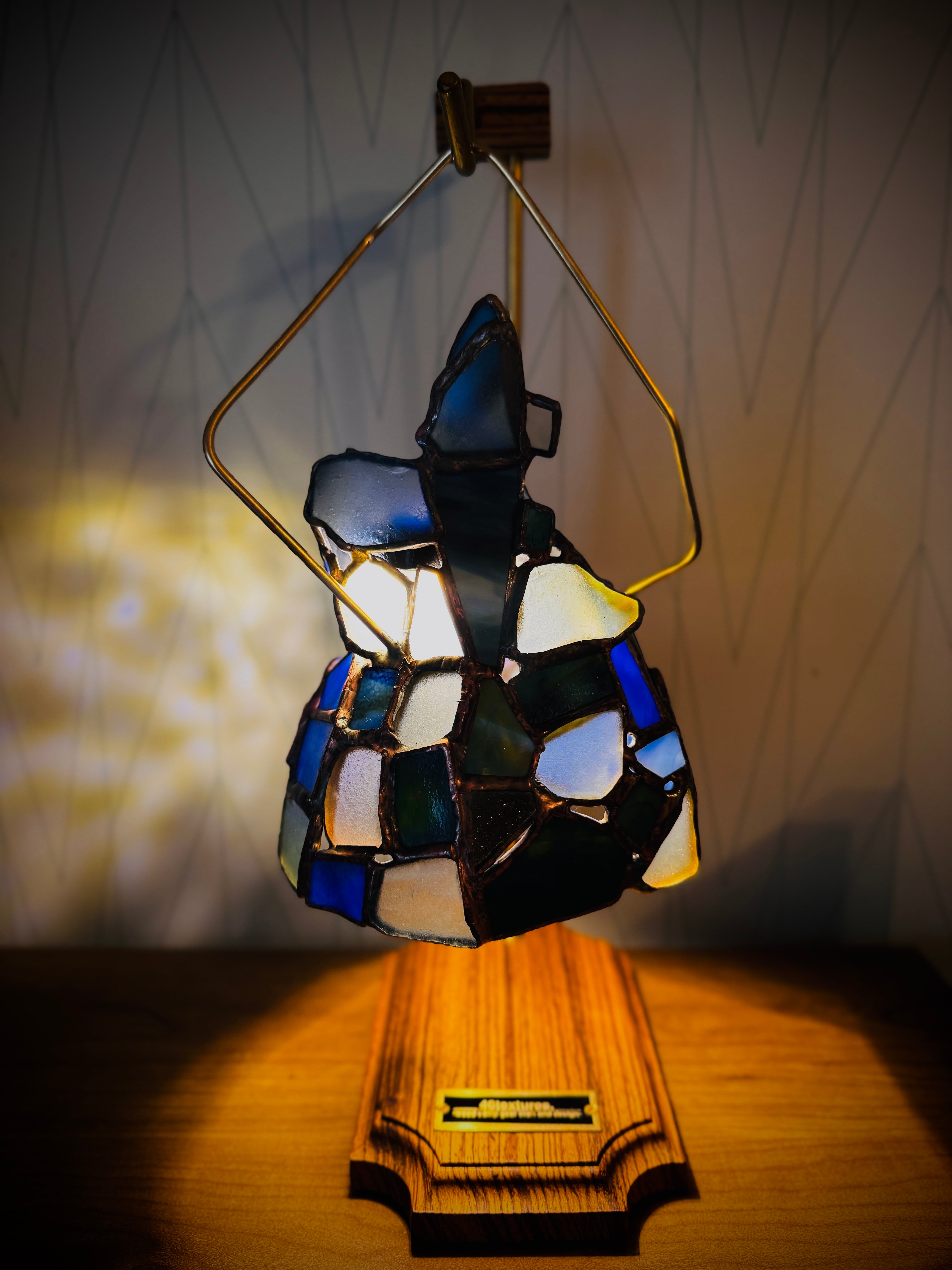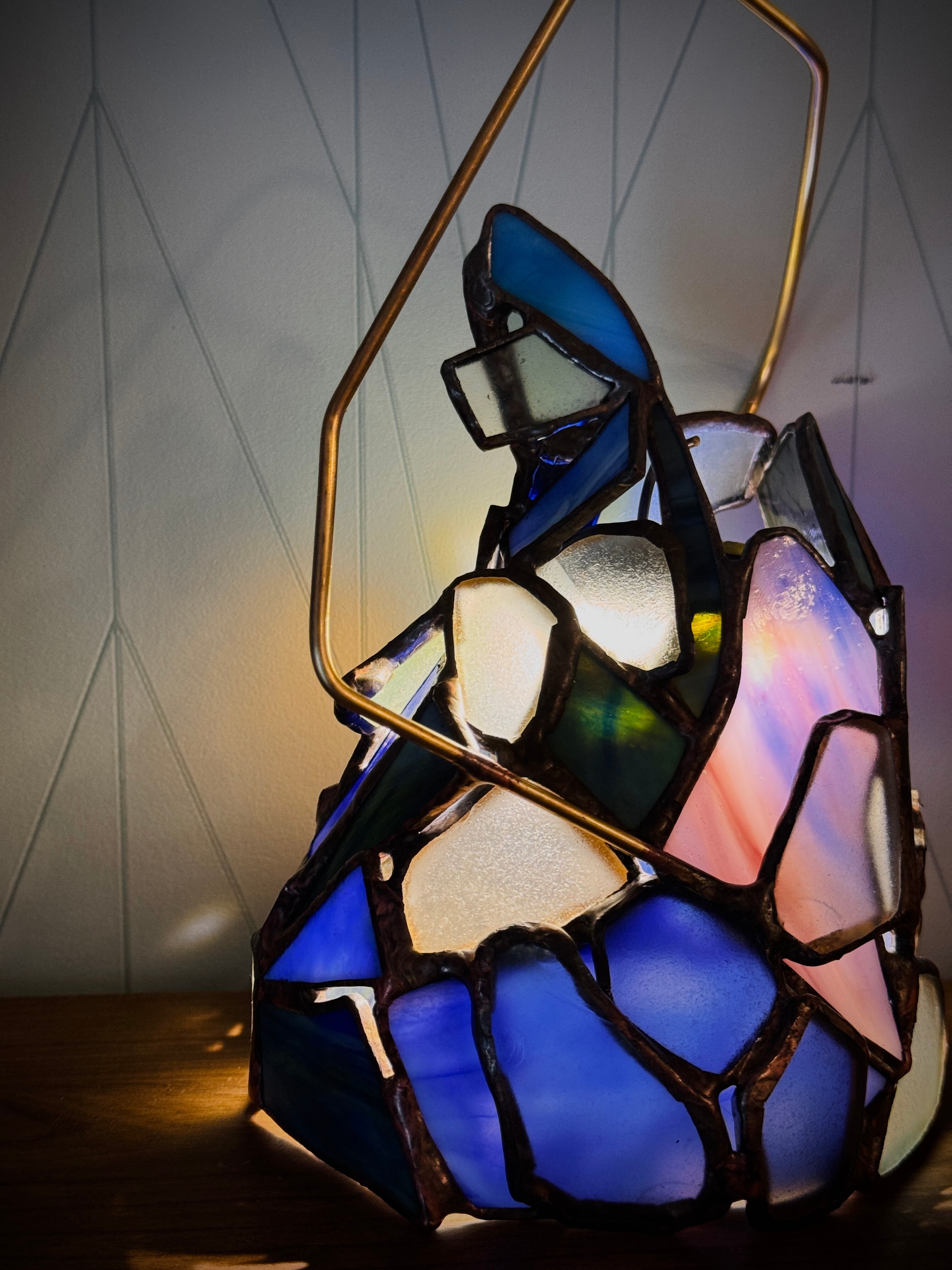 ライトを入れた紫とブルーの面。自分で言うのは格好良く無いですが、息を呑む美しい表情が浮かび上がります。特に裾の青い面が印象的な箇所は、後ろに濃い青のガラスを配置して、その上に白系のシーグラスを被せてあります。そのおかげで、青本来の美しさが、白い磨りガラスの包み込まれて、奥行きのある青が姿を現しました。