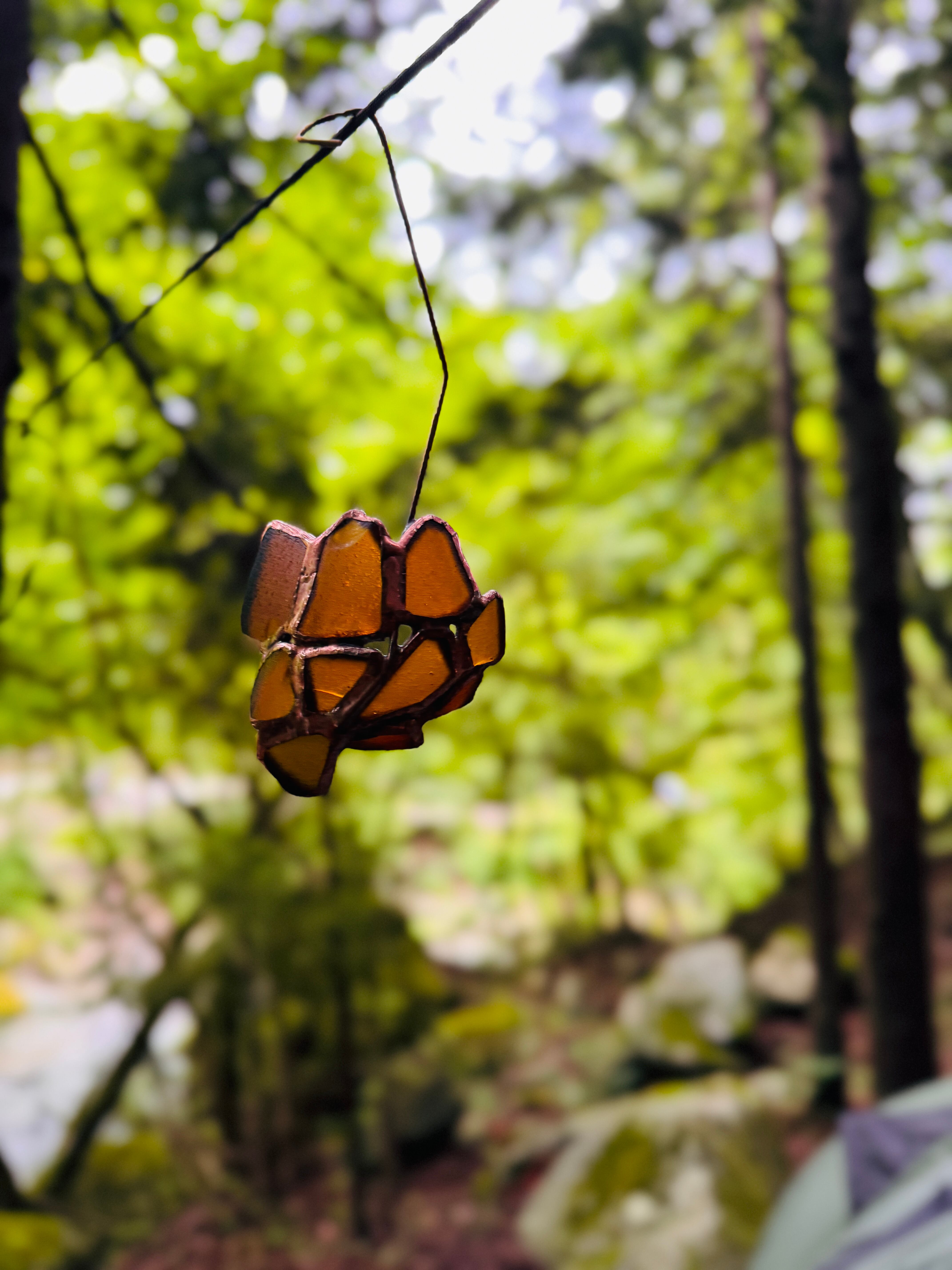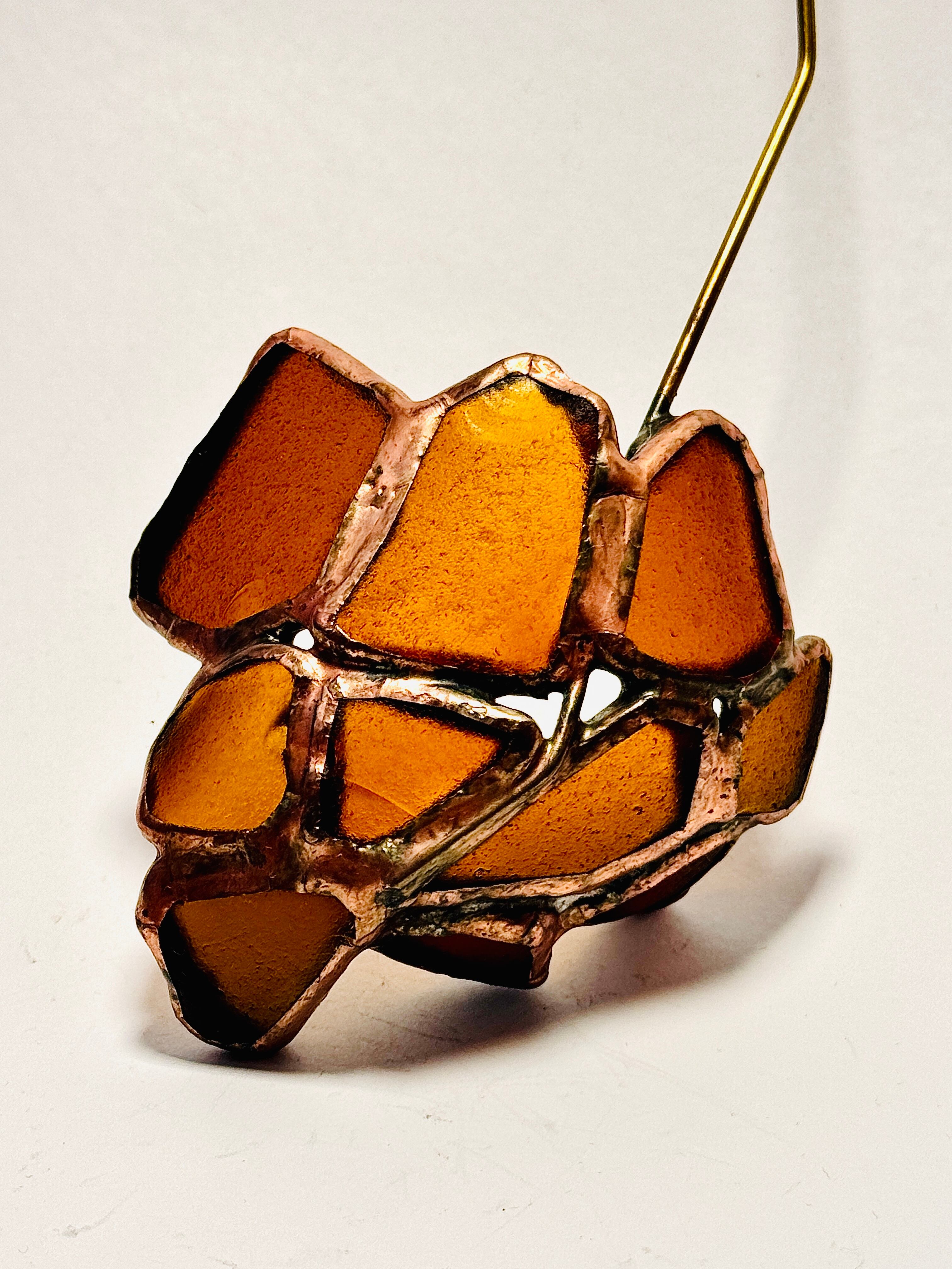 琥珀の飴玉の名の通り、琥珀色のブラウンシーグラスを10枚繋ぎ合わせて、真鍮の柄をつけました。