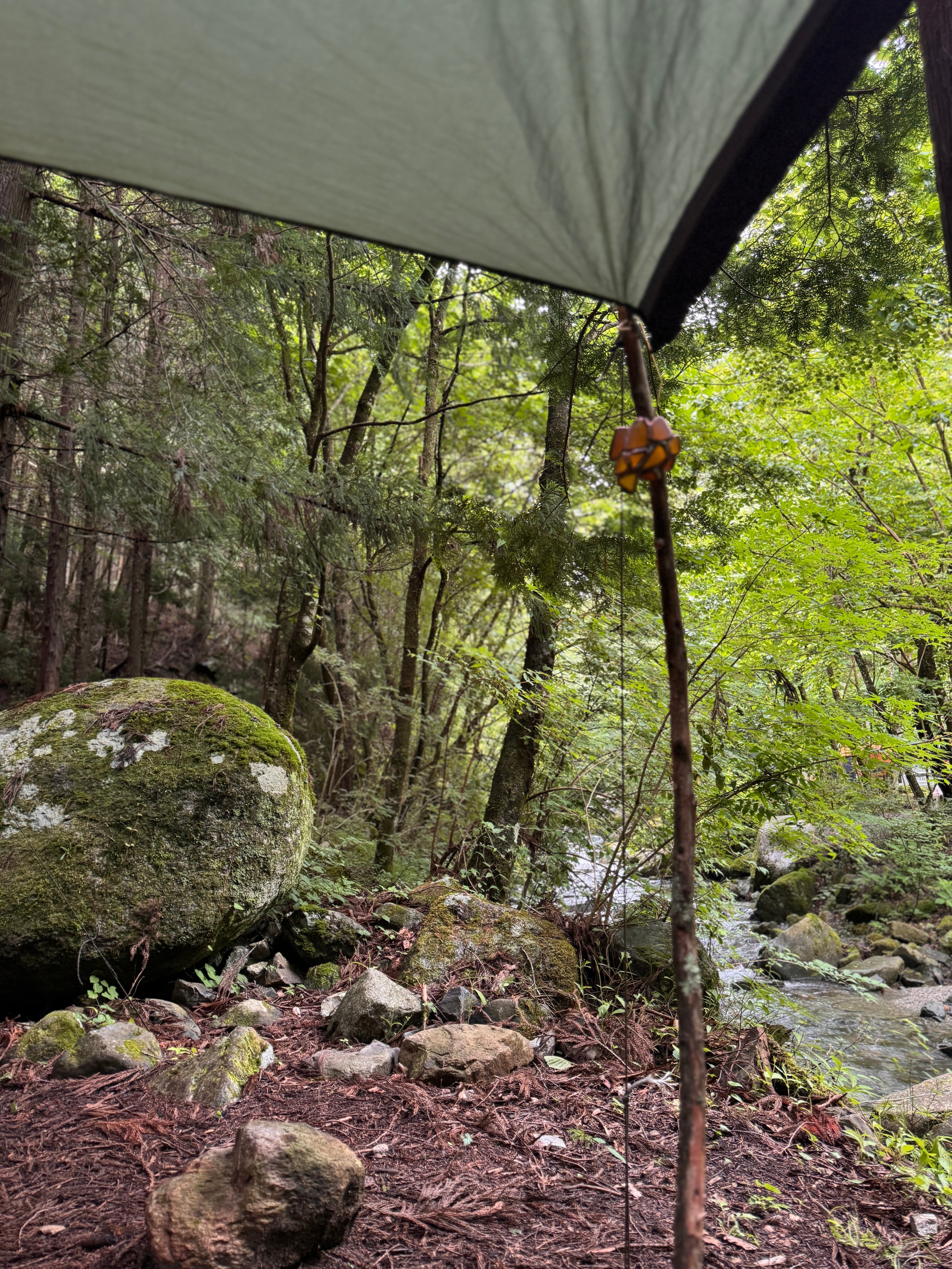 ・焚き火の前に枝やアイアンハンガーを差し、そこに下げて炎の灯りを透かして楽しむ。