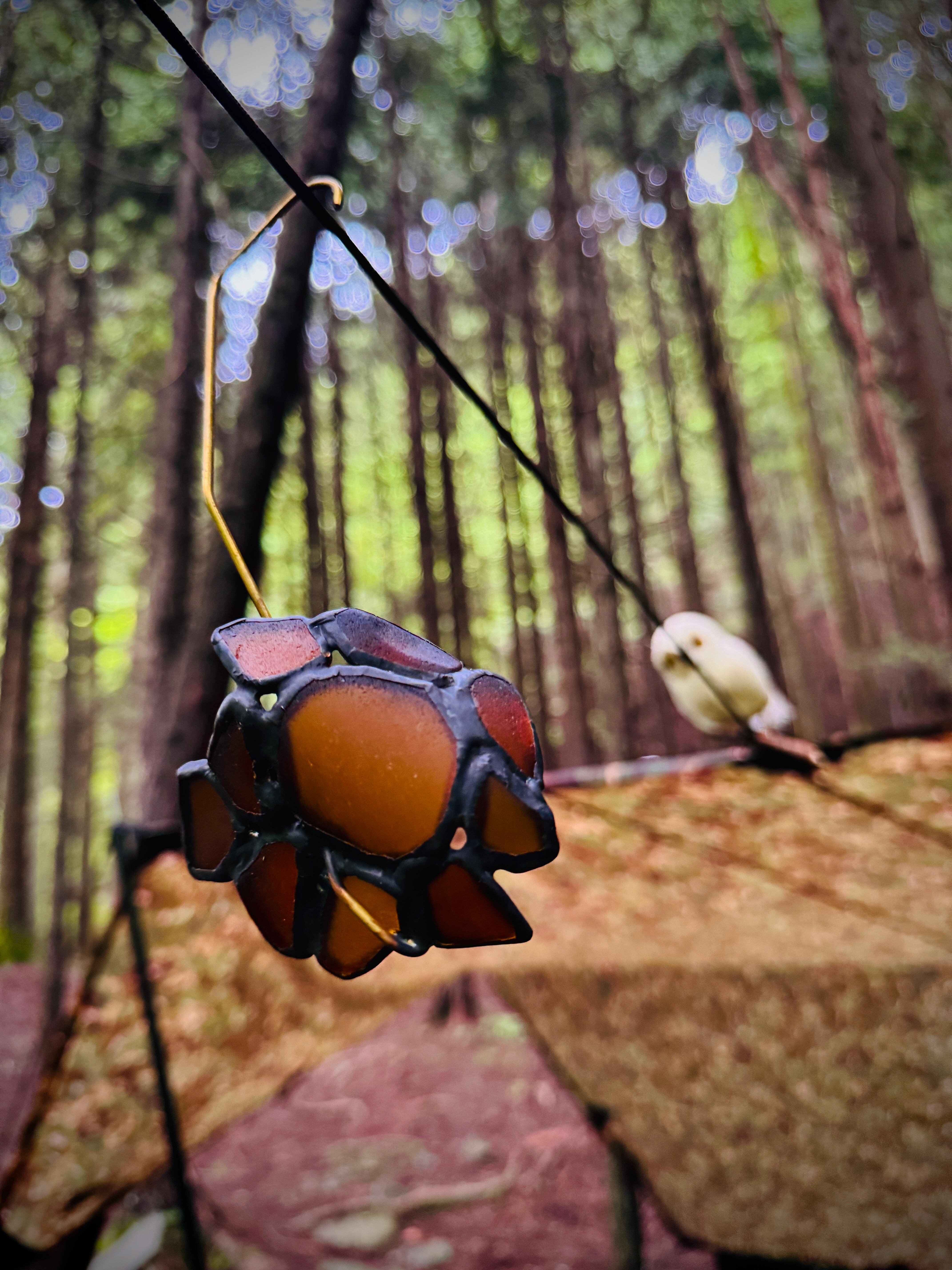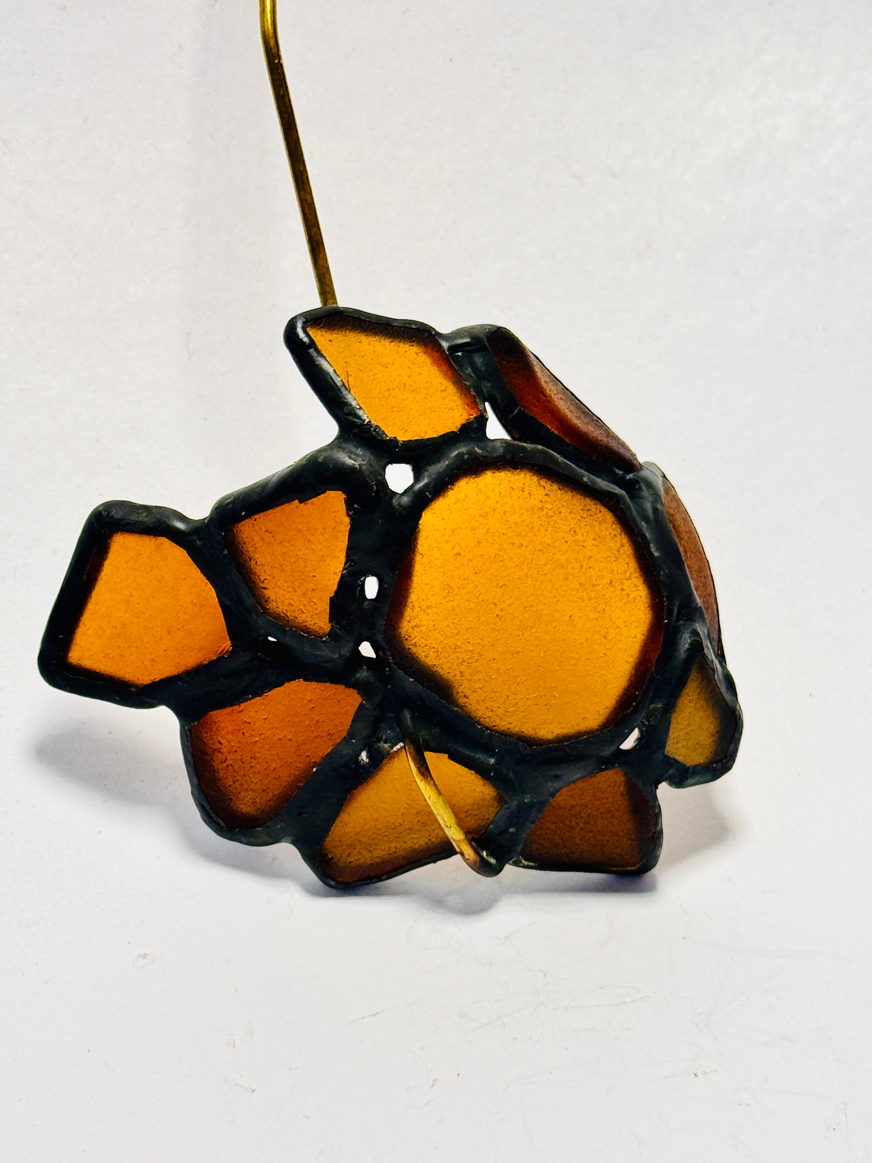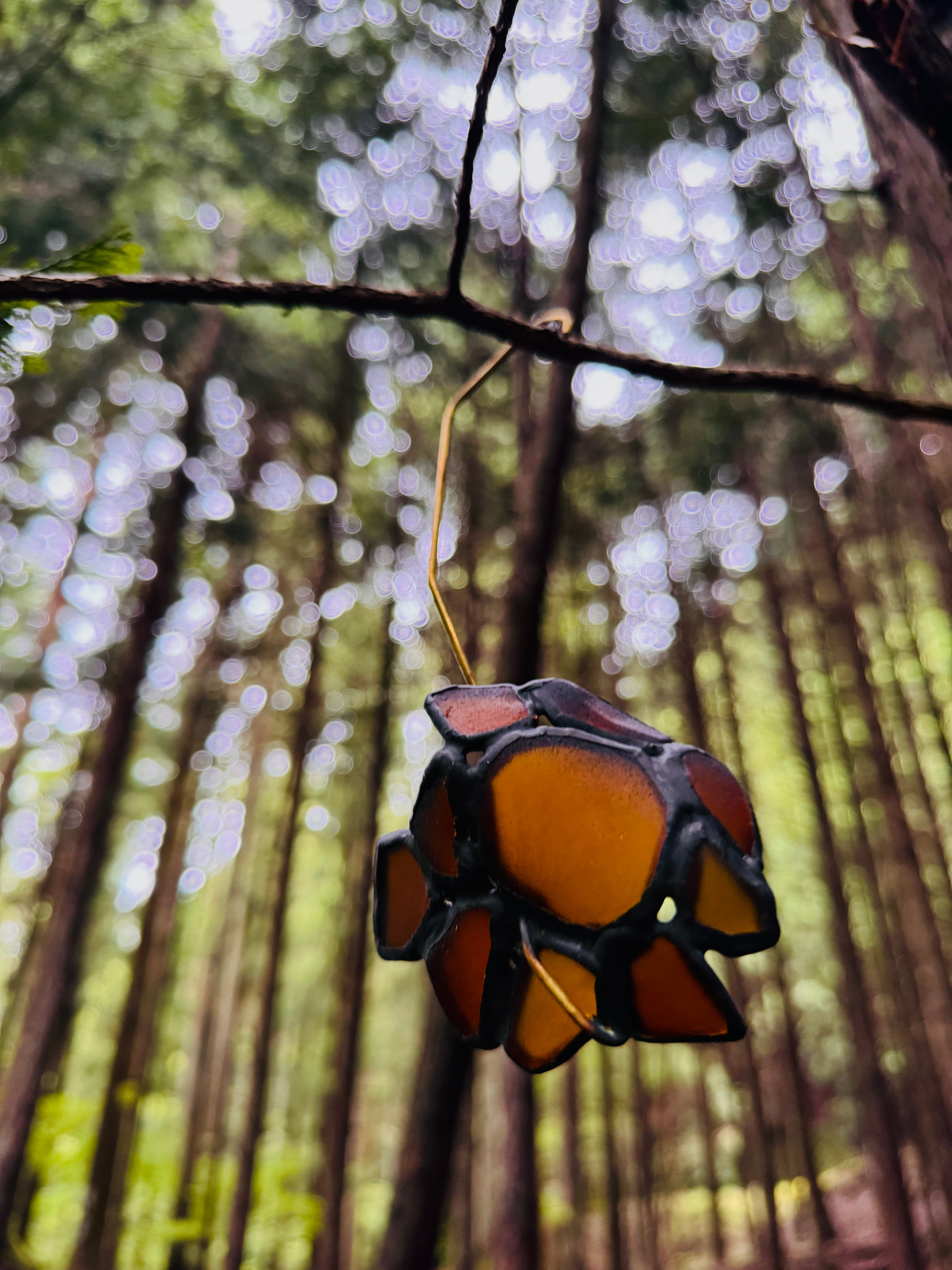 琥珀の飴玉の名の通り、琥珀色のブラウンシーグラスを10枚繋ぎ合わせて、真鍮の柄をつけました。
